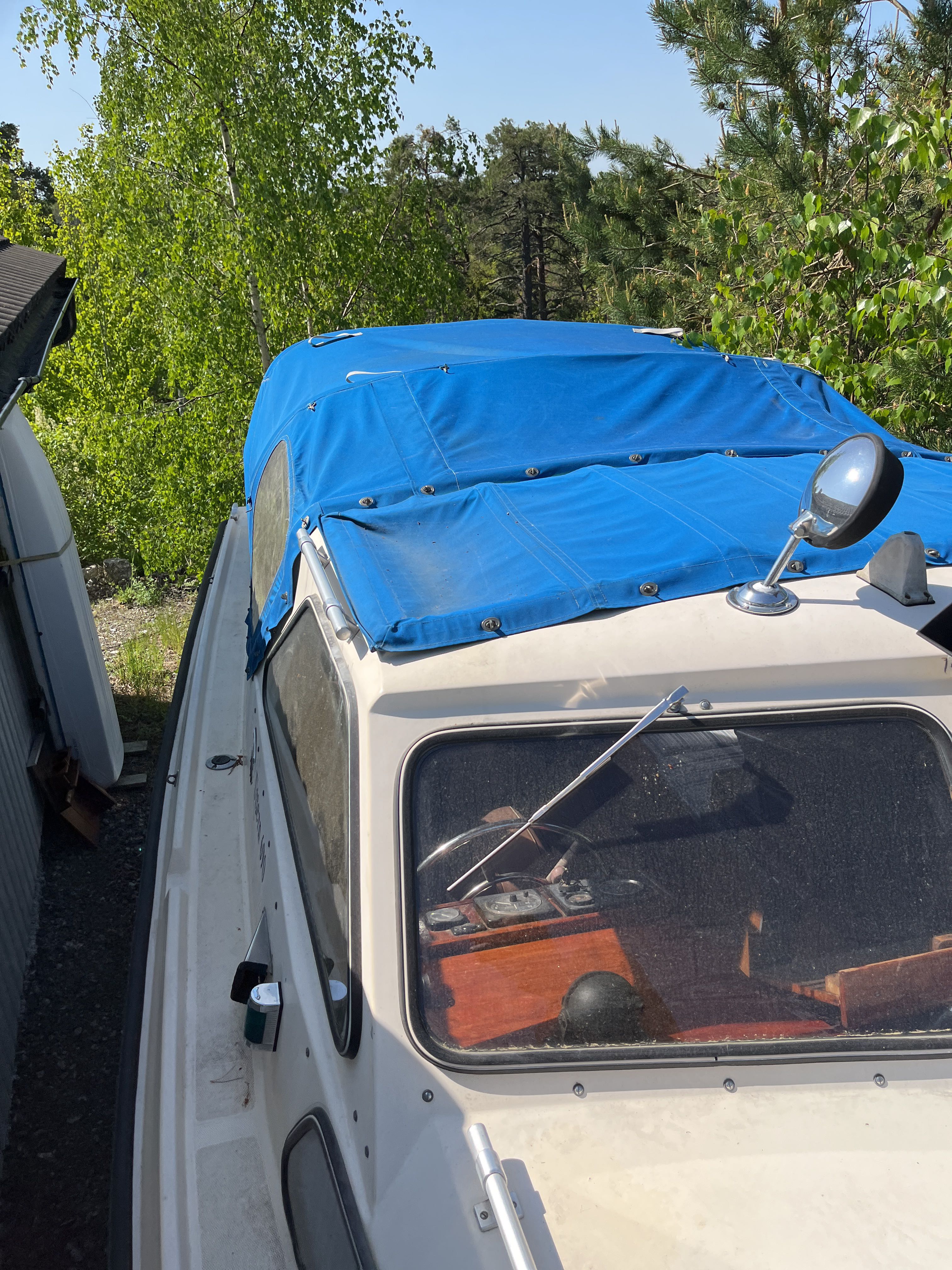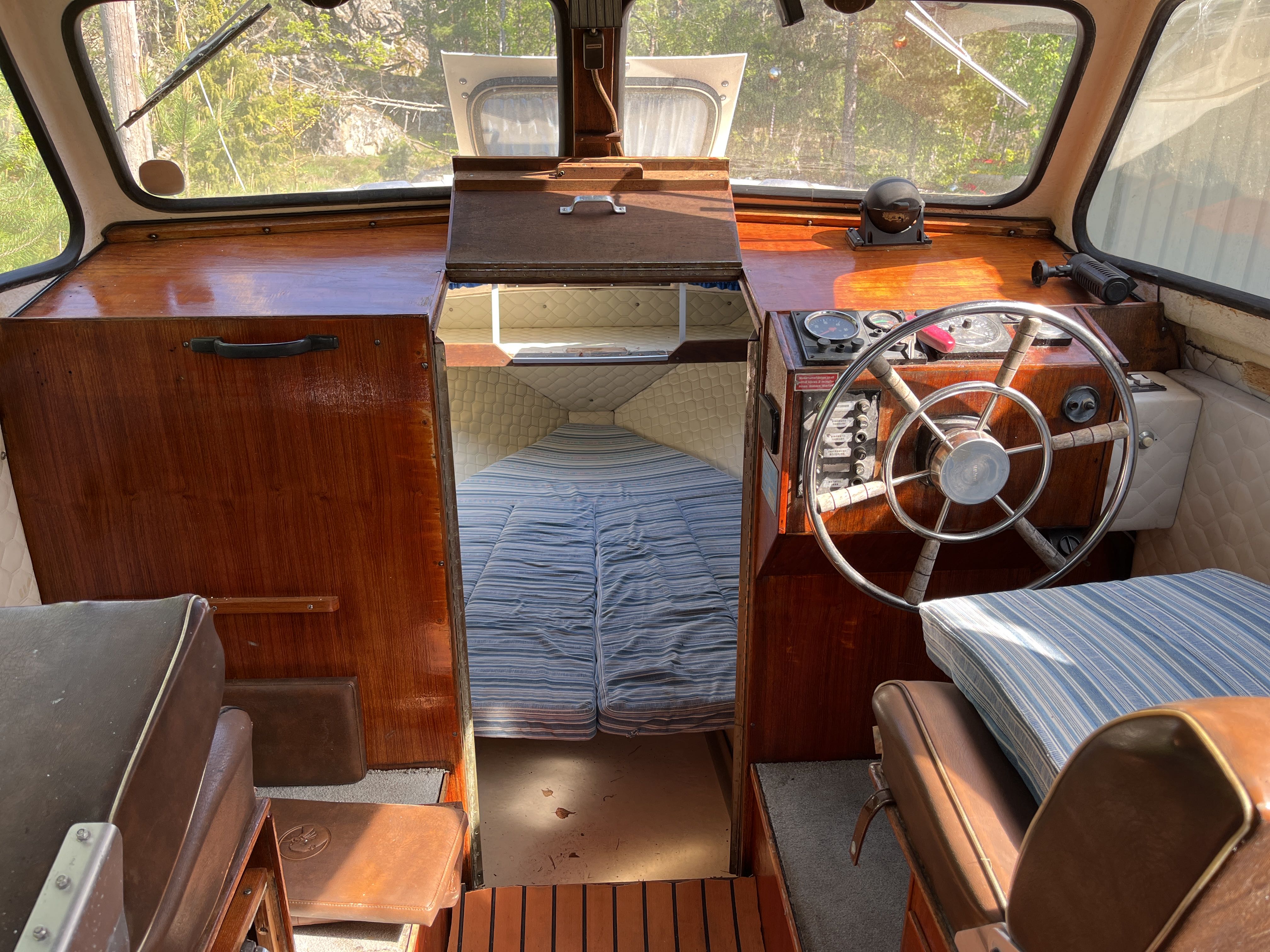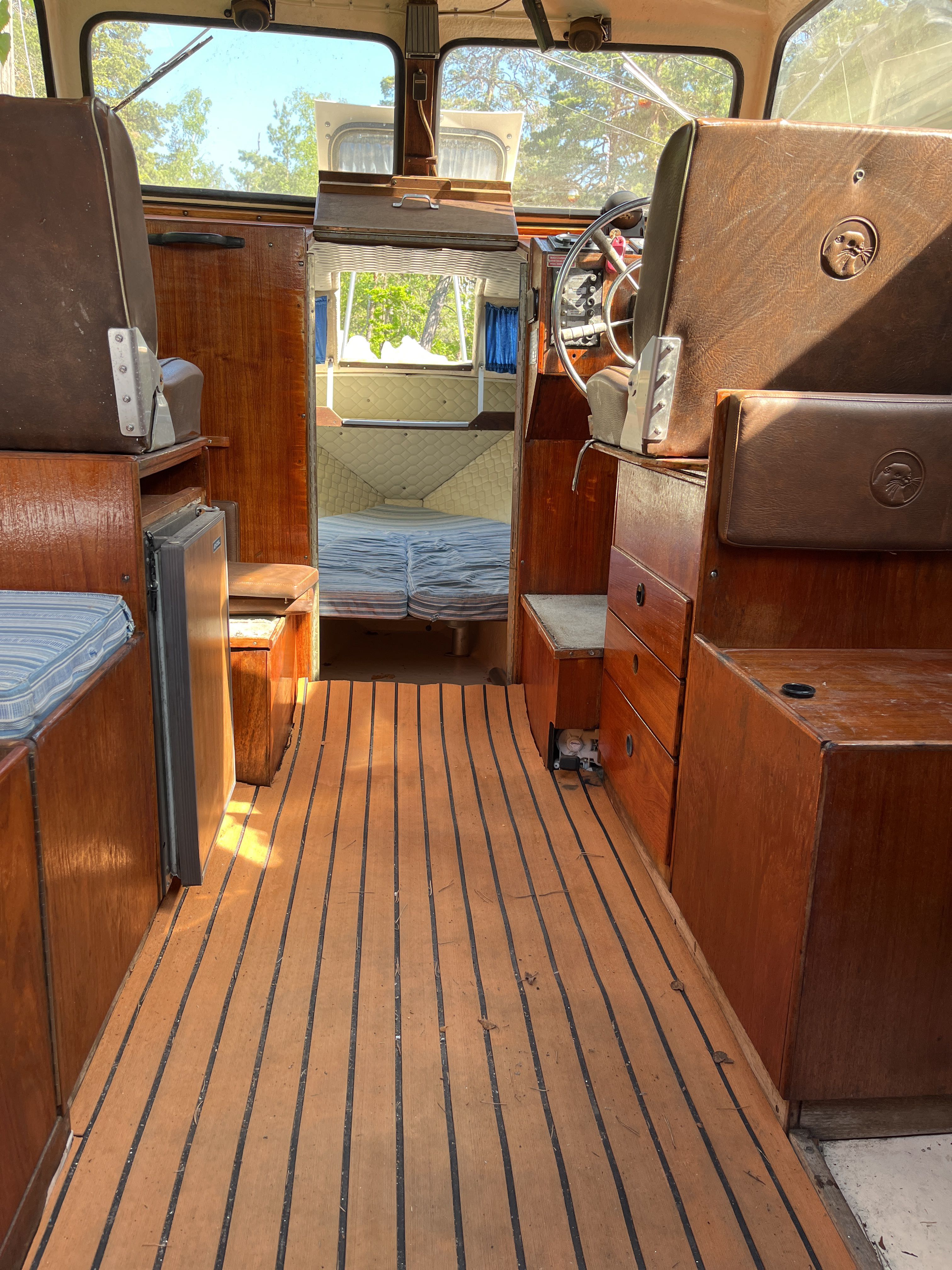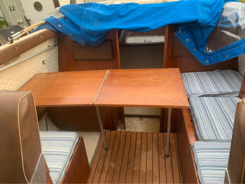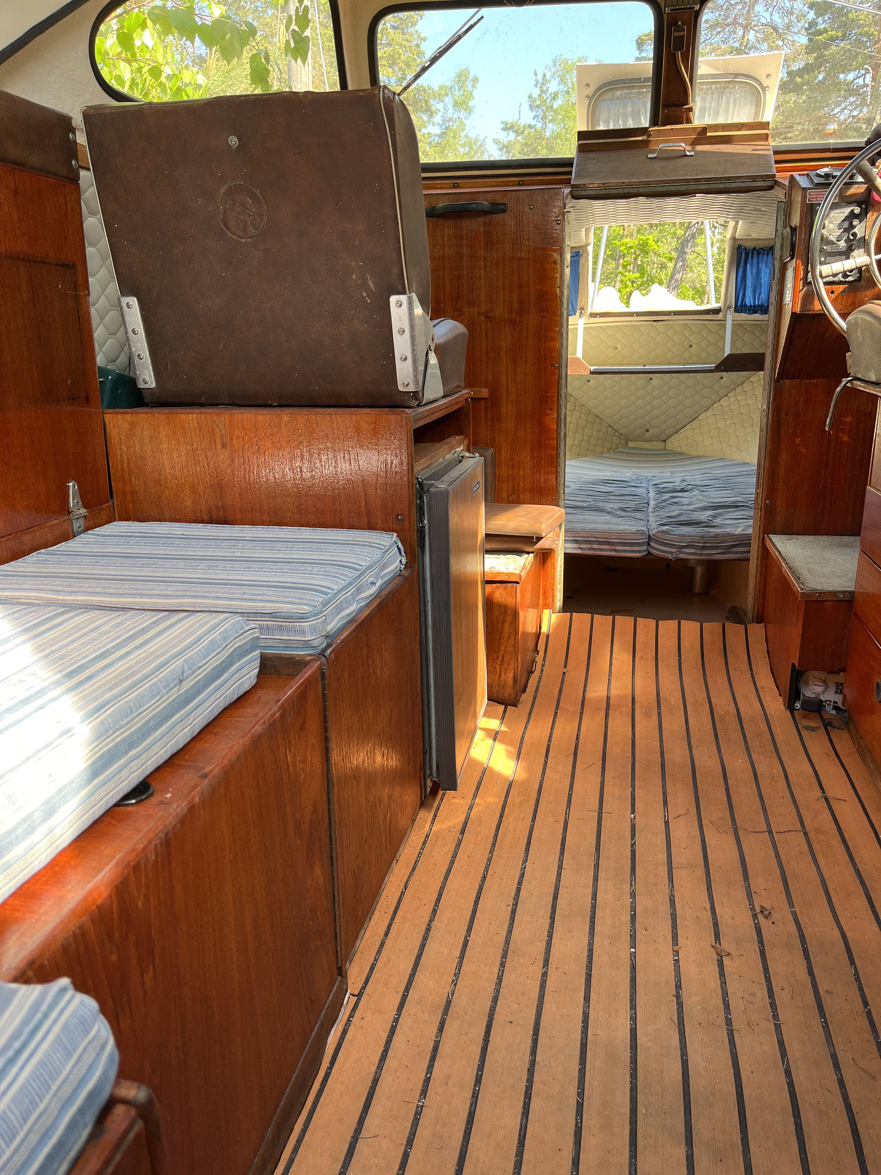 The 1981 Uttern 690 with Volvo penta VP 140 powered the AQ280 with drive lift. very new and changed, new generator in 2022, starter motor in 2022 and timing belt changed in 2022, new throttle and shifter in 2022. Double batteries 70+100 amp. You can comfortably sleep 2 adults and a child in the front ruff, in the rear ruff sleep two adults Large dining table with room for everyone. 2-burner gas cooker, fridge with small freezer compartment The cushions are freshly washed but worn, canopy complete and in normal condition, good standing height with the canopy folded up. A simpler launch trailer is included. A good boat for those who want to try boating or for those who have outgrown their boat and need space for the family.