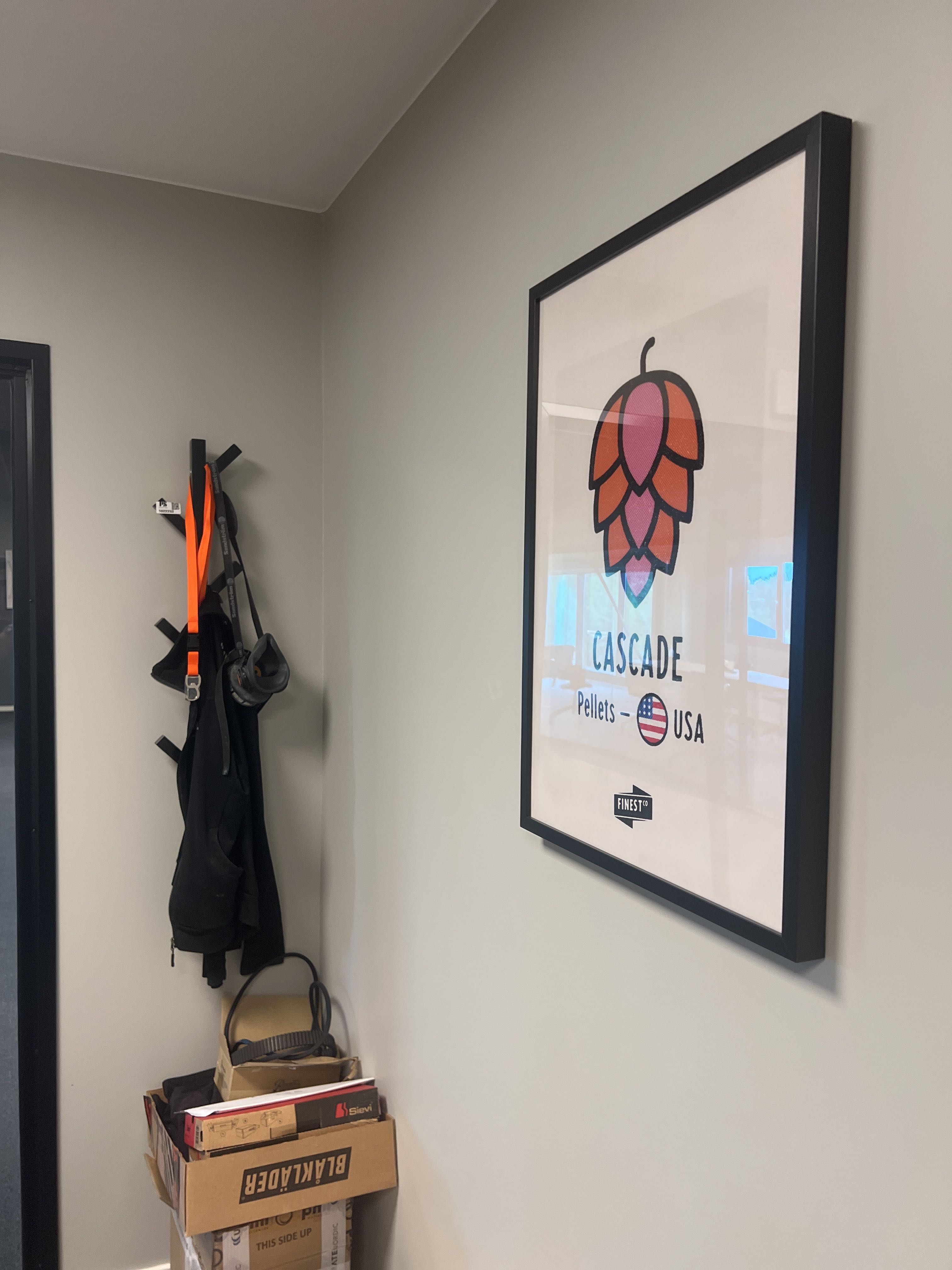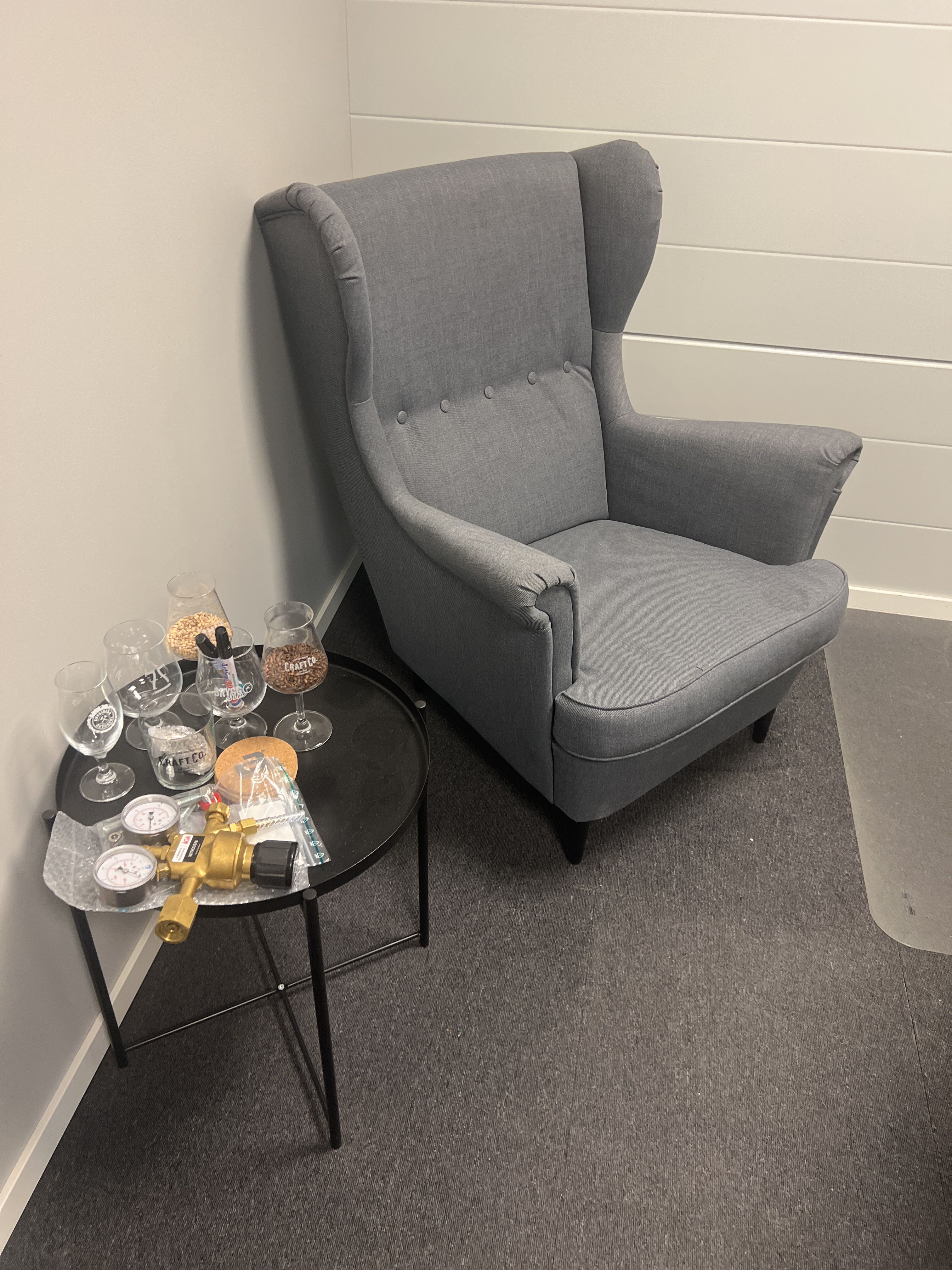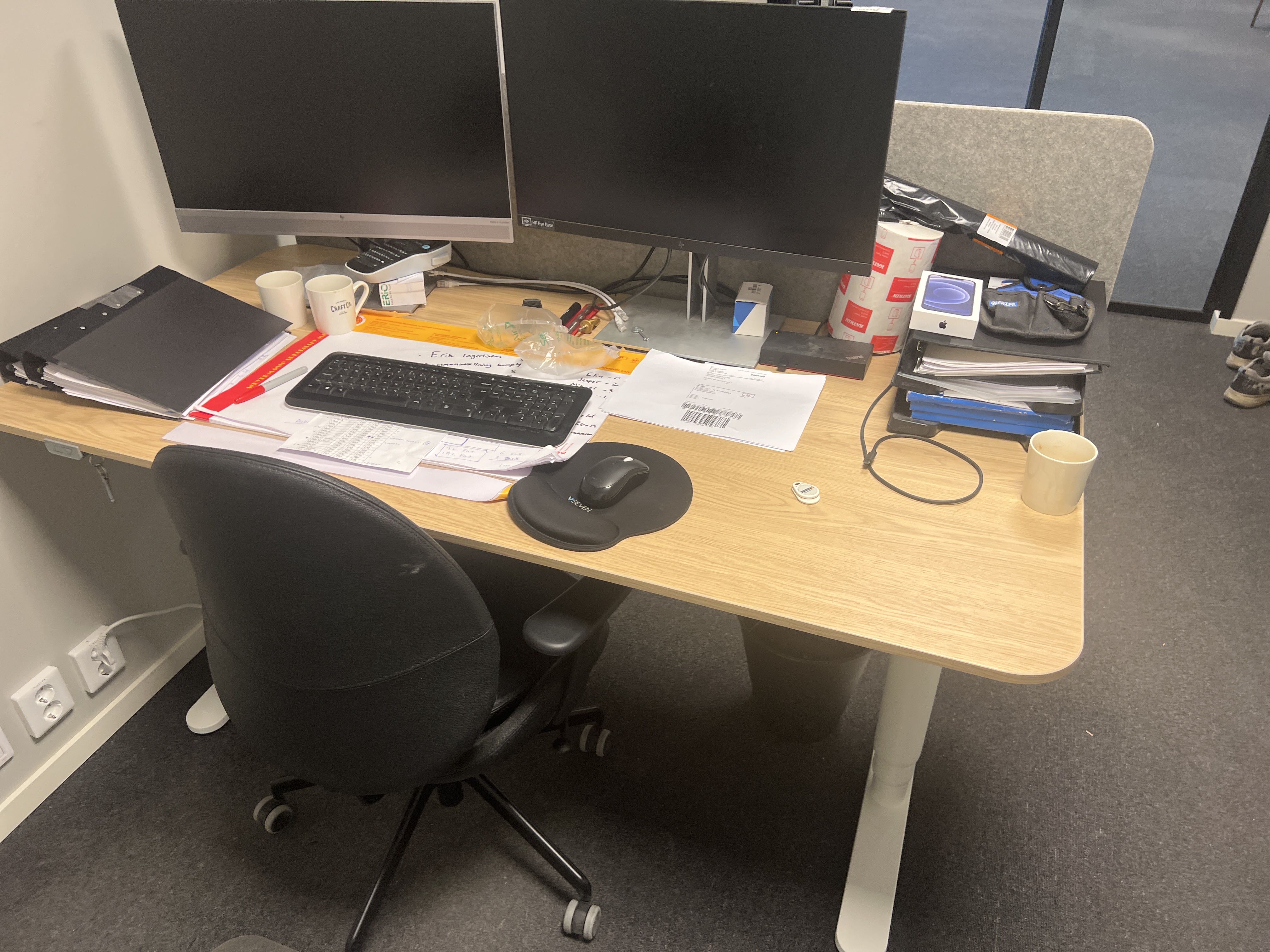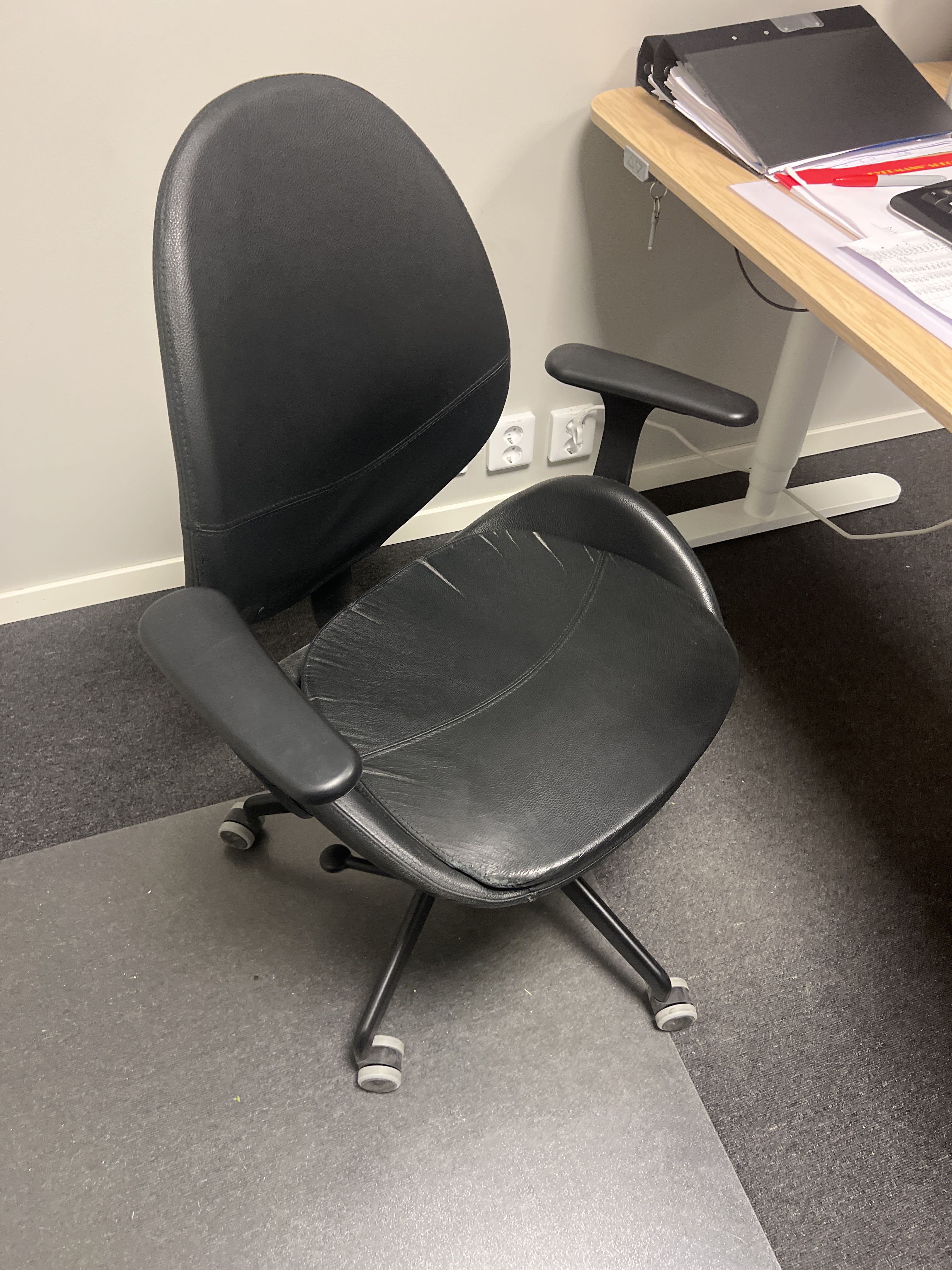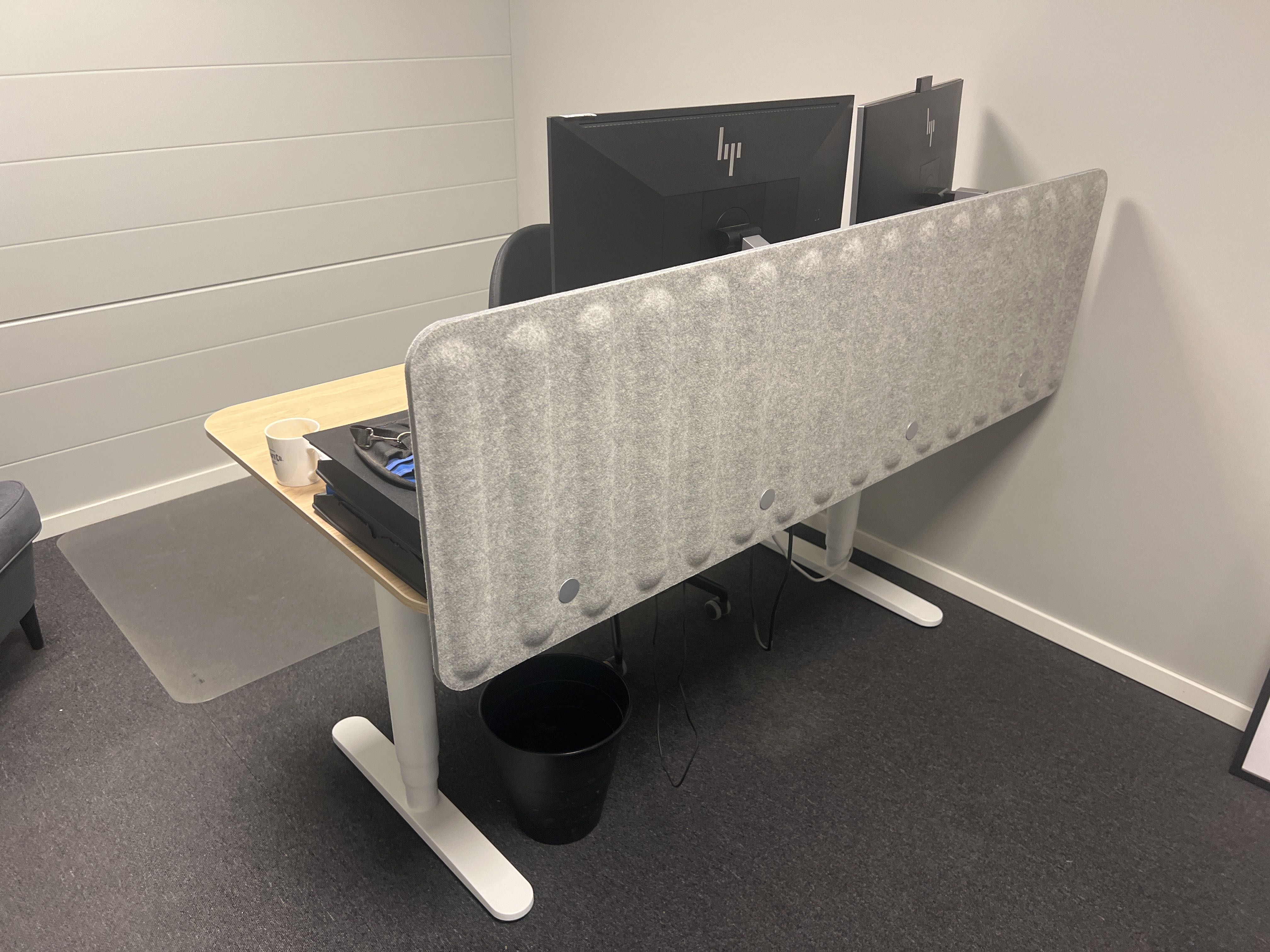Office workplace consisting of e.g. desk, chair, armchair, coffee table, boards, clothes hangers and more