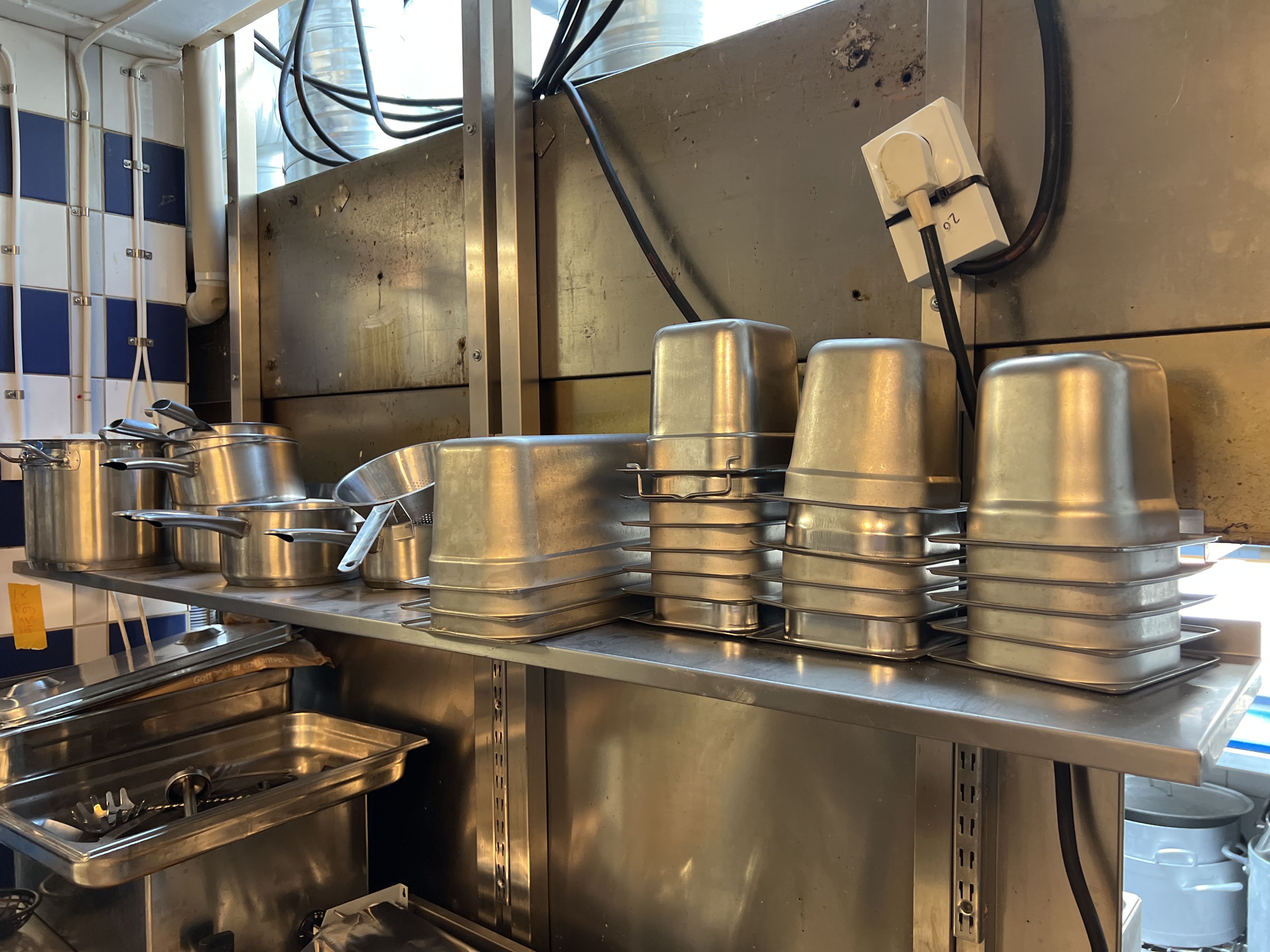 Stainless steel workbench with water bath and shelf with canteens