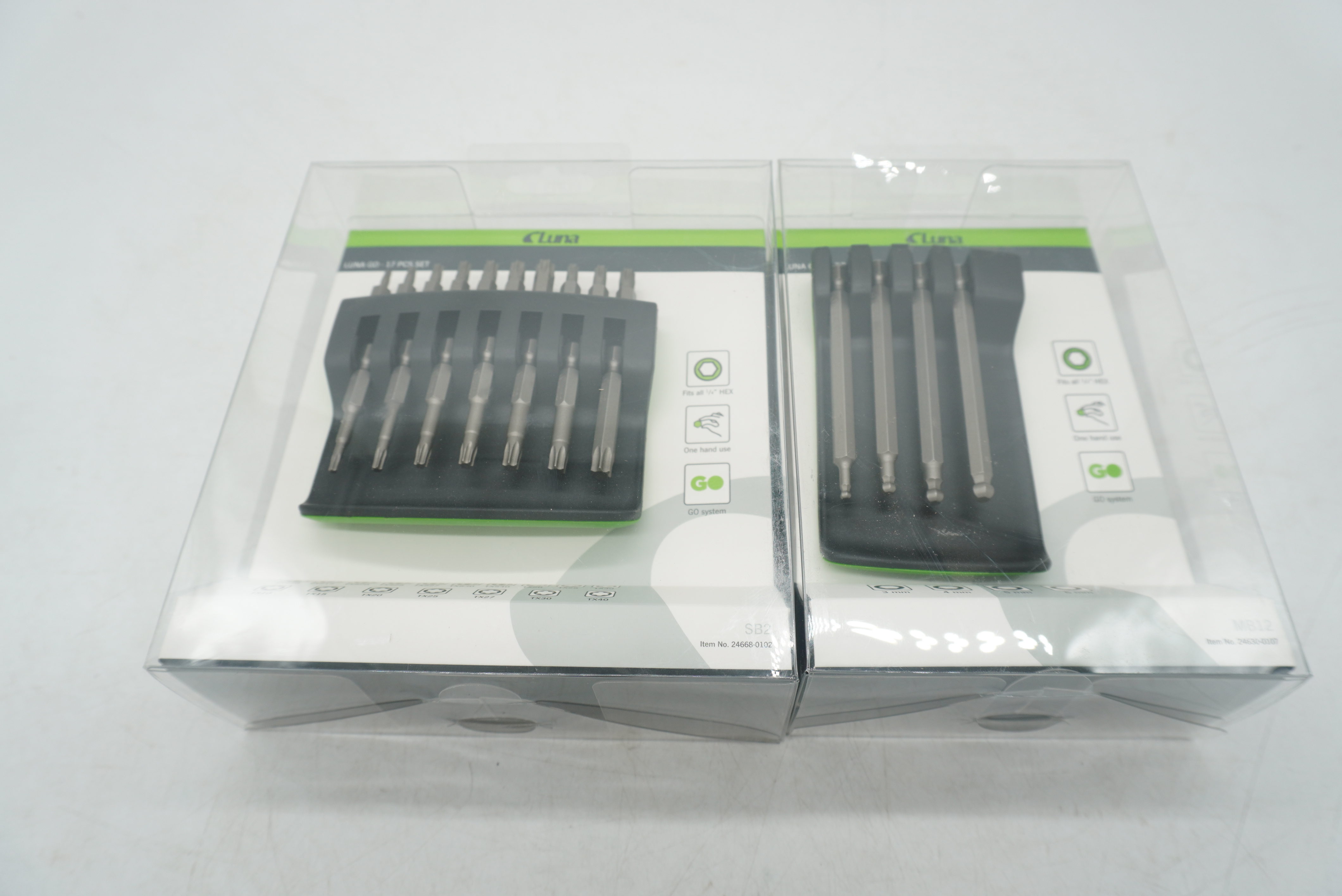 4 piece bit set in Luna GO tool holder system. The tool holder has room for one top-mounted and four hanging tools in a unique suspension system with magnetic locking. For quick, smooth handling and good storage of tools with 1/4'' hexagon socket.