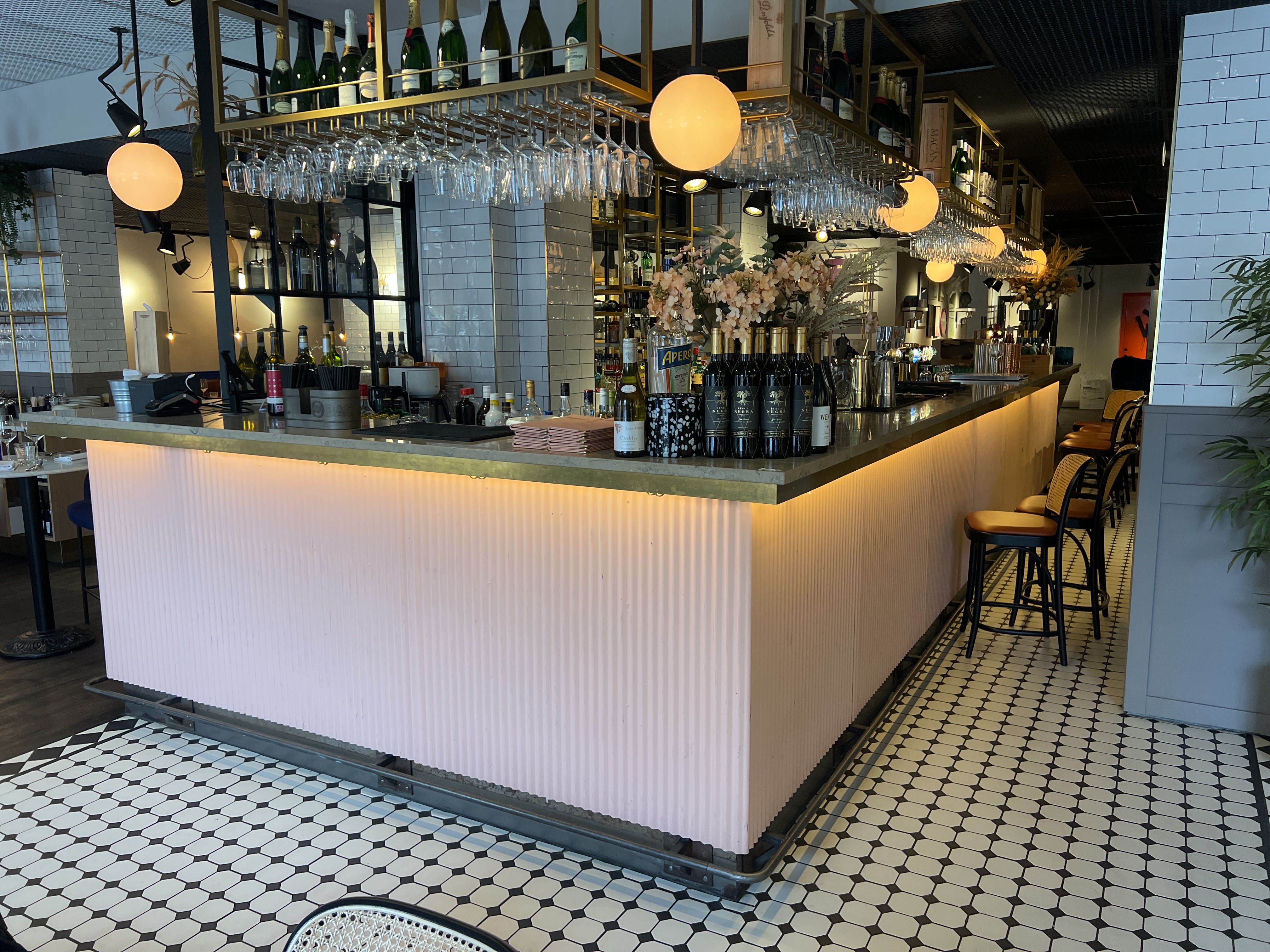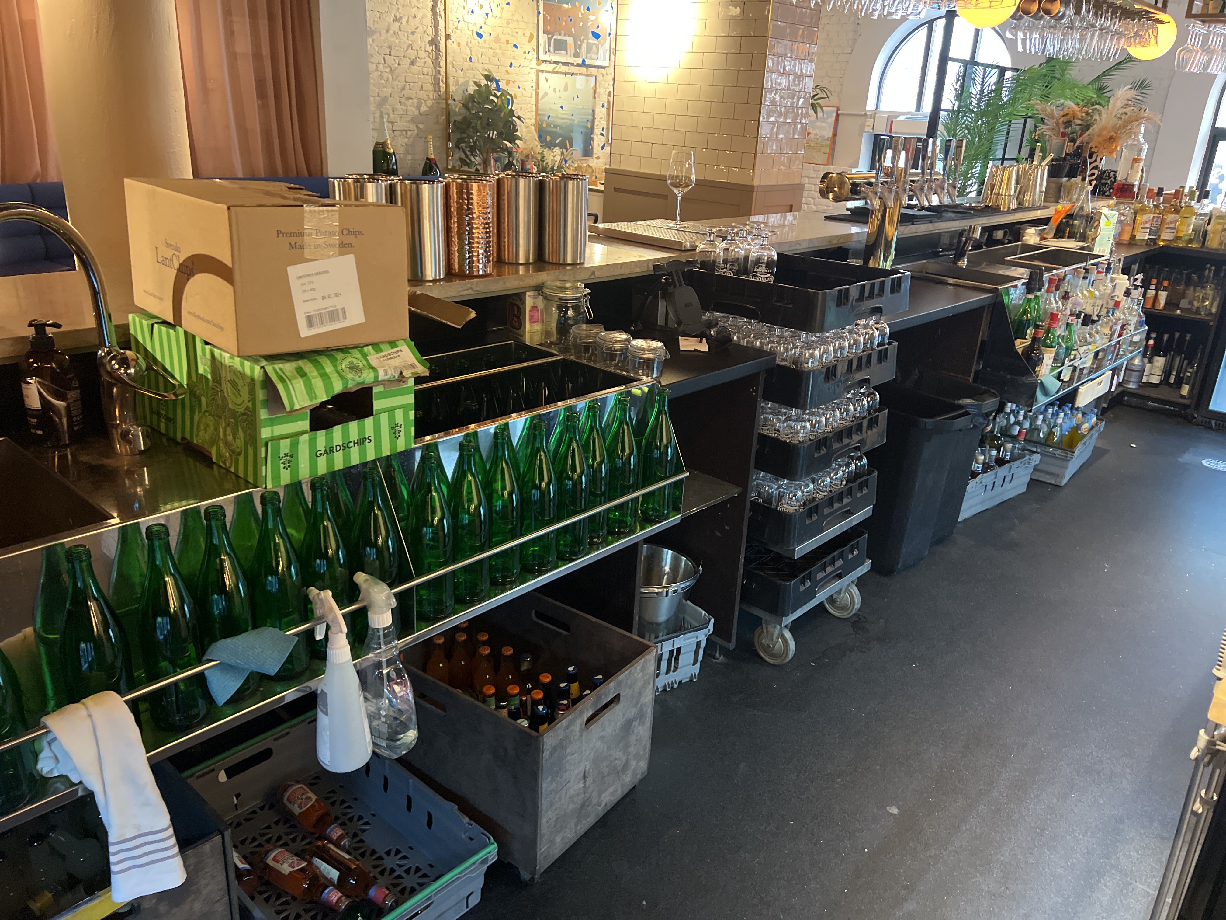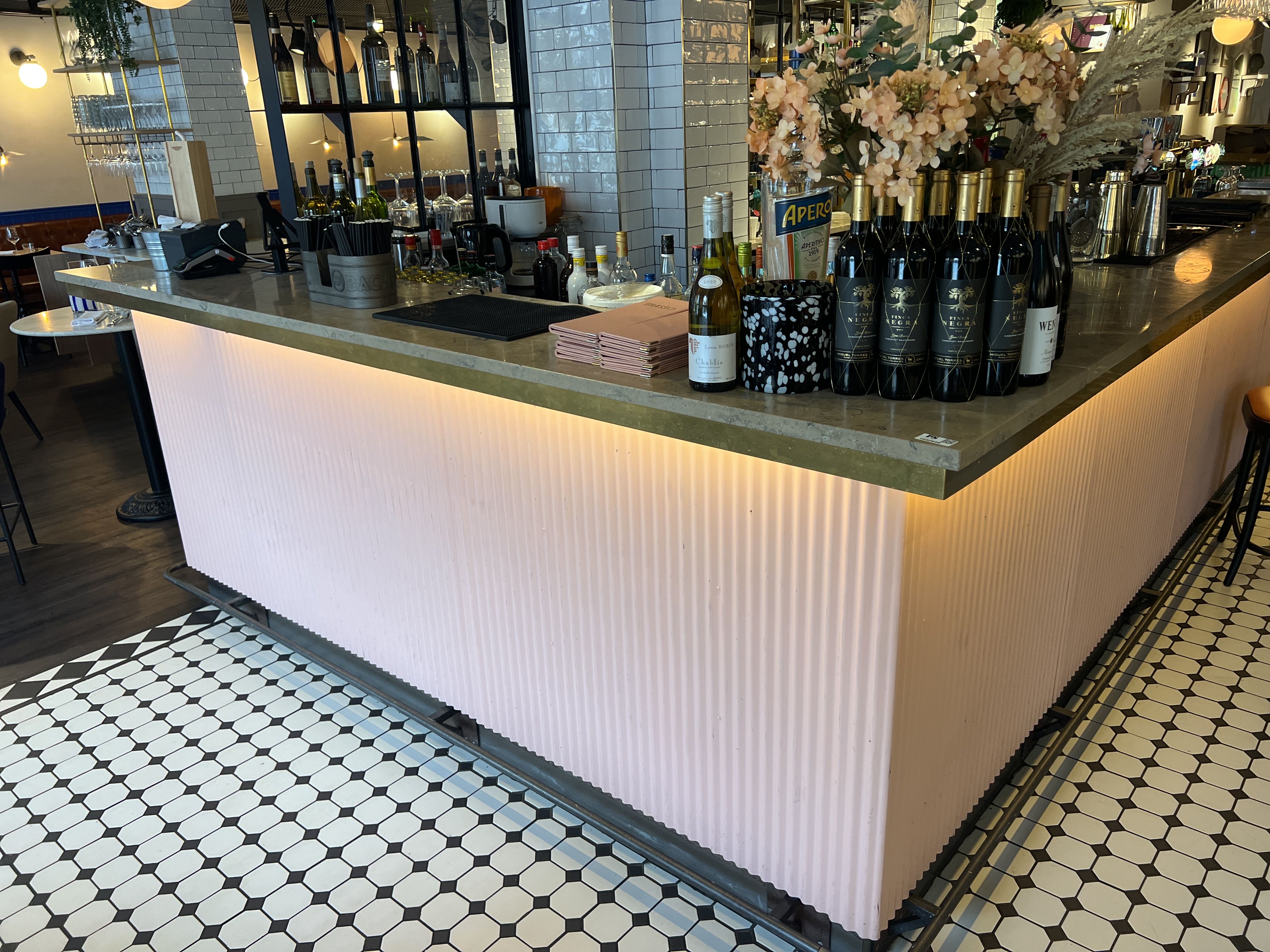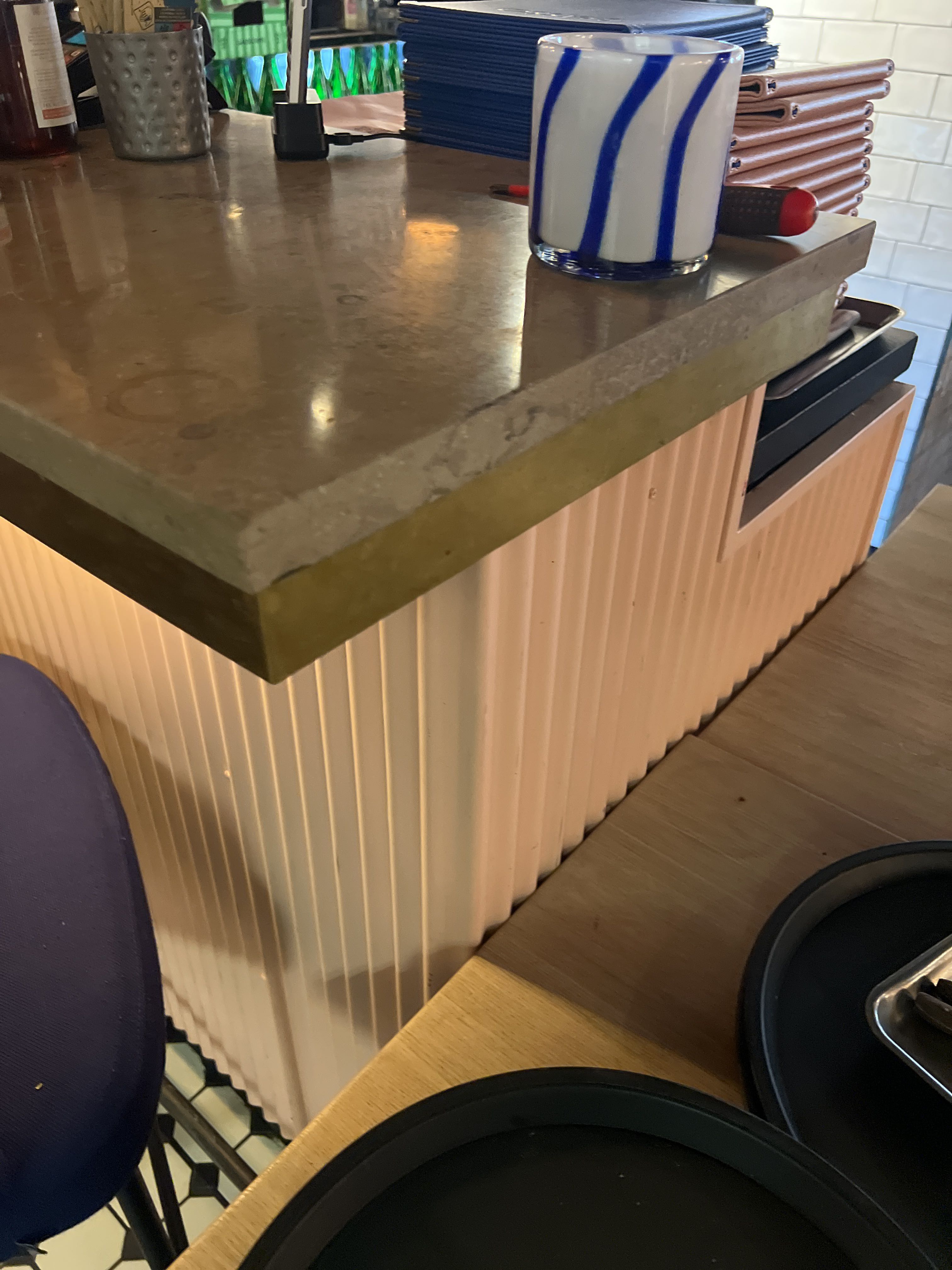 Bar with stone slab and pink plate for disassembly.
