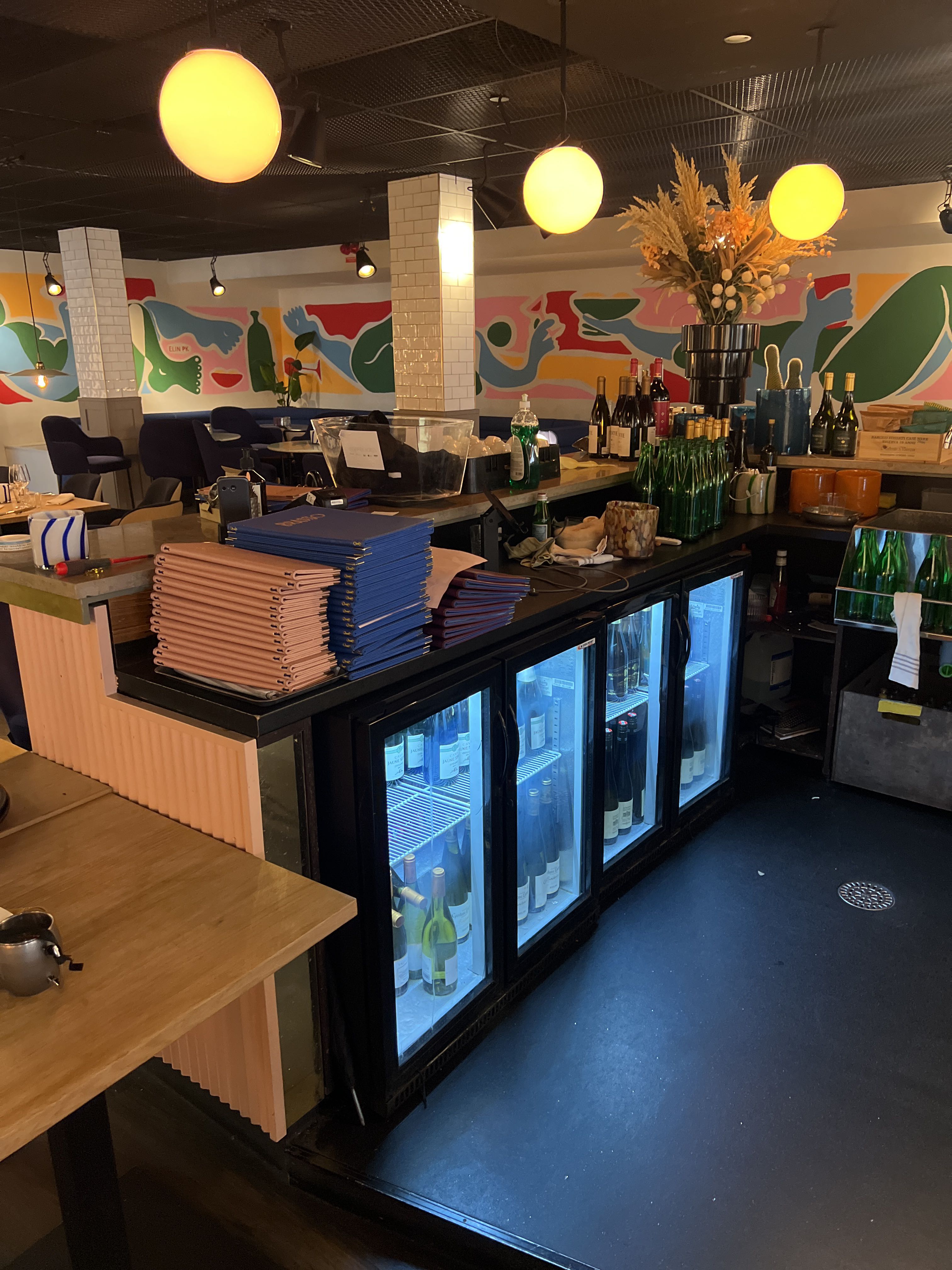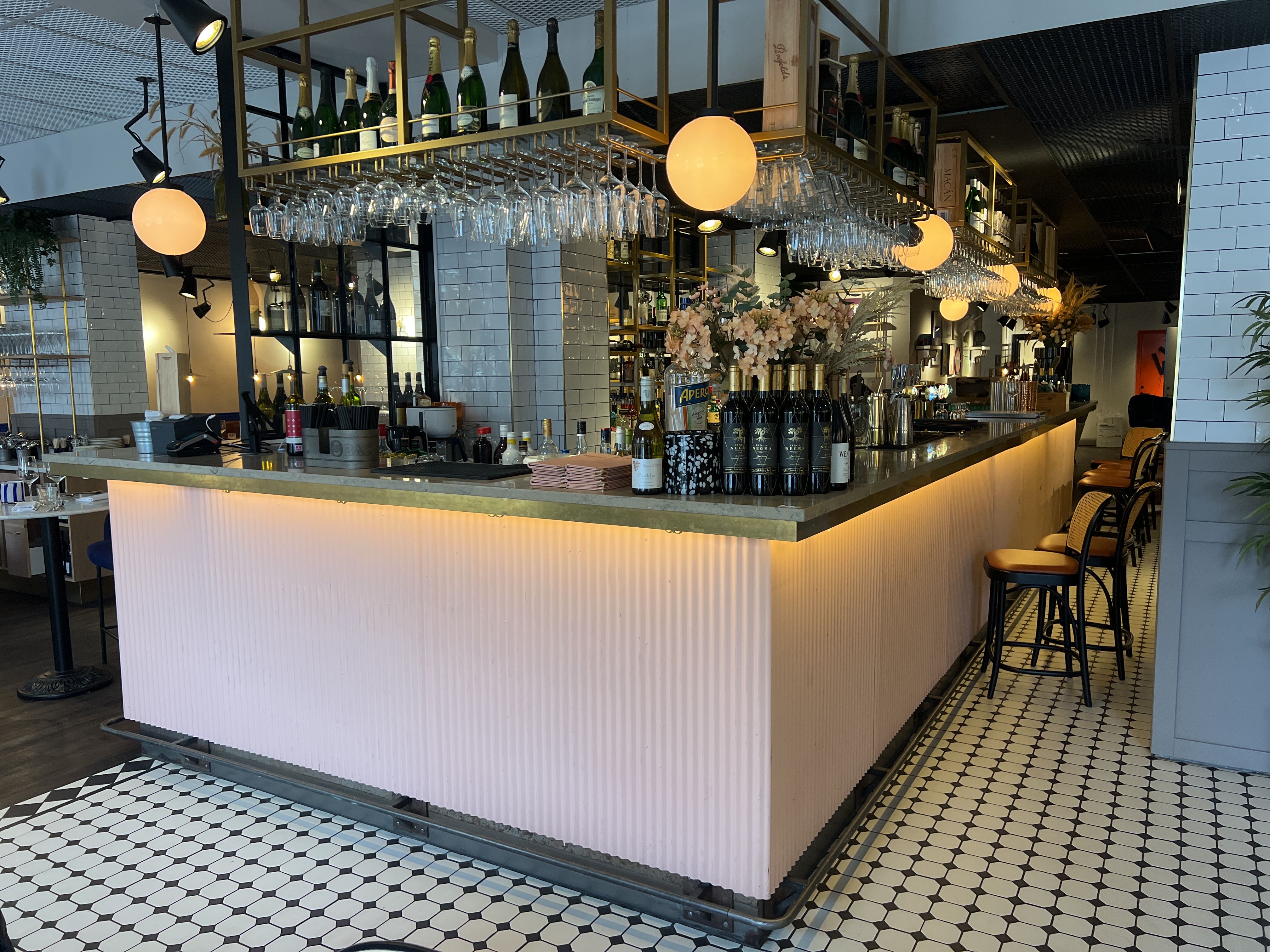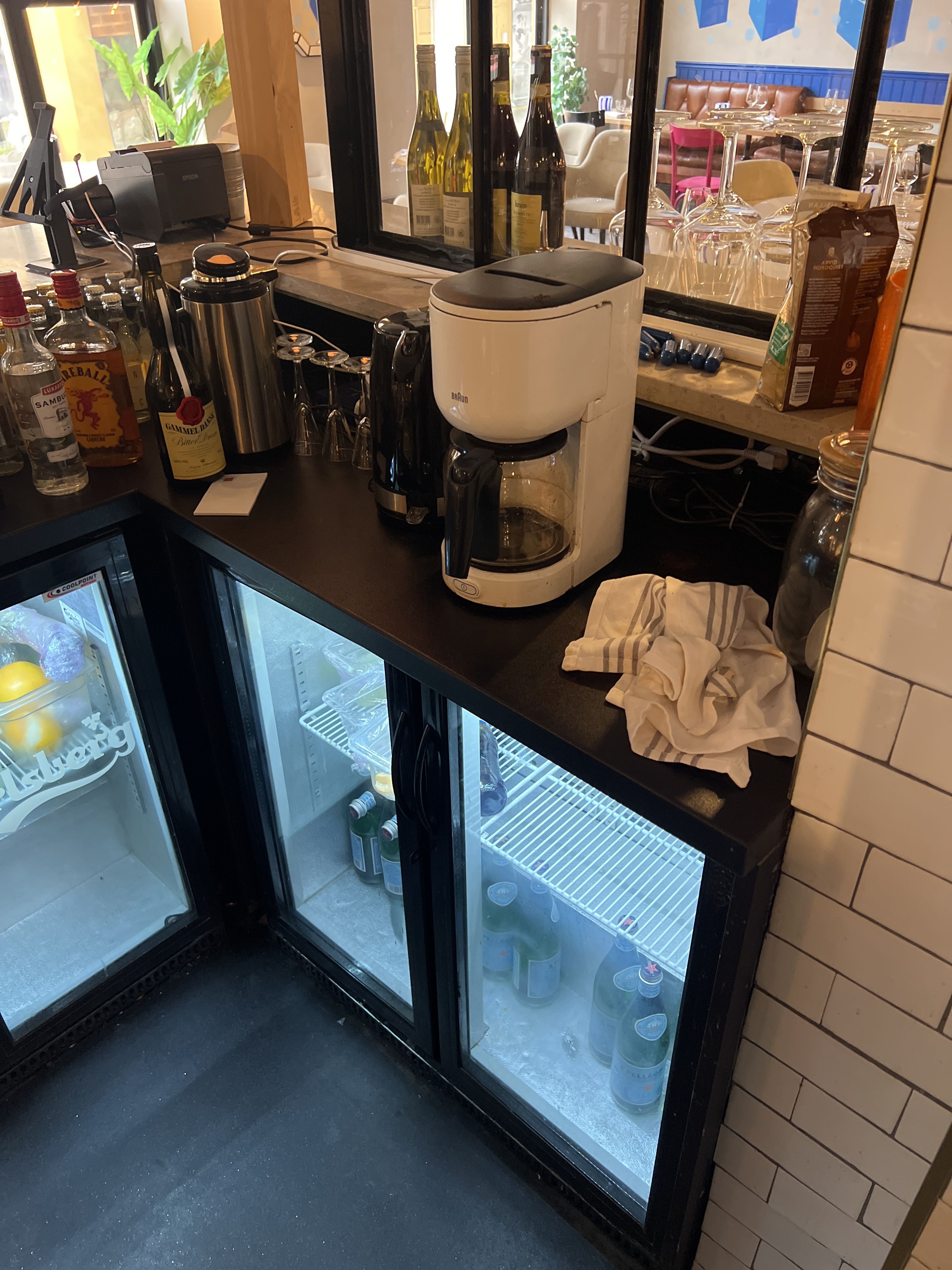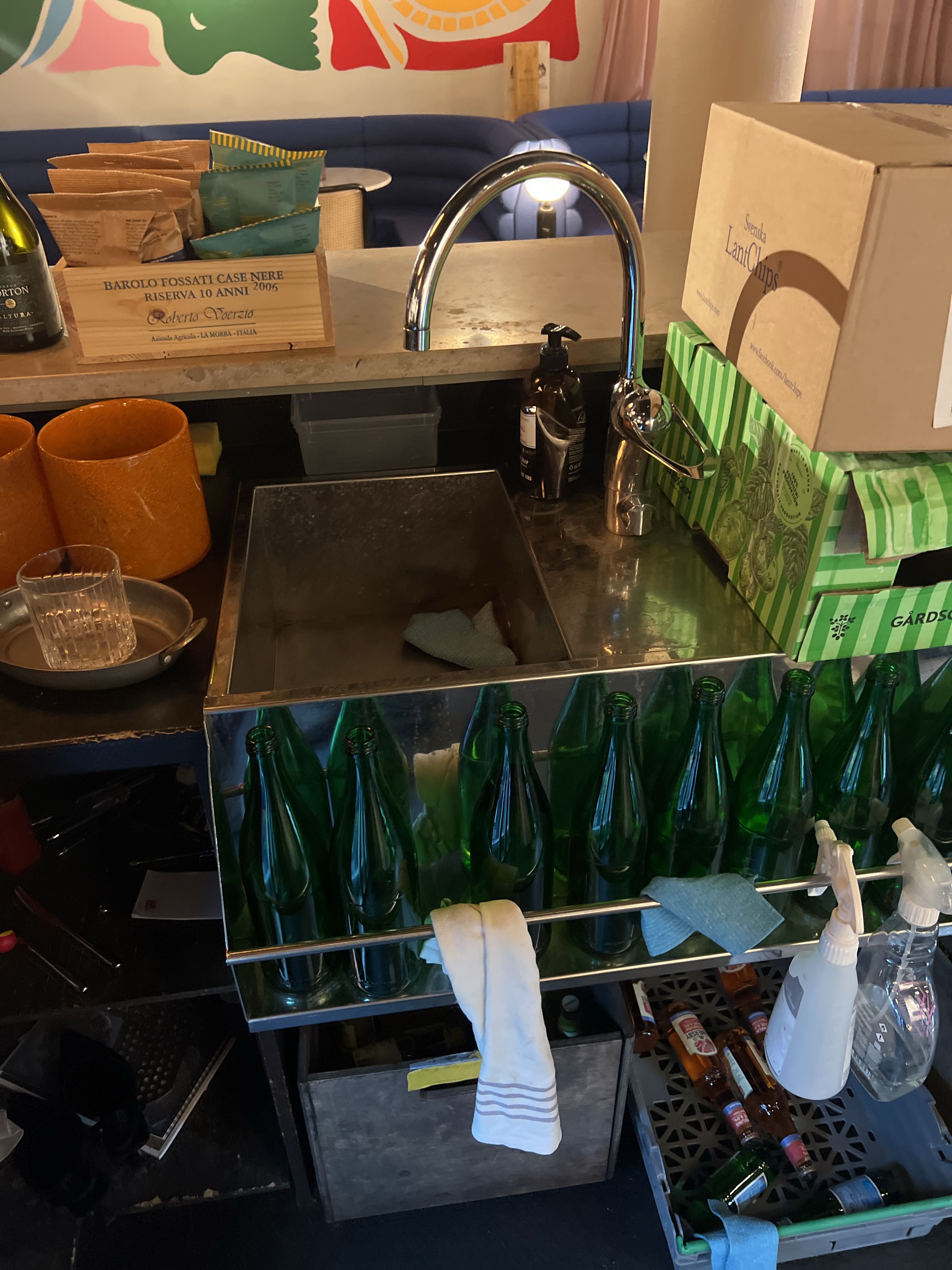 Bar with stone slab and pink plate for disassembly.