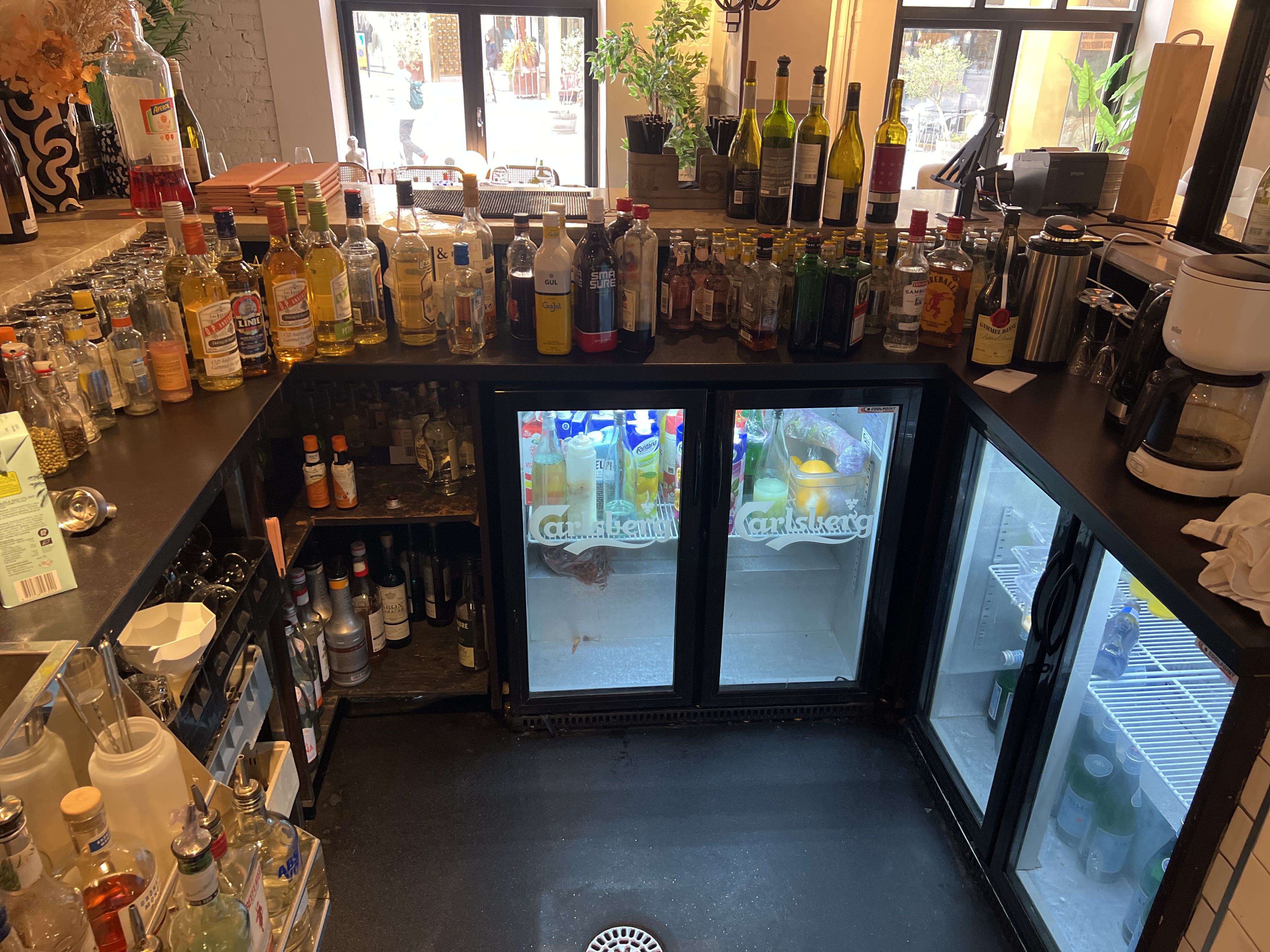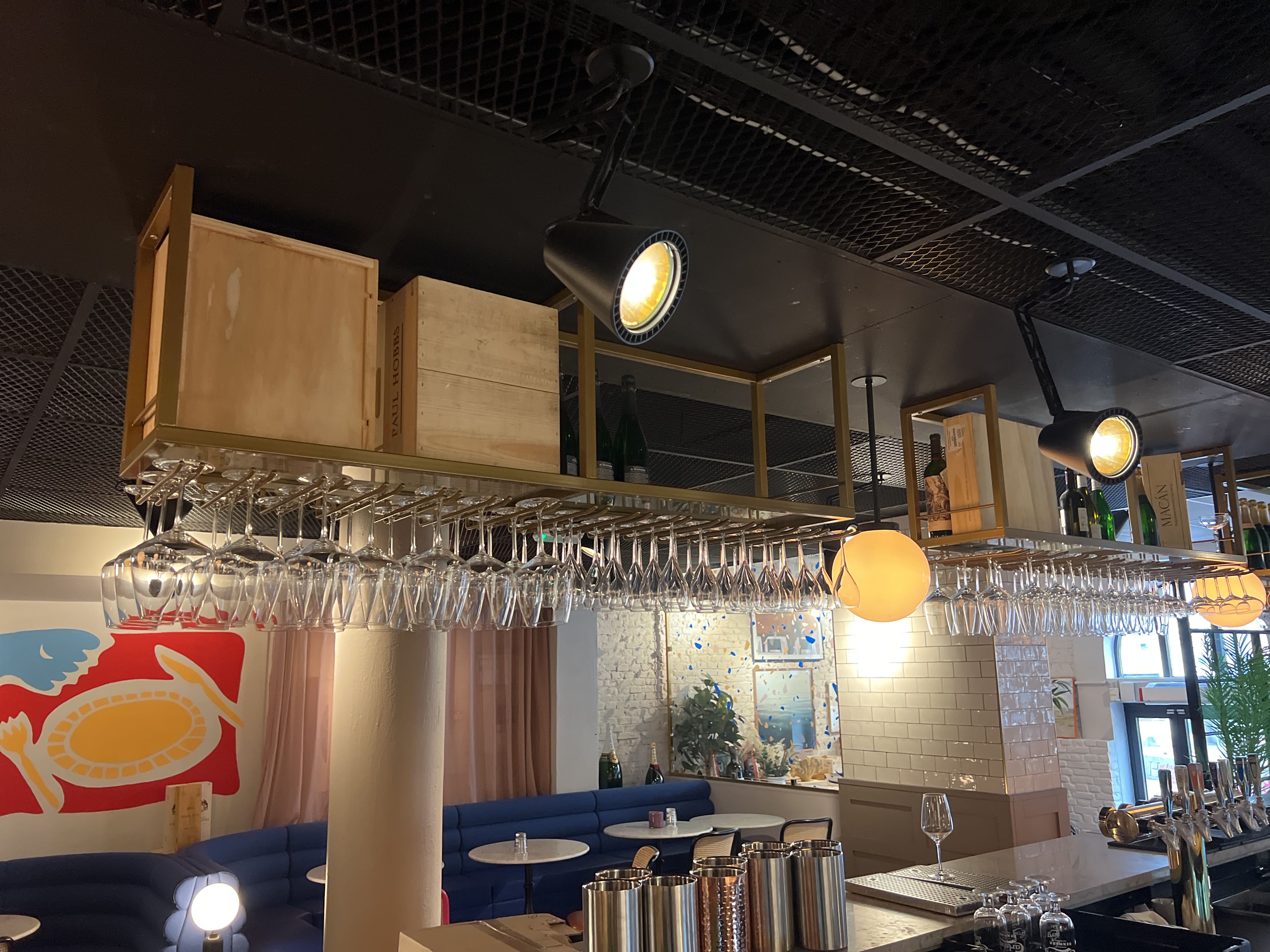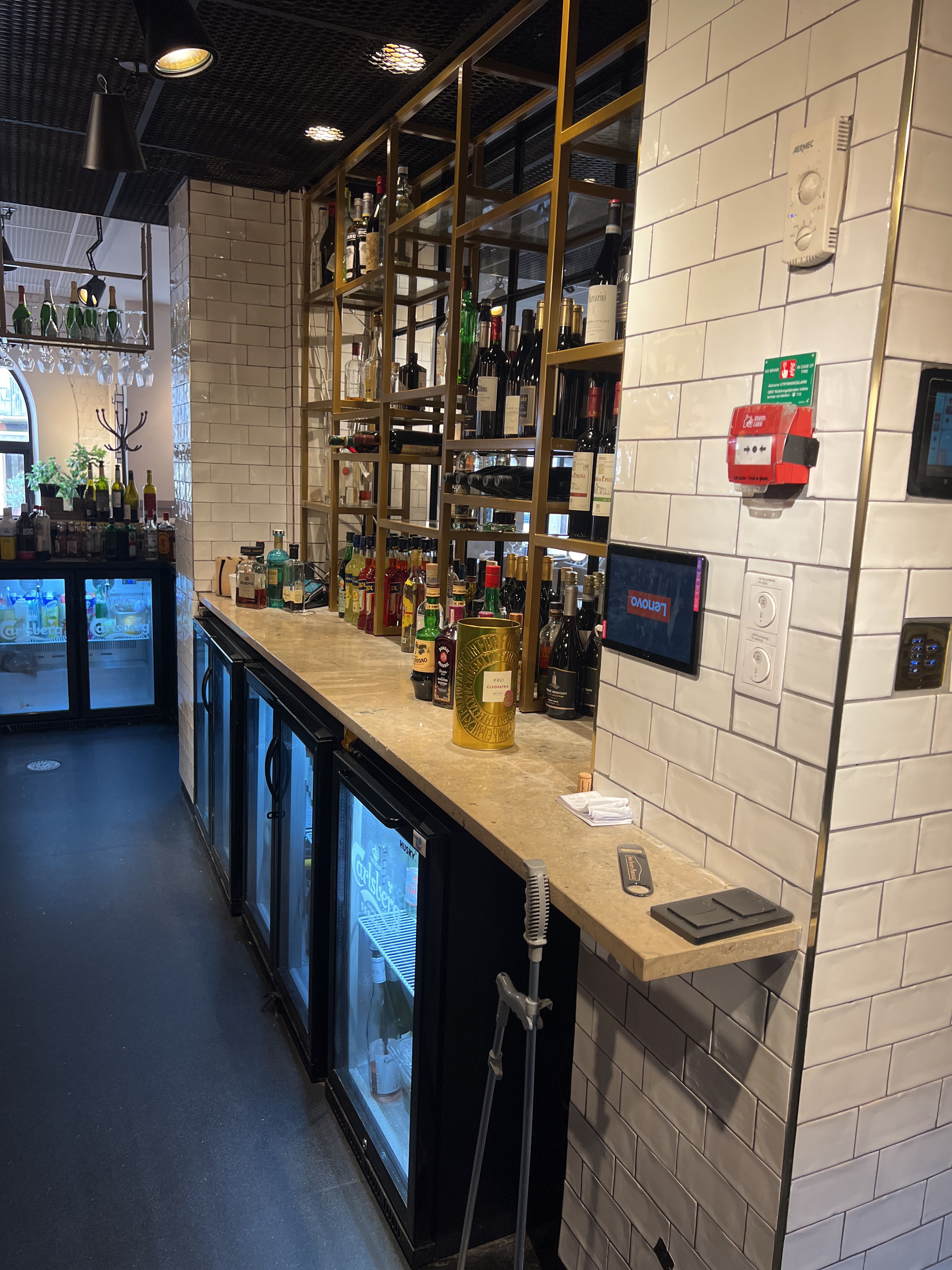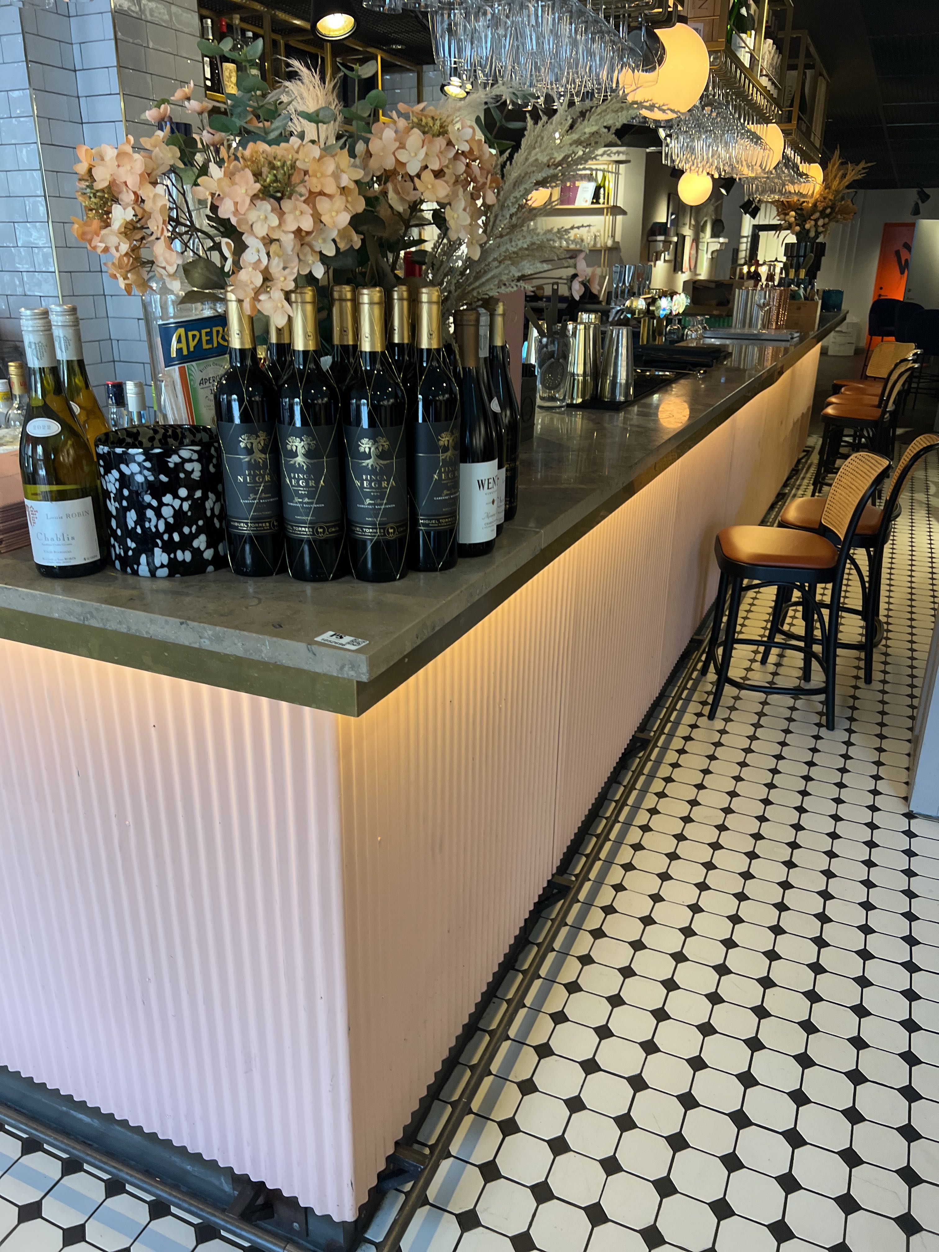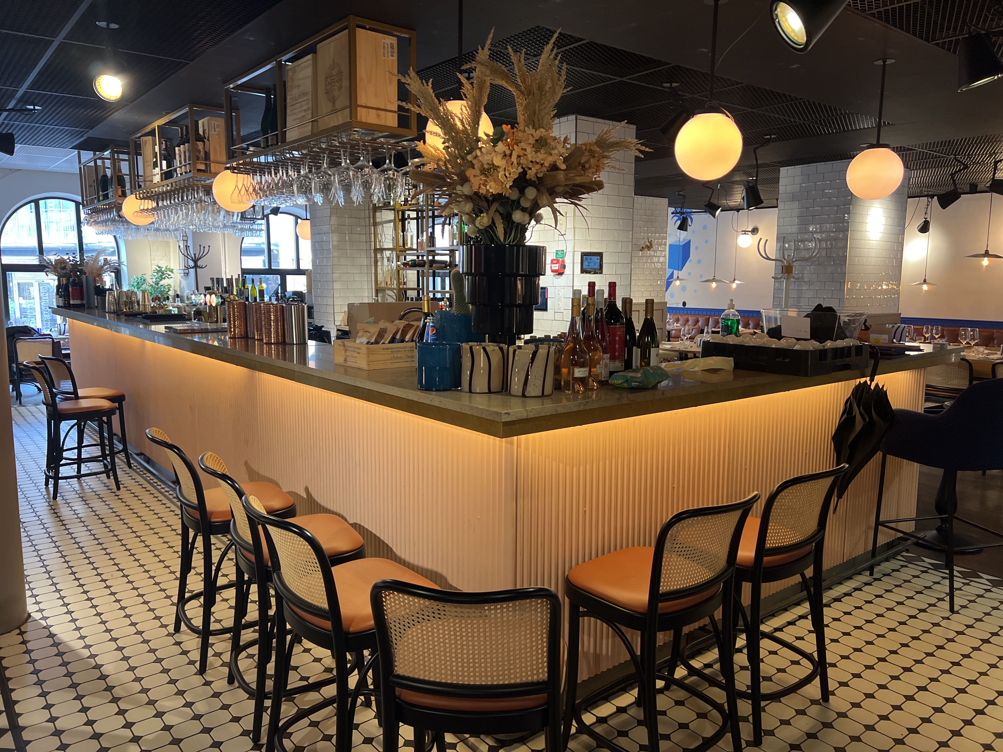 Bar with stone slab and pink plate for disassembly.
