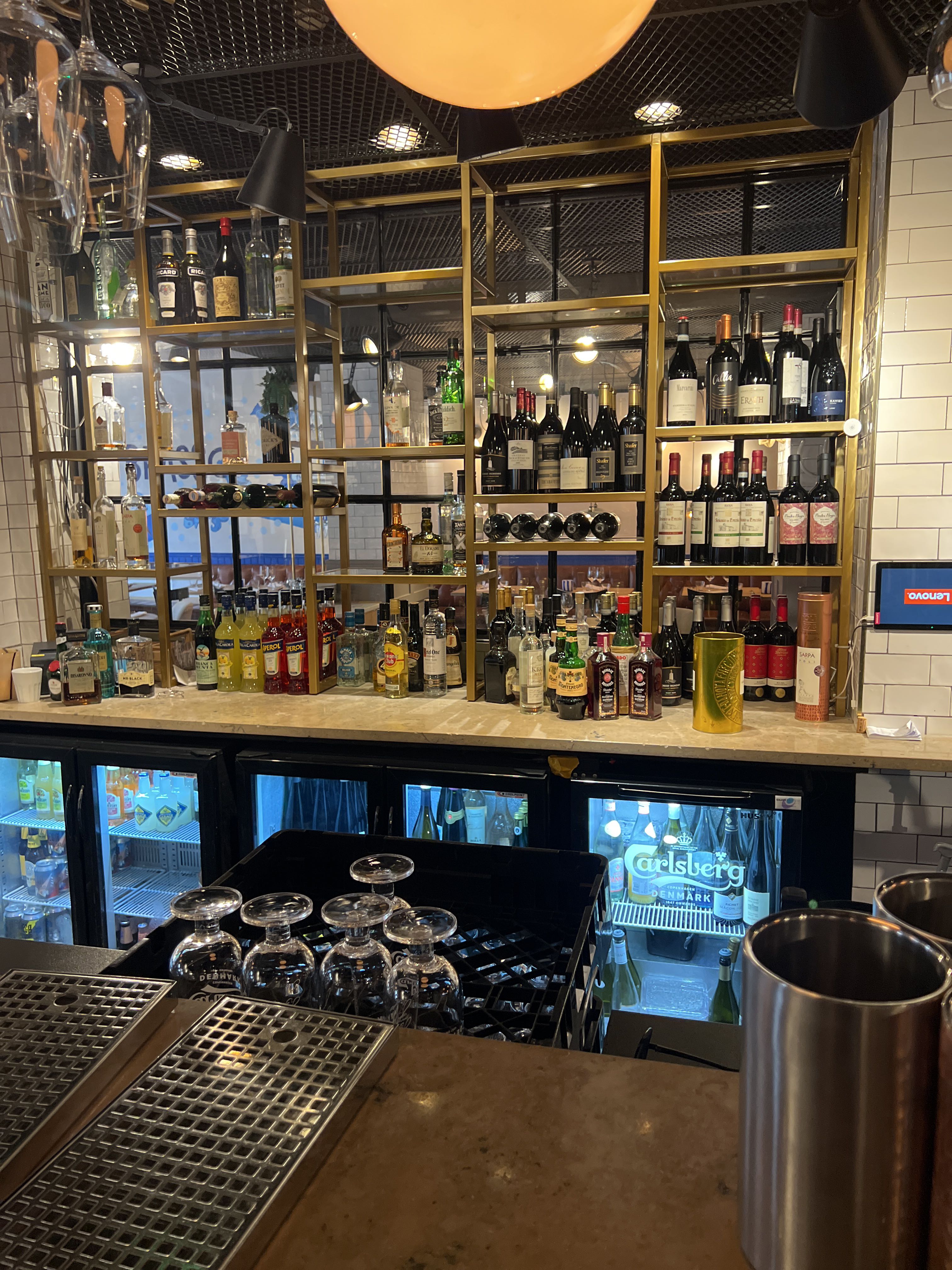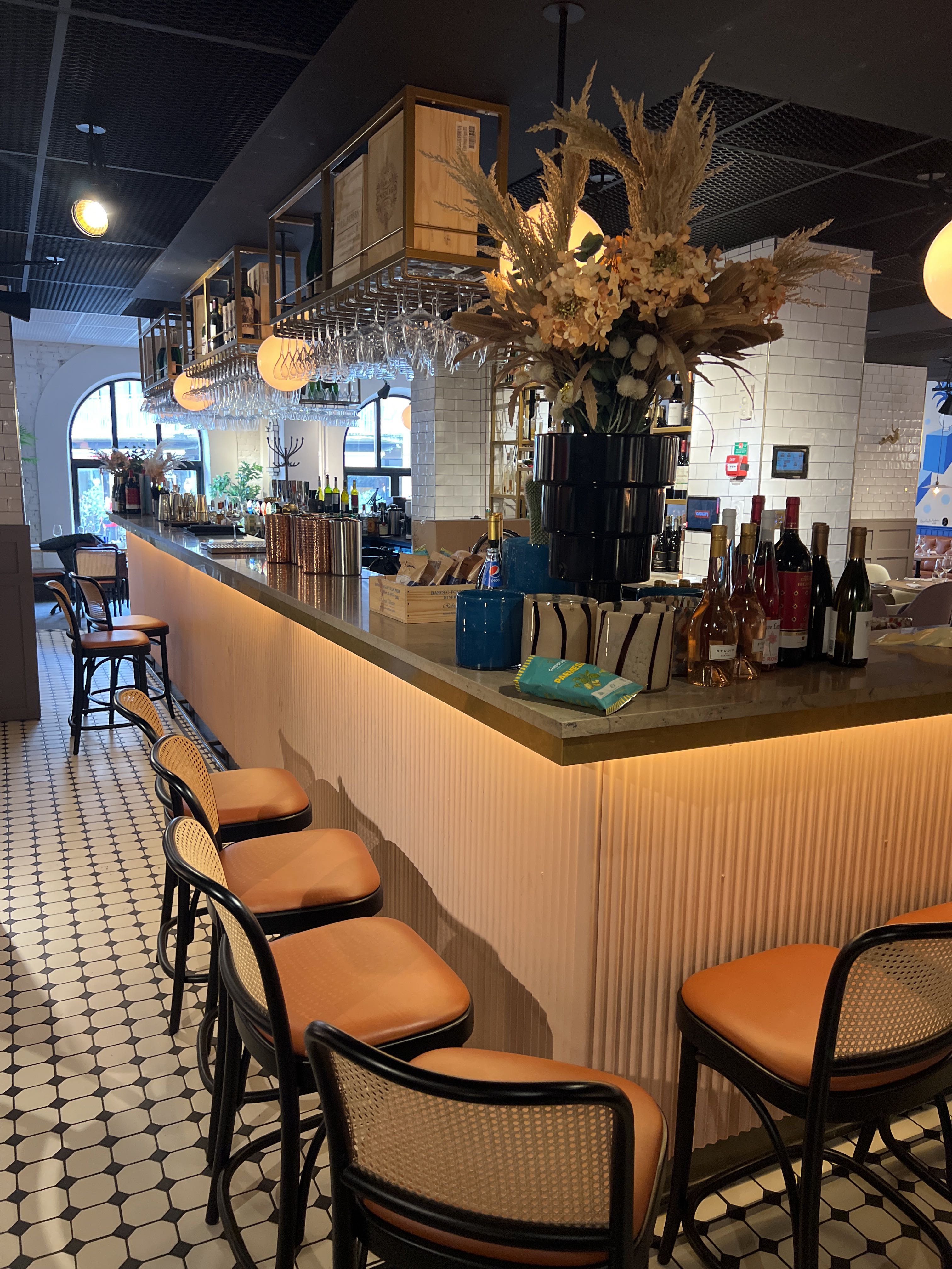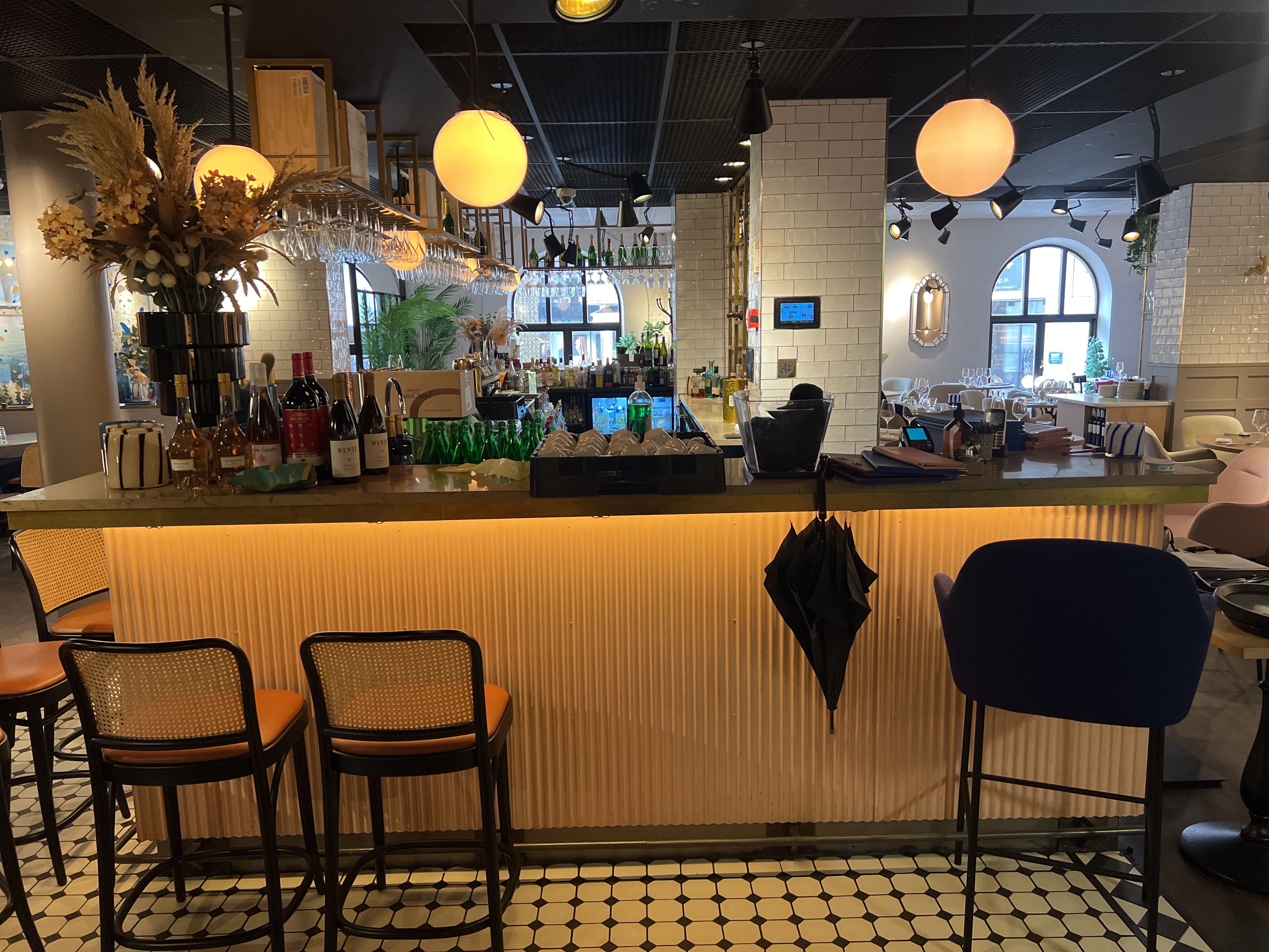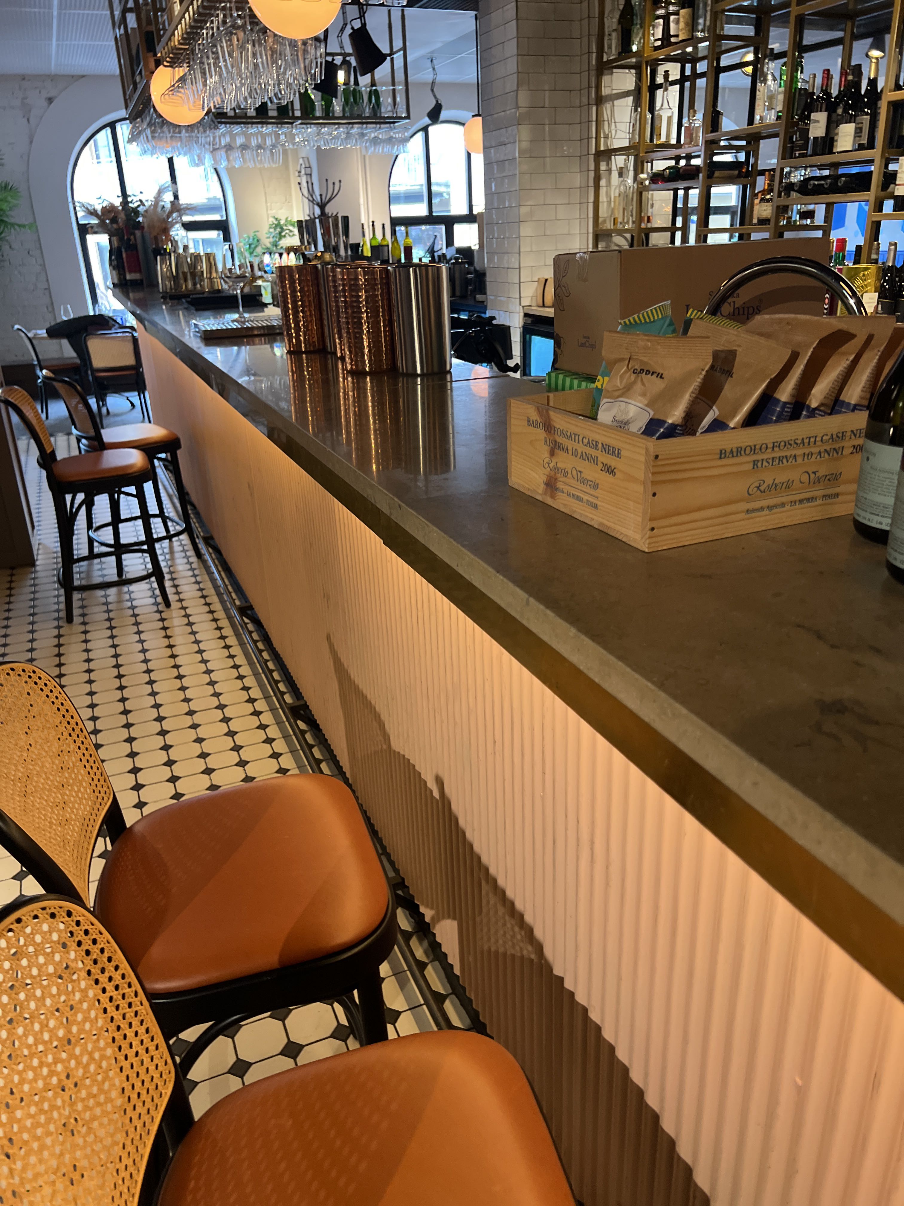 Bar with stone slab and pink plate for disassembly.