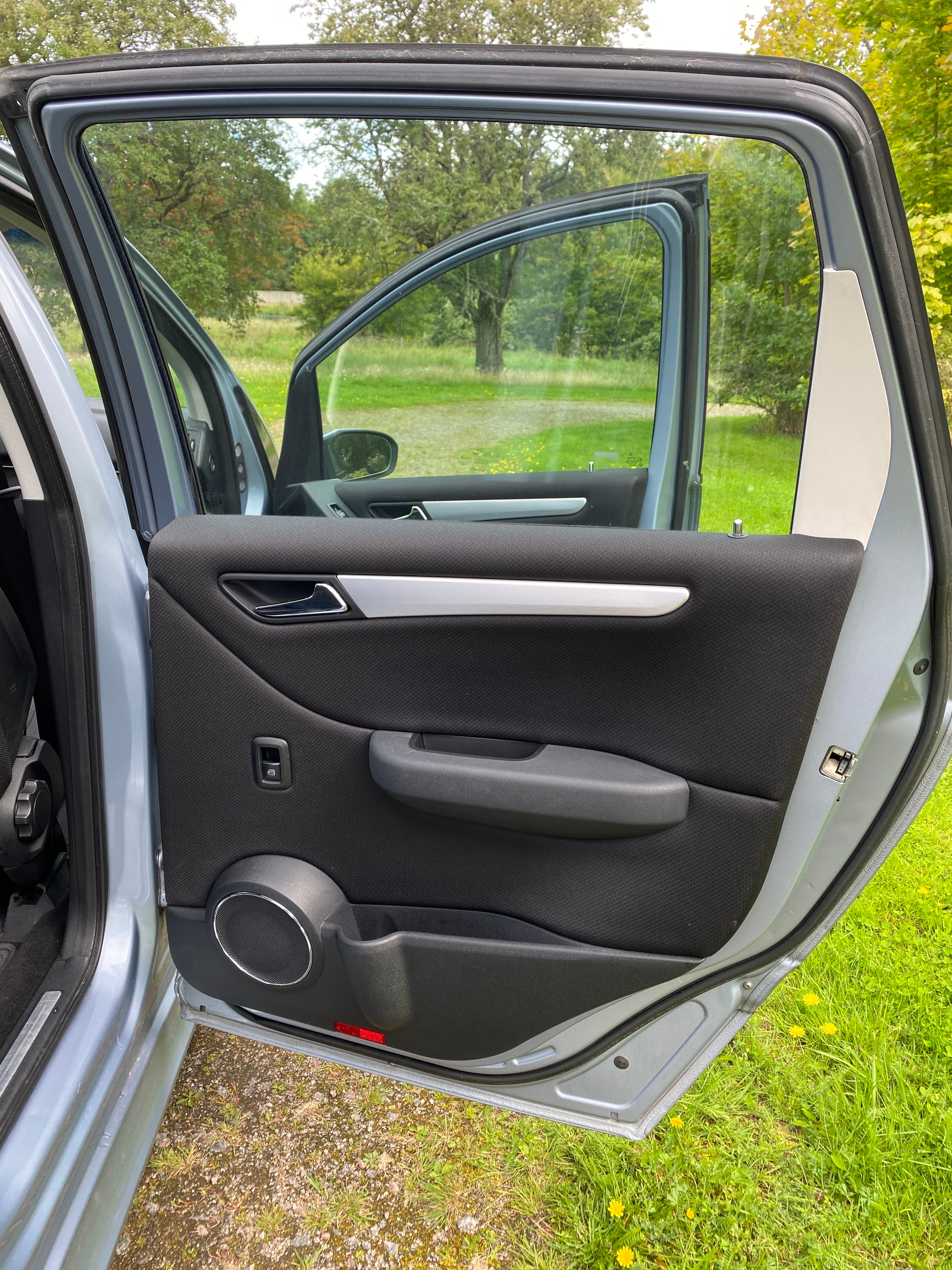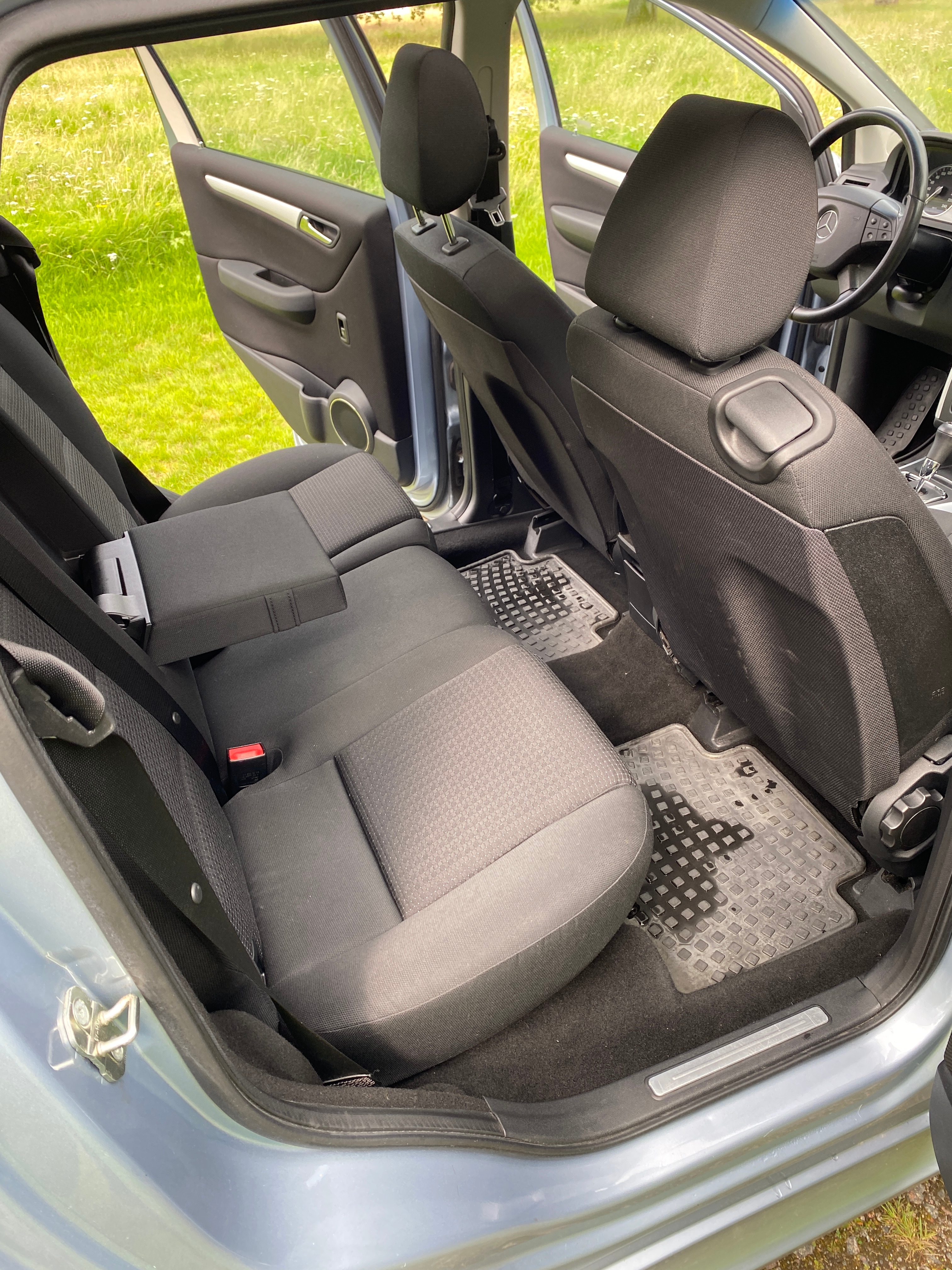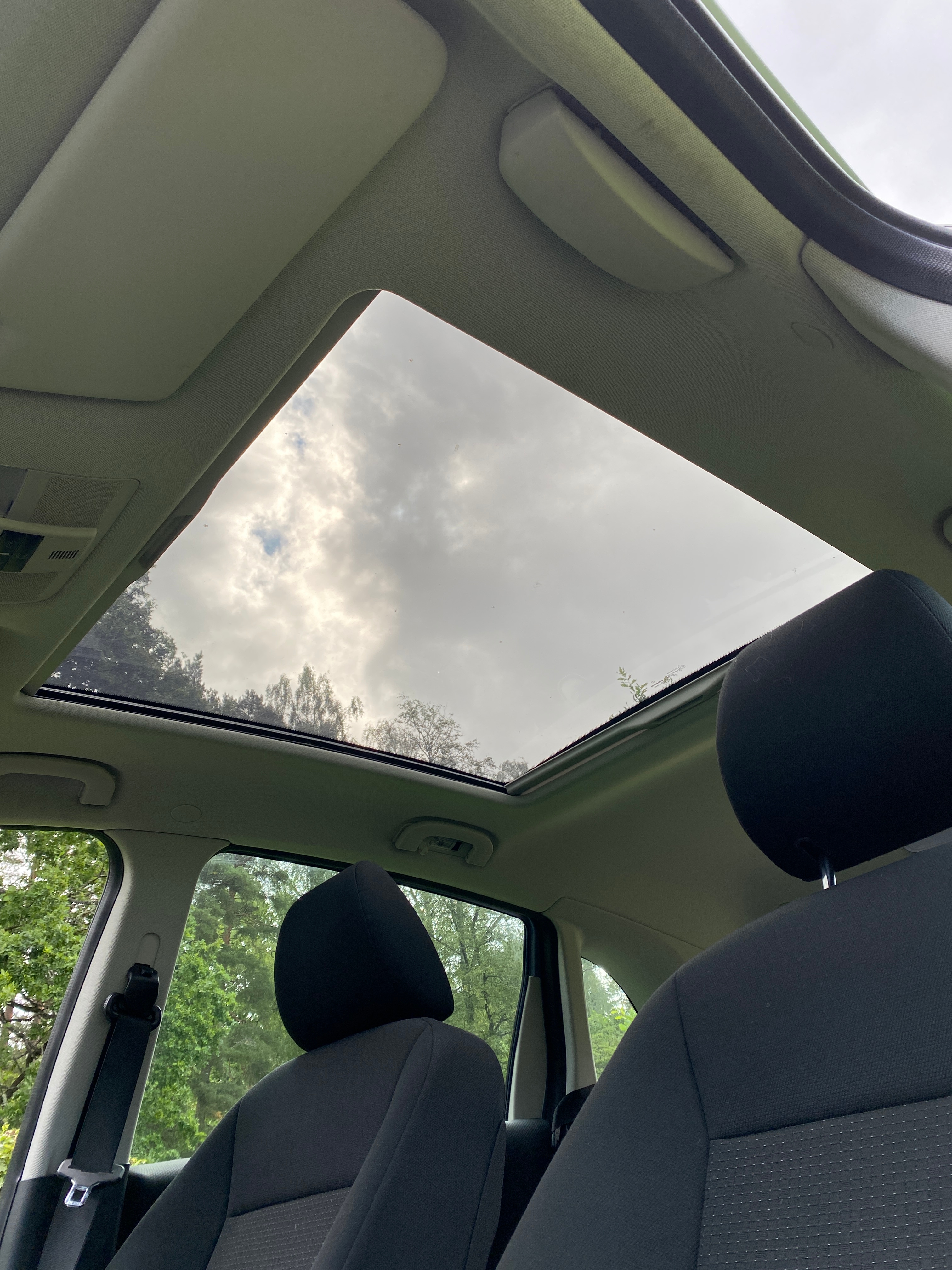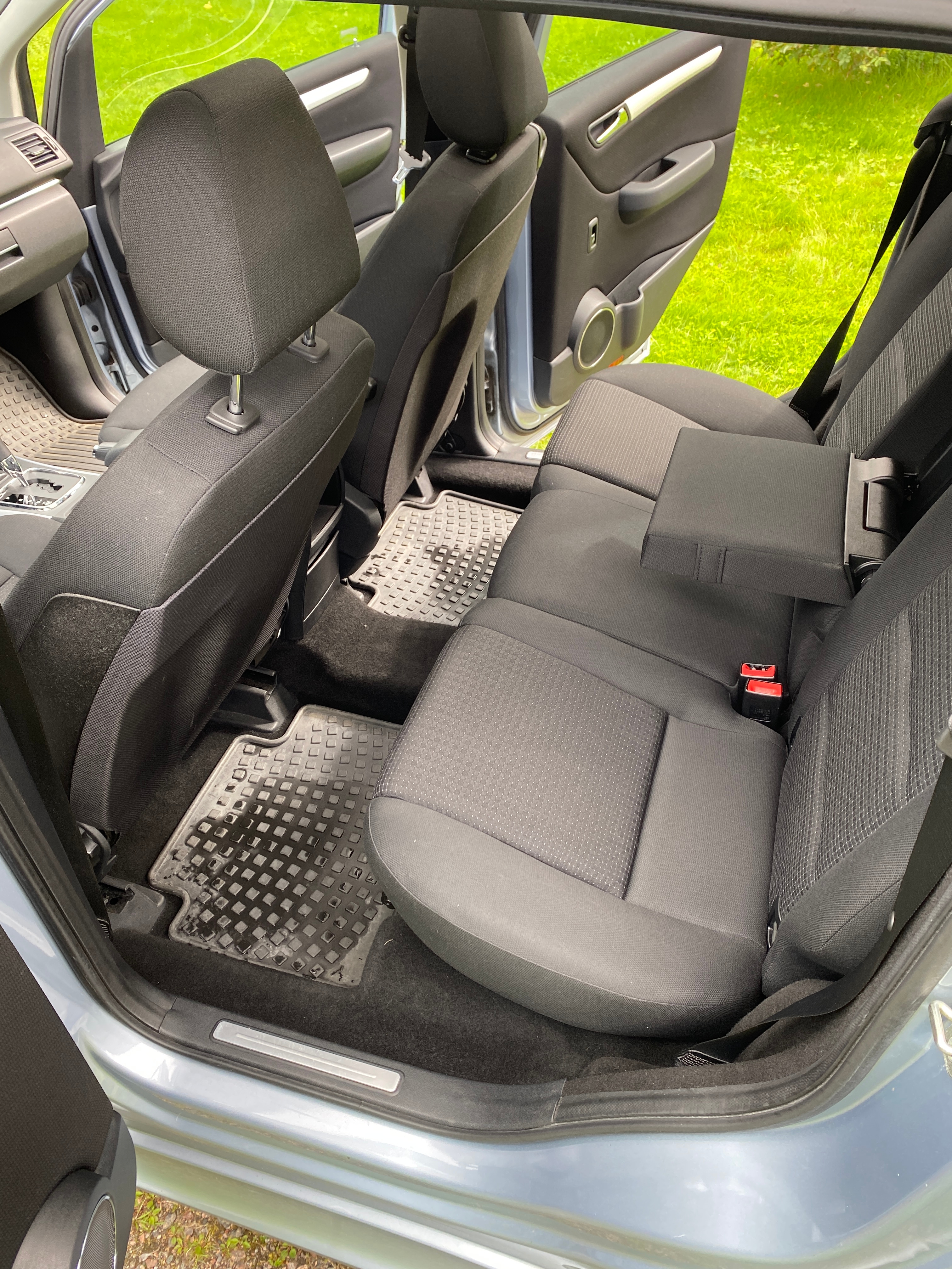 Light blue metallic with black fabric interior. Equipped with cruise control, multifunction steering wheel, panoramic roof, AC, stereo, sport mode, electric mirrors and electric windows, split rear seat, rear privacy curtain, heated seats, rain sensor, removable towbar, built-in child seats and more.