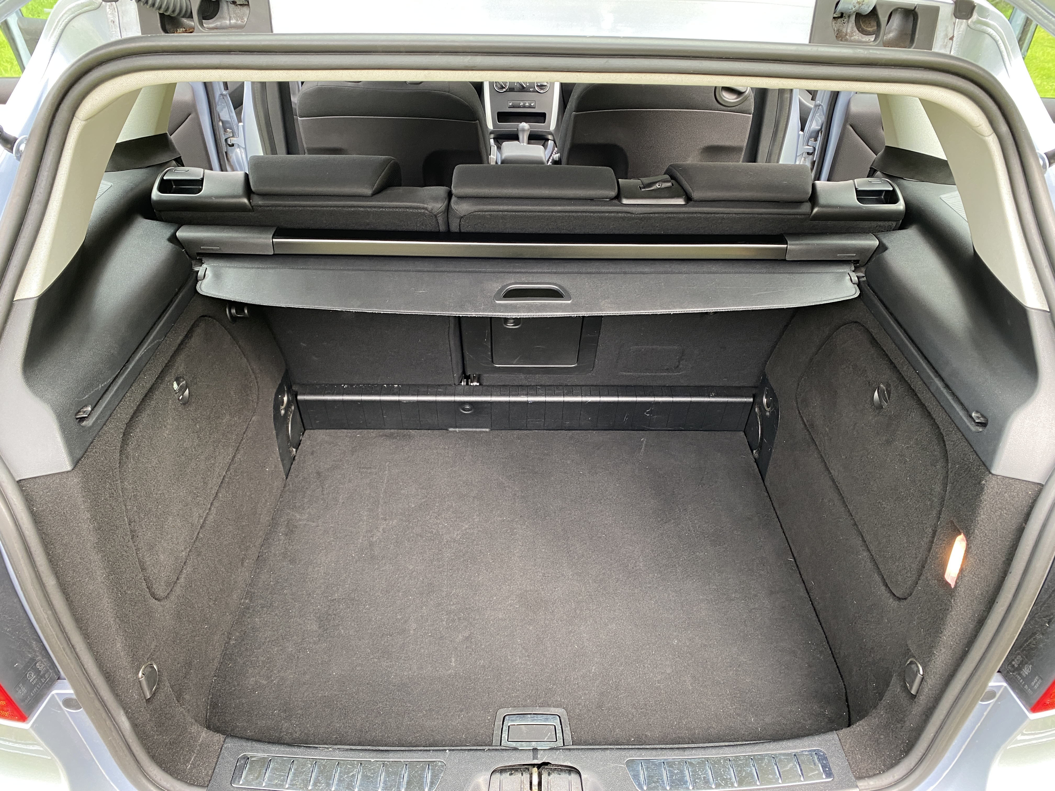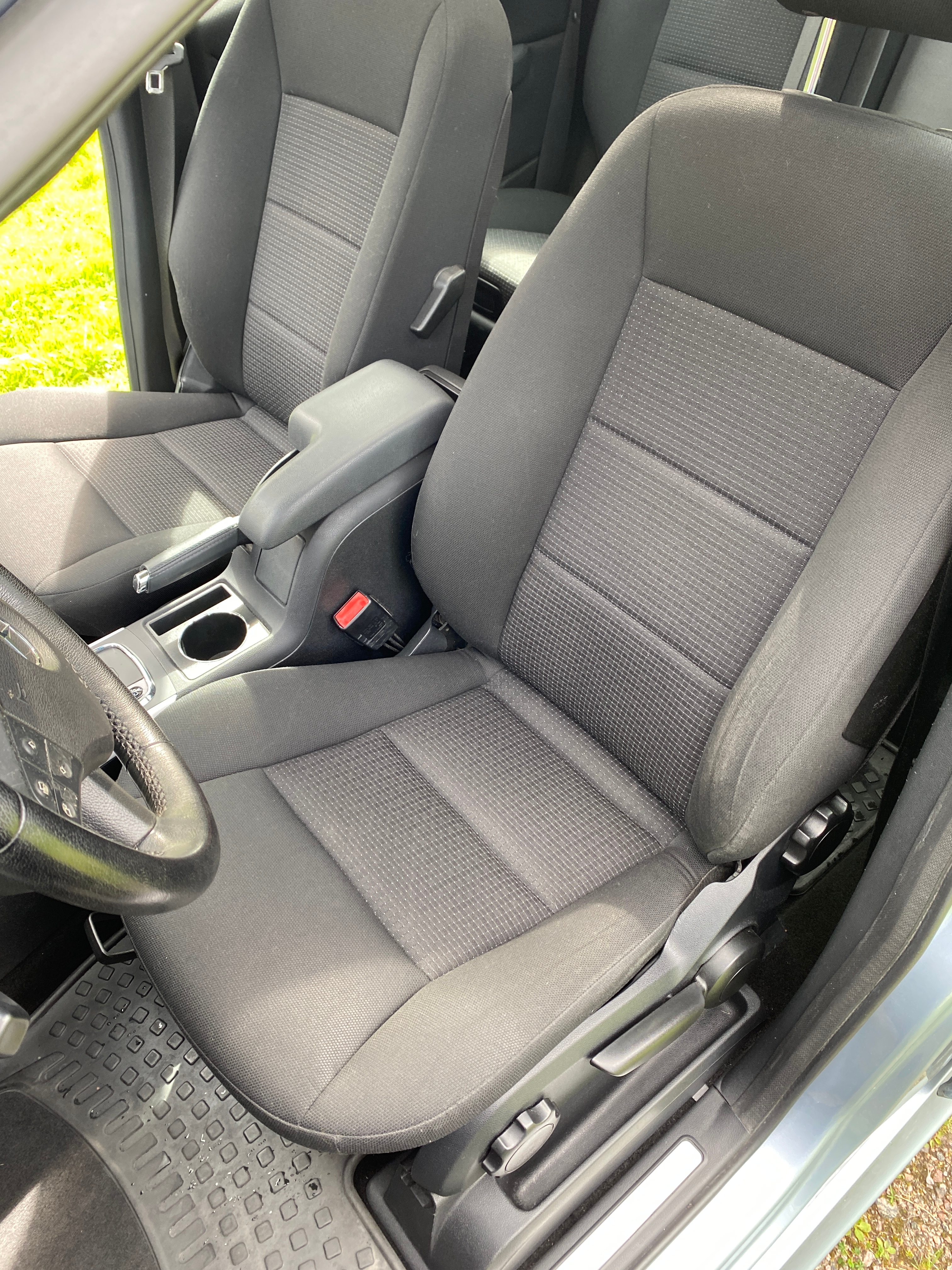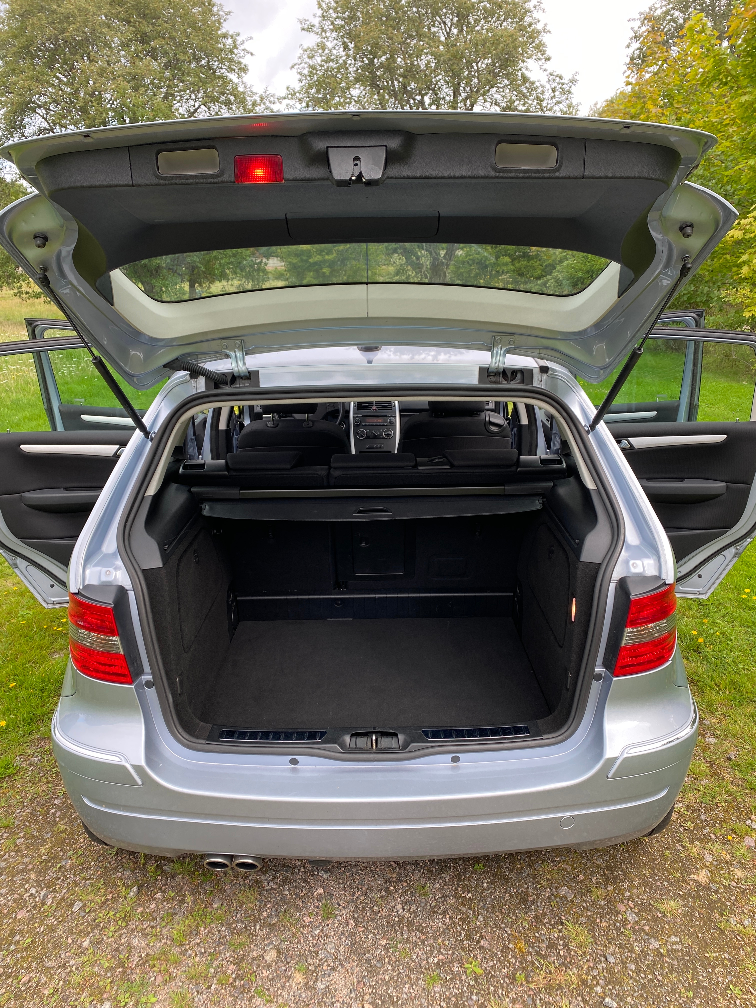 Light blue metallic with black fabric interior. Equipped with cruise control, multifunction steering wheel, panoramic roof, AC, stereo, sport mode, electric mirrors and electric windows, split rear seat, rear privacy curtain, heated seats, rain sensor, removable towbar, built-in child seats and more.