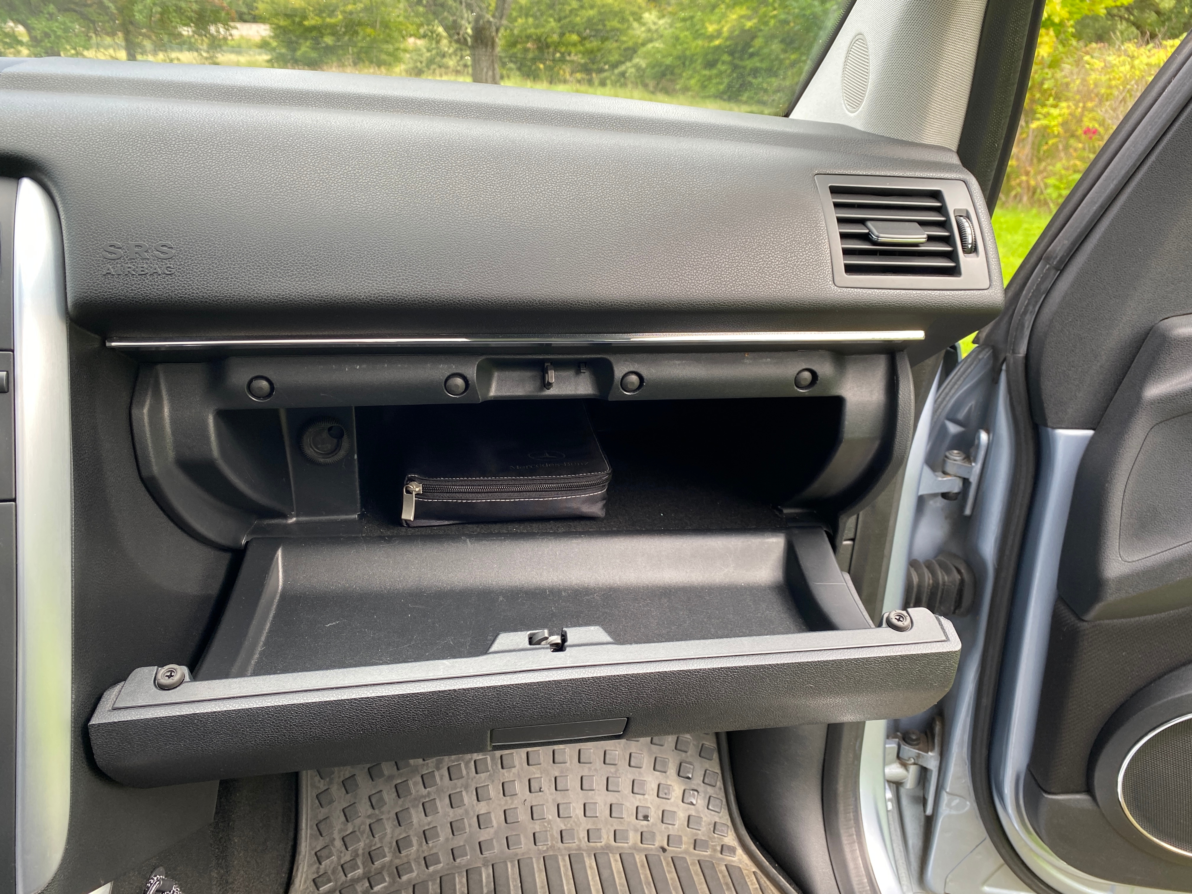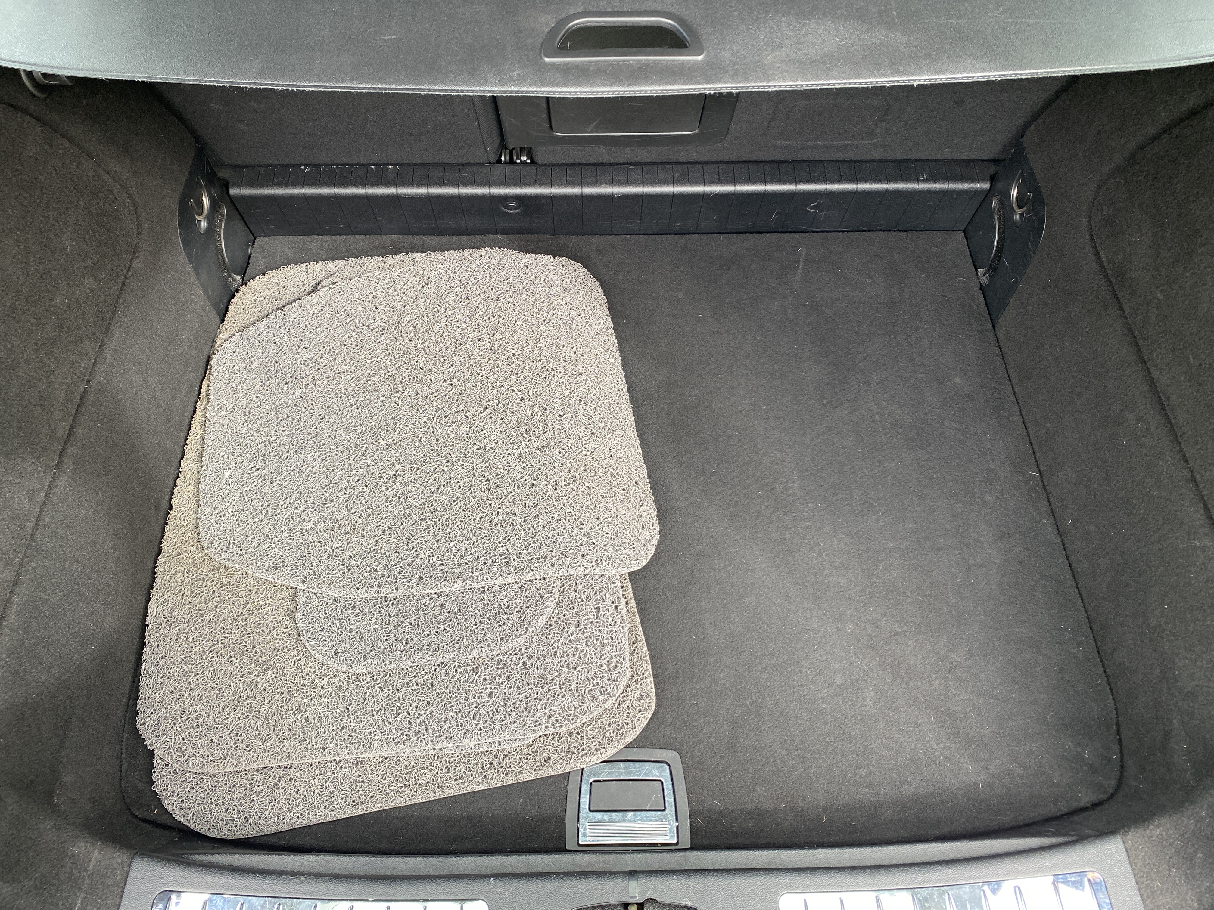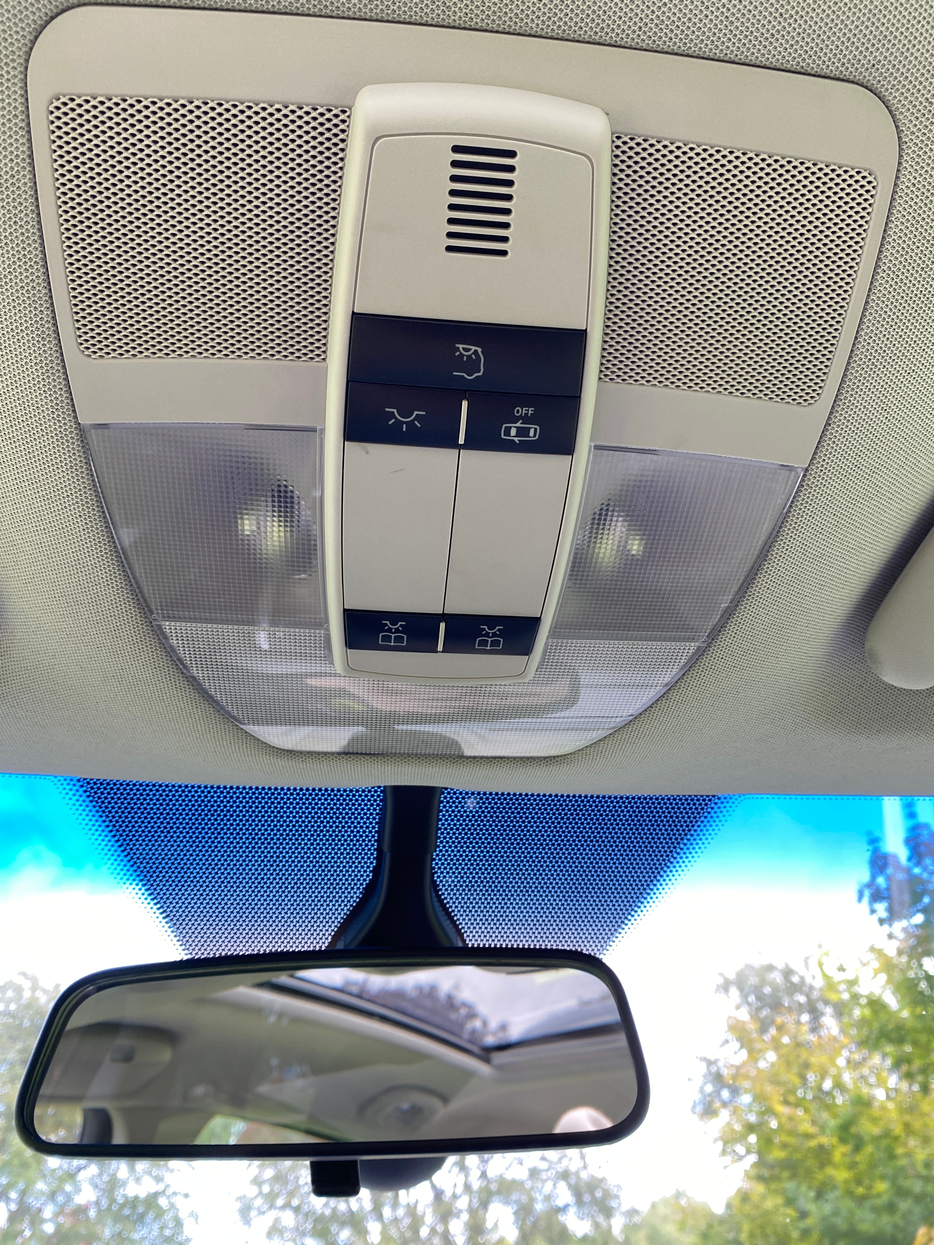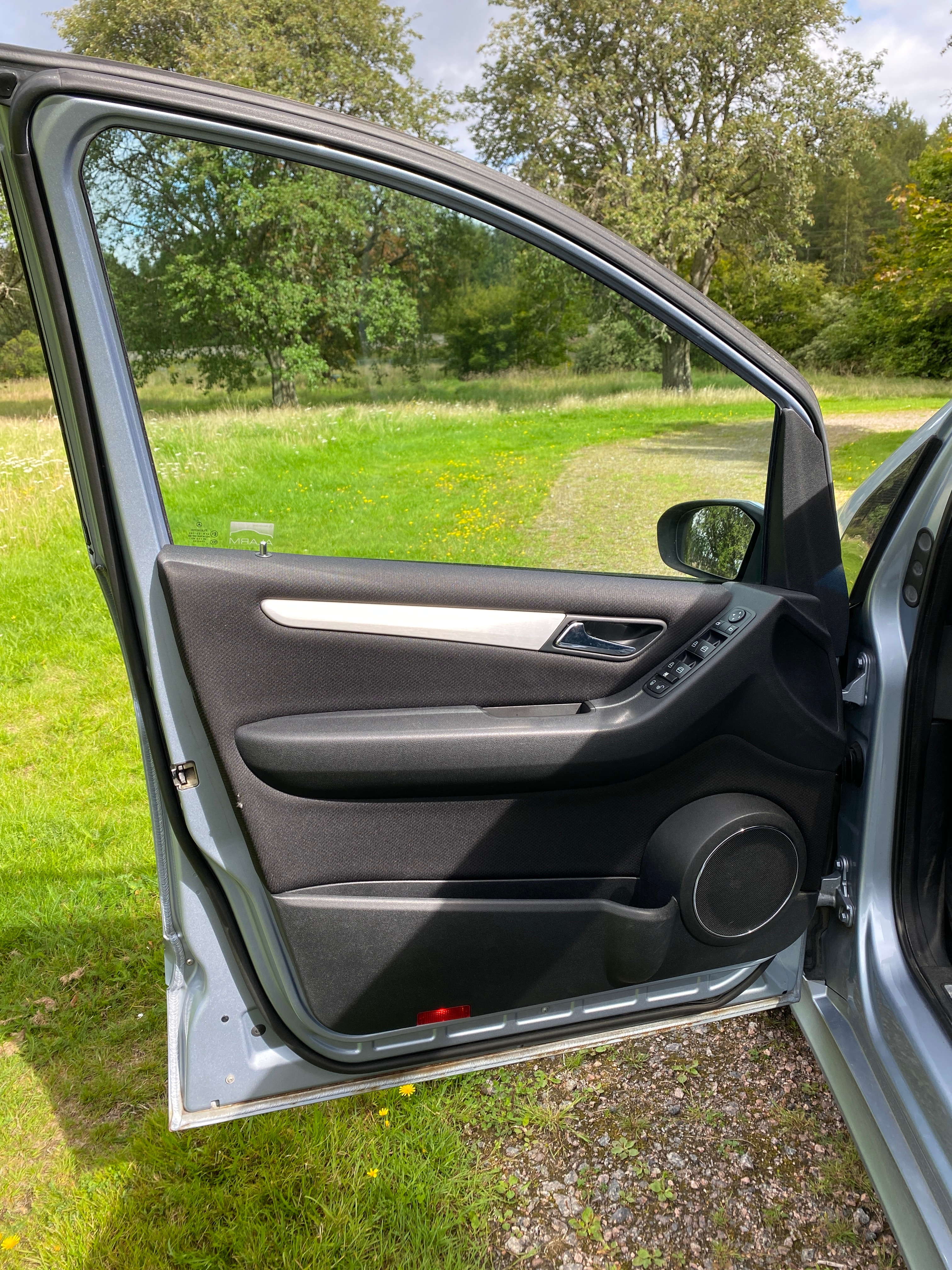 Light blue metallic with black fabric interior. Equipped with cruise control, multifunction steering wheel, panoramic roof, AC, stereo, sport mode, electric mirrors and electric windows, split rear seat, rear privacy curtain, heated seats, rain sensor, removable towbar, built-in child seats and more.