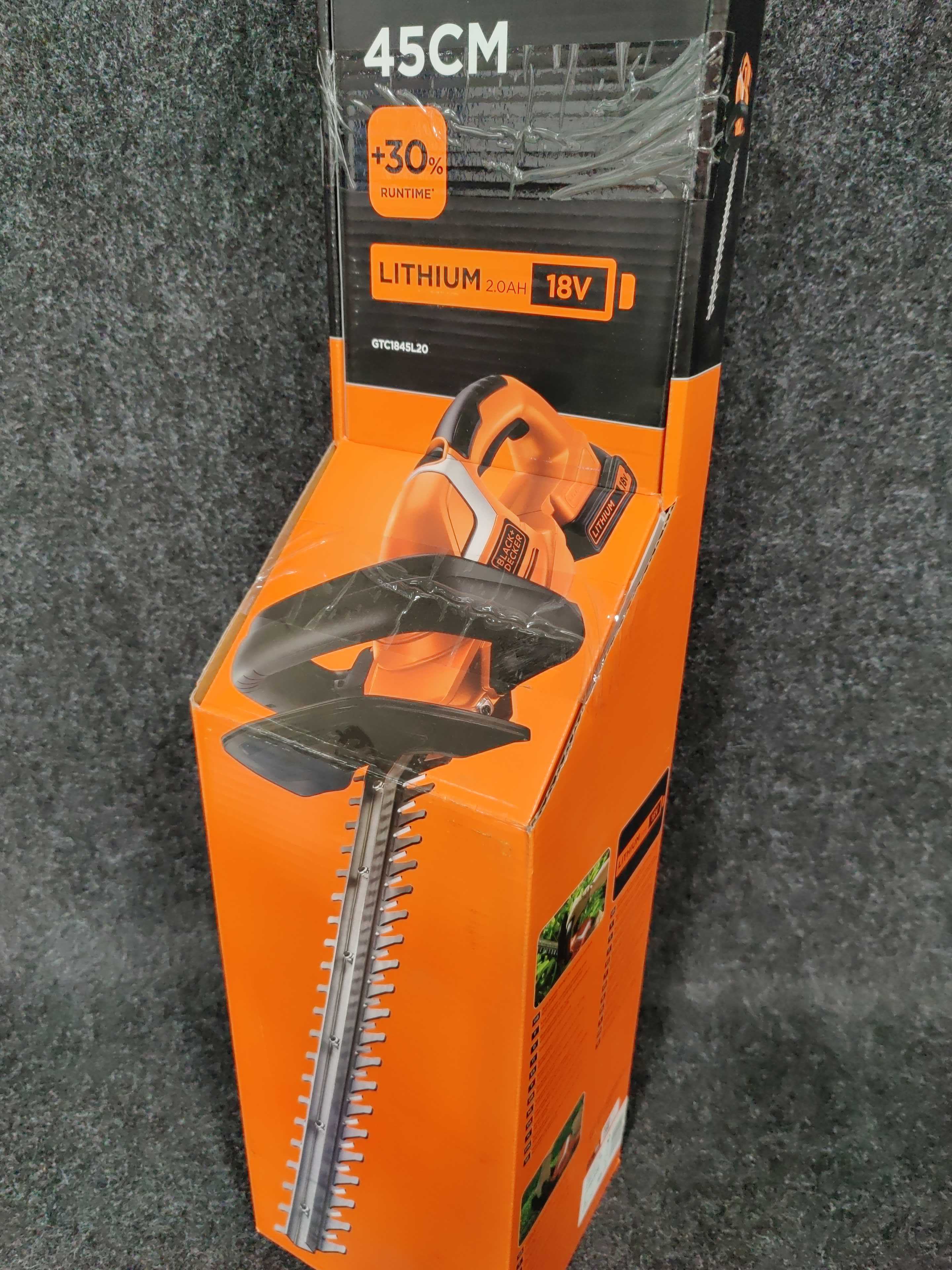 The Black & Decker GTC1845L20-QW is an 18V hedge trimmer with a blade length of 45 cm and tooth spacing of 18 mm. The hedge trimmer is designed to be comfortable and safe to use. The handle is made to be used with several different grips, and provides optimal comfort and control.