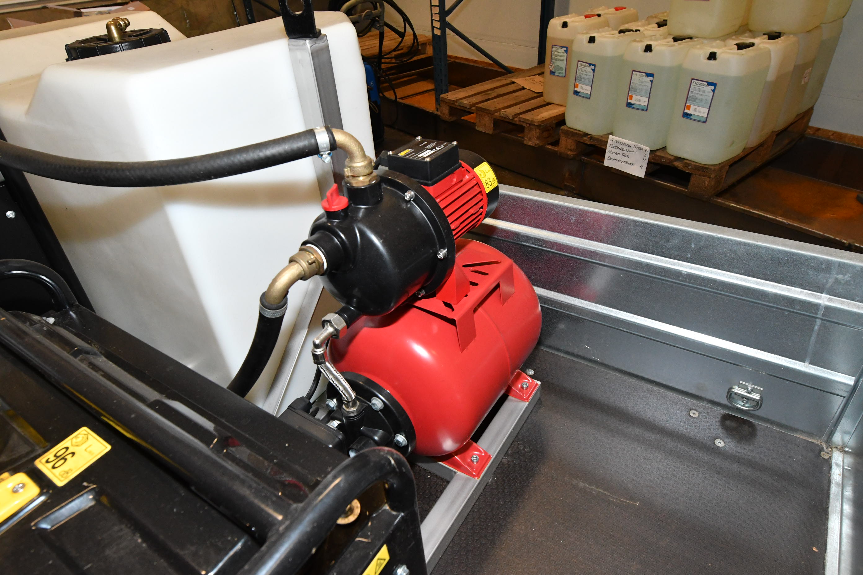 Power plant, hydrophore pump, hot water washer (diesel heater), fluid container, hose reel