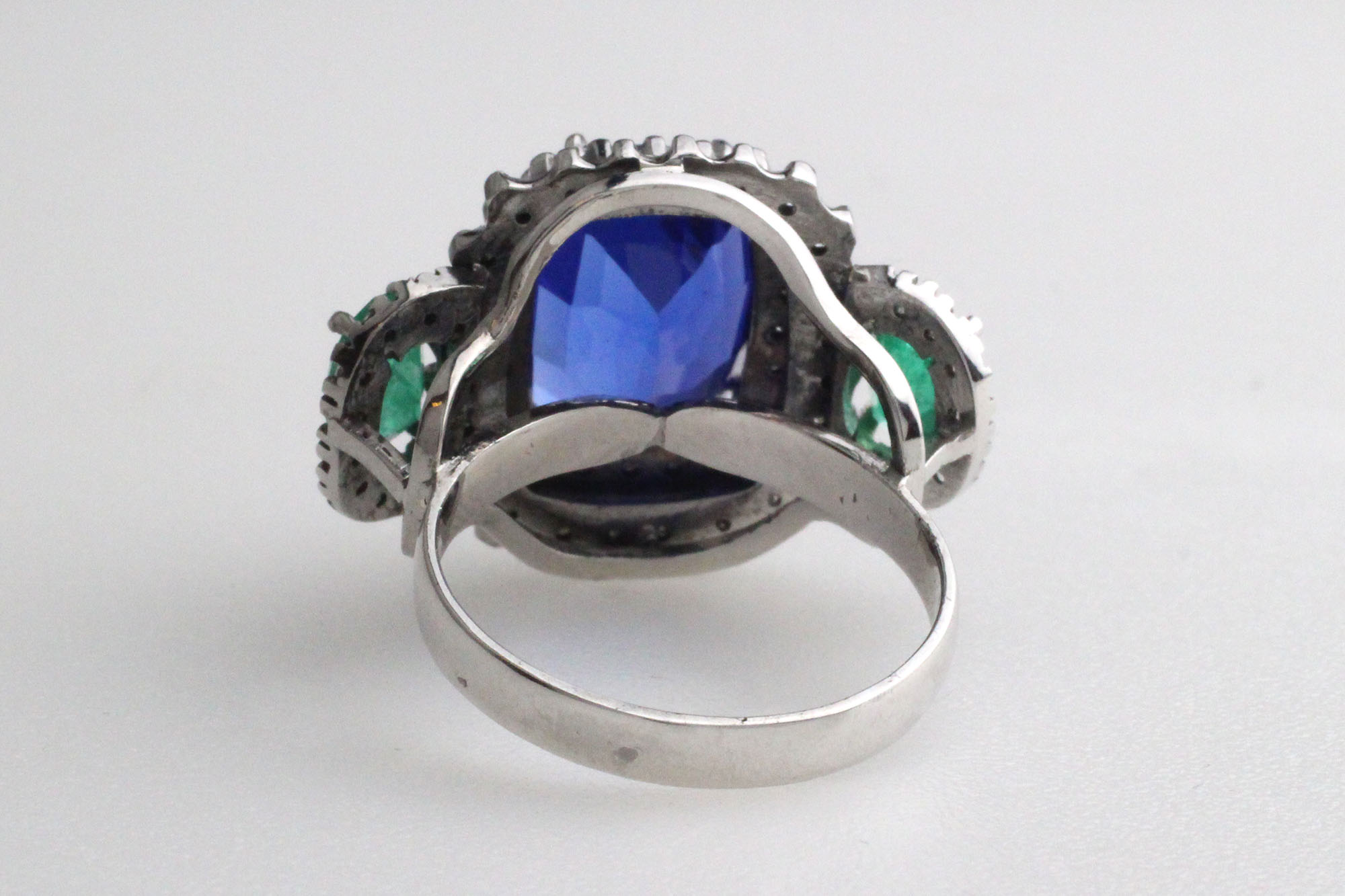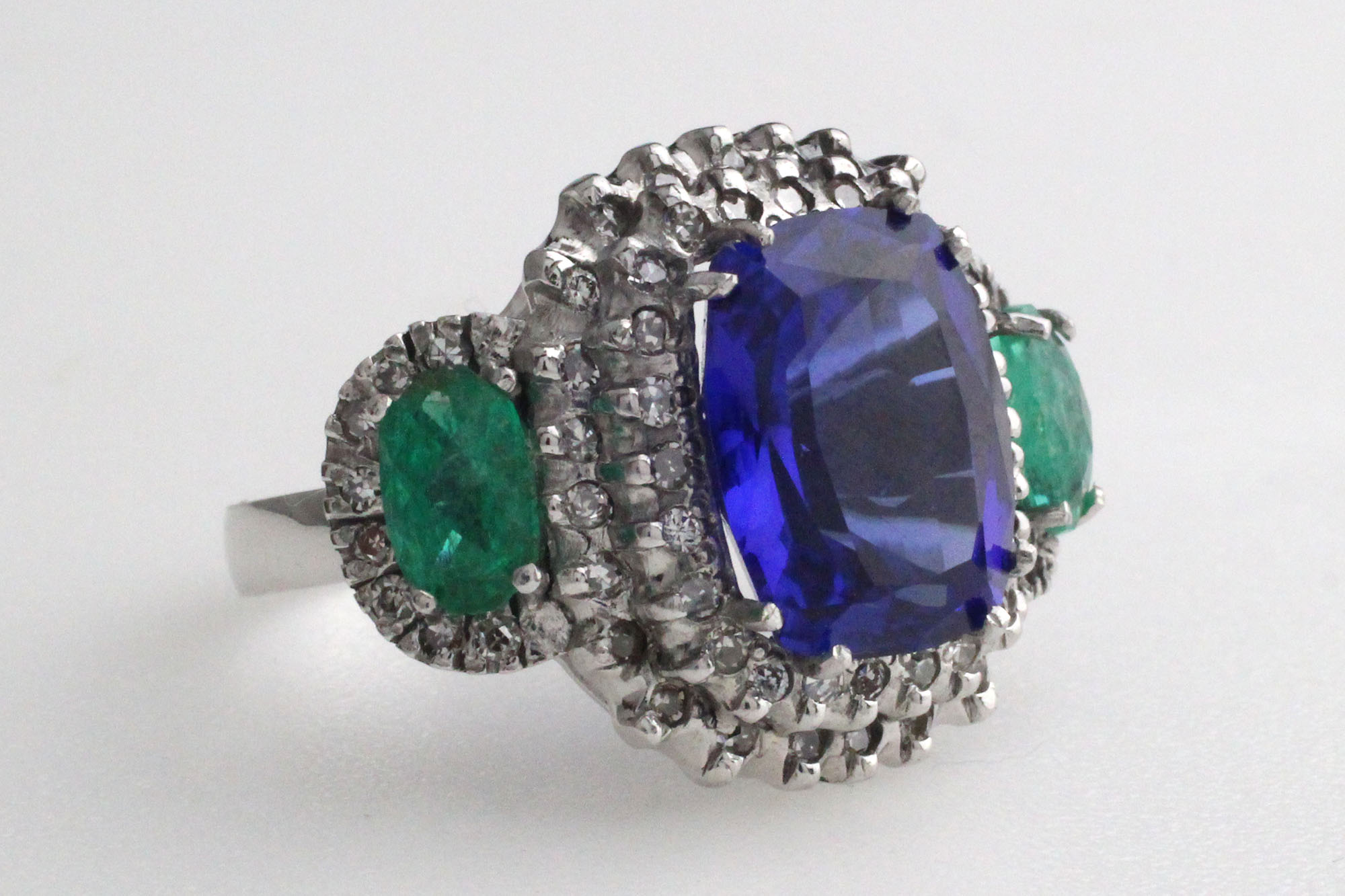 Ring 14K white gold with facet-cut Tanzanite approx. 7.70 ct, facet-cut Emeralds approx. 1.45 ctw and 64 brilliant-cut Diamonds approx. 0.78 ctw. Size 18 mm. Gross weight approx. 9.95 grams. New condition.