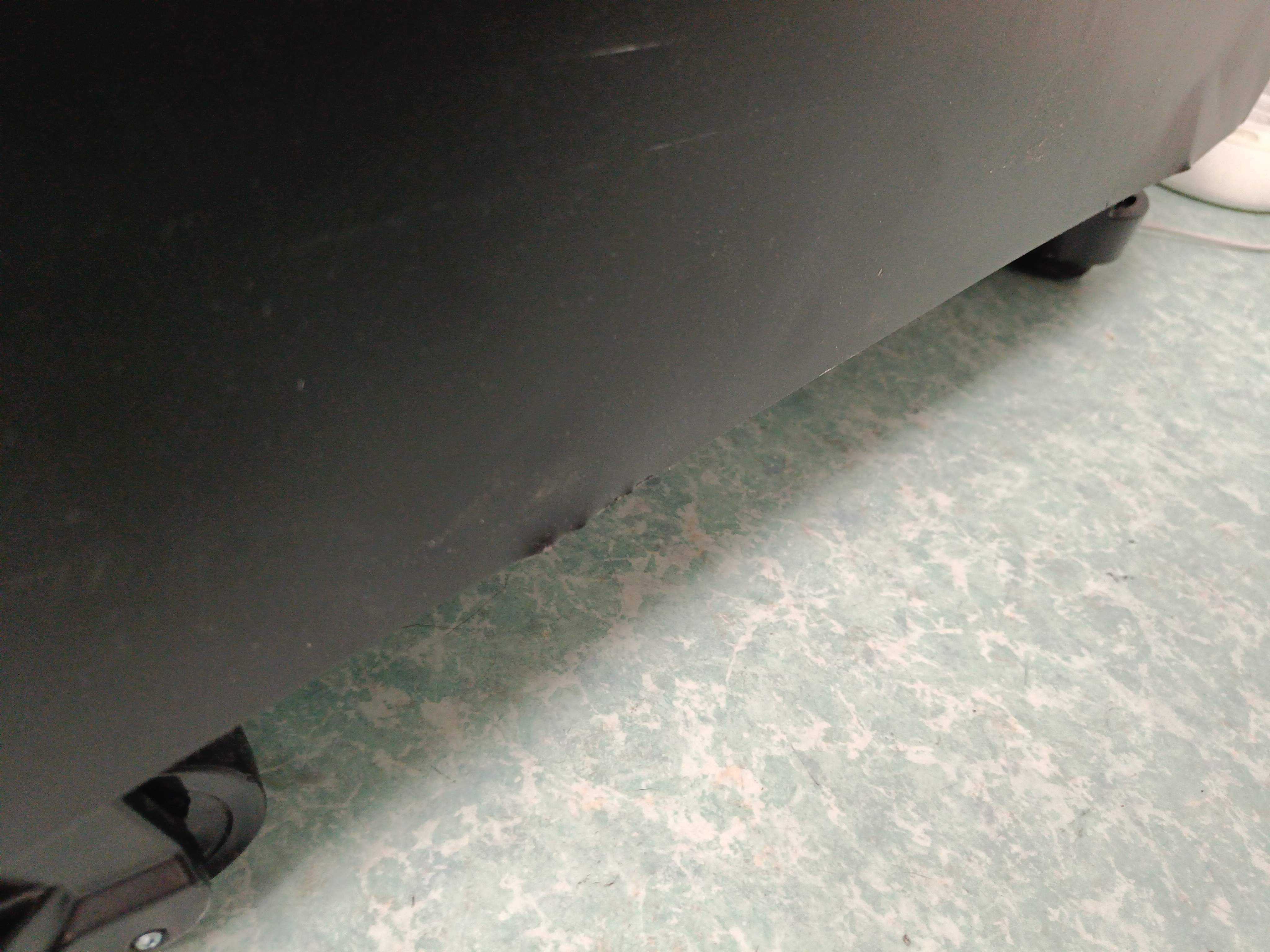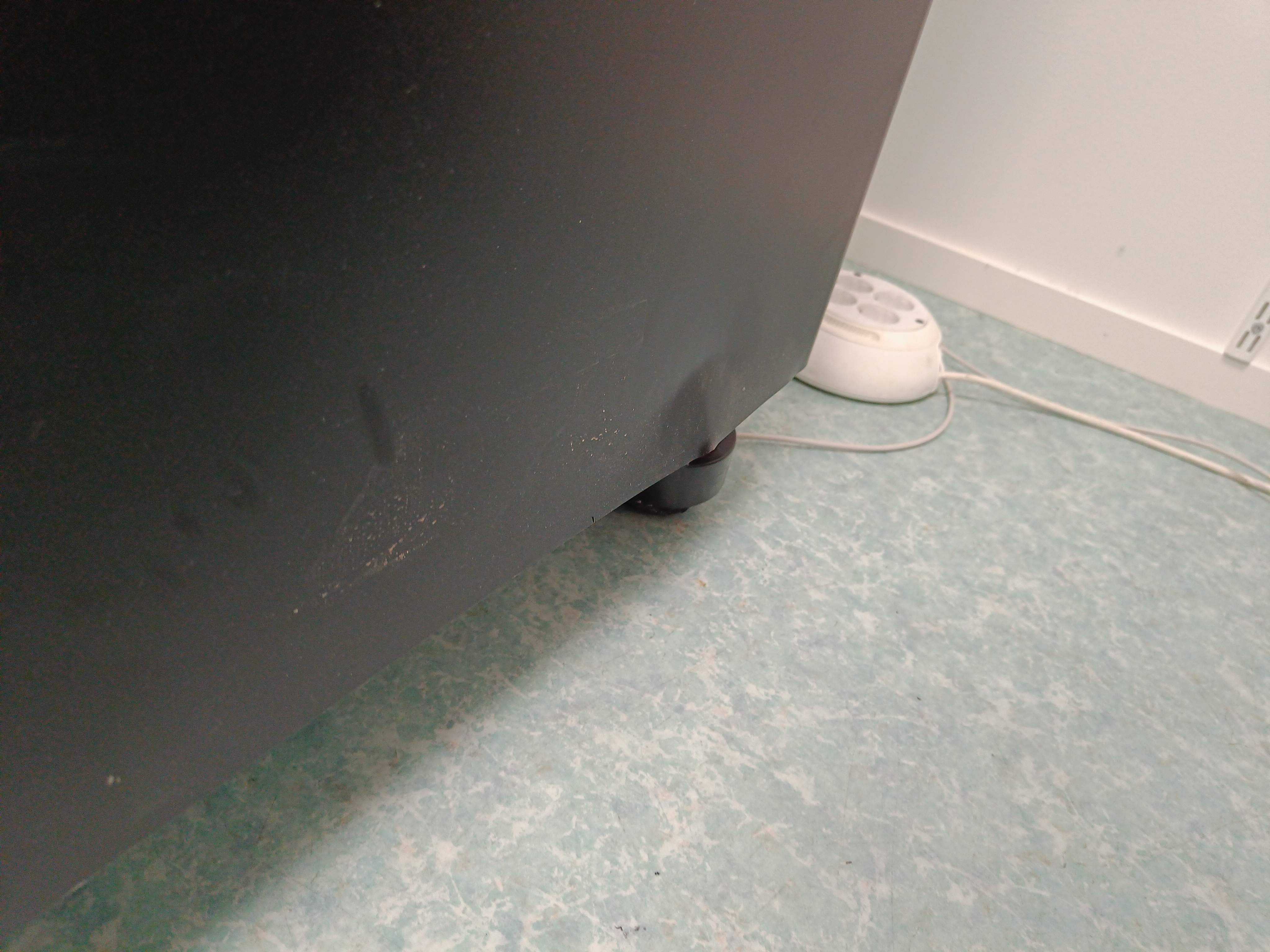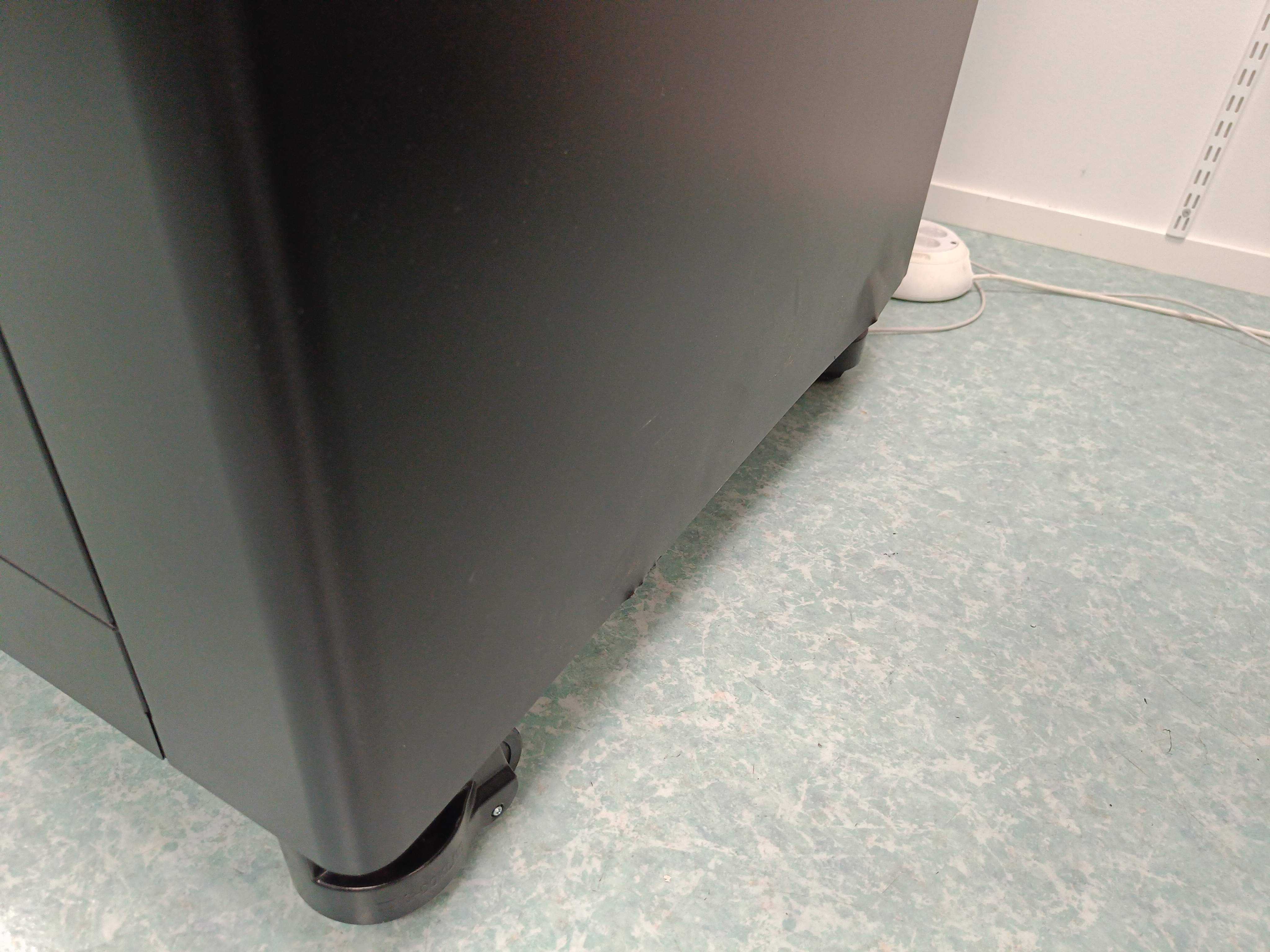 The printer stands at ground level and is moved on its wheels, weight approx. 170kg.