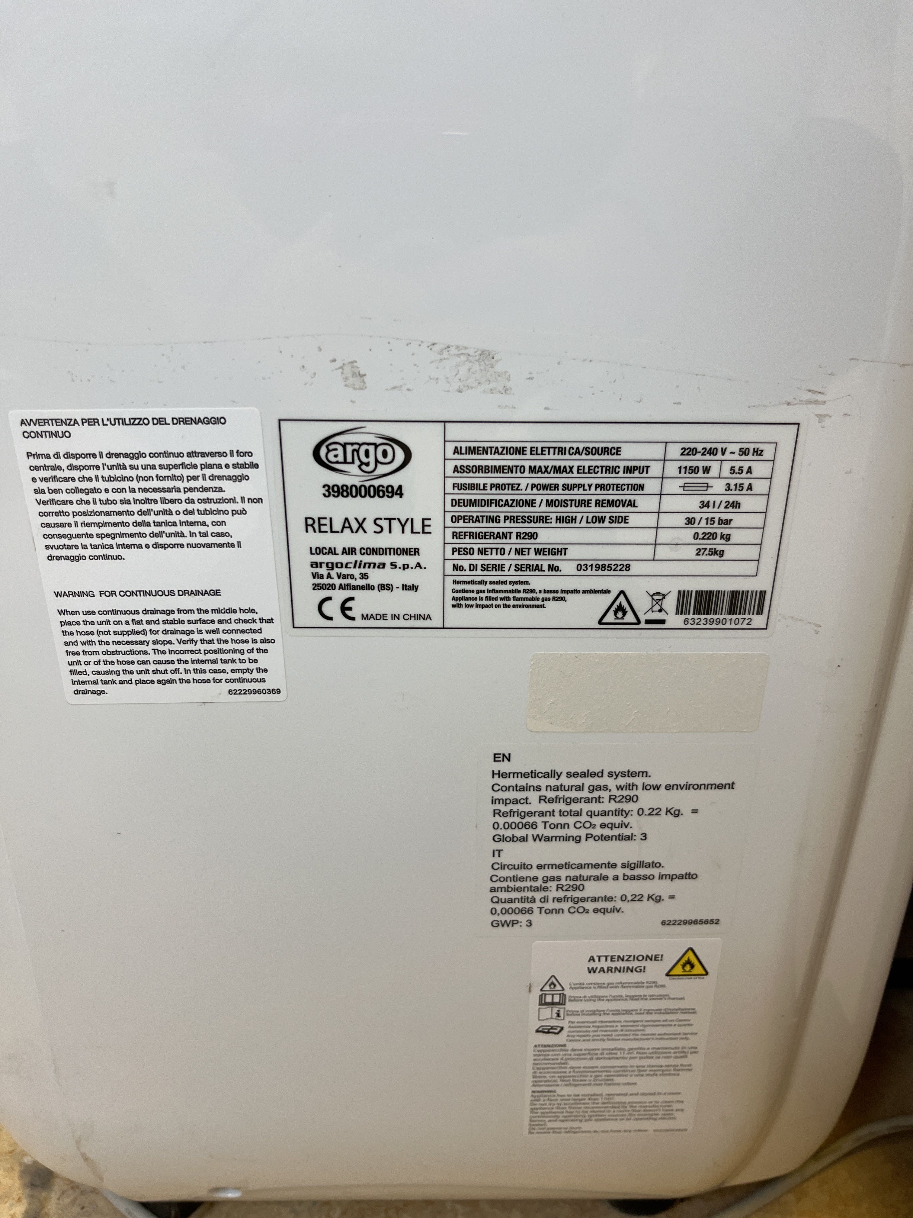 Portable AC with exhaust air hose - Argo Relax Style