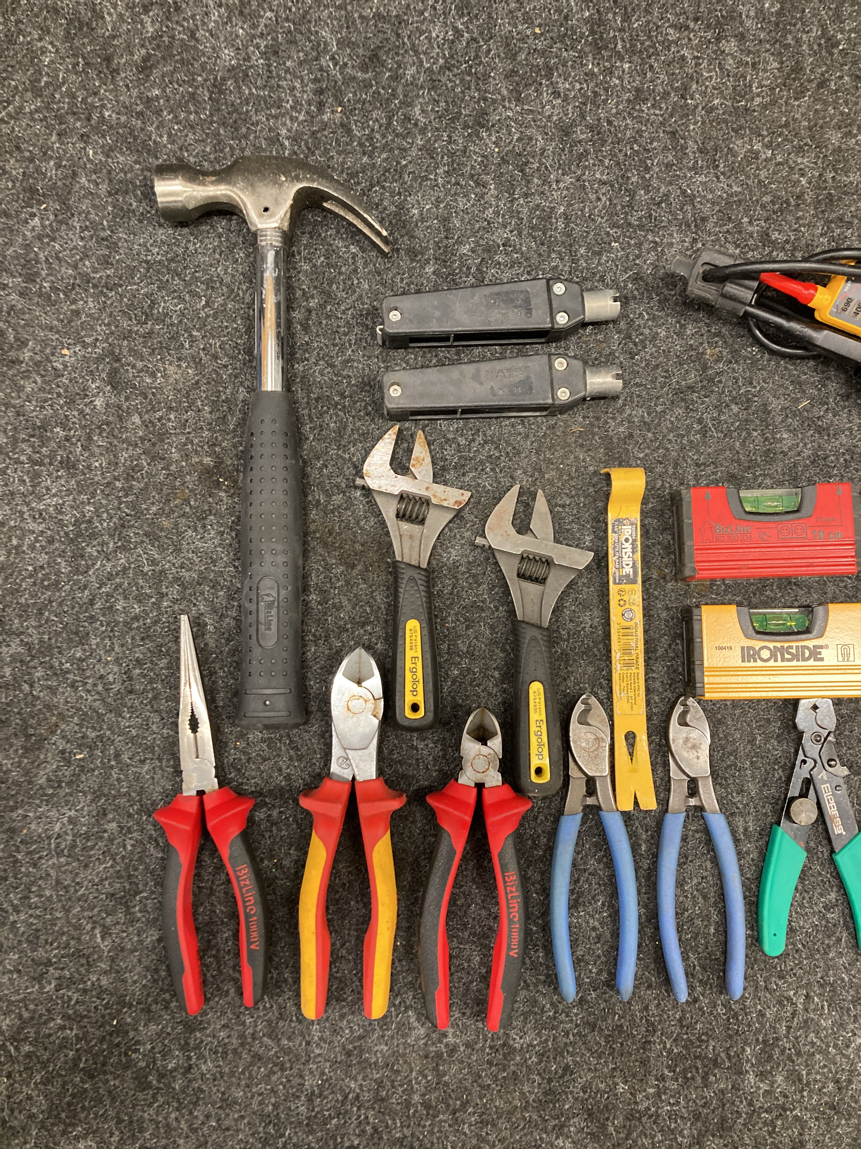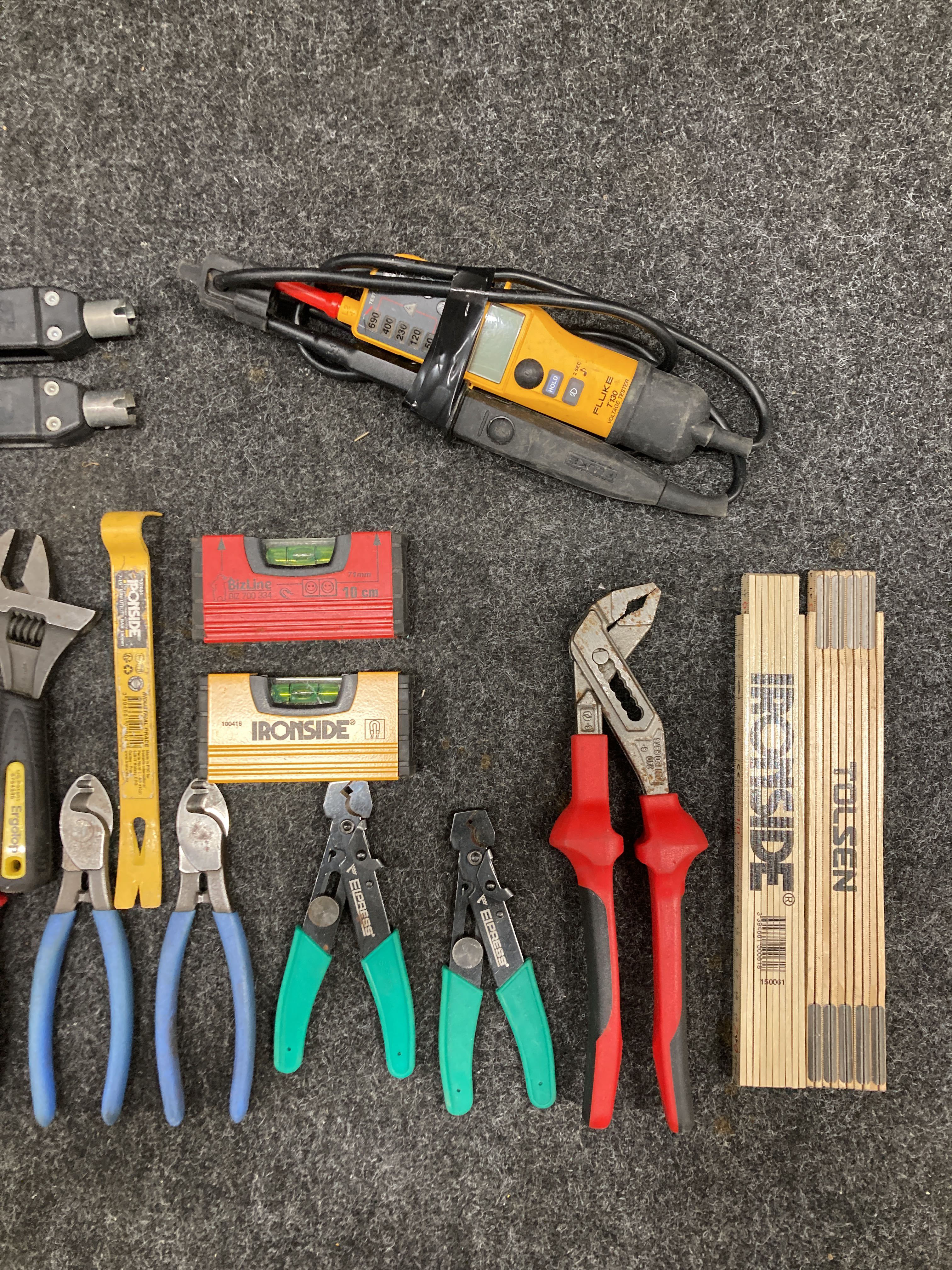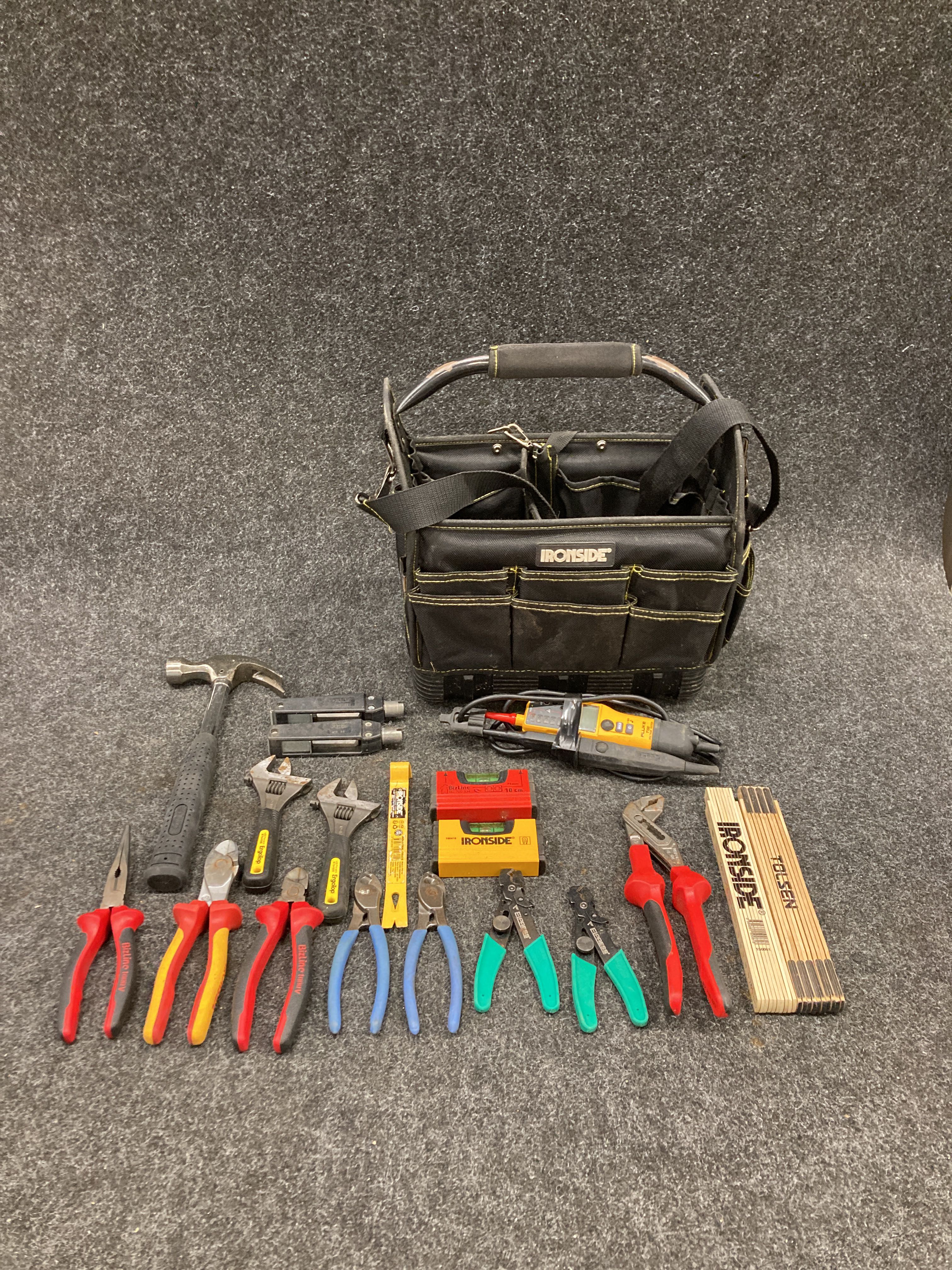 Hand tools and bag in varied condition and voltage tester Fluke T130