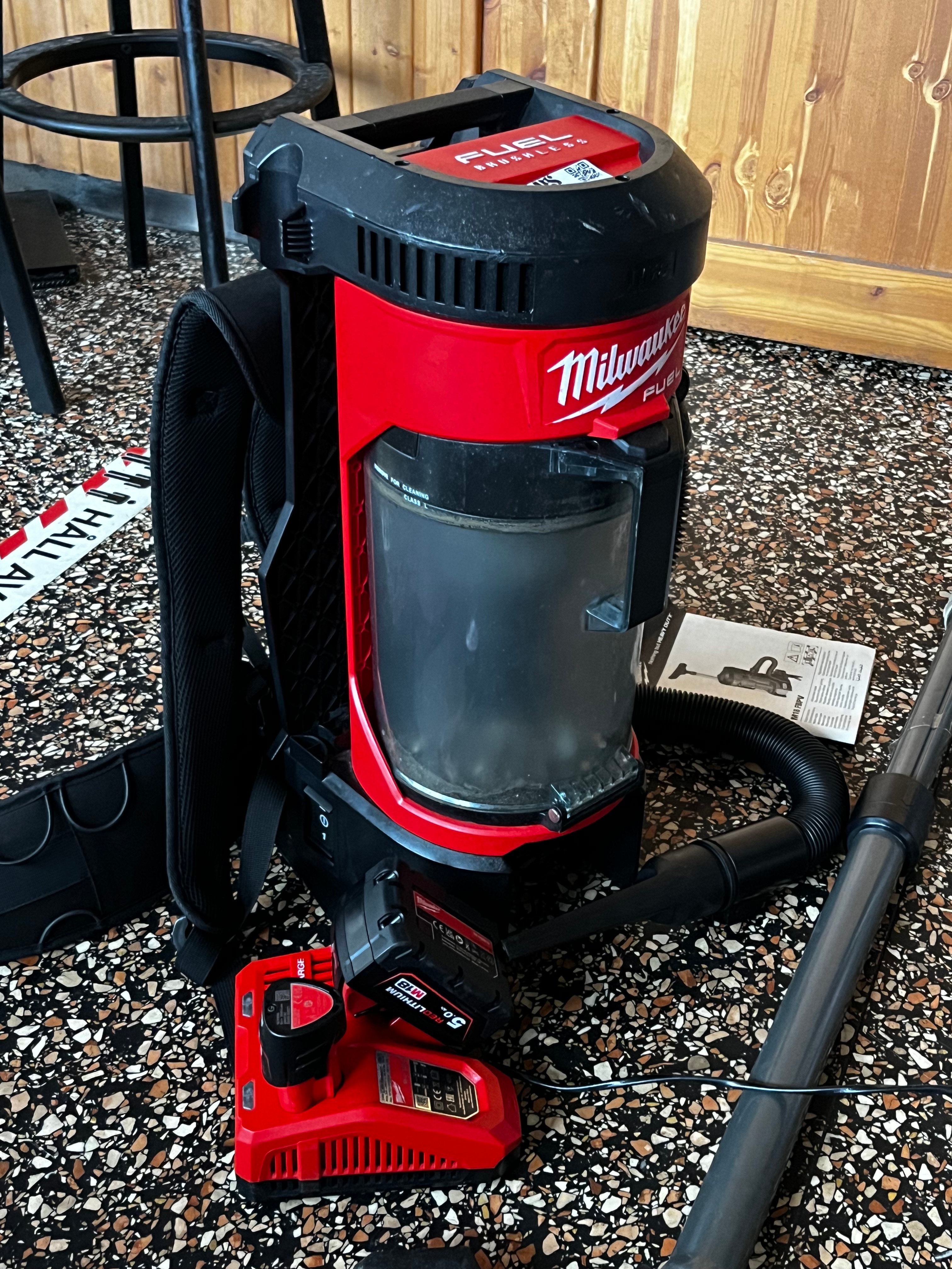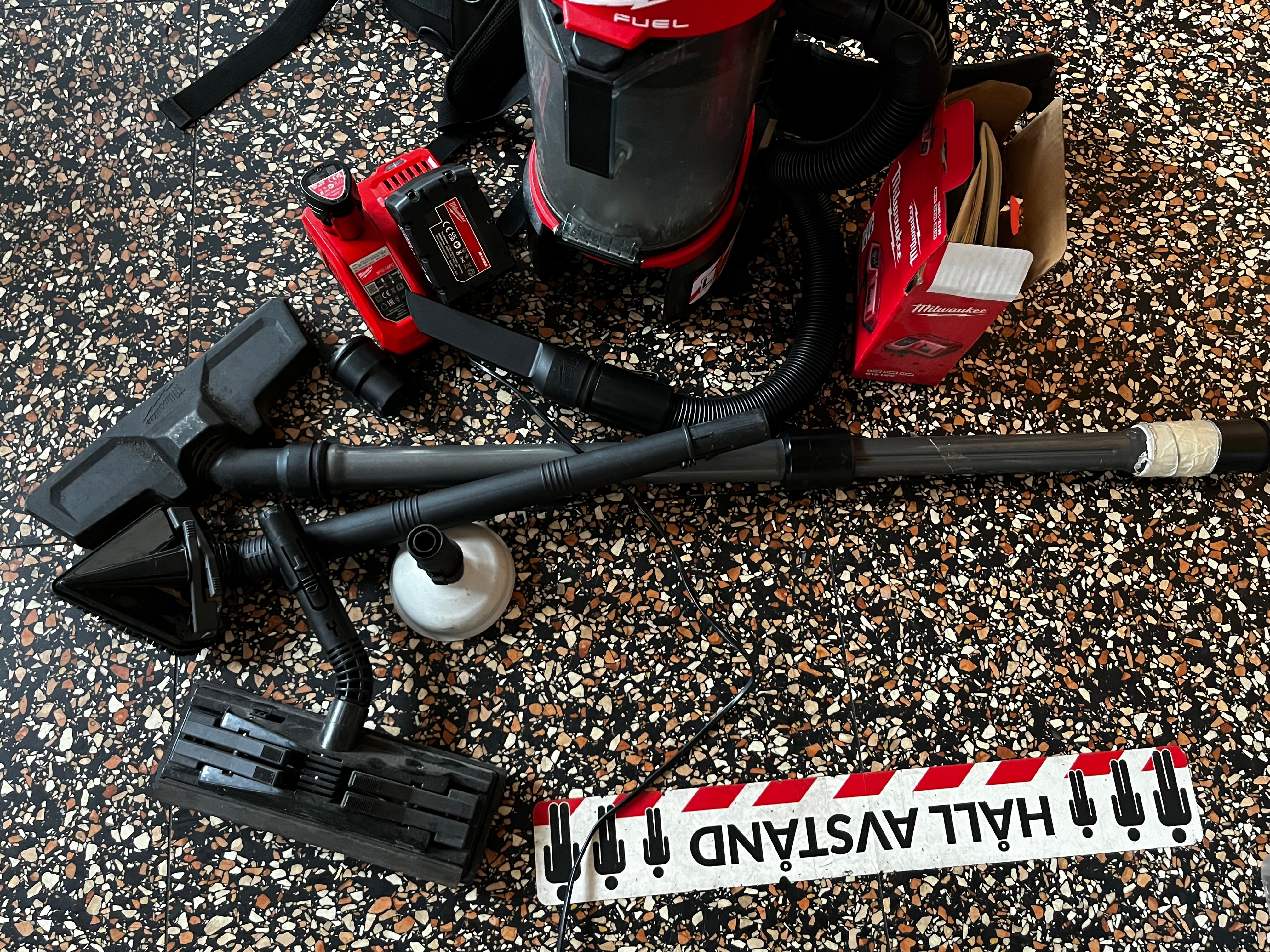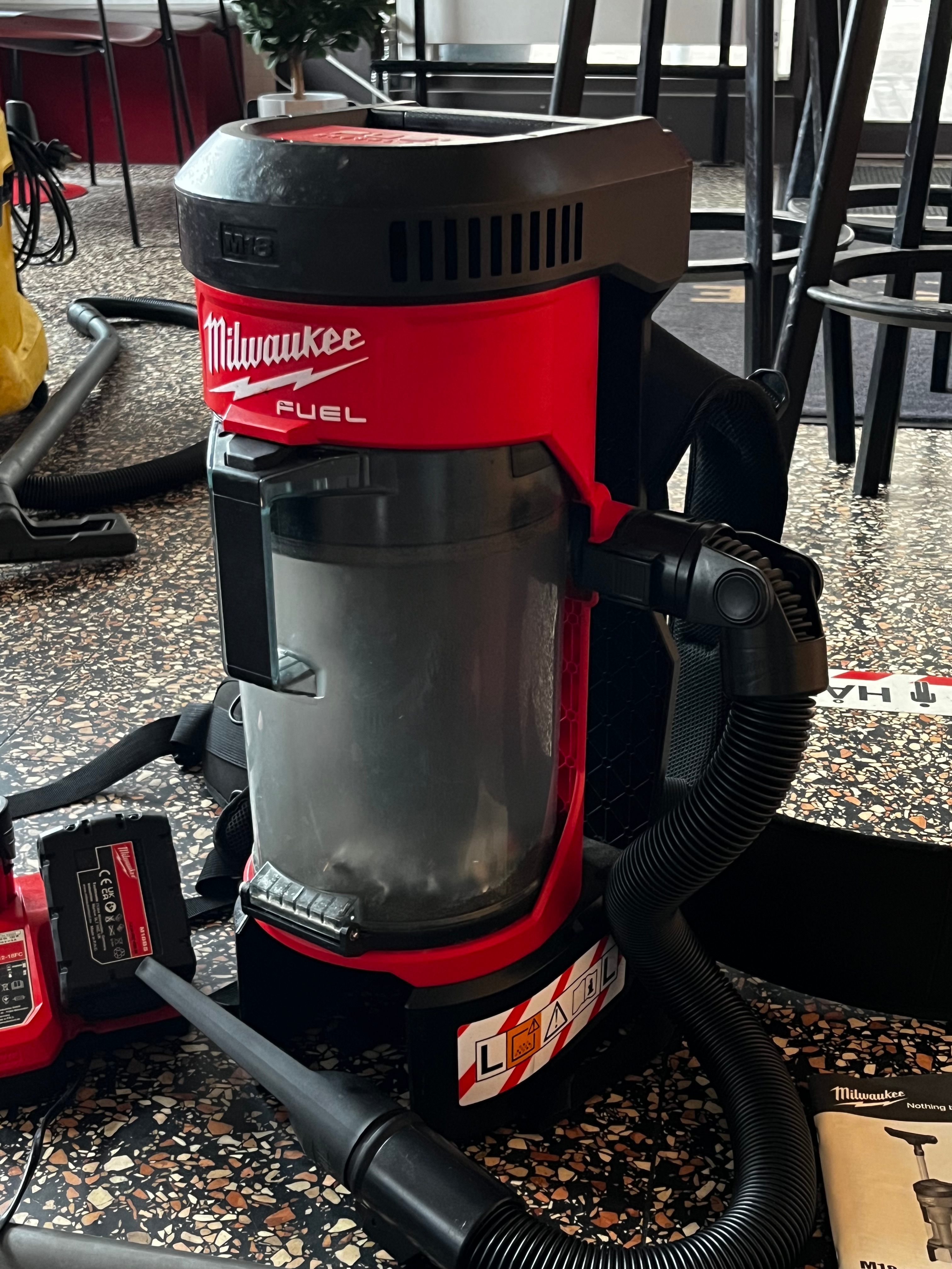 Backpack vacuum cleaner, Milwaukee M18 FBPV with battery and accessories.