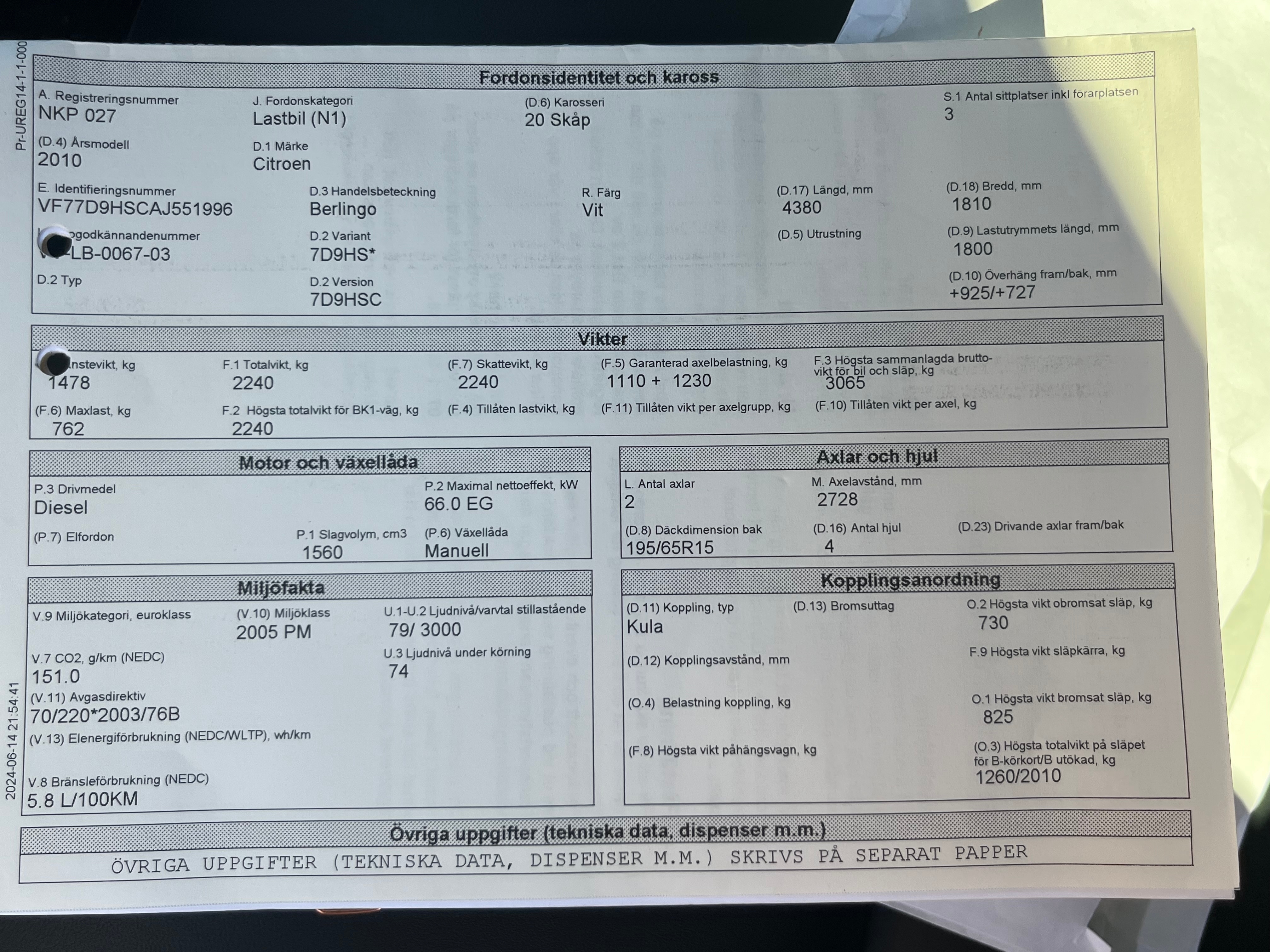 Max trailer weight, B-driving licence (kg) 1260