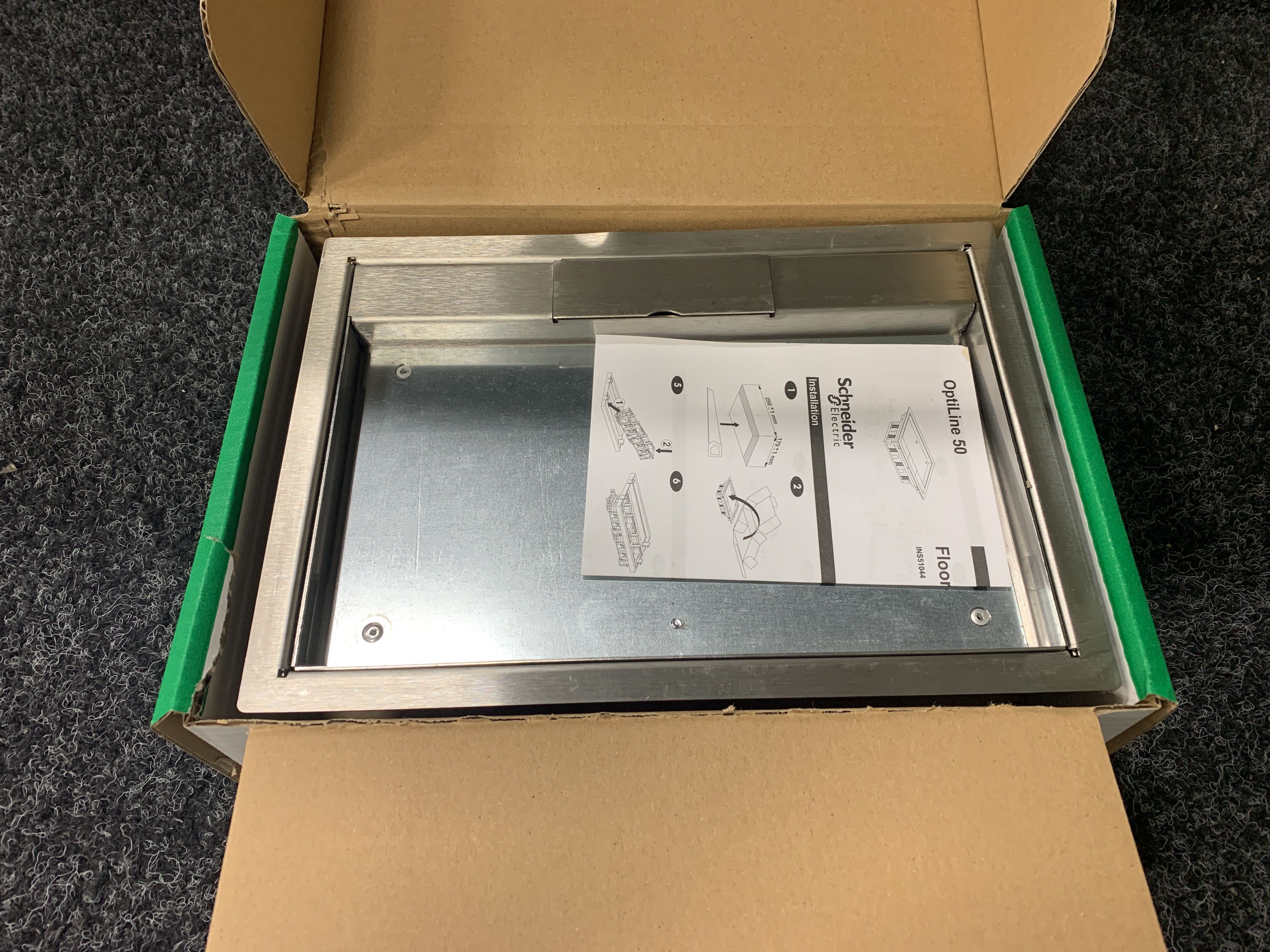 Complete floor box, including frame, quick fix and two cable outlets. The outlet capacity is eight 50x50 mm OptiLine outlet units.
