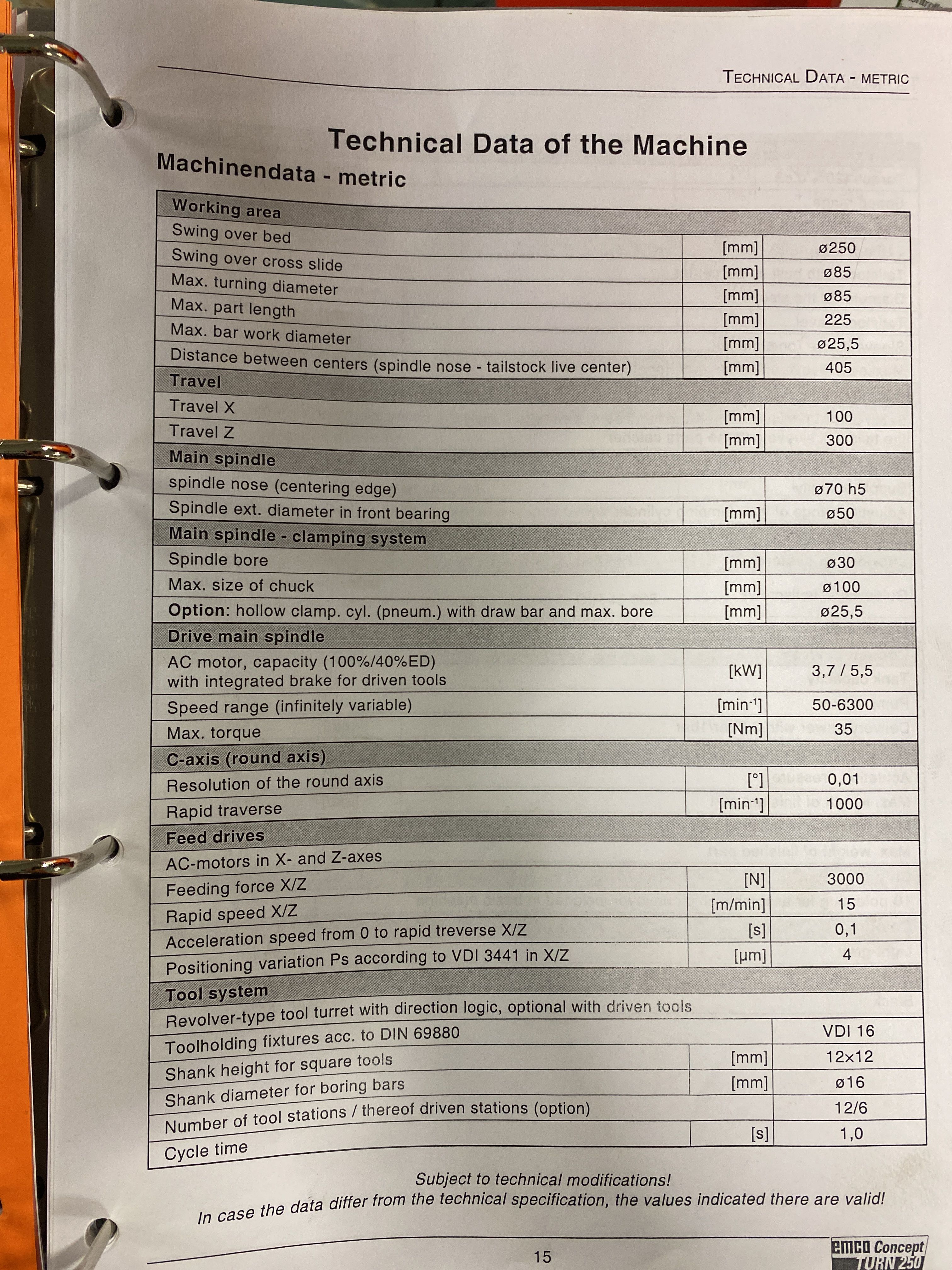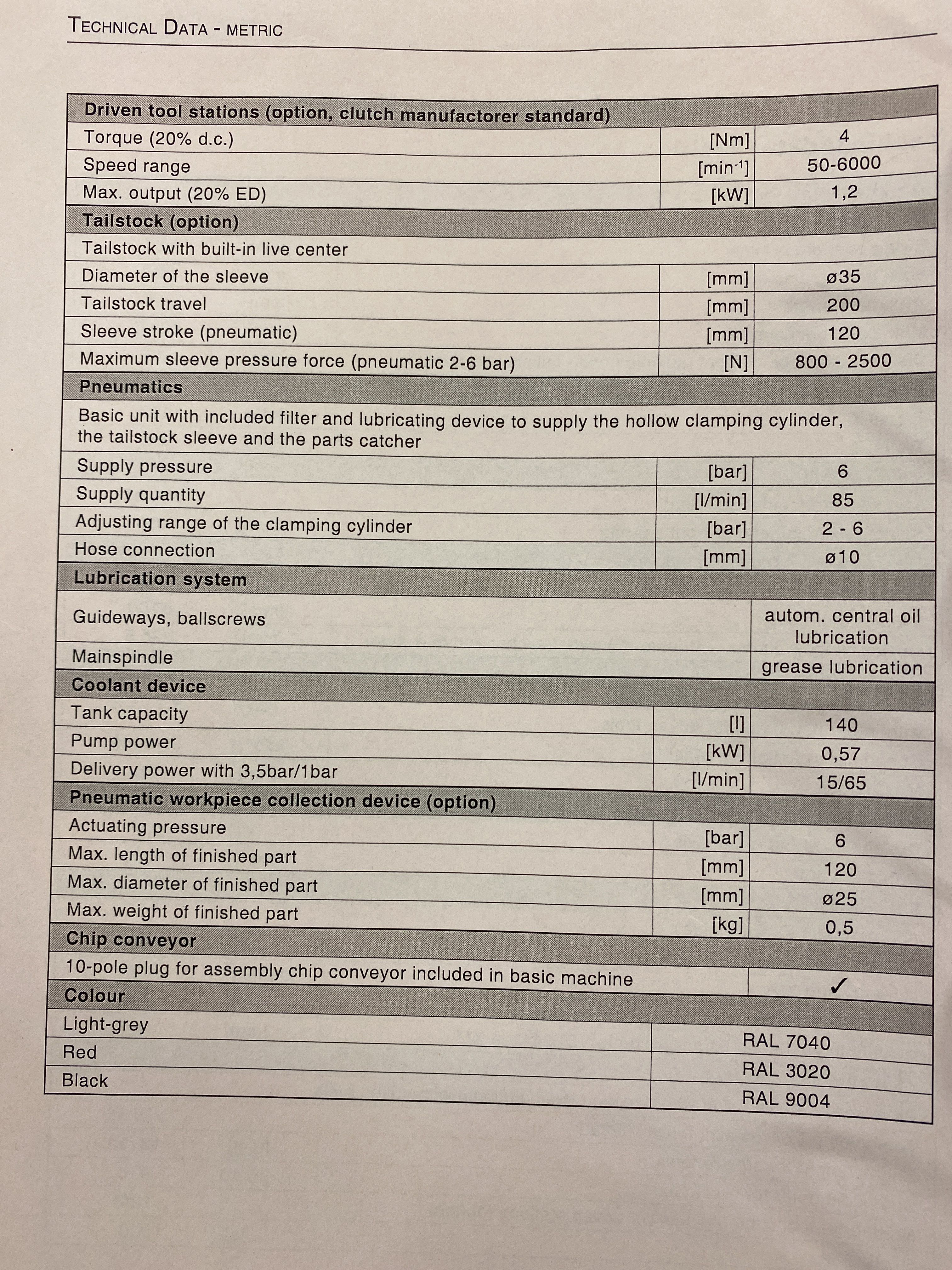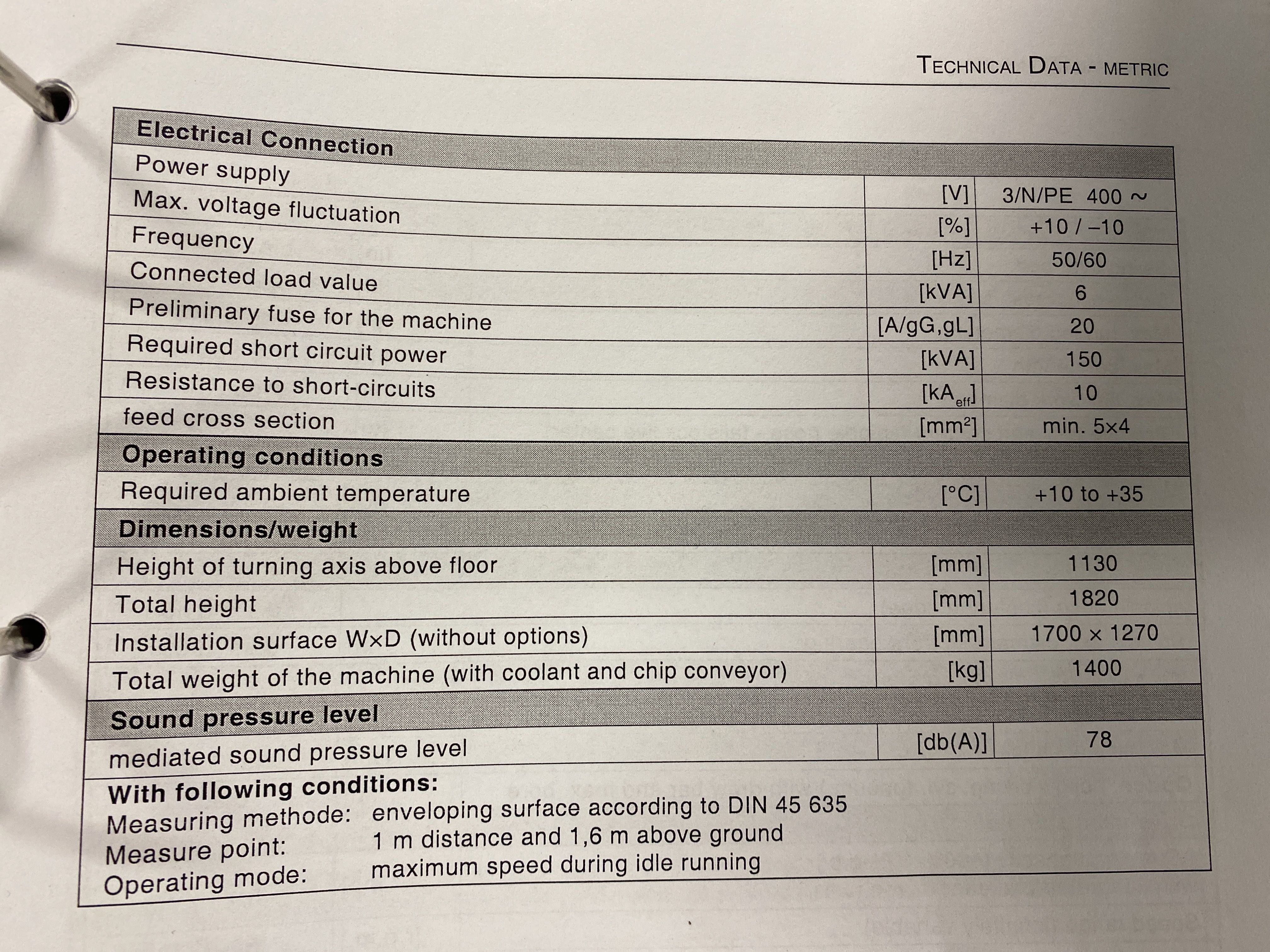 Machine specs according to picture from manual