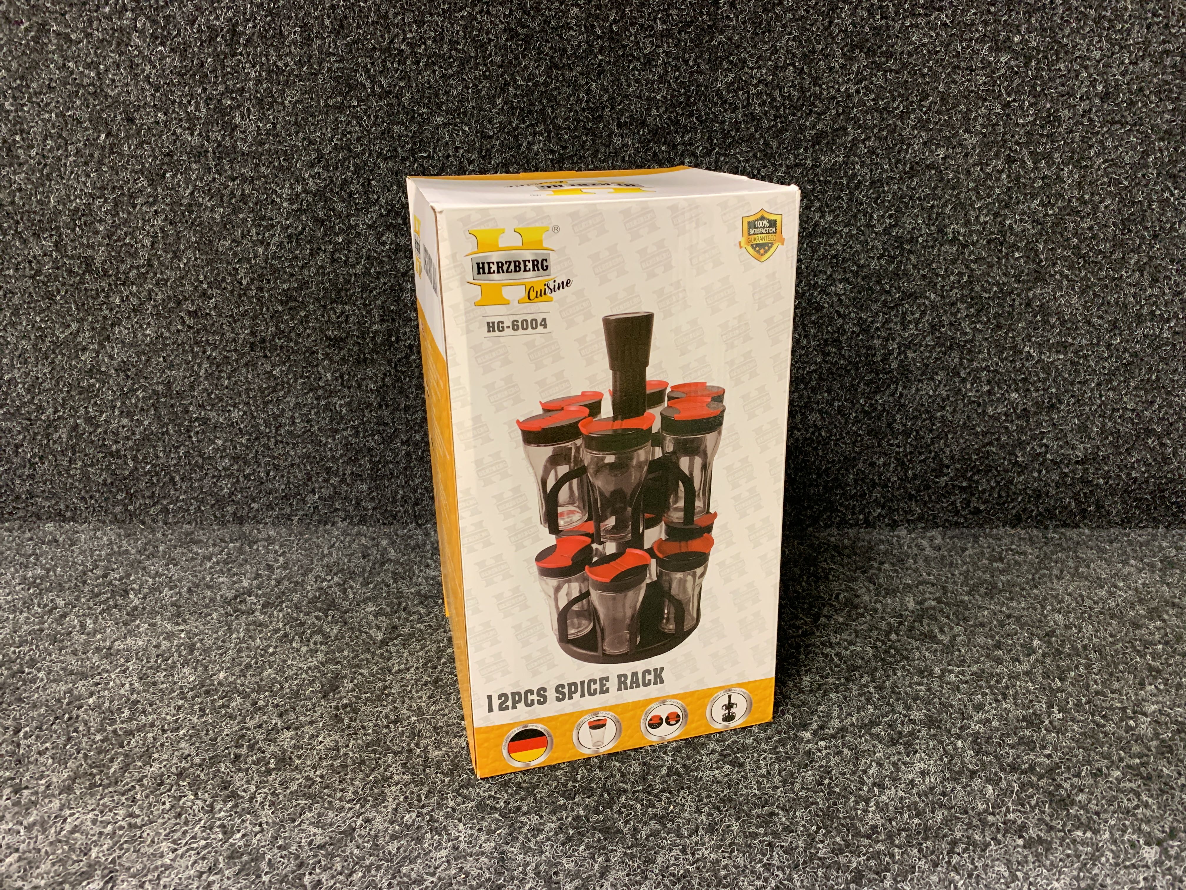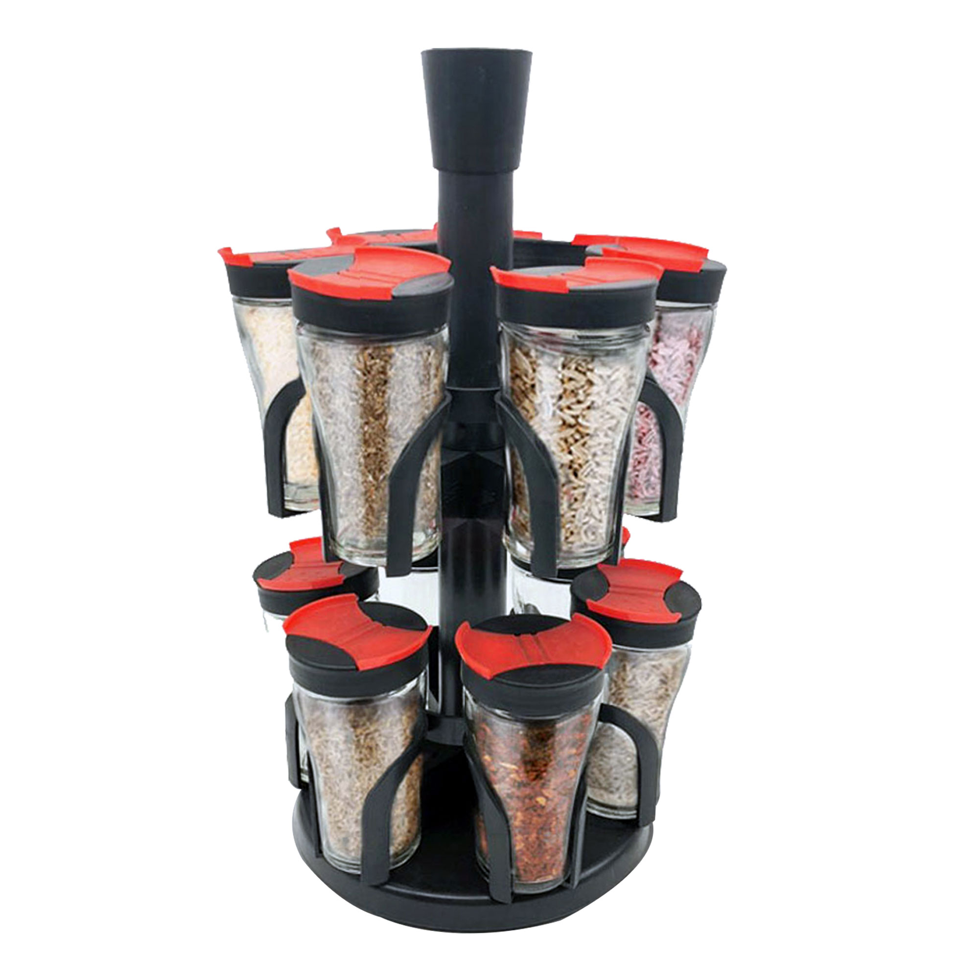 Keep your spice jar close to you while you enjoy cooking your favorite food with the Herzberg spice rack with 12 glass jars. The compact and portable design takes up minimal counter space, while the red and black accent provides a stylish touch that fits any kitchen decor. Your herbs and spices are kept fresh, organized and neat in the double sprinkler lid glass jars for convenience. The tops are easy to open to pour or shake the contents, and the clear glass makes it easy to find the right spice when you need it to create delicious recipes. The jars are the perfect size to reduce the need for constant refills and are easy to clean and dishwasher safe. Made of ABS material, the shelf is durable and resists corrosion. Herzberg's herb and spice rack carousel provides quick and easy access to all your favorite flavors in the kitchen.