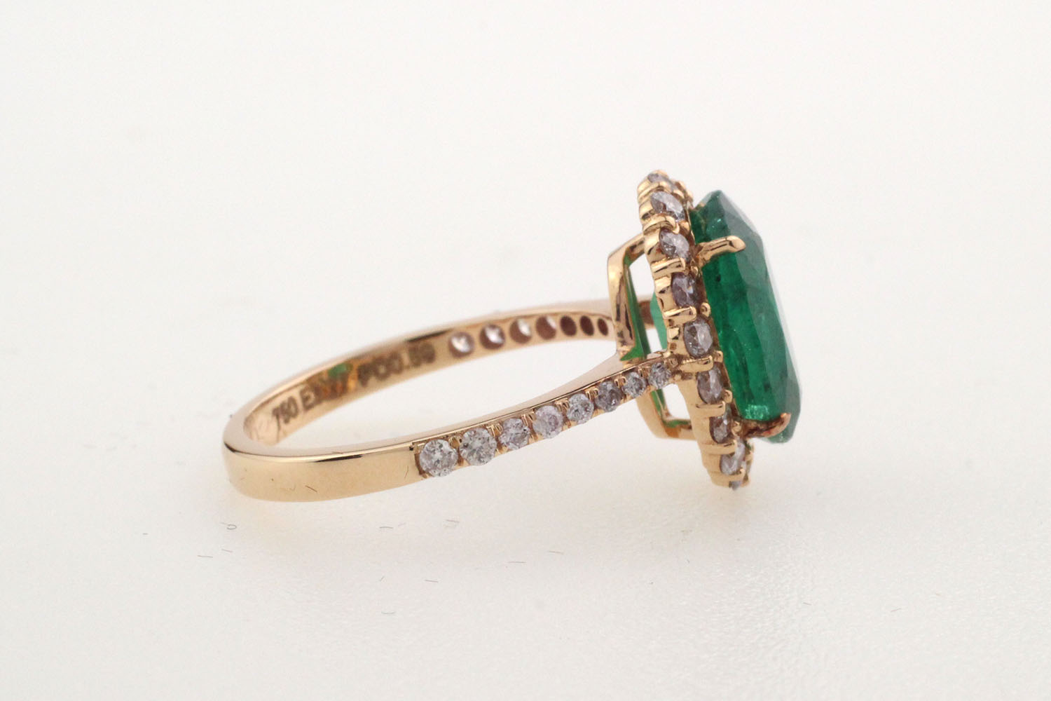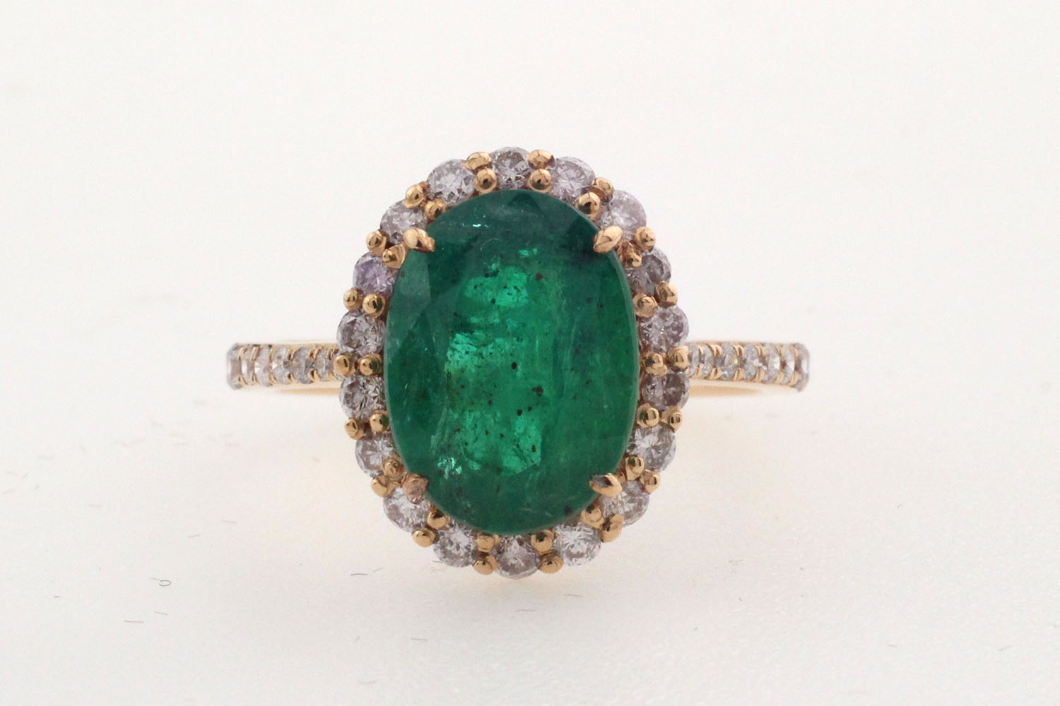 - 18K gold ring with a facet-cut emerald (moderate oiled) weighing 3.27 ct accompanied by 0.59 ct brilliant-cut pink diamonds.