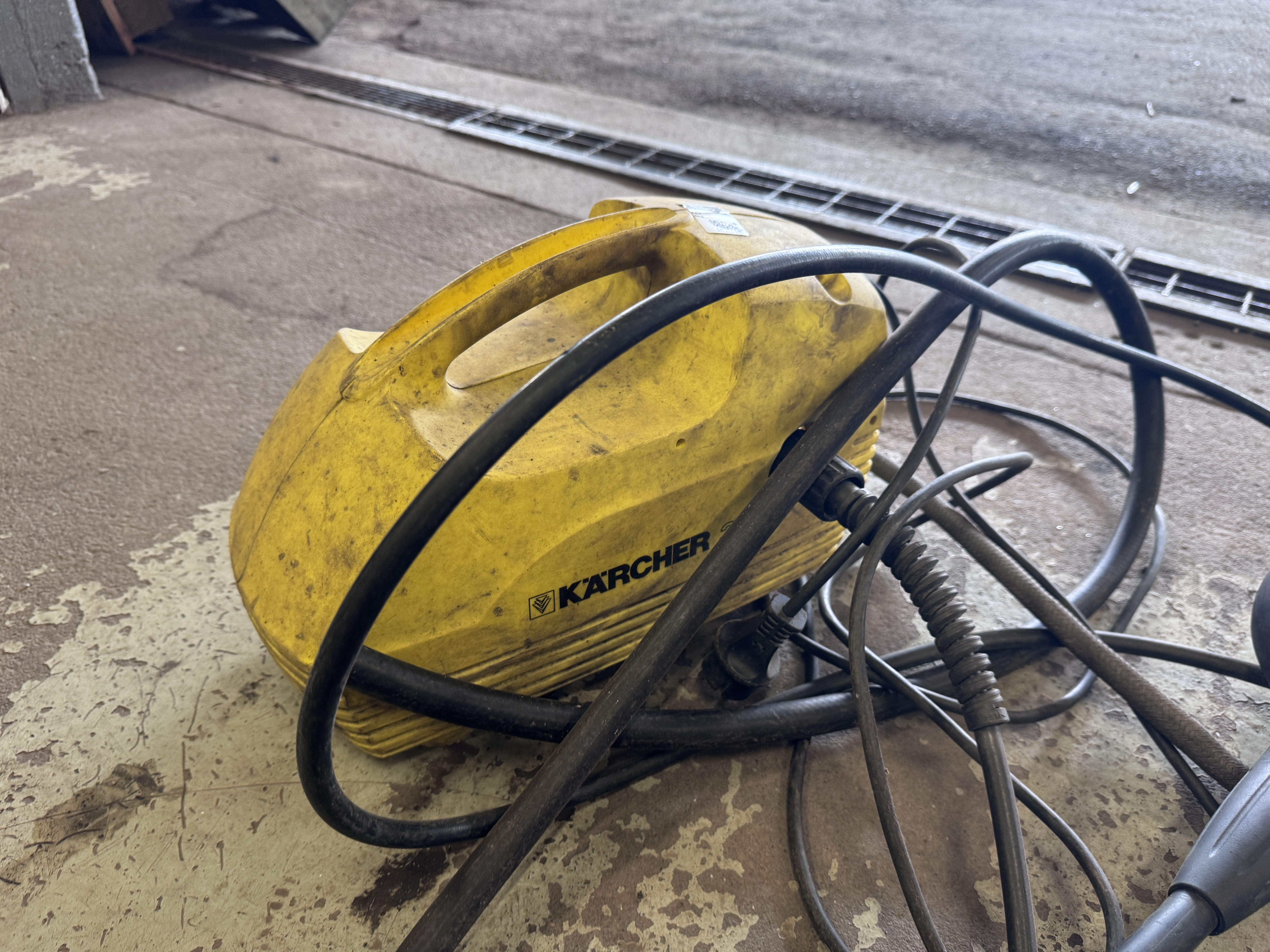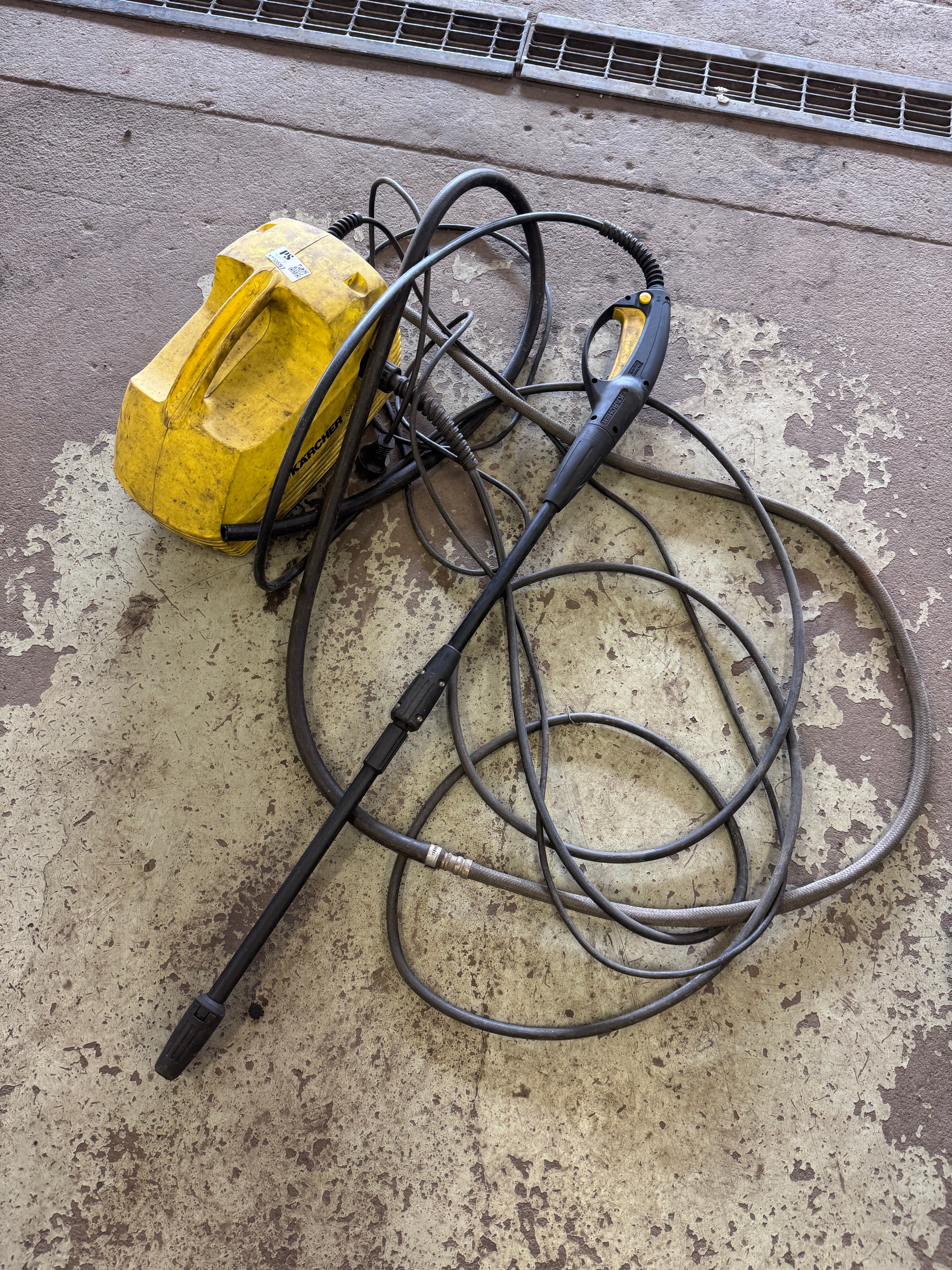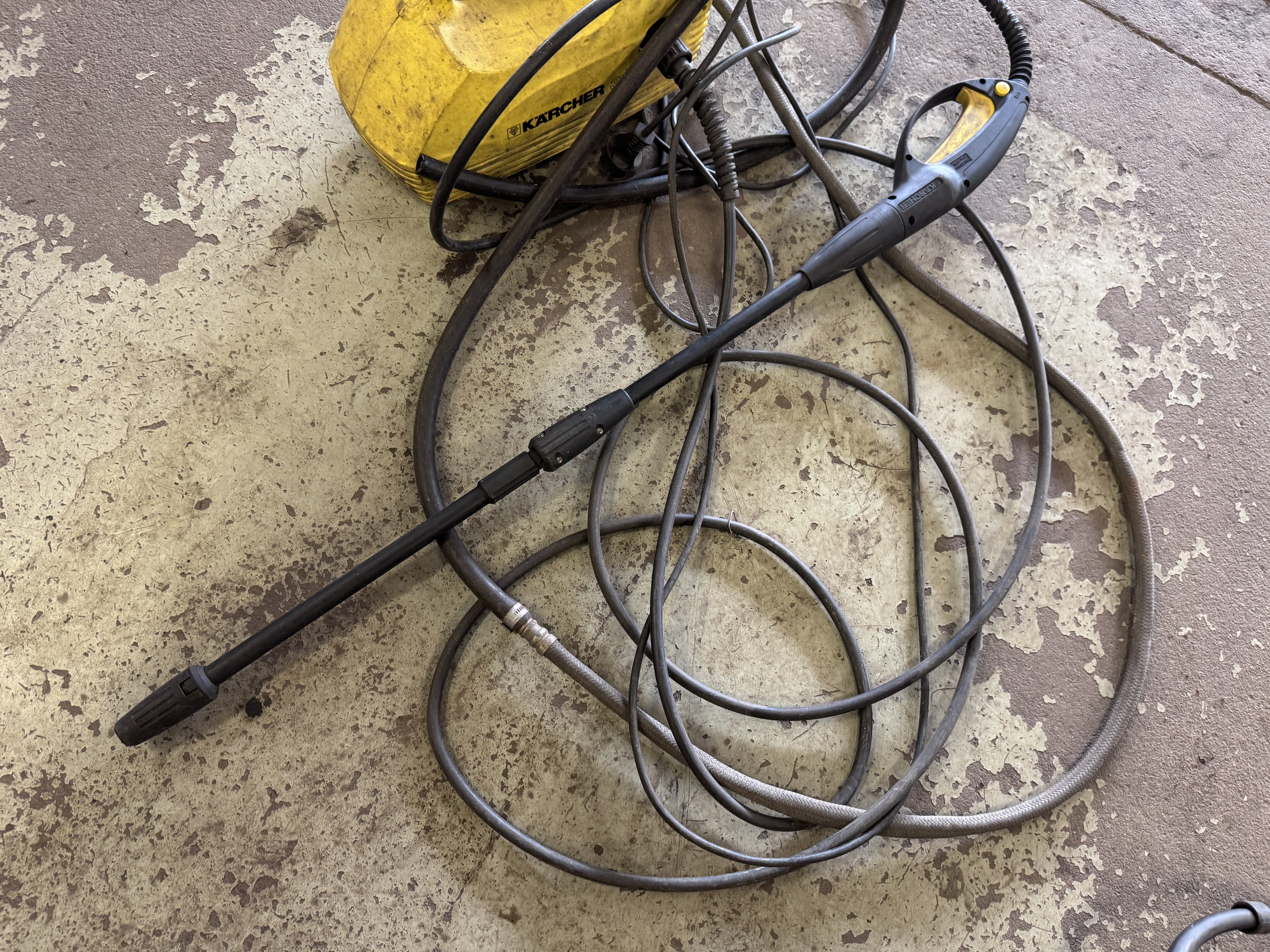 This high pressure washer from Kärcher is an older model, but with a powerful motor and high working pressure (120 bar). It is intended for standard cleaning and can handle water up to 40°C. The machine appears to be in usable condition, but external signs of wear are clearly visible, especially dirt and wear on the chassis.