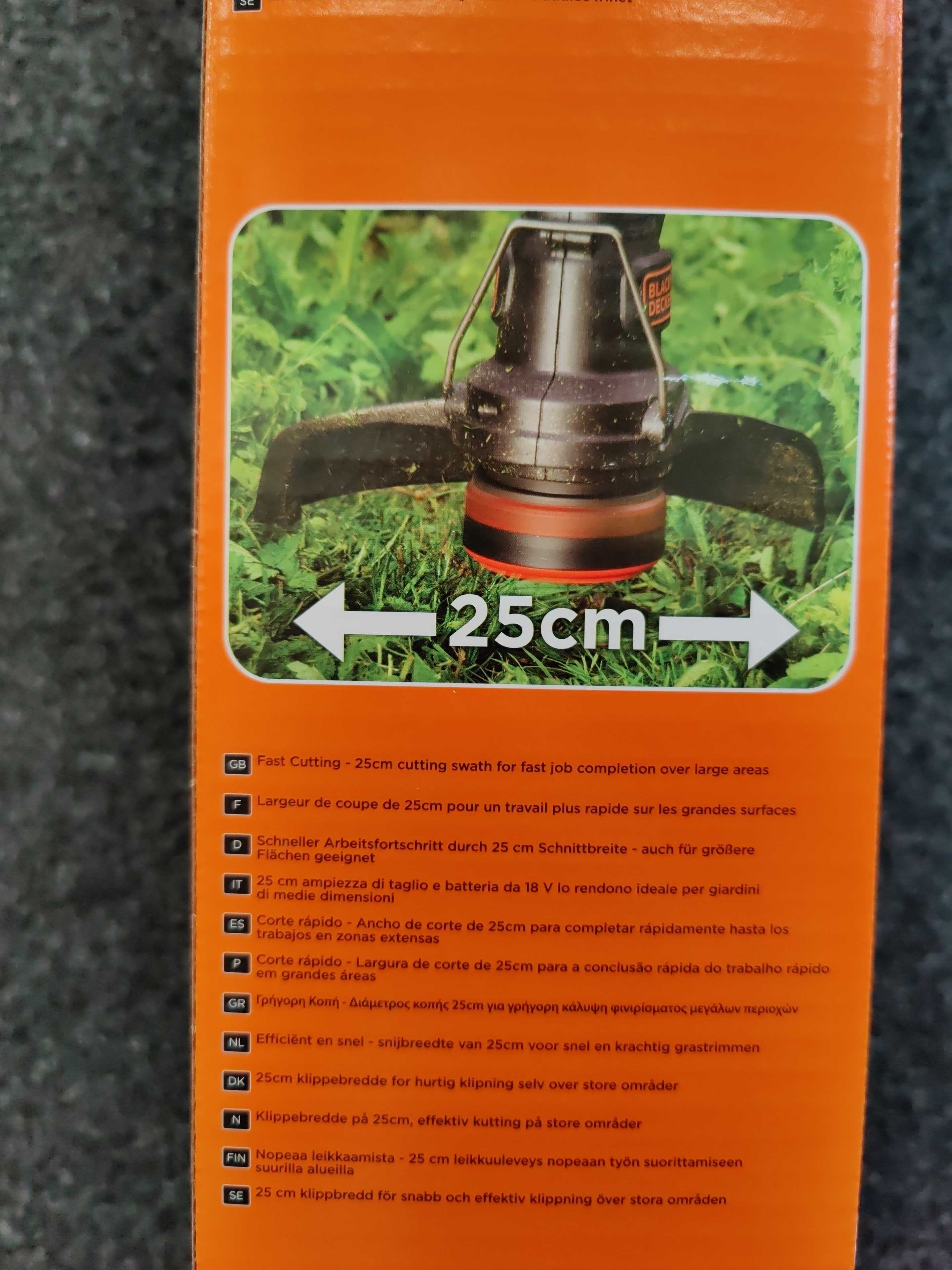18 V grass trimmer with a cutting width of 25 cm, which makes it suitable for trimming larger areas. The trimmer has a cutting speed of 9000 rpm and is equipped with an automatic wire feeding system