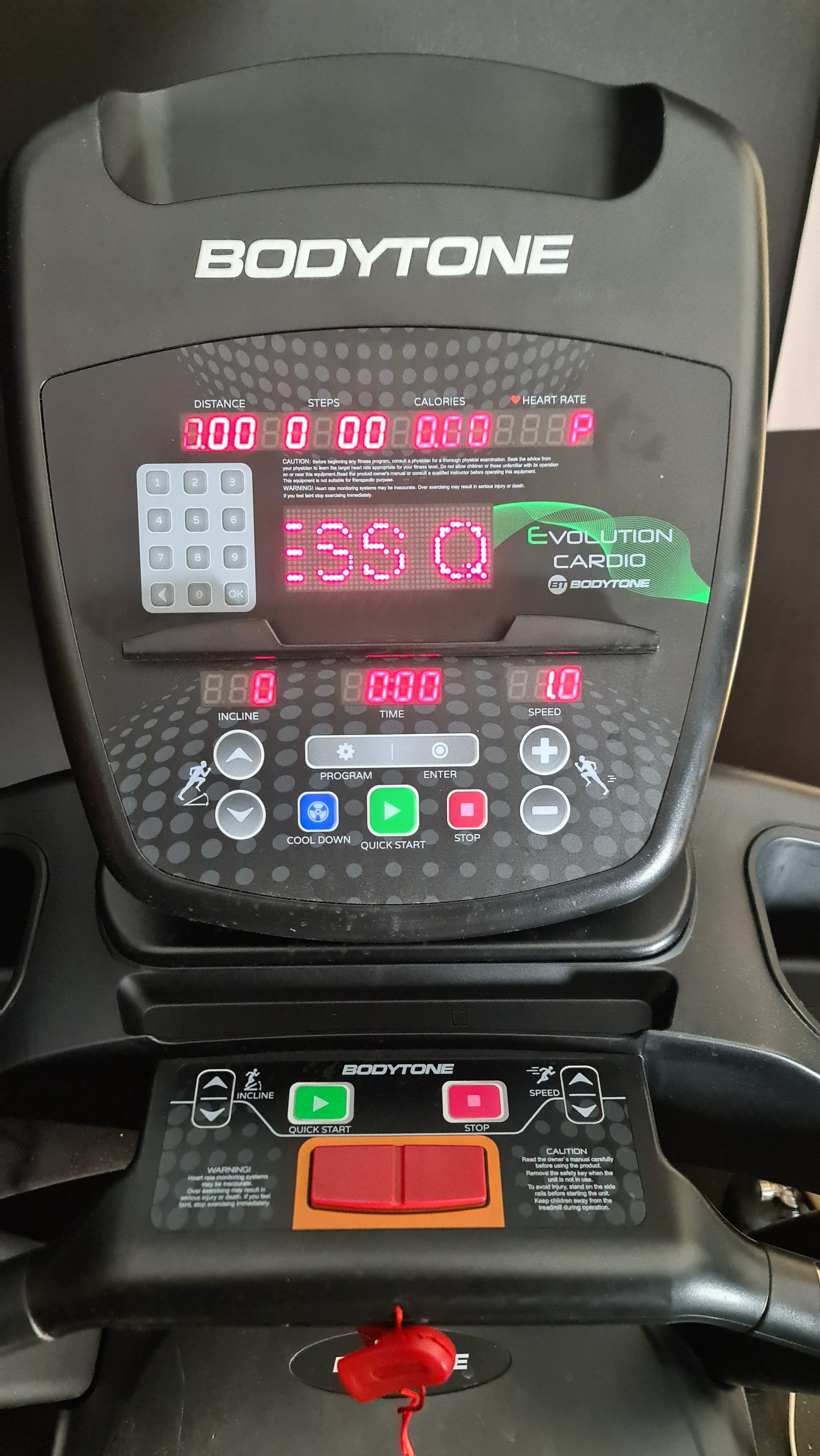 CONTROLS: Start, stop, incline and speed, return to calm and heart rate monitor