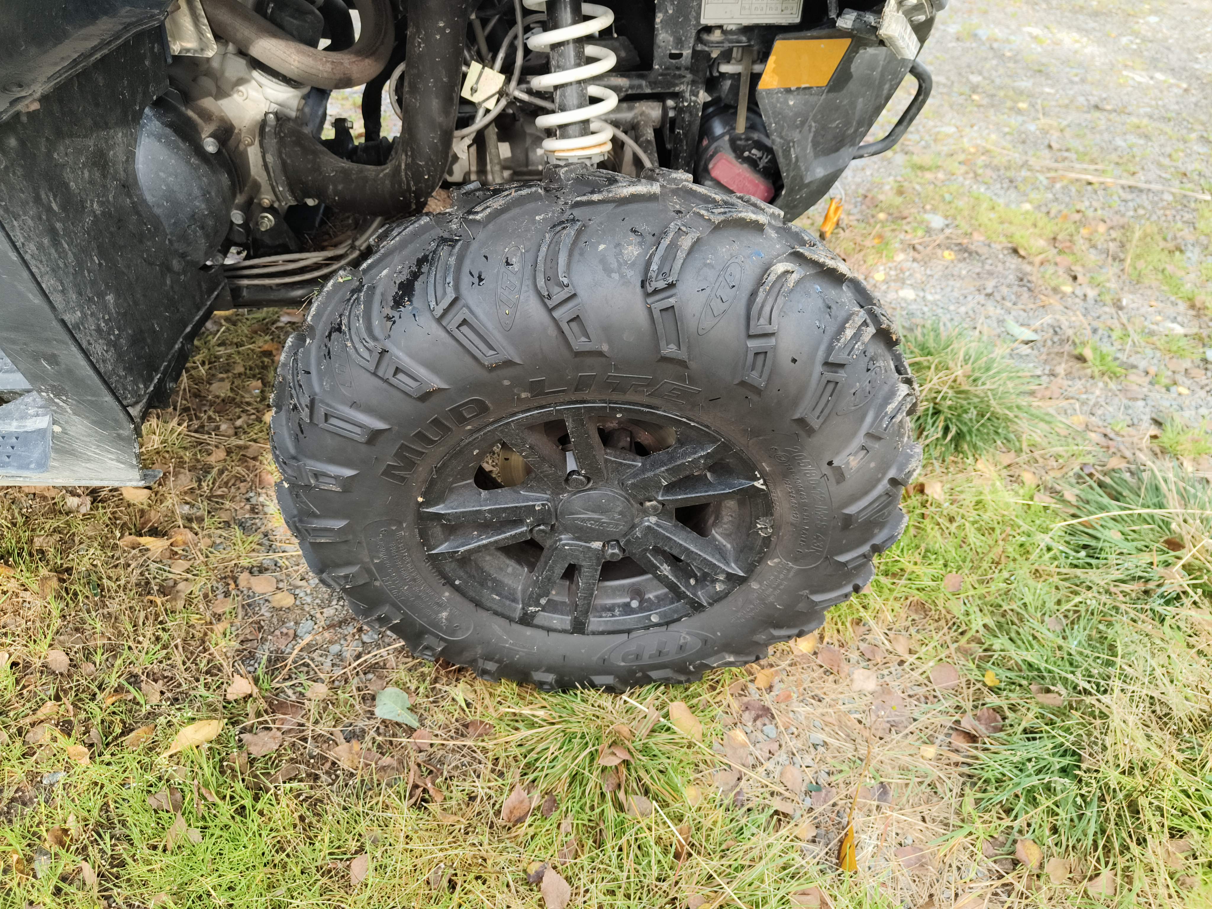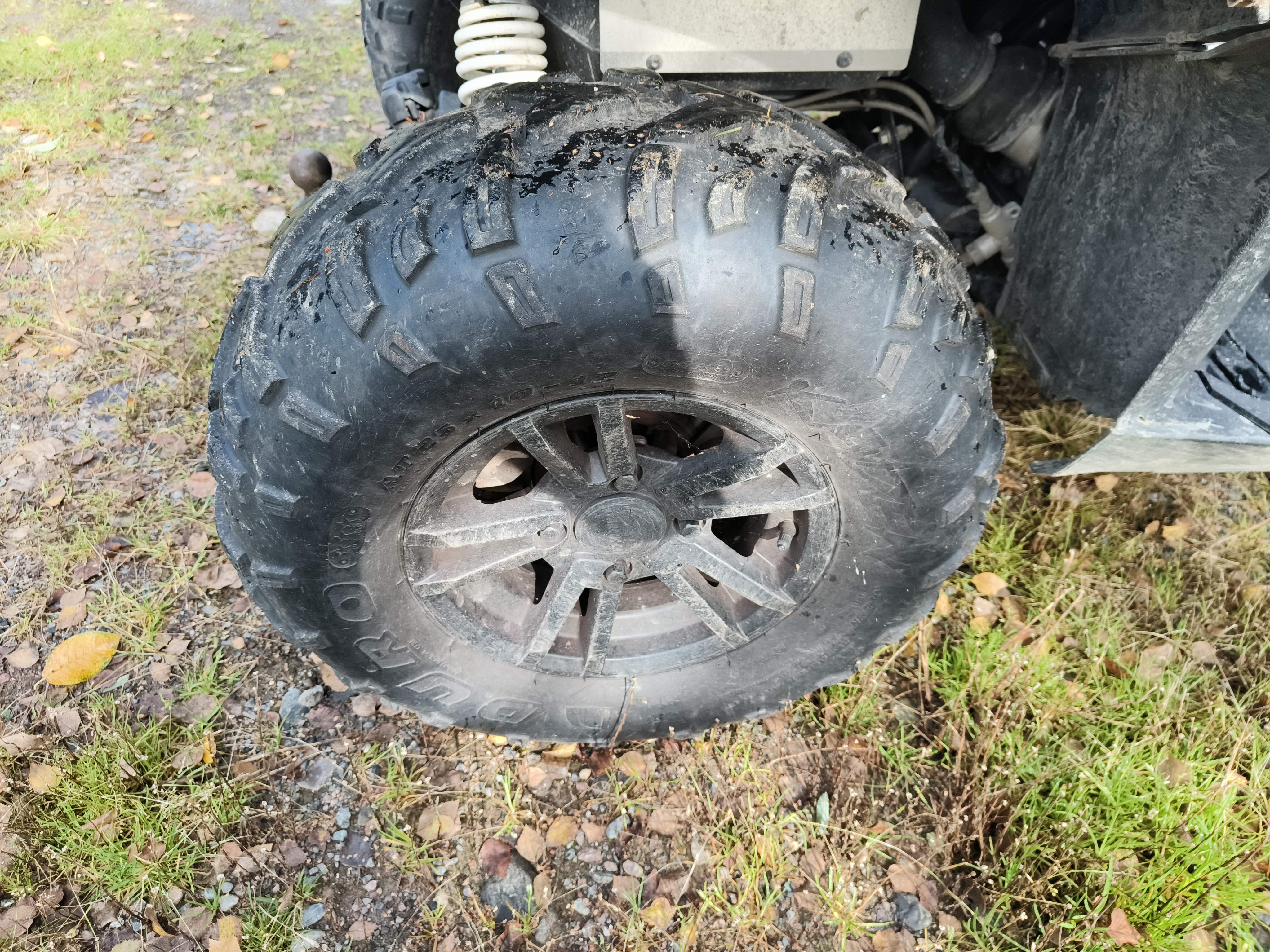 Rear tire: 25x10-12, About 40% of the tread depth remains.