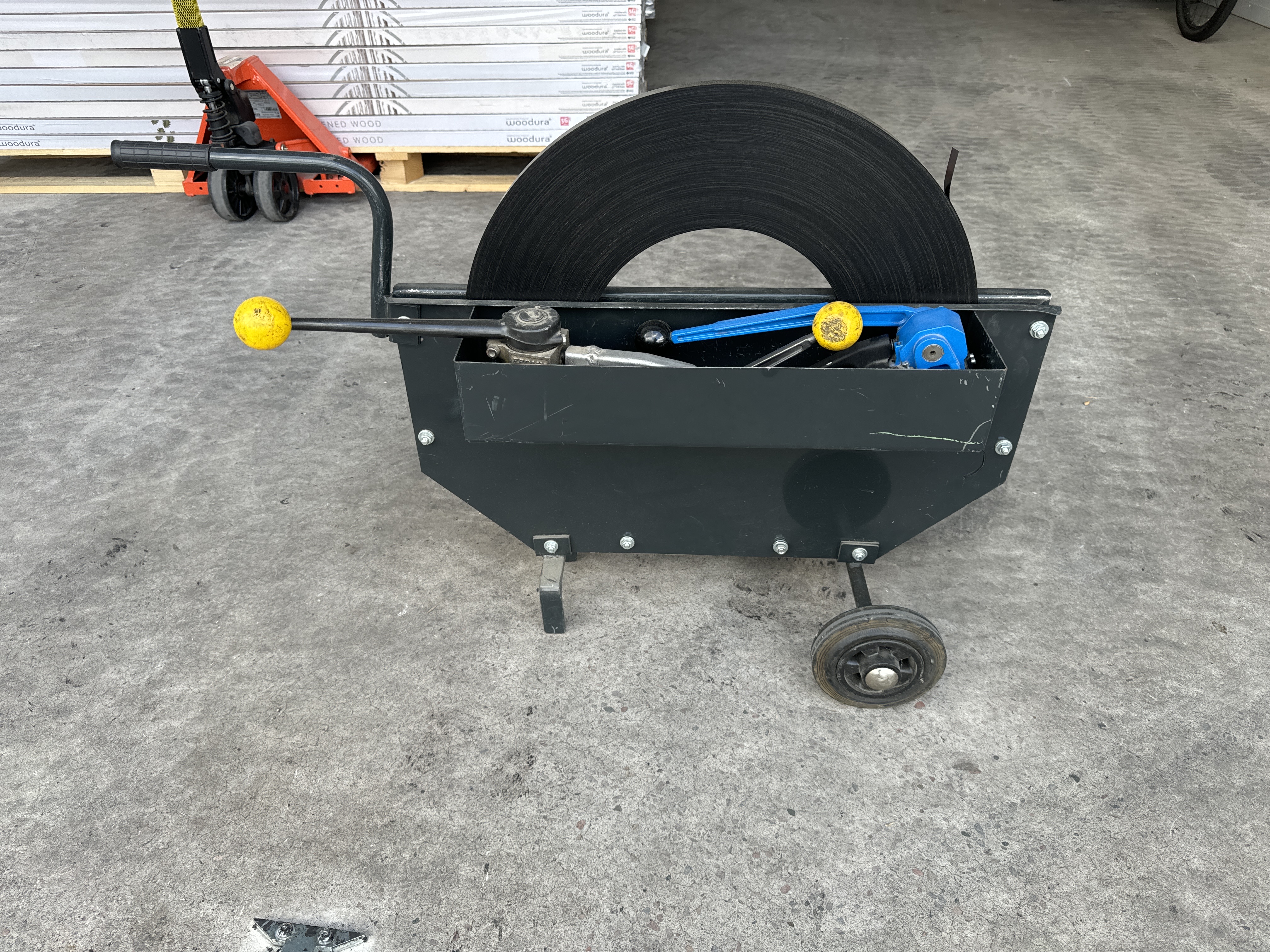 Sheet metal strip roll with off cutter.