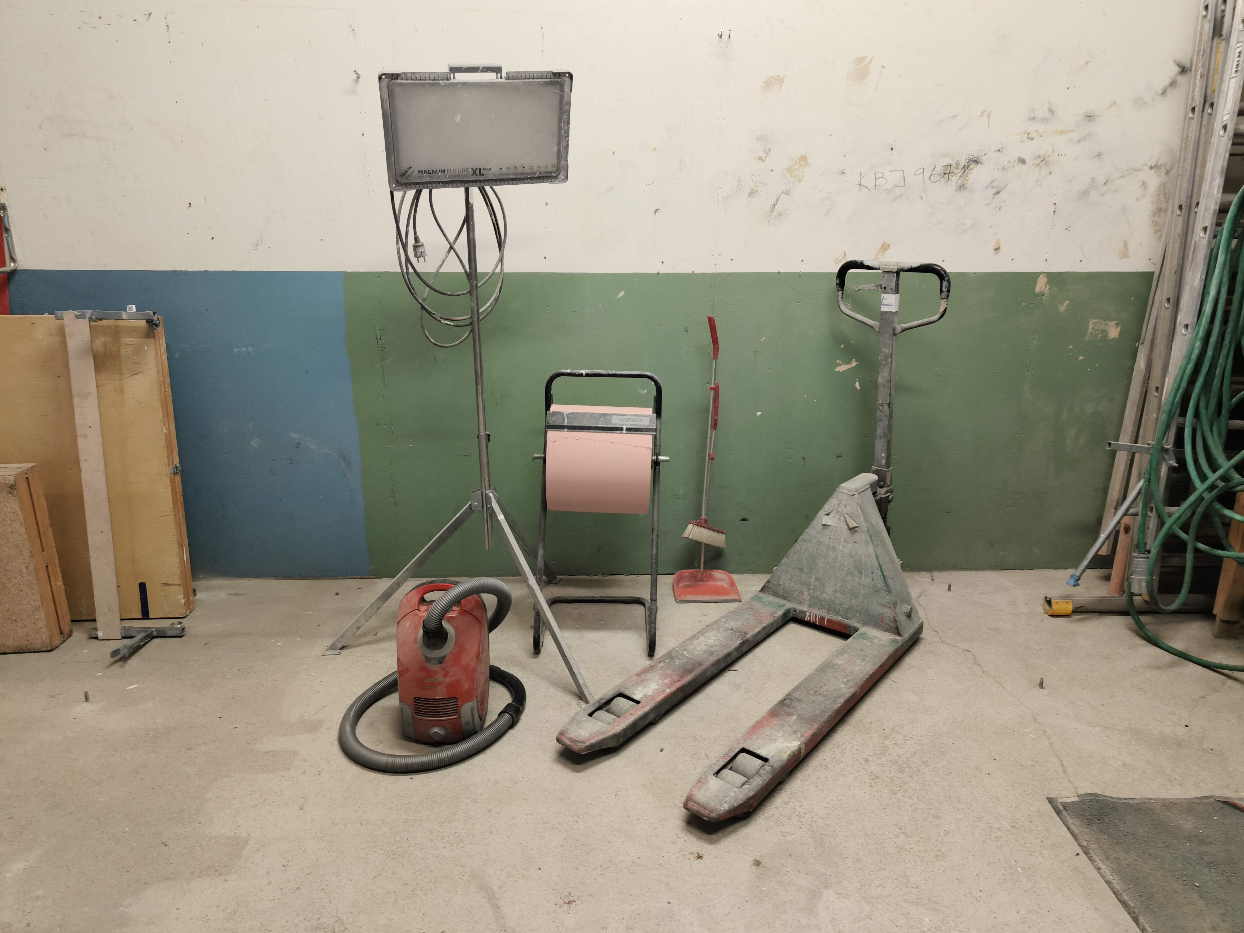 Pallet puller, work light and paper holder.