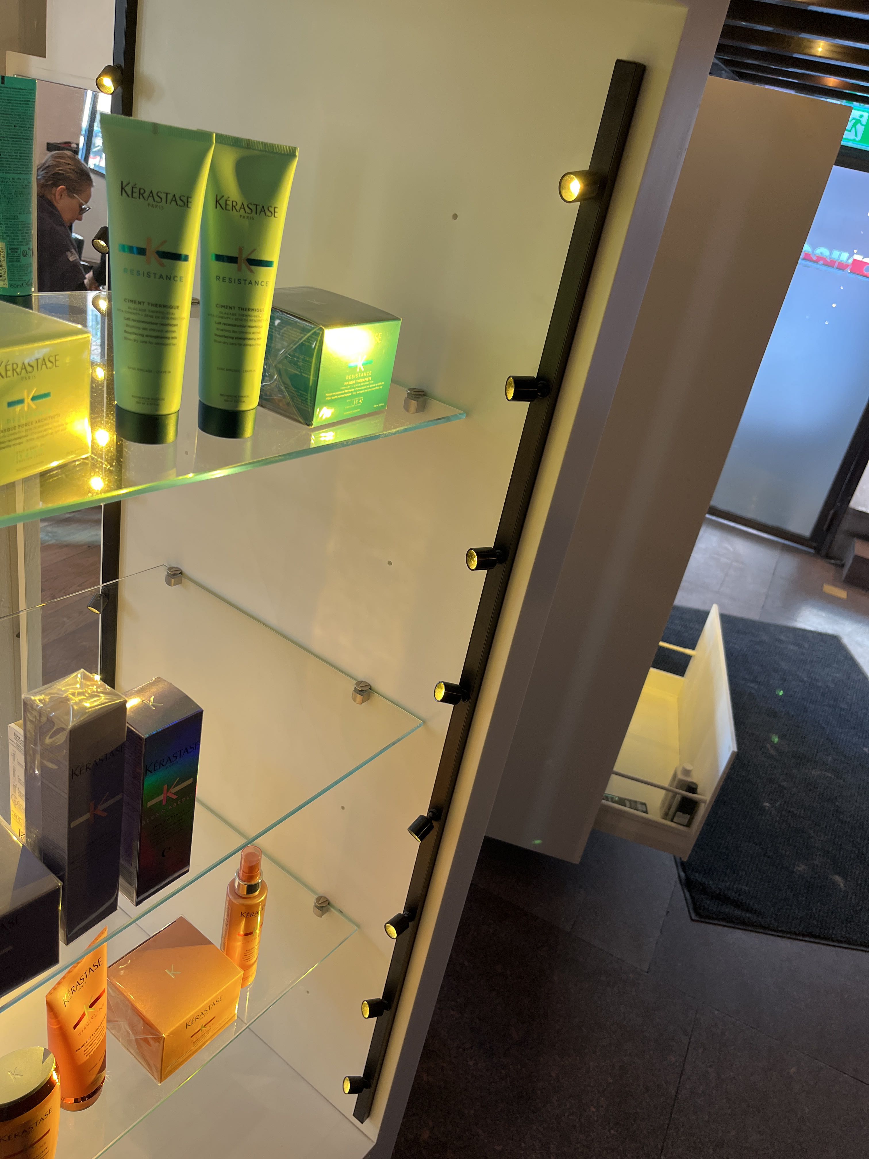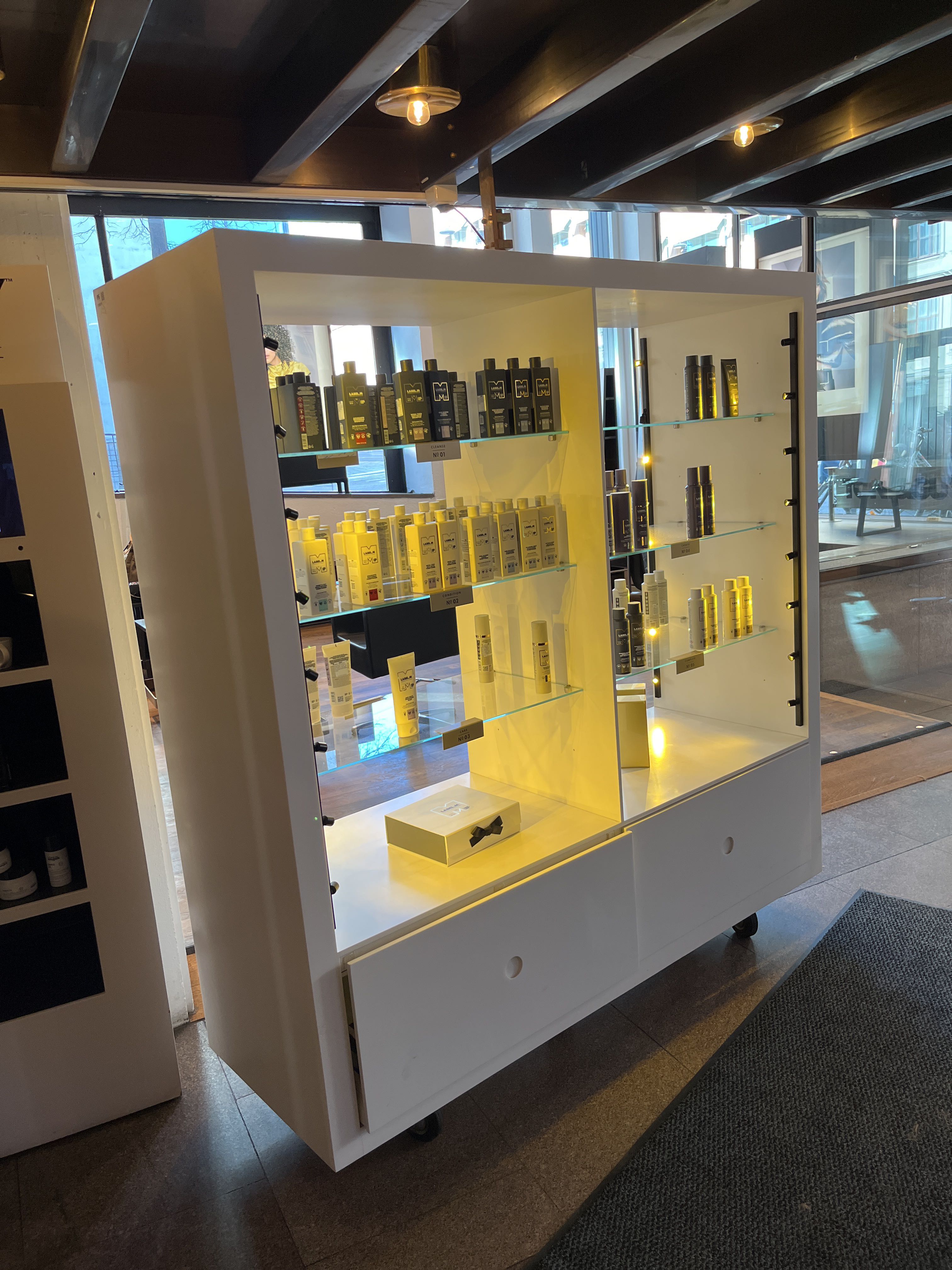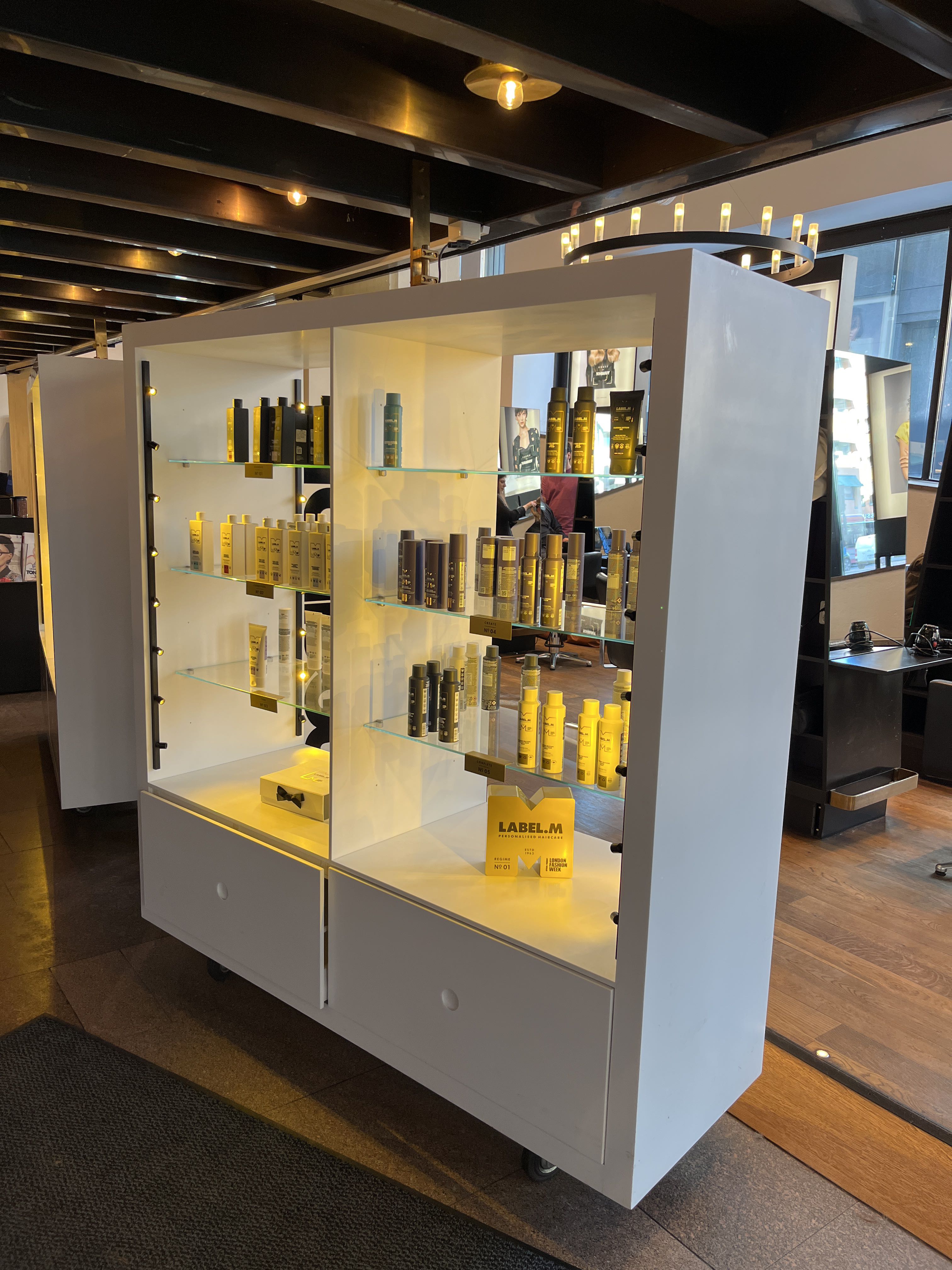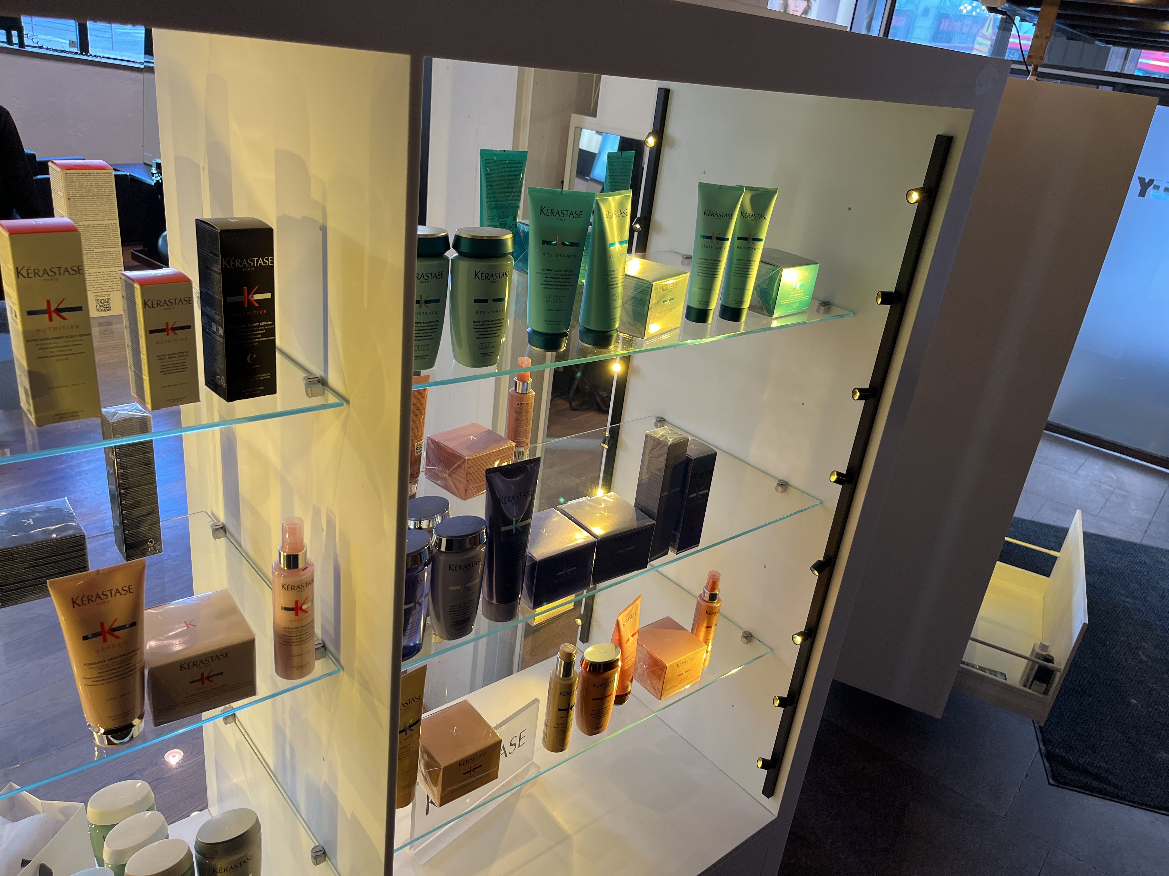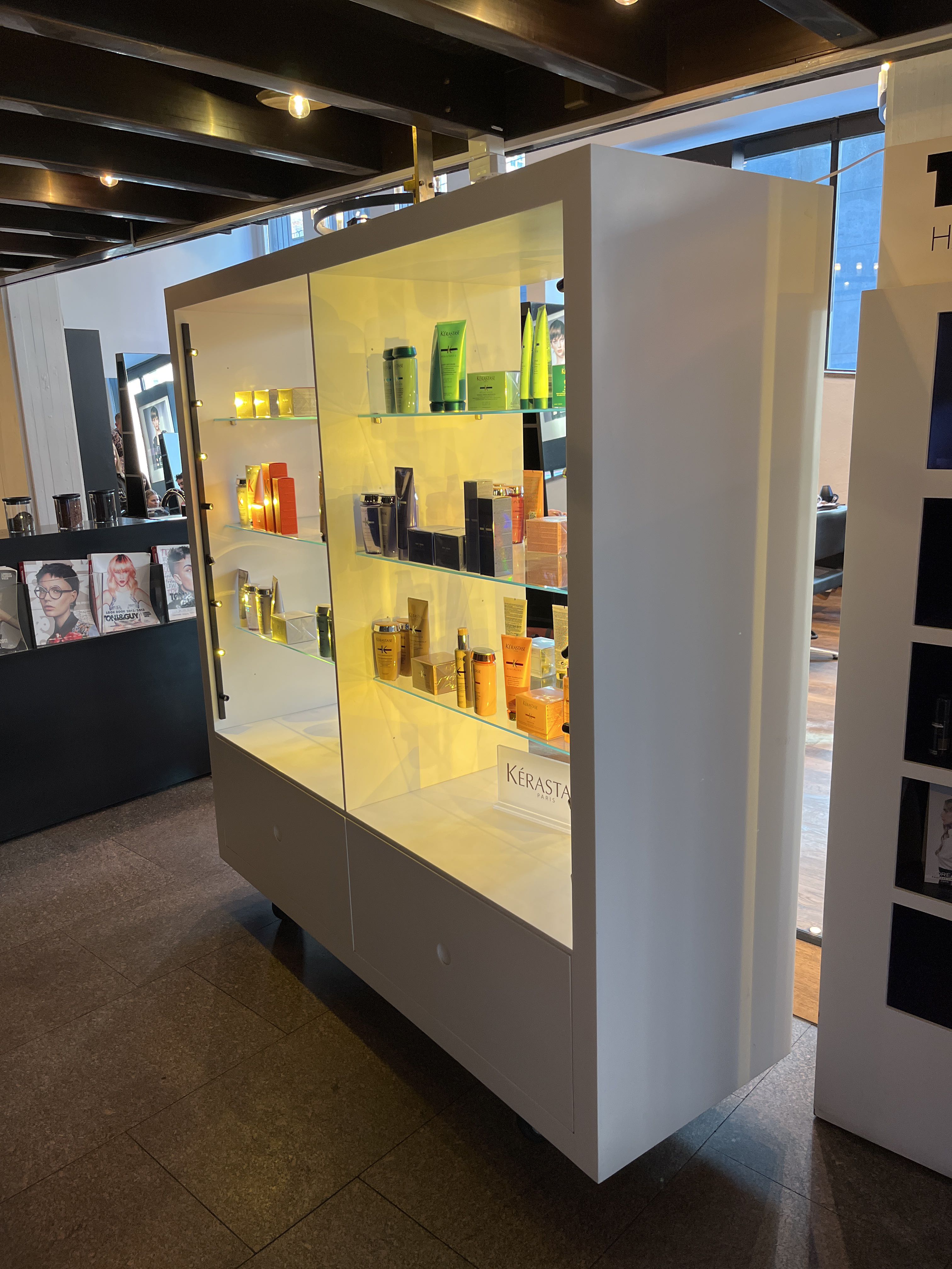 Equipped with lighting, glass shelves and deep storage drawers.