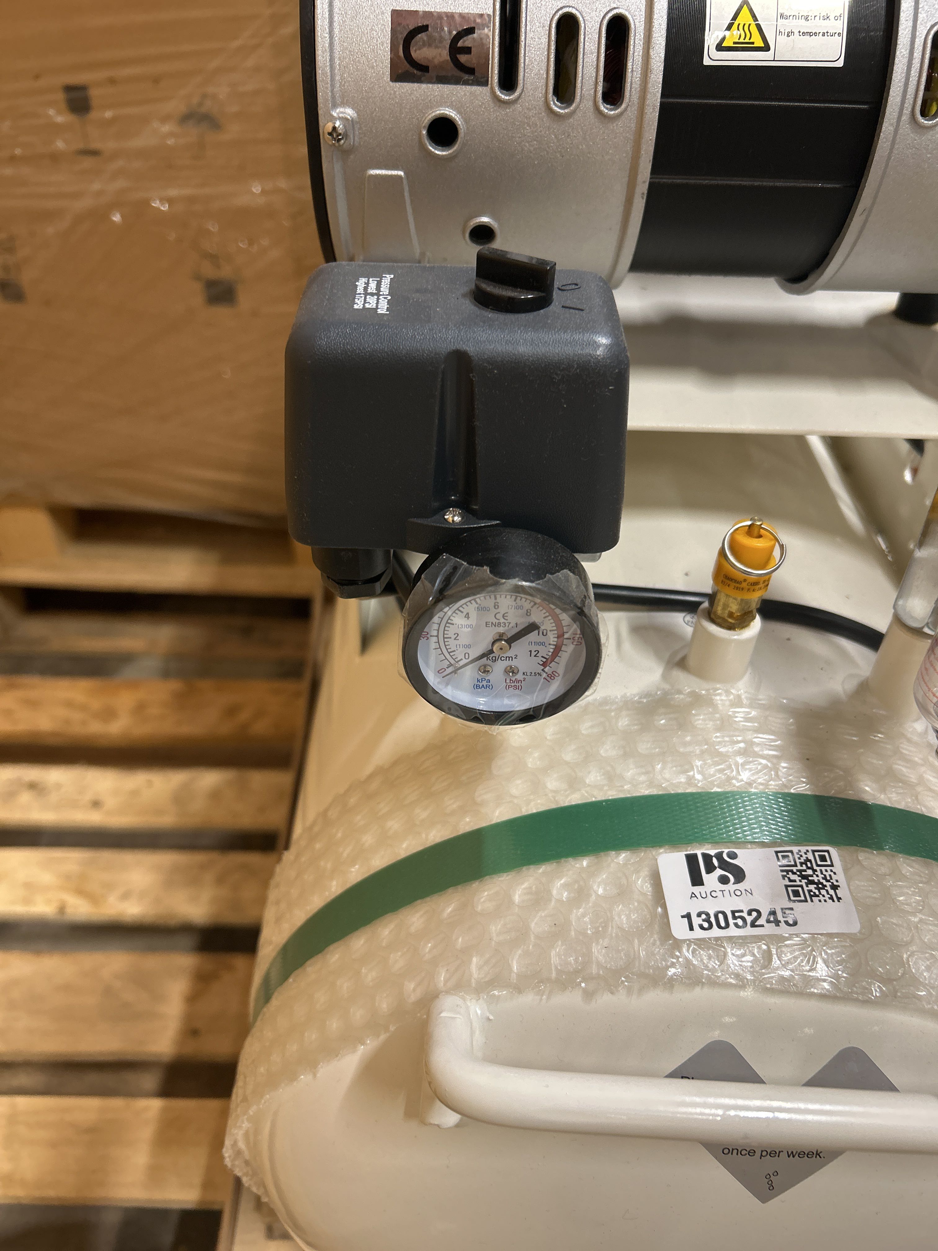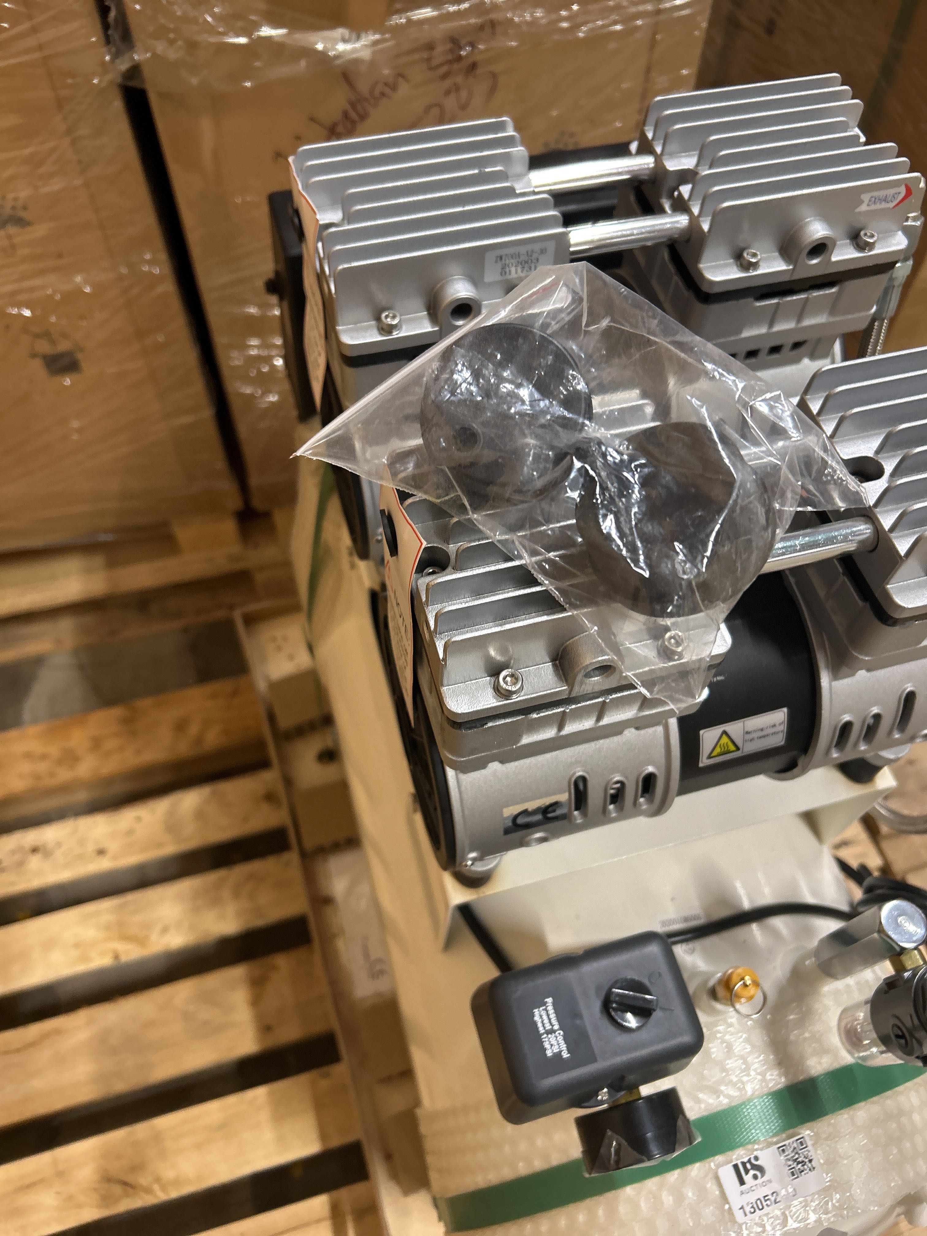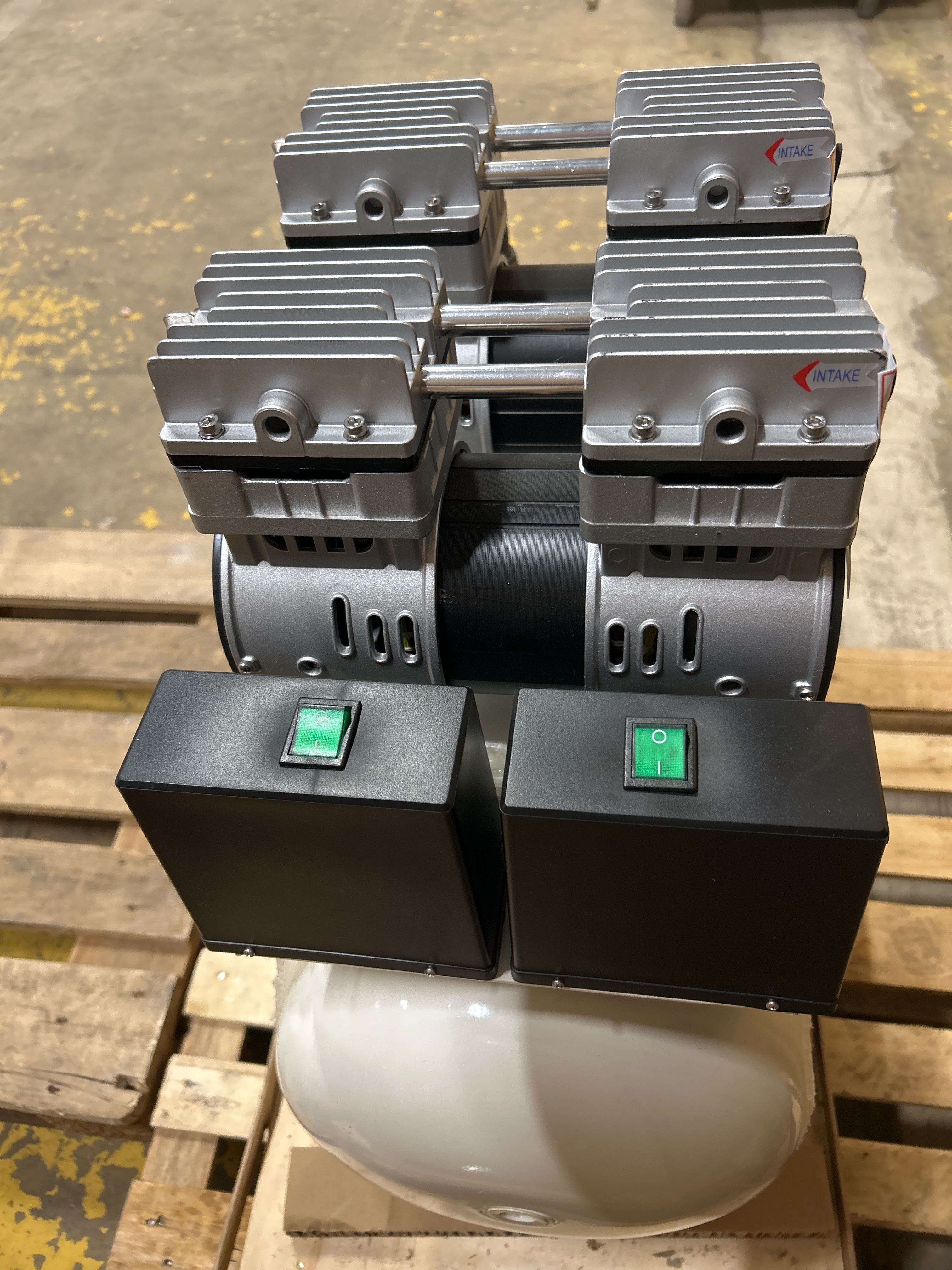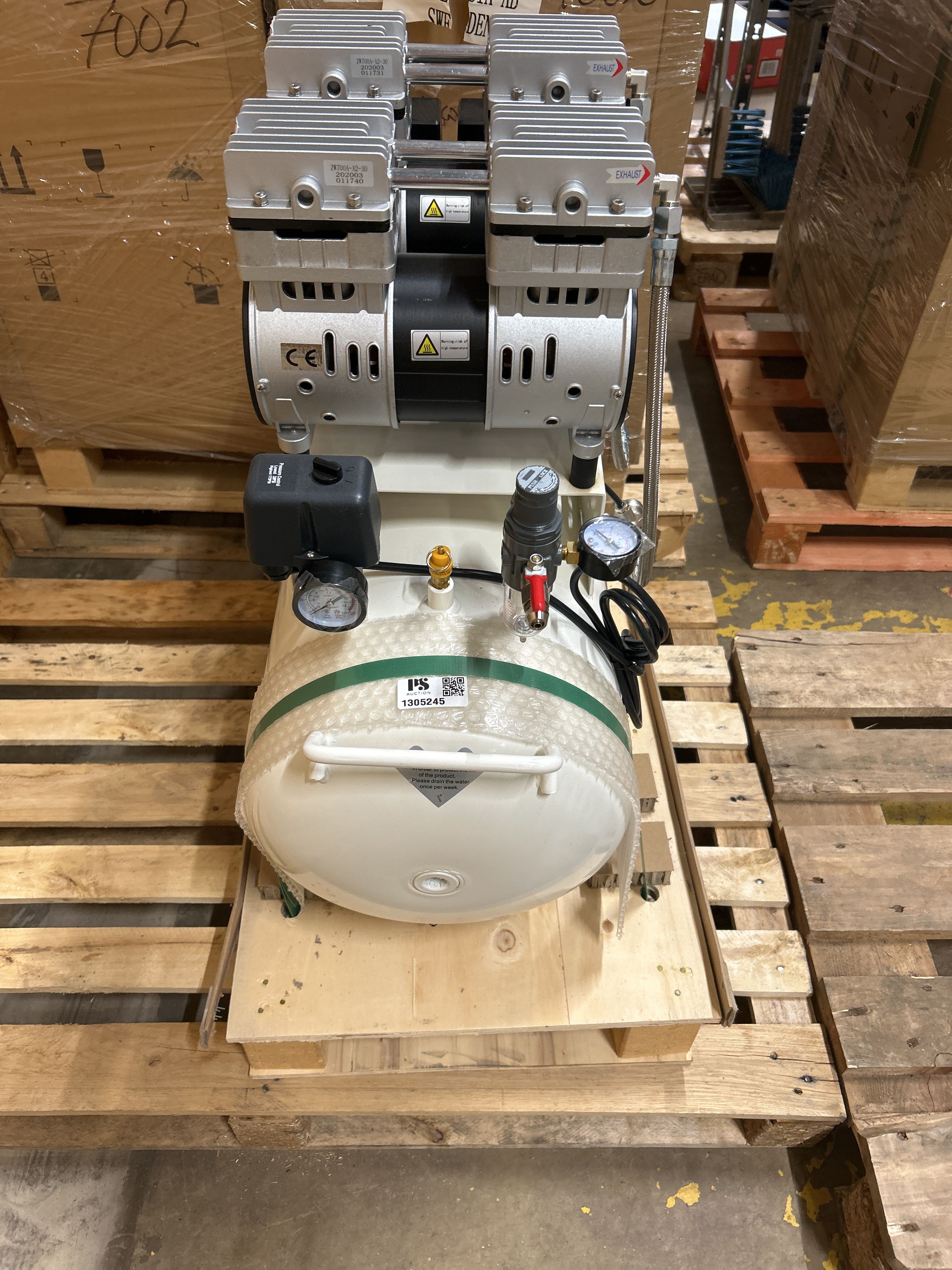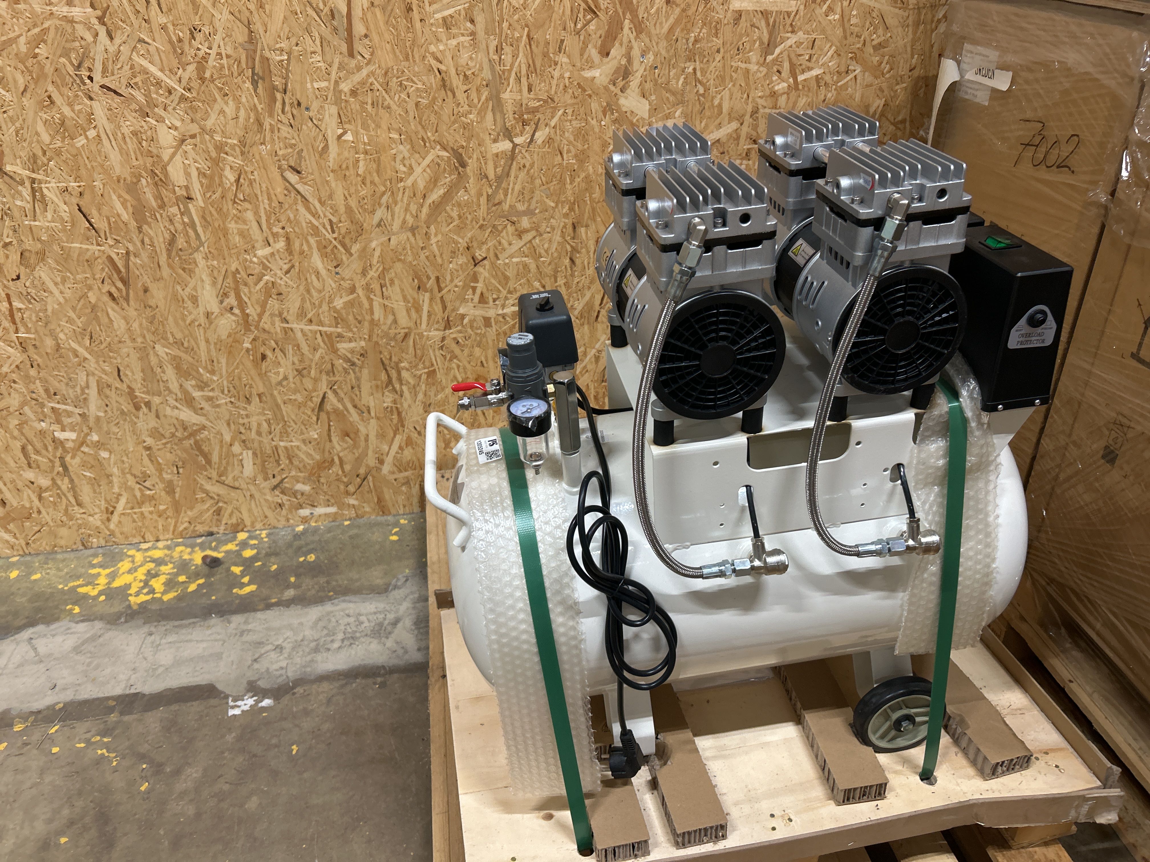 Quiet and oil-free air compressor with 50 liter tank, intended for use in environments with high demands on air quality. The product is factory new and delivered in unopened original packaging on a pallet.