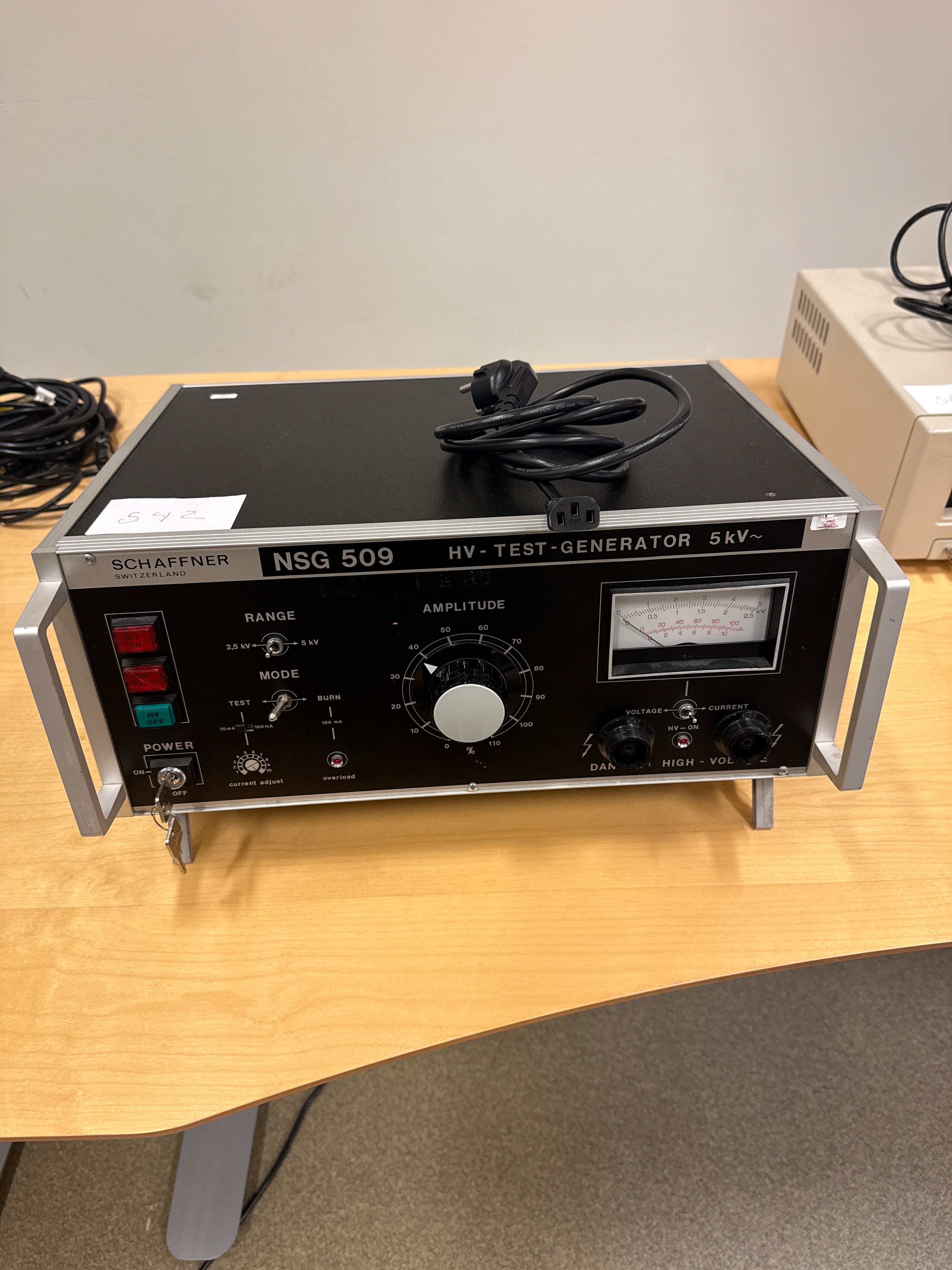 Schaffner NSG 509 HV Test Generator, a high voltage test generator capable of generating up to 5 kV. It is used to test the resistance of electrical and electronic components to high voltages, for example in EMC testing (electromagnetic compatibility) and insulation testing.