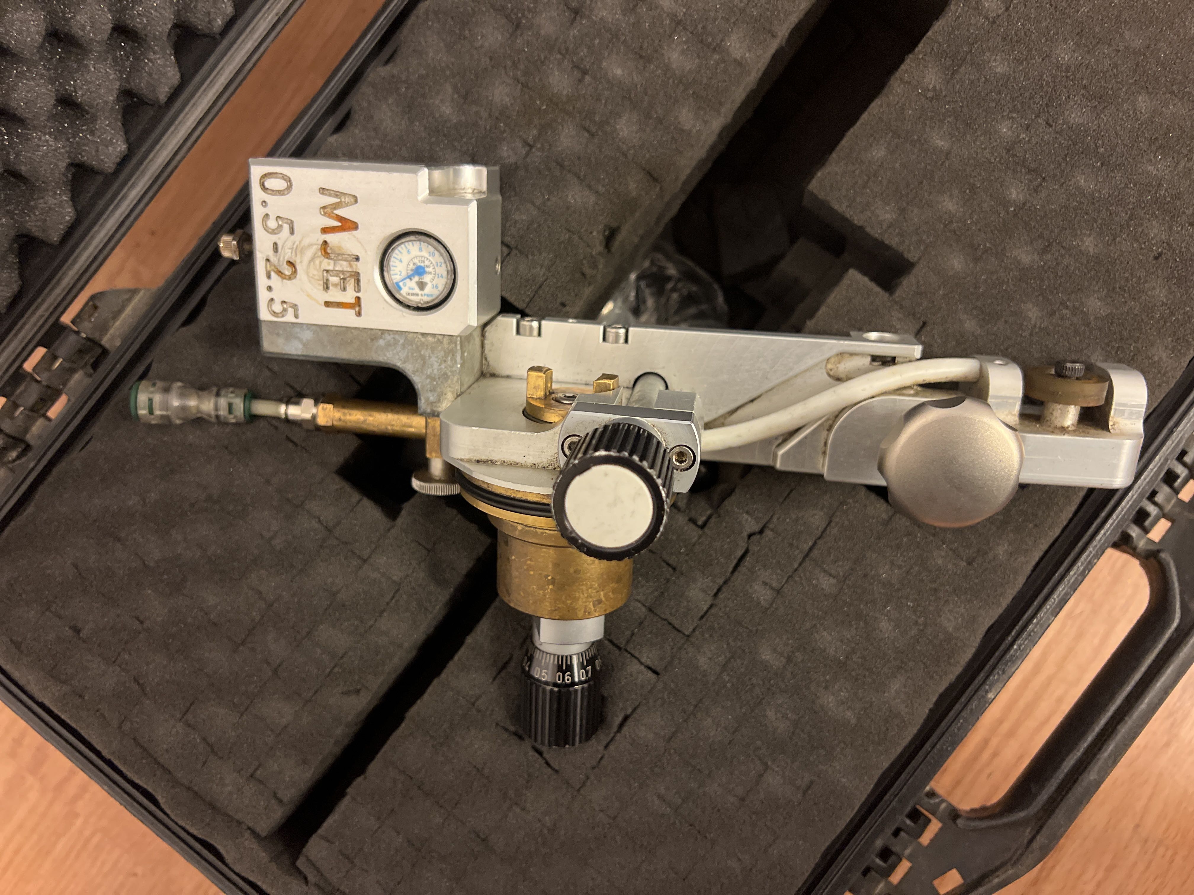 - The unit is made of aluminum and brass and is equipped with a pressure gauge and adjustment knob. It is delivered in a sturdy transport case.