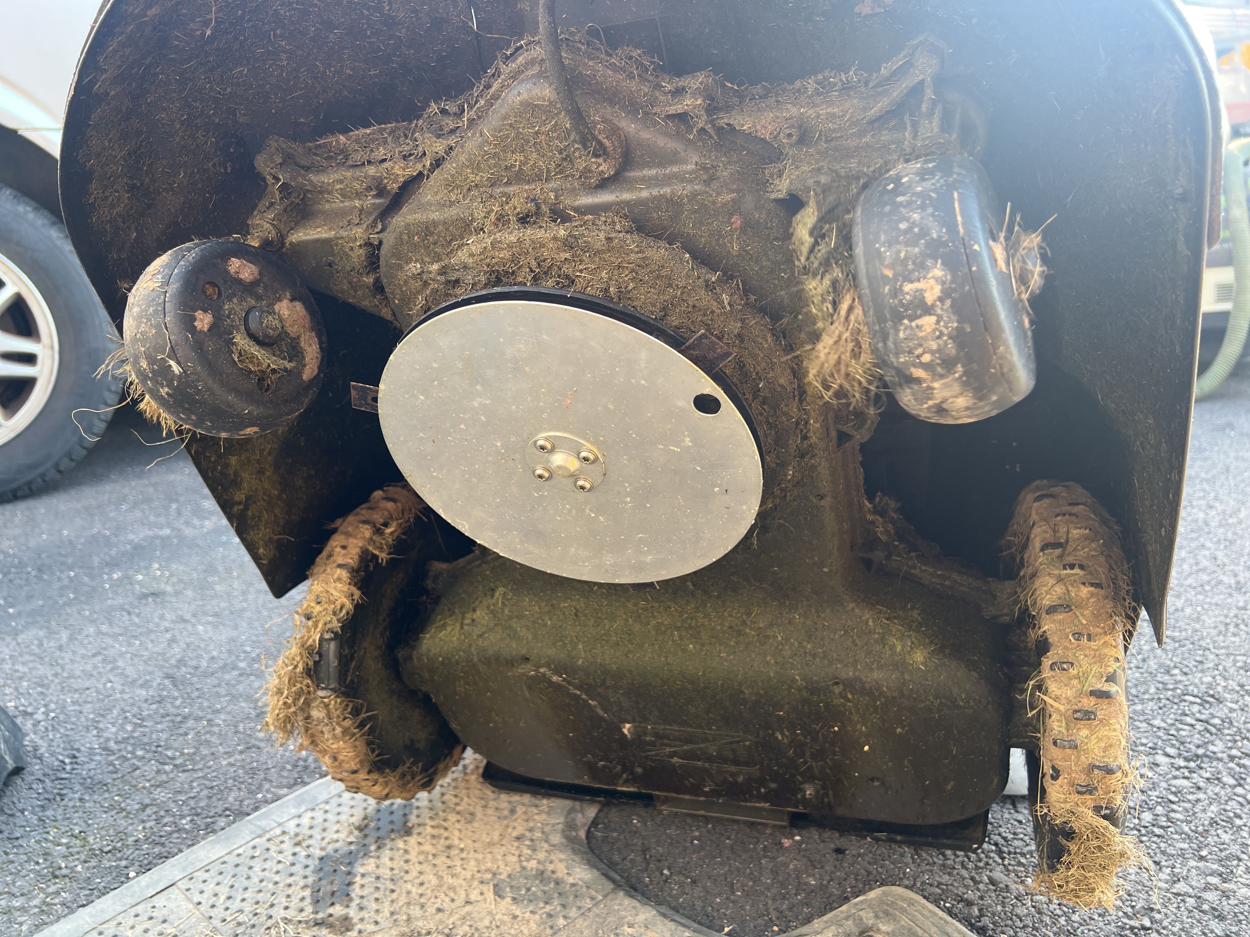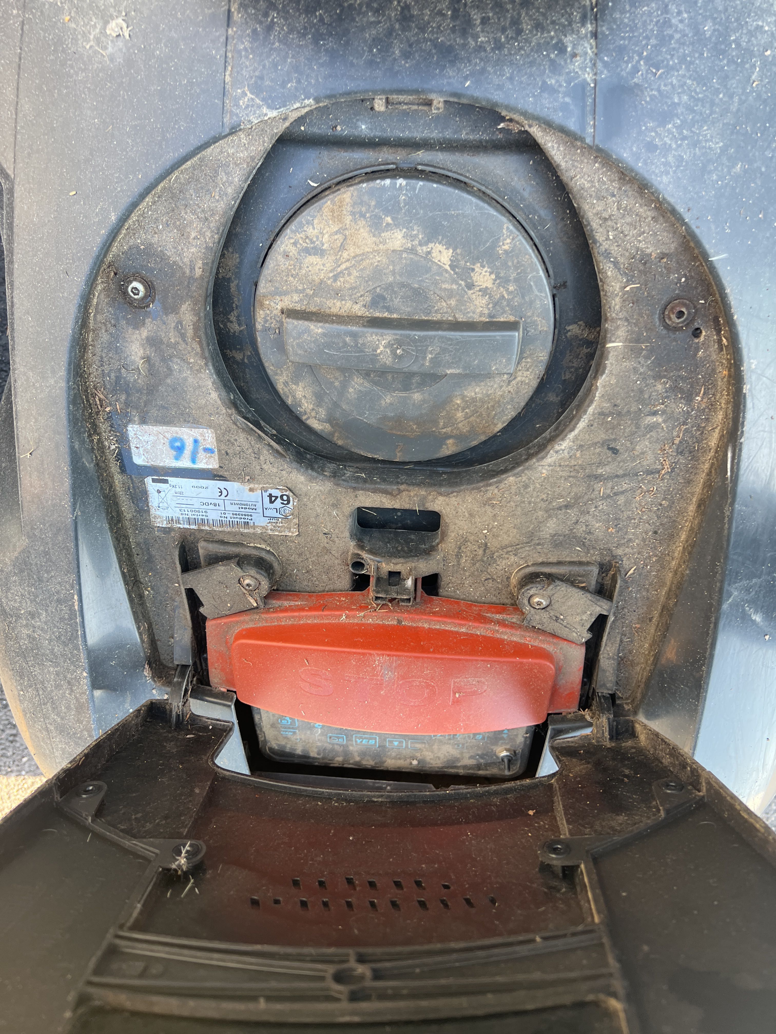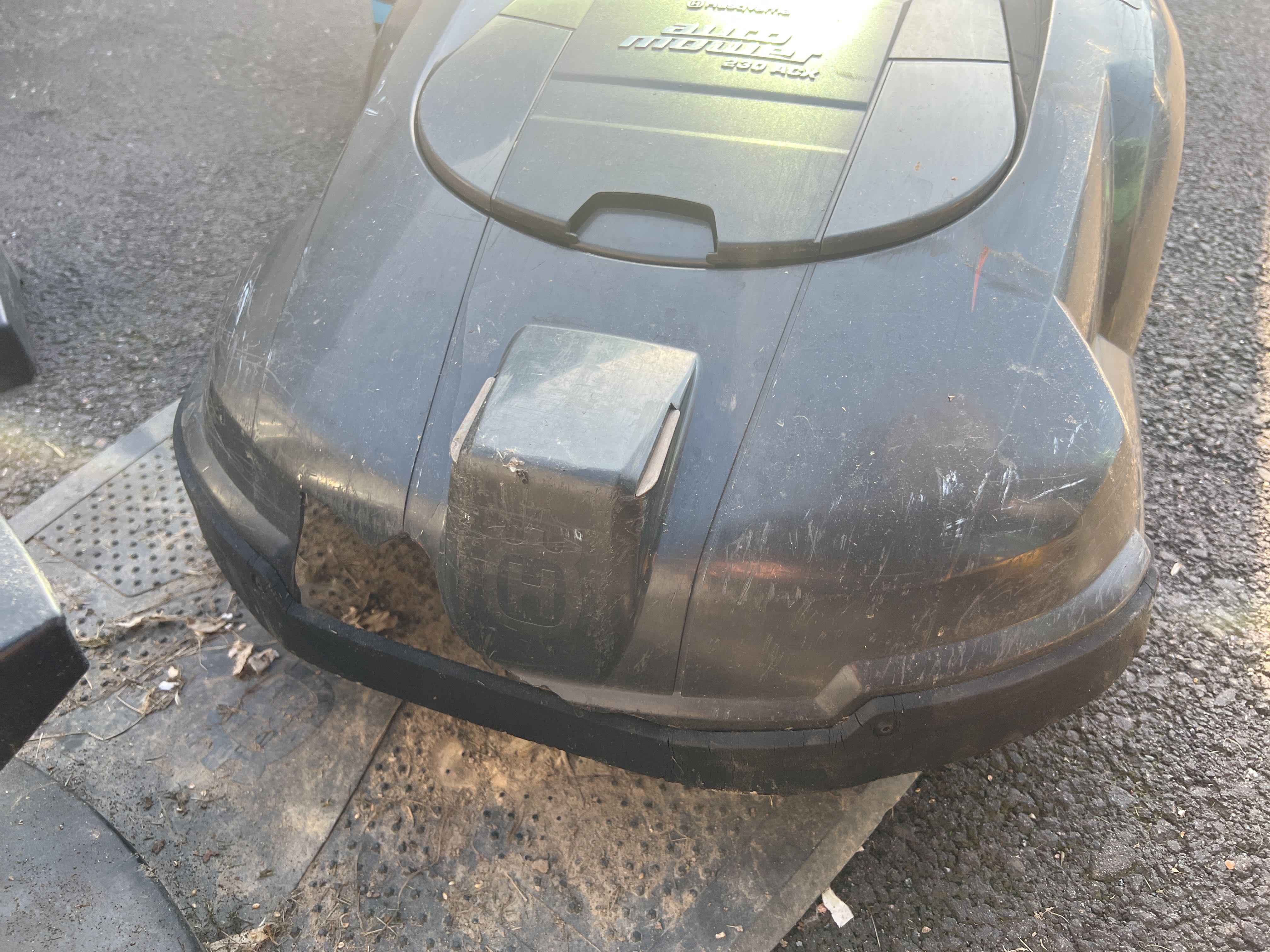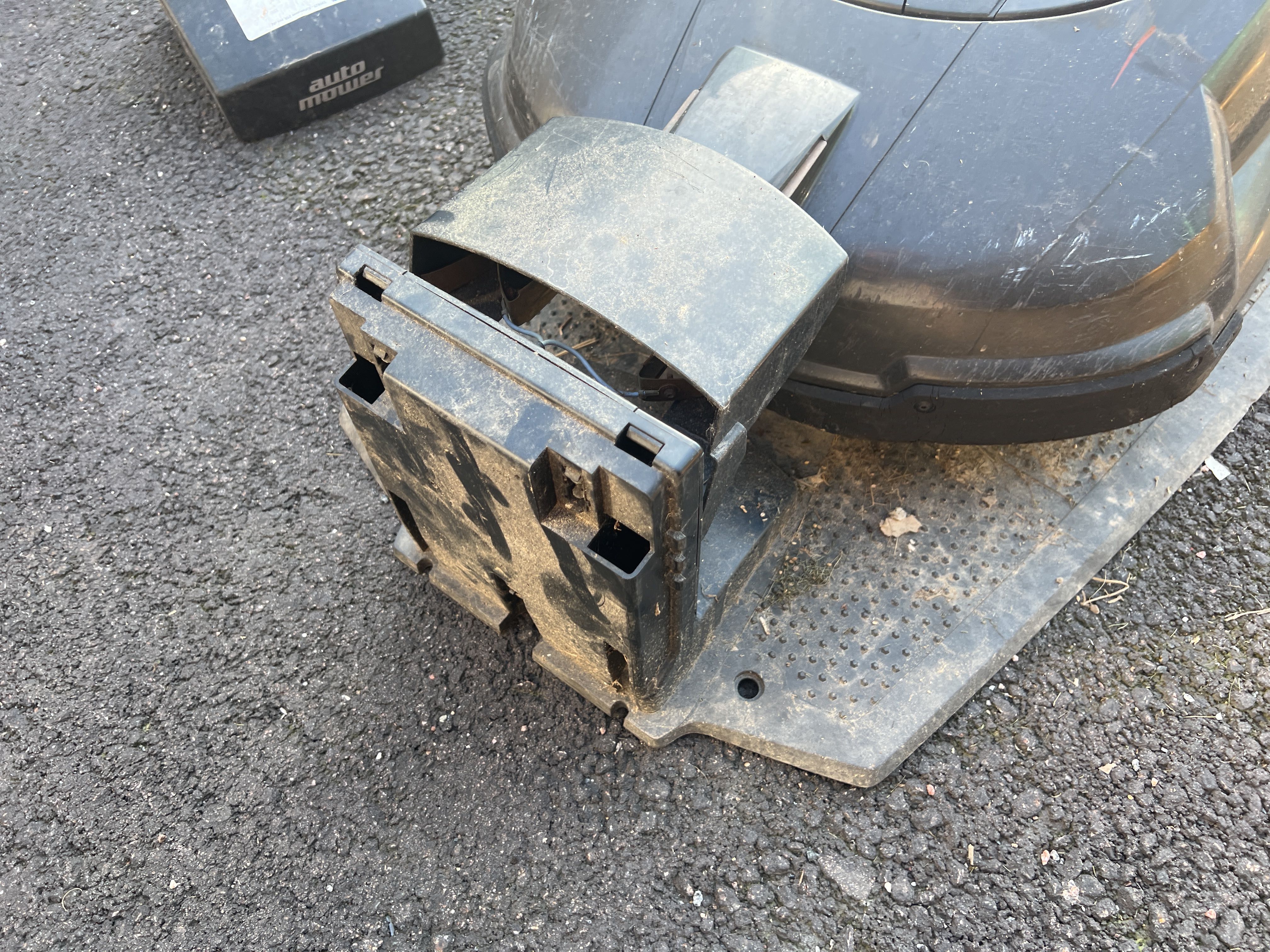 - Robotic lawnmower in need of repair.
