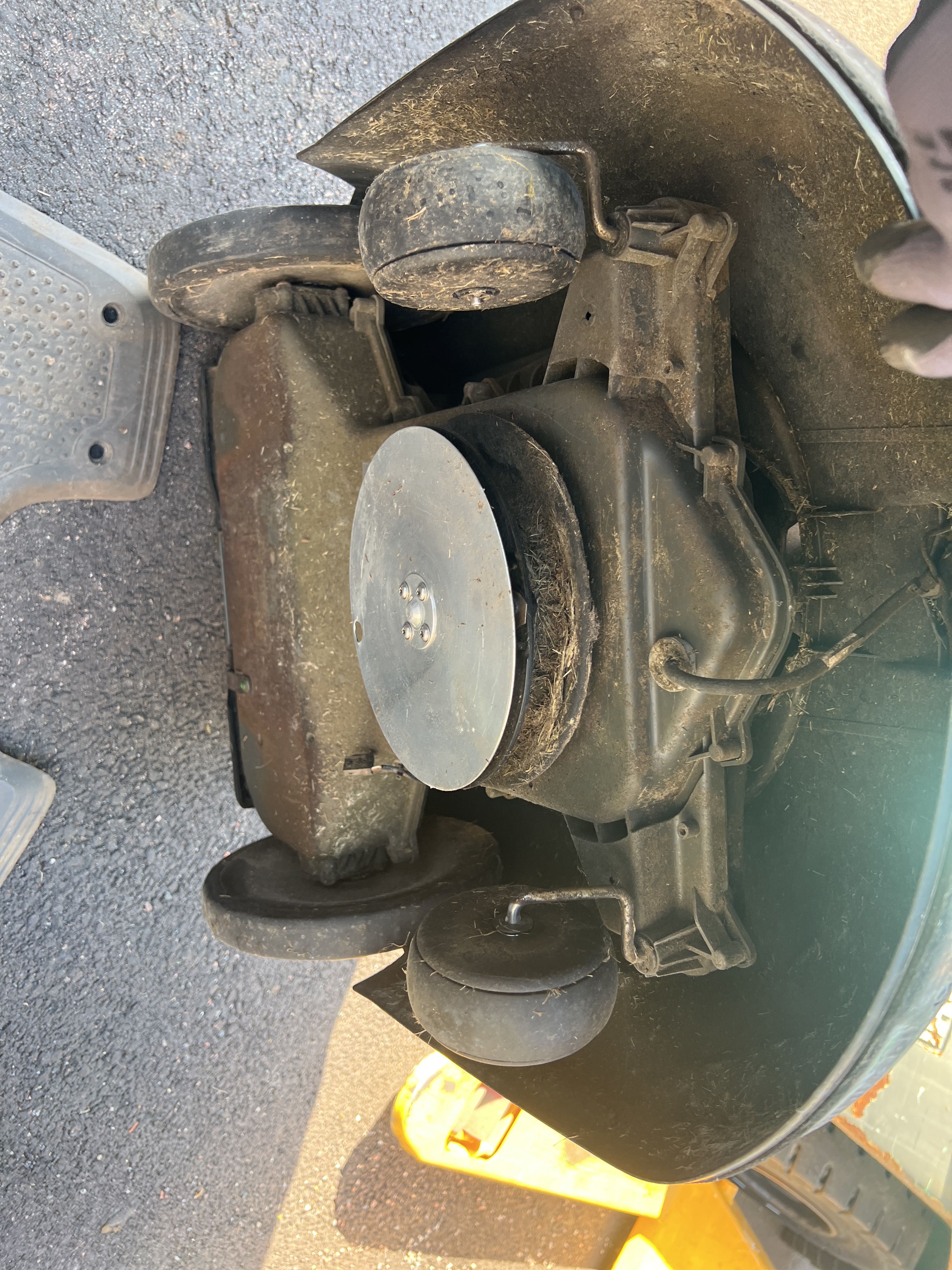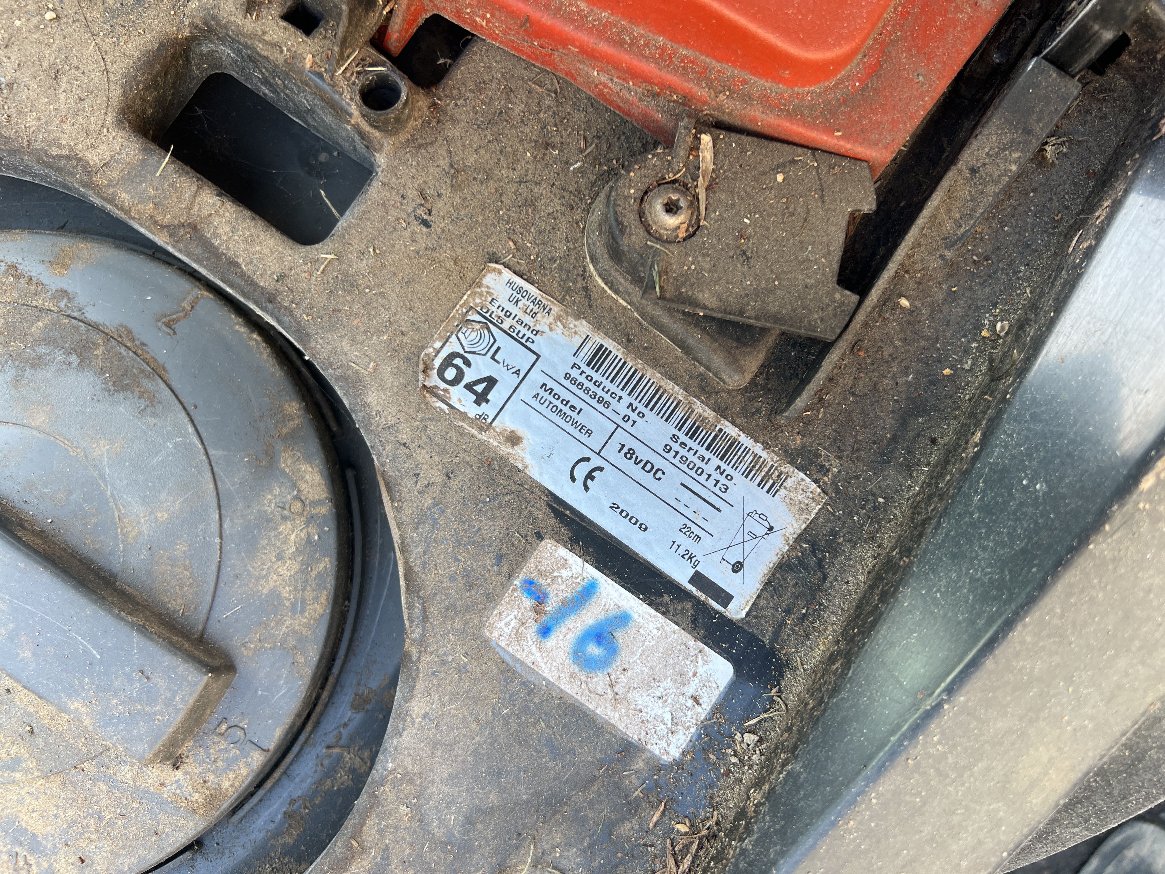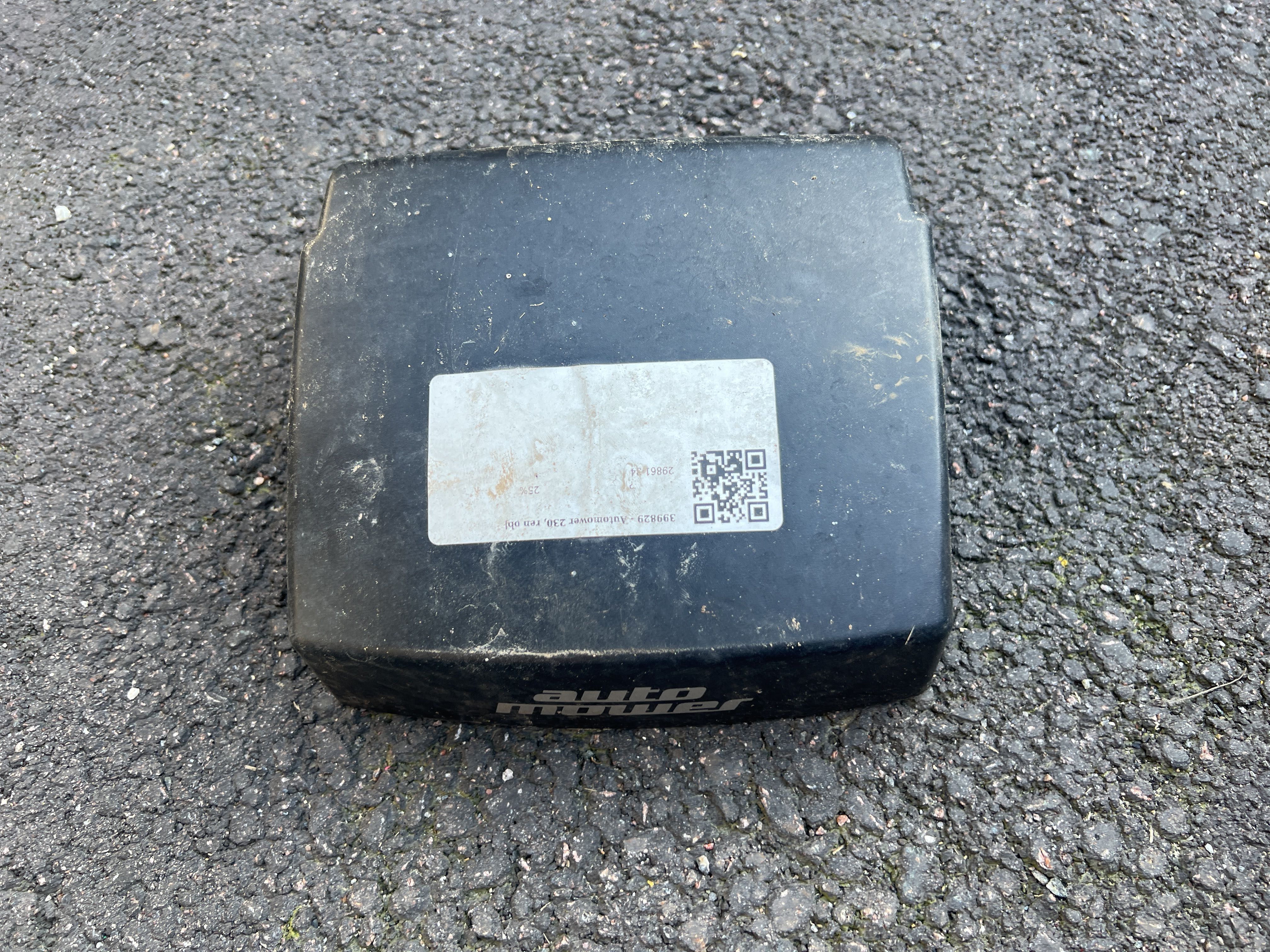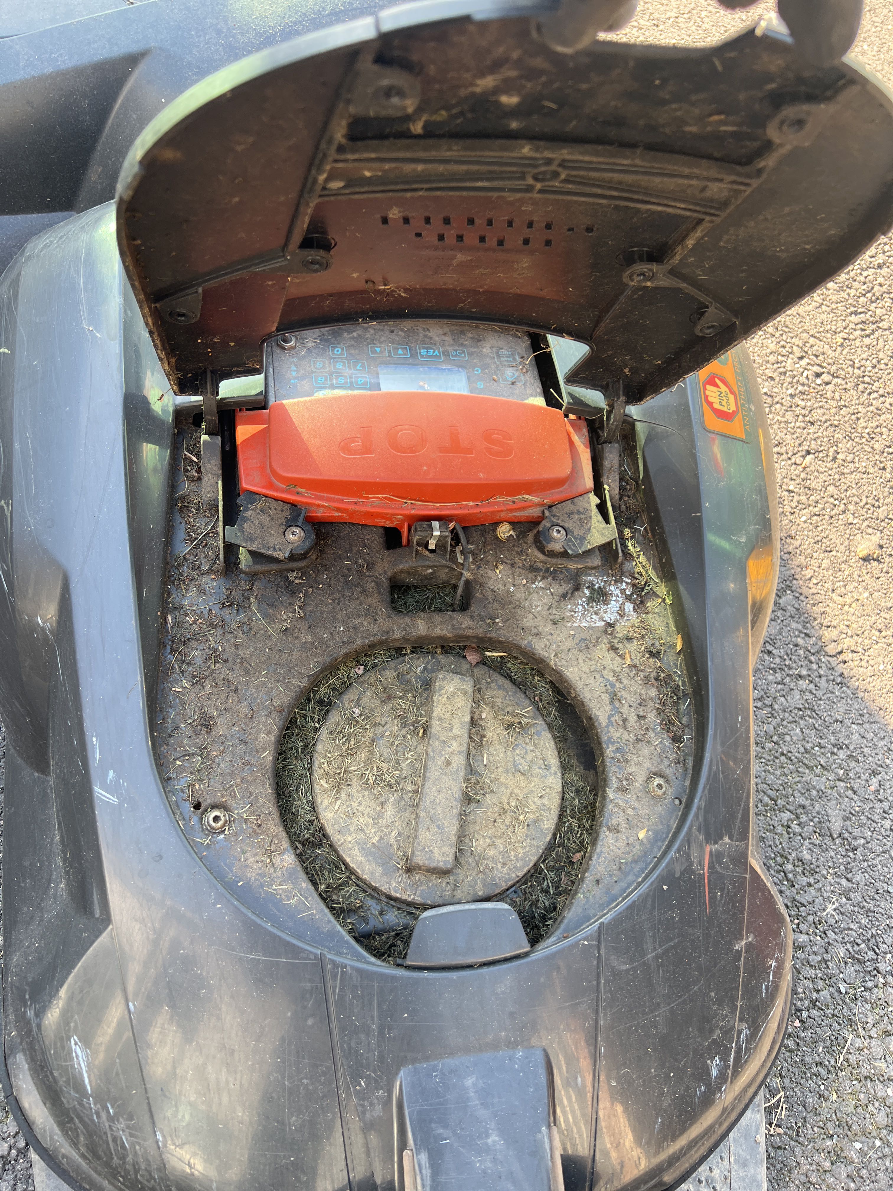 - Robotic lawnmower in need of repair.