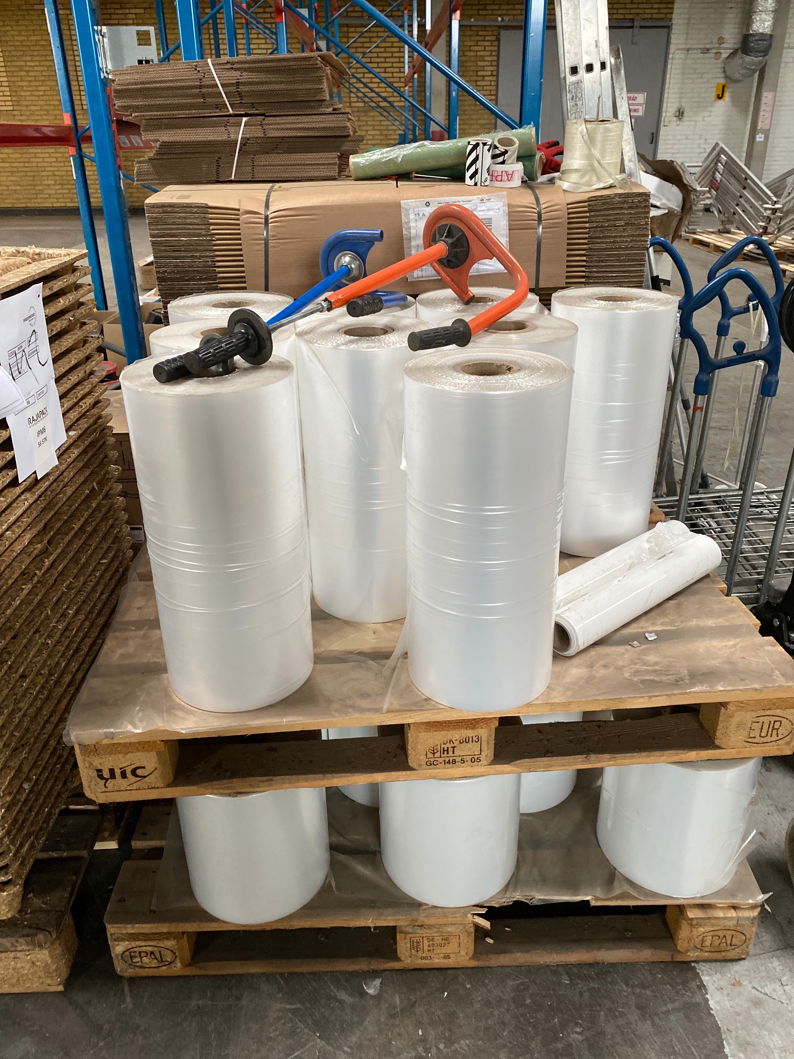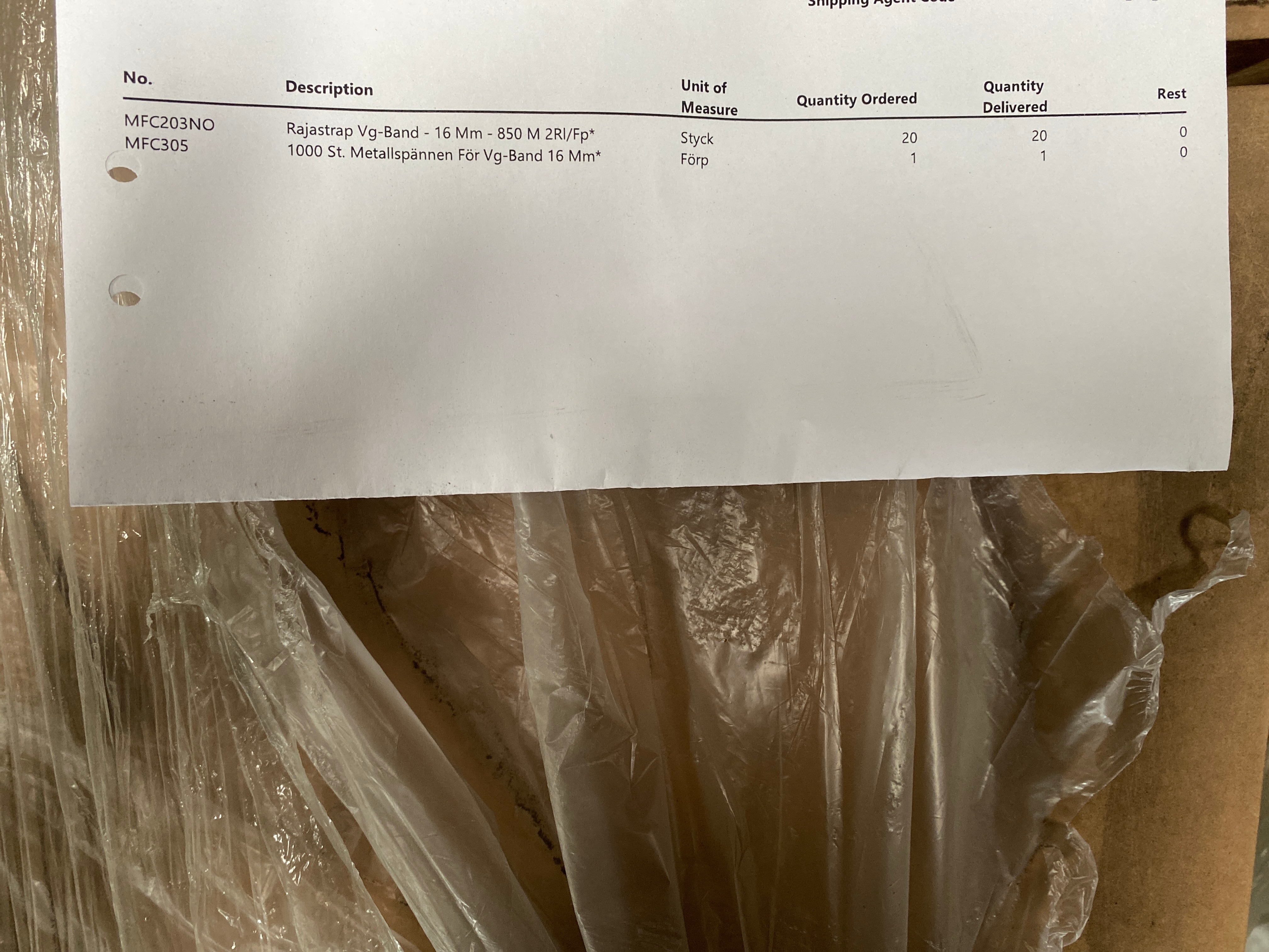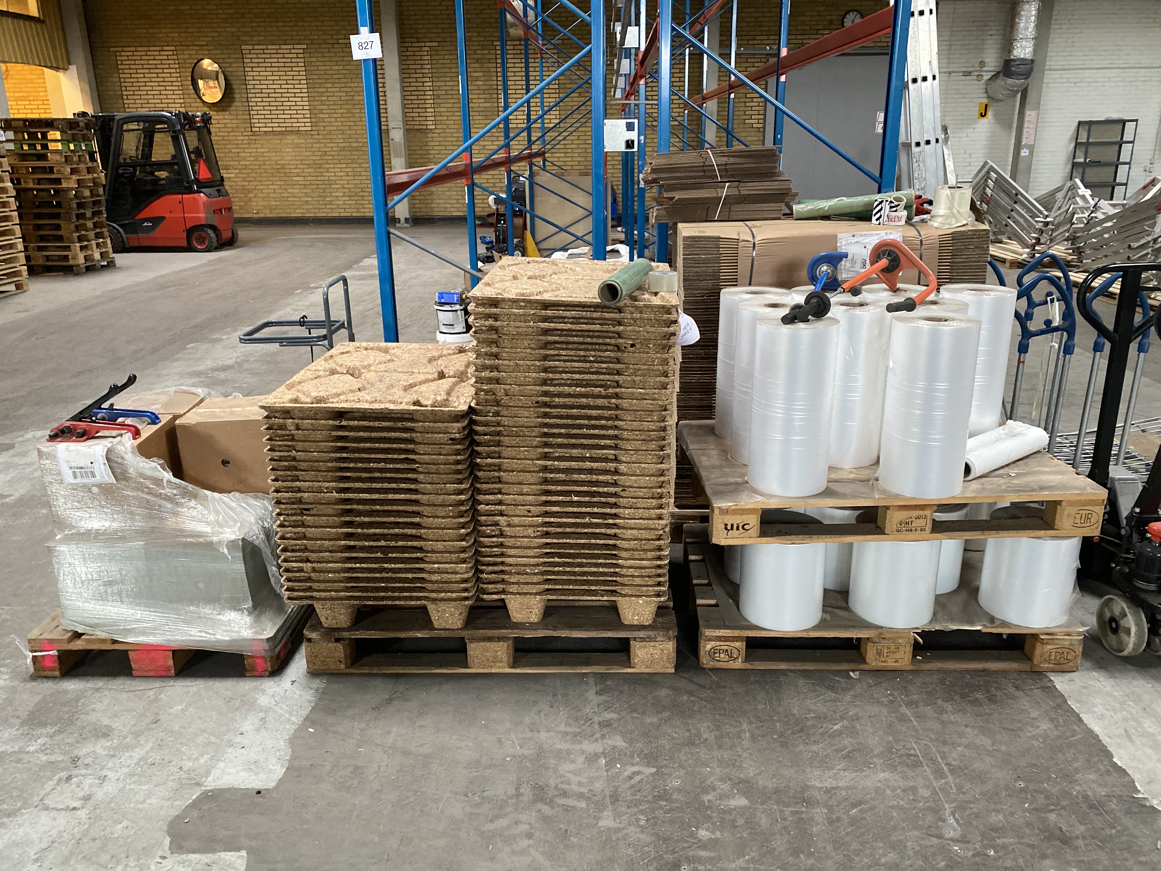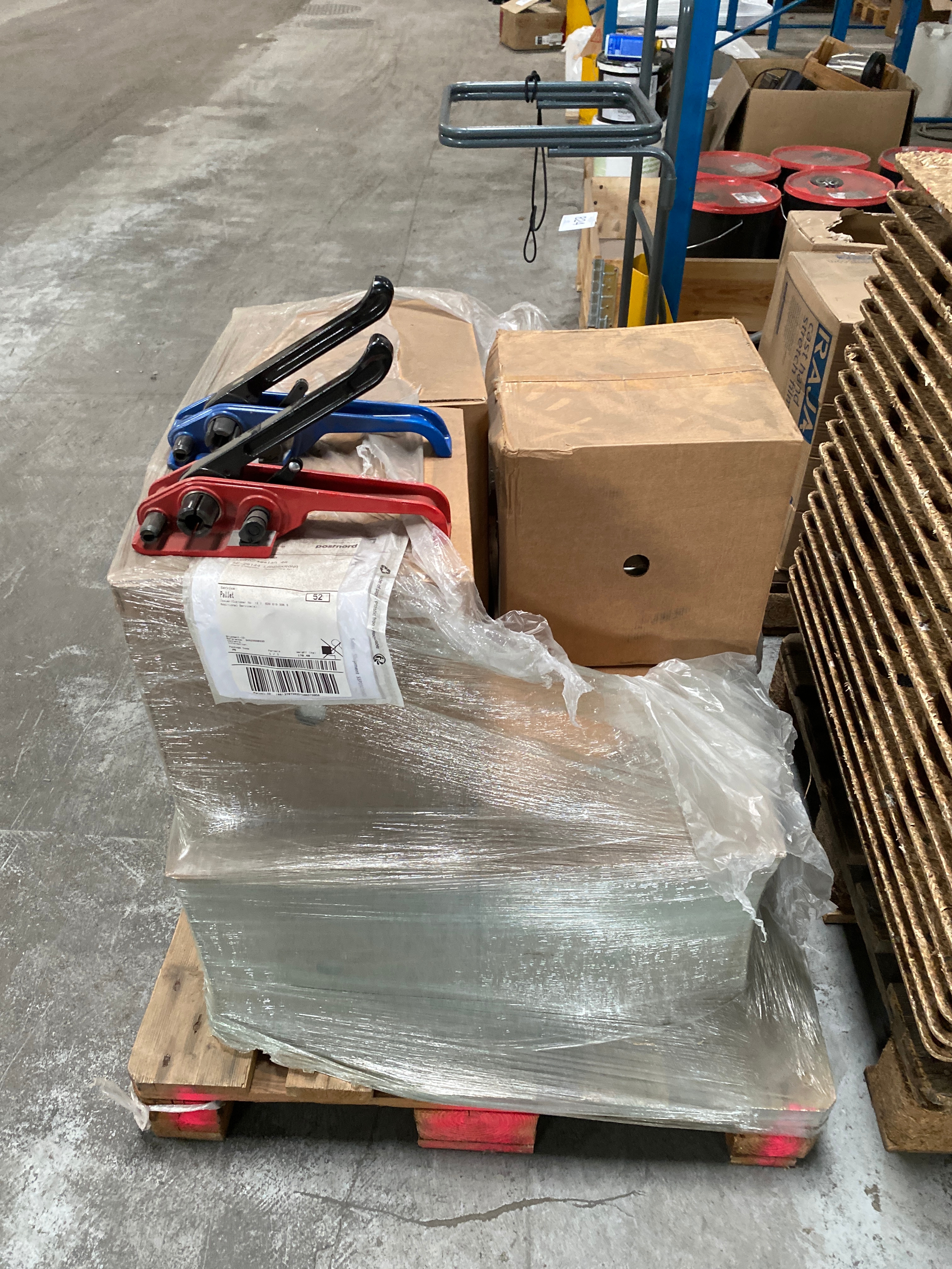 - Various packing materials and packaging tools, including plastic pallets, stretch film, VG straps, metal buckles and manual strap tensioners.