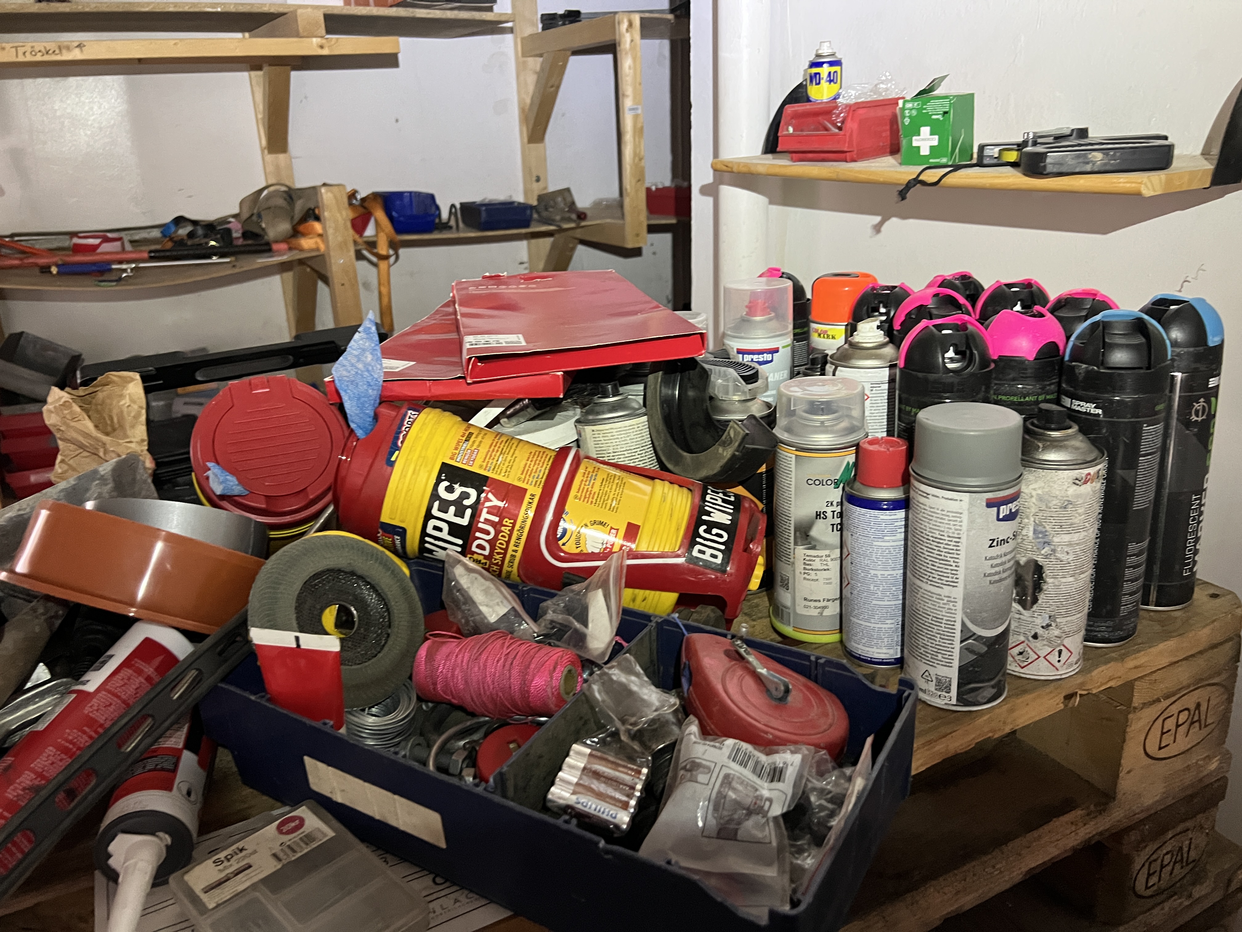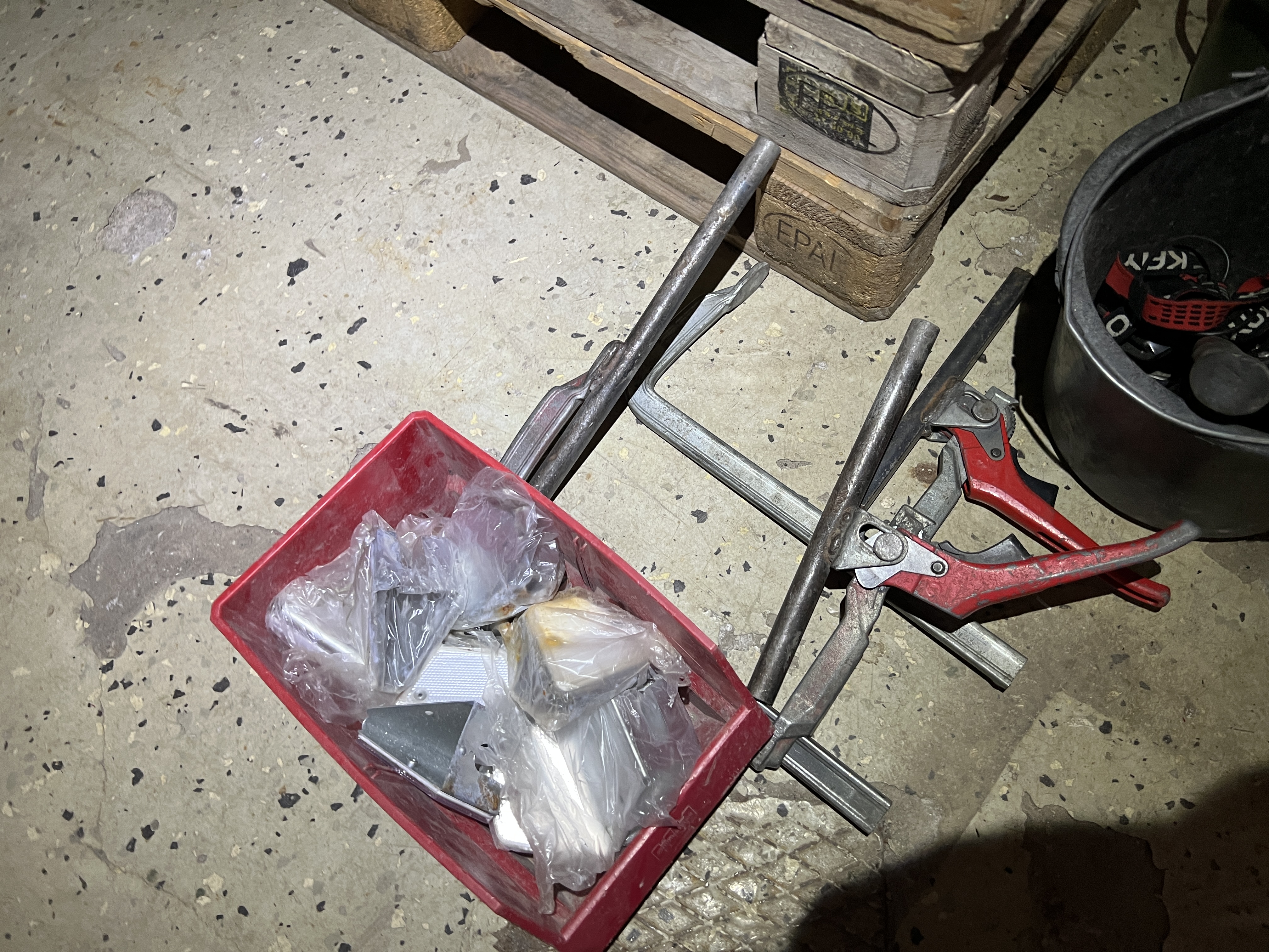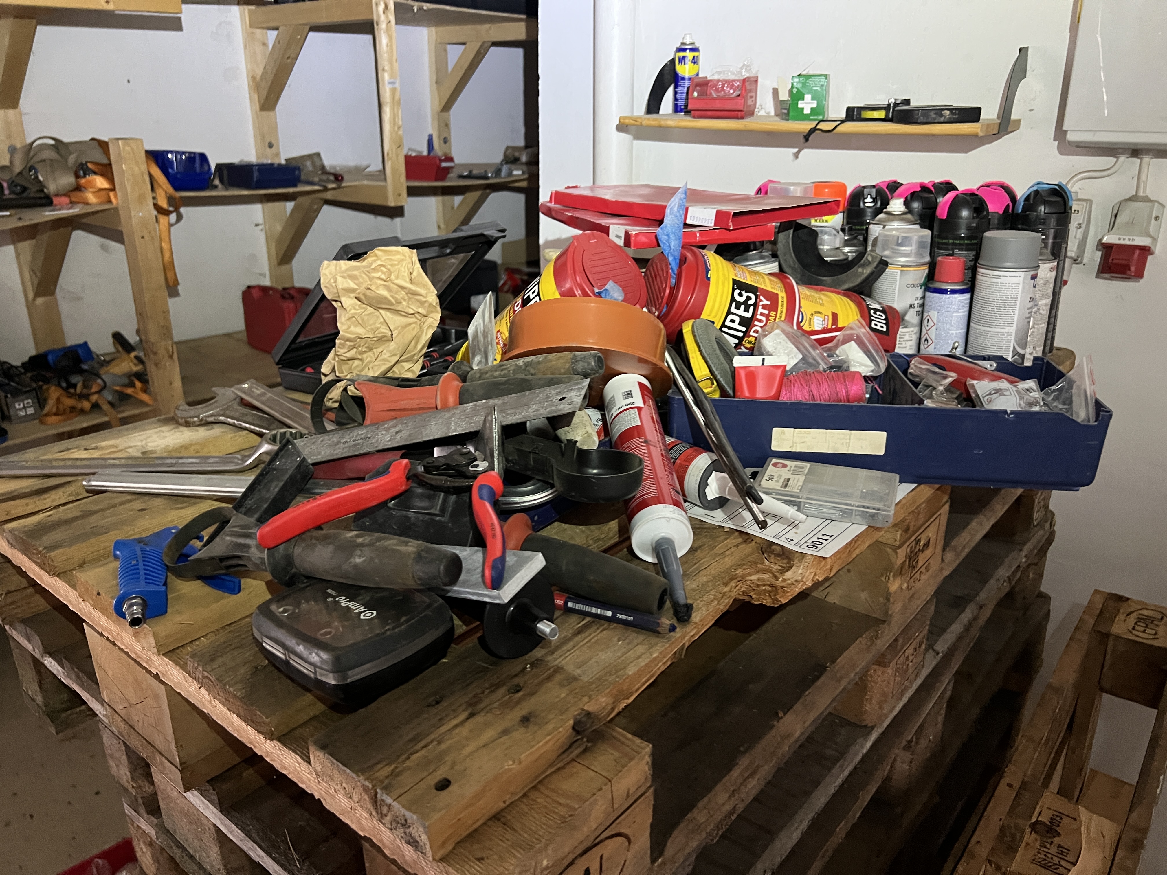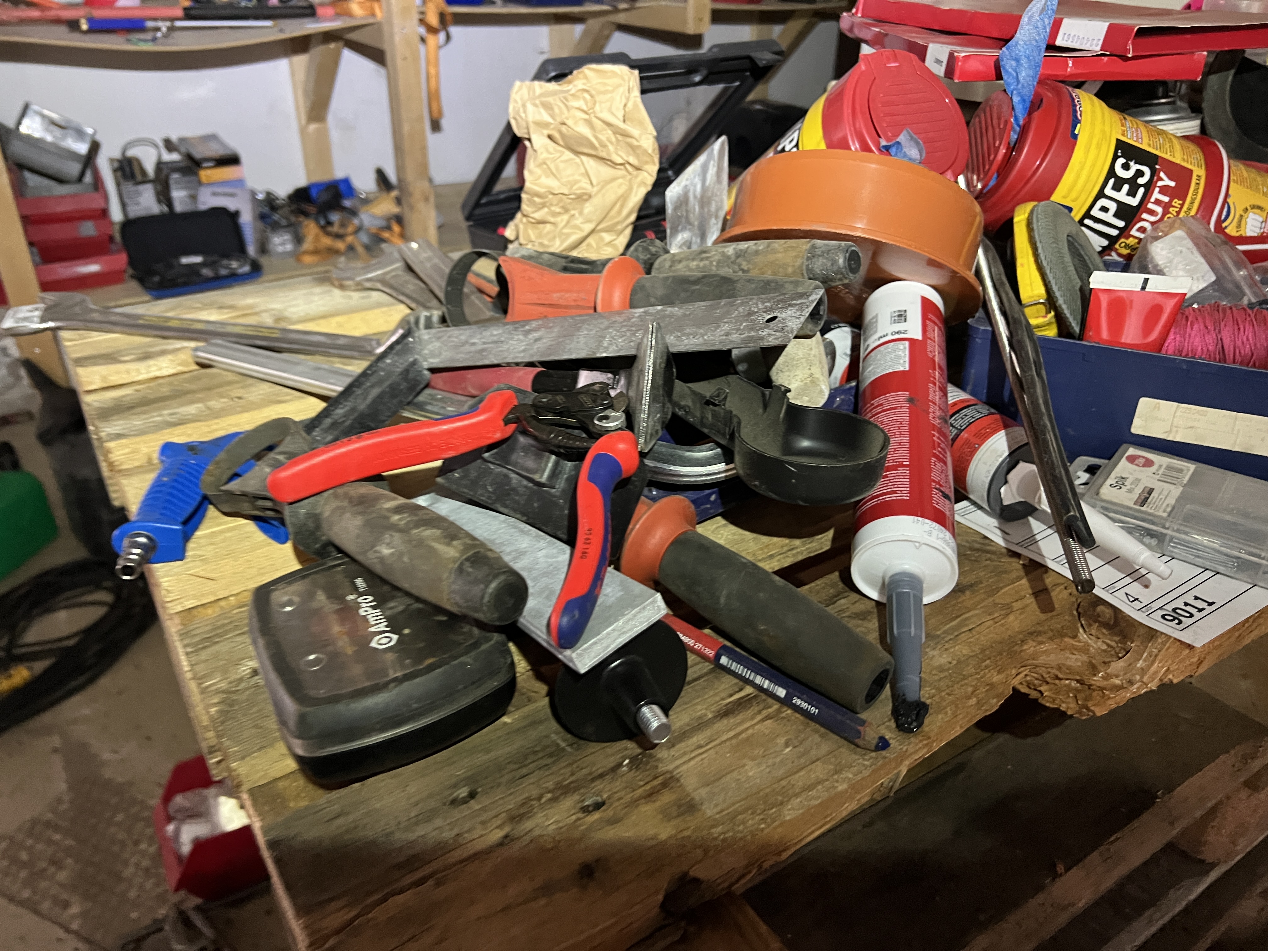 9 pallets and various hand tools
