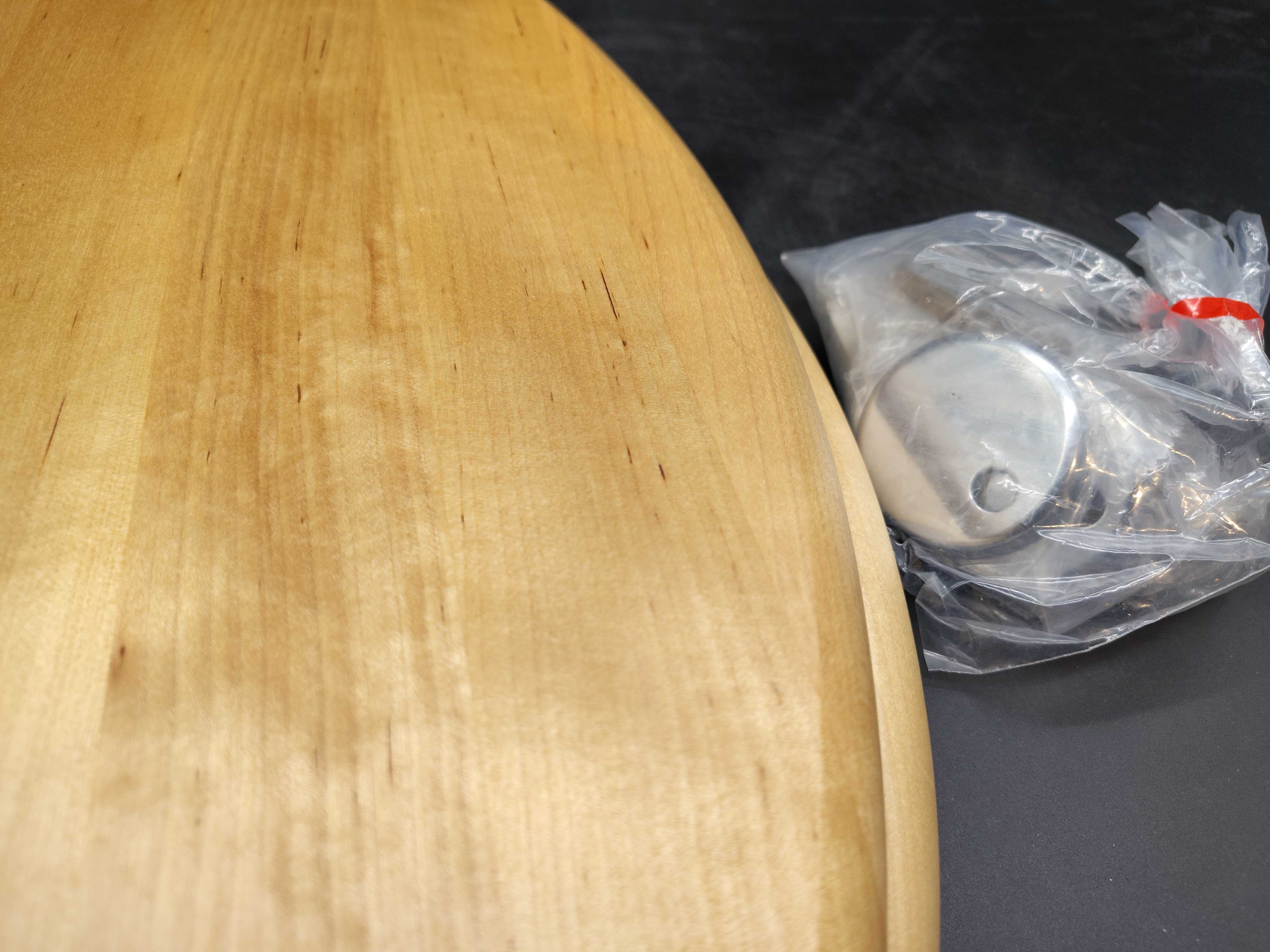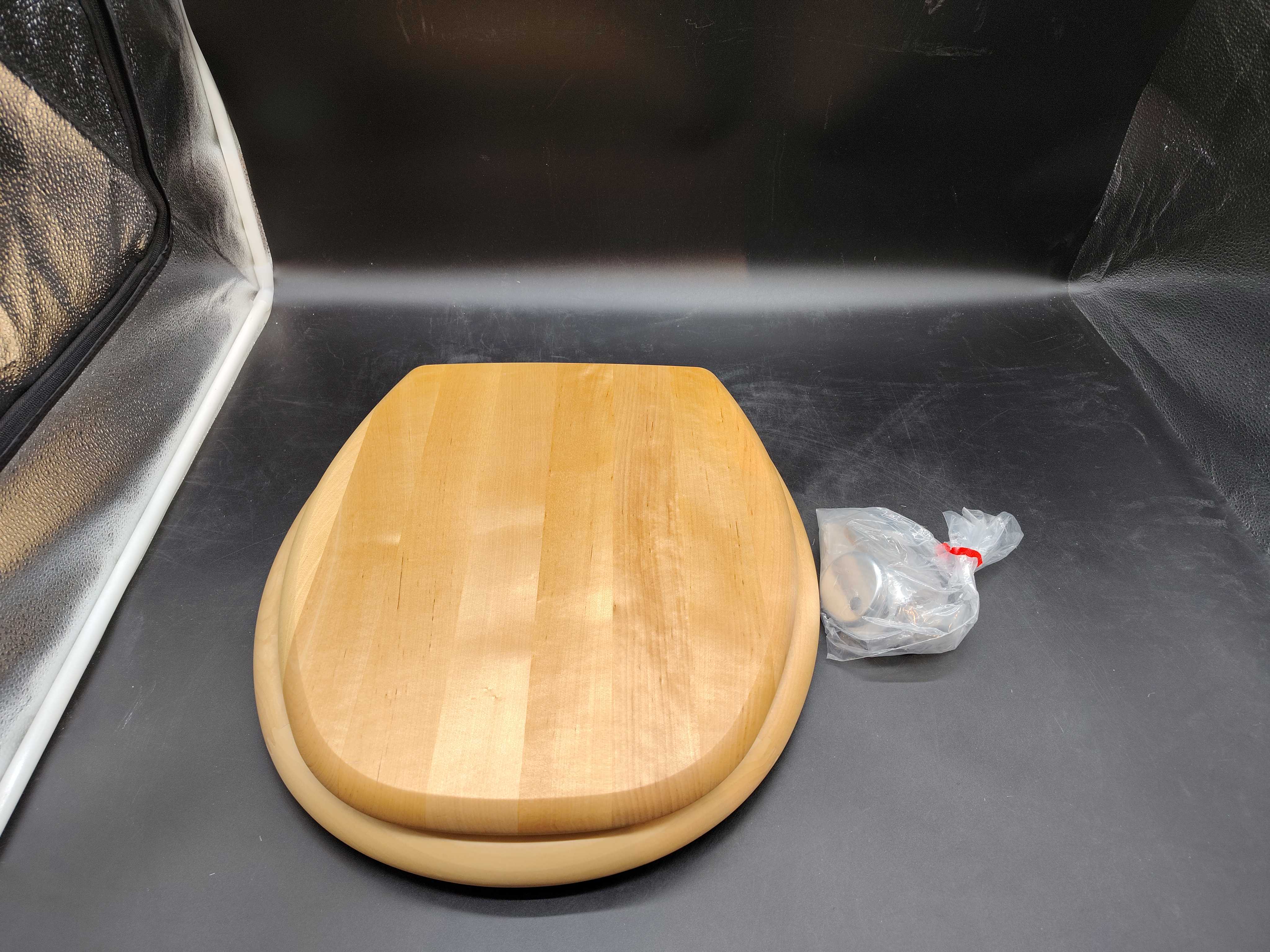 Wooden seat in a light wood finish, shaped with rounded edges and a flat surface. Supplied with mounting hardware in a plastic bag. Fits standard toilets with a classic lid format.