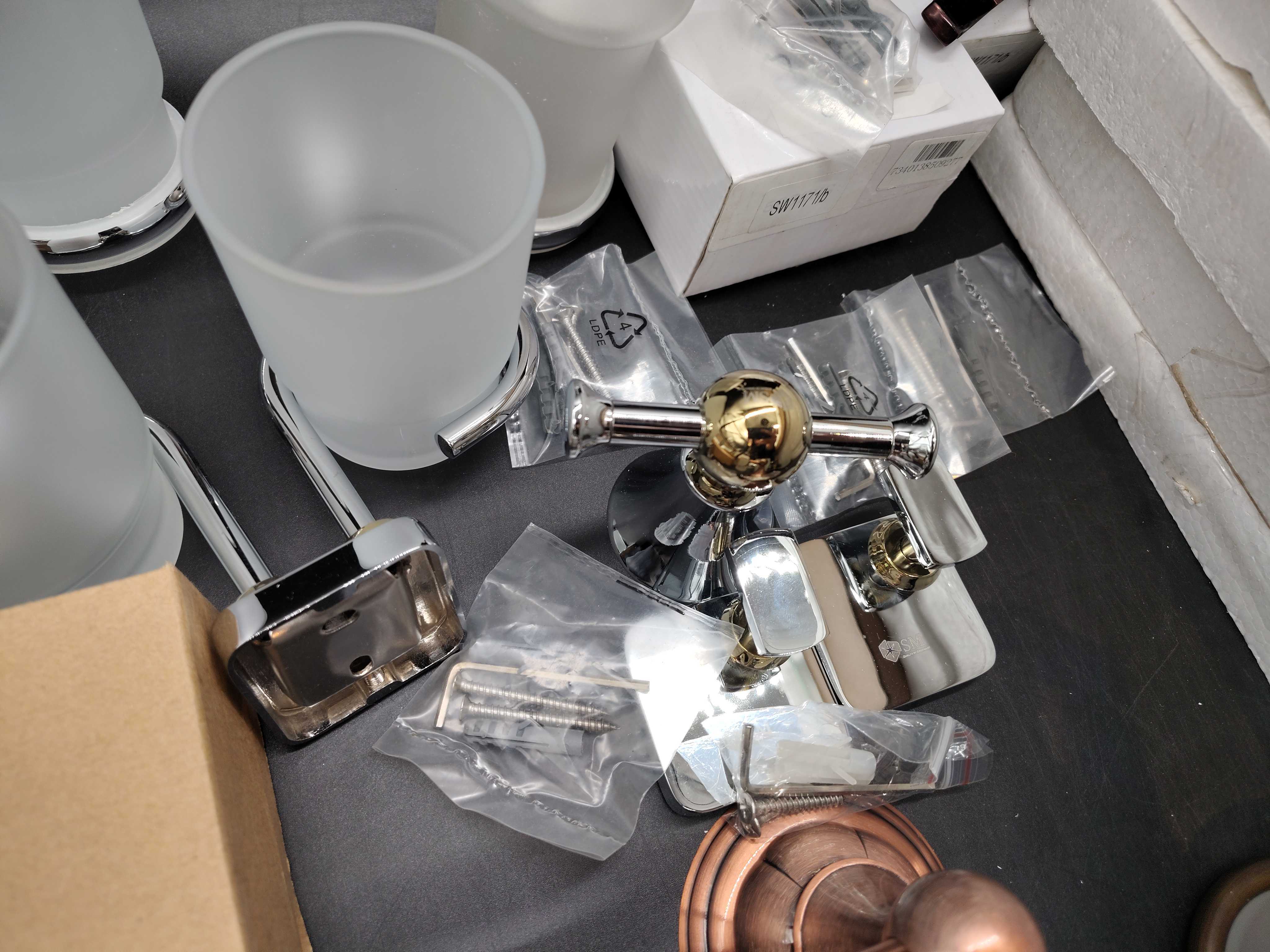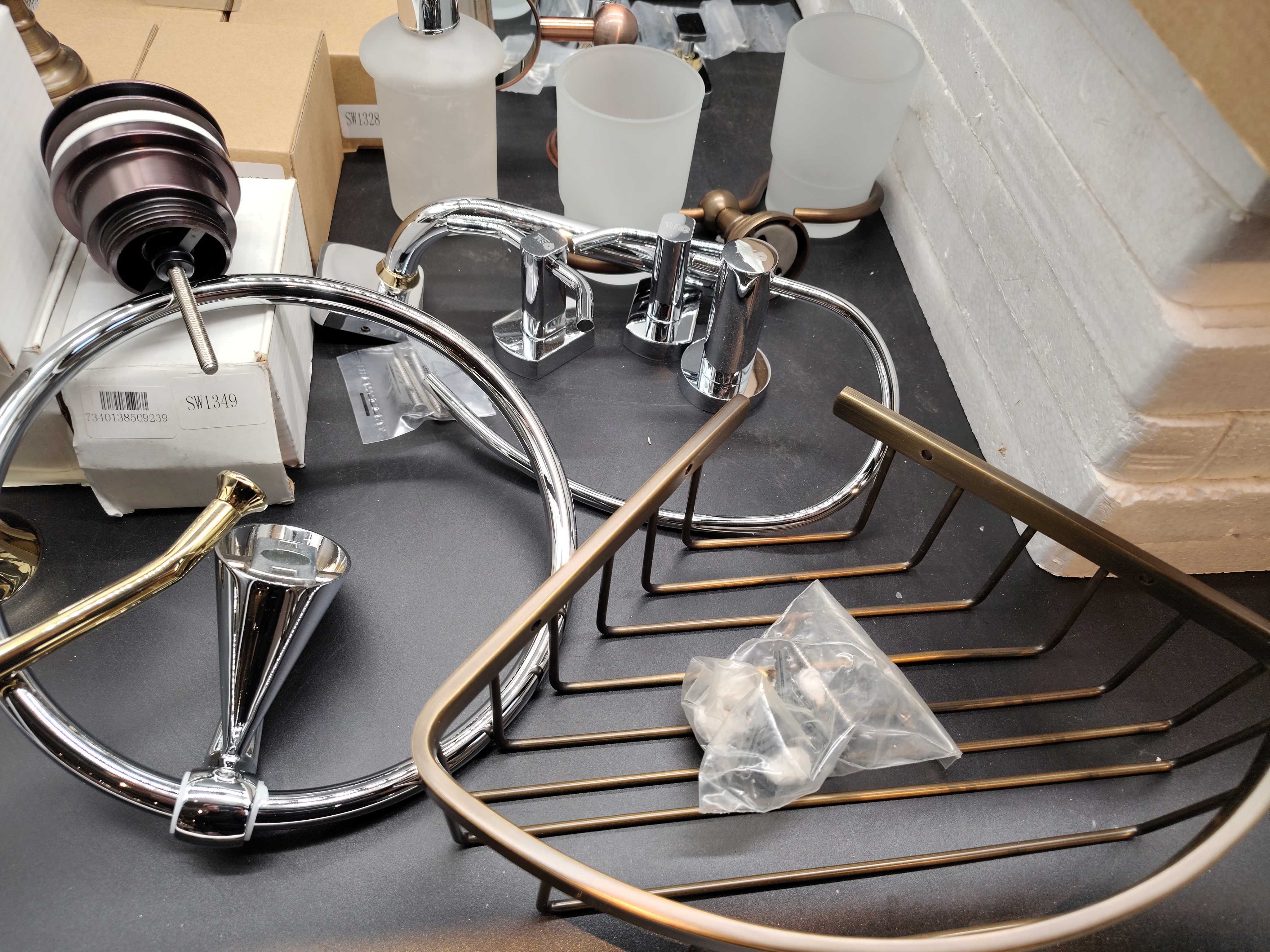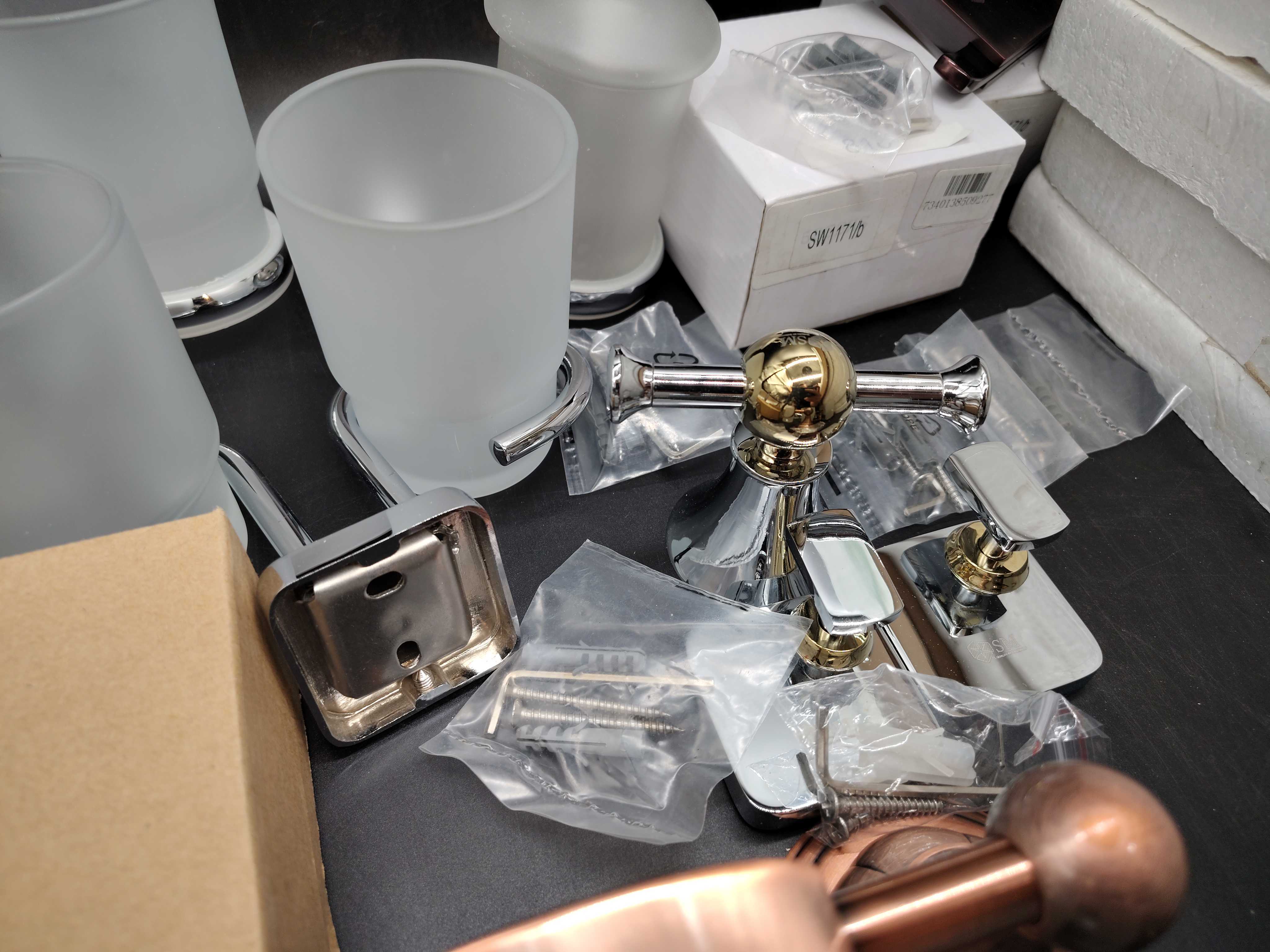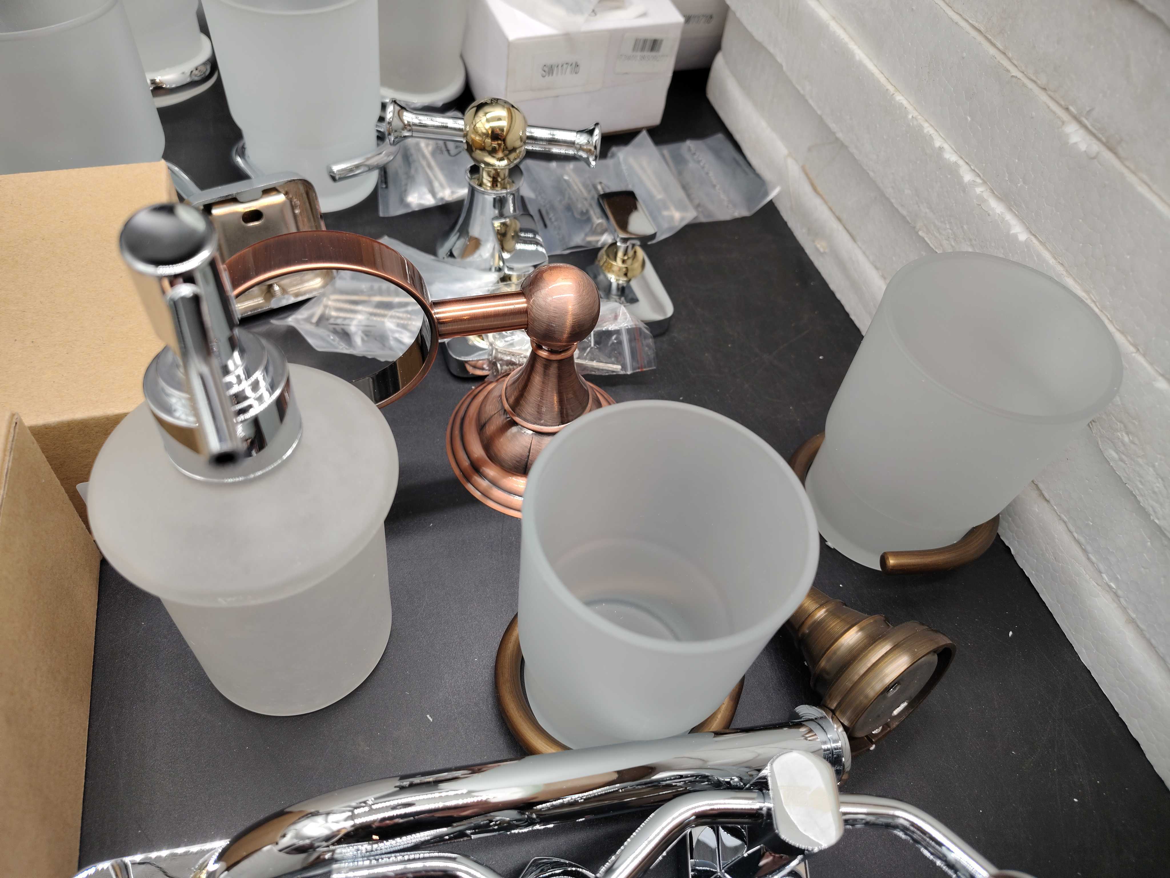 Assorted bathroom accessories with different finishes and models. Includes holders, soap dispensers, glasses, shelves and spare parts, etc.