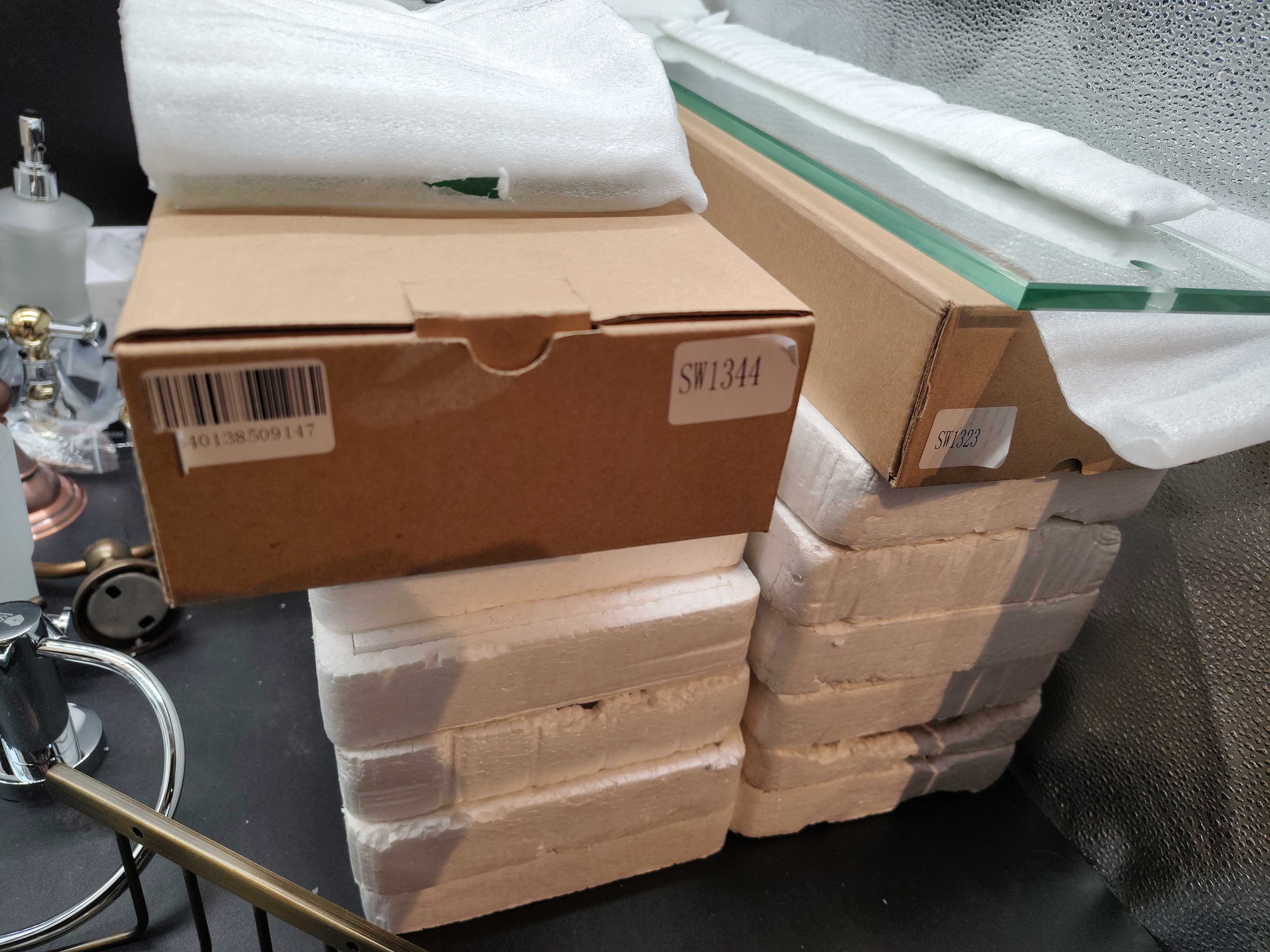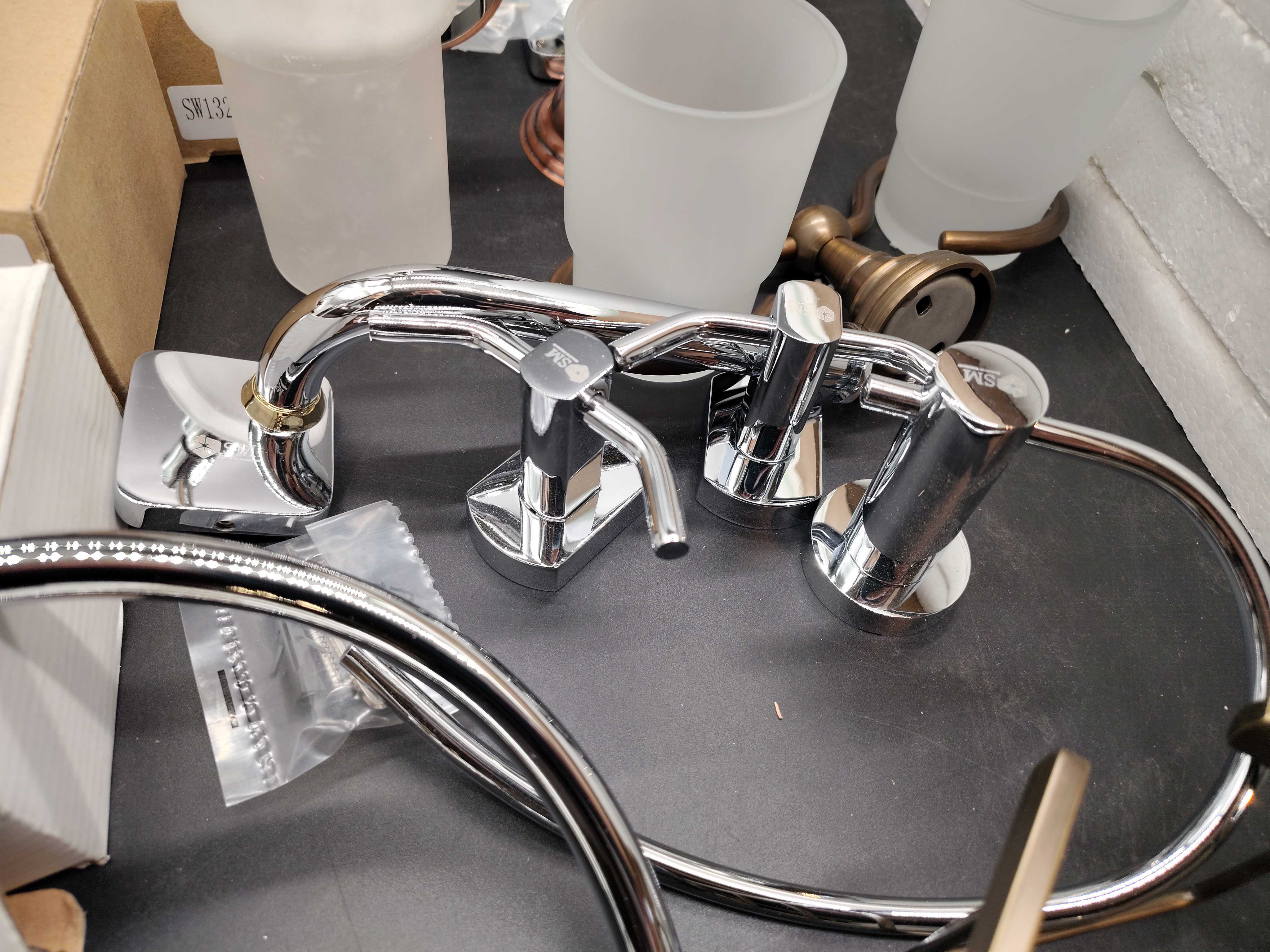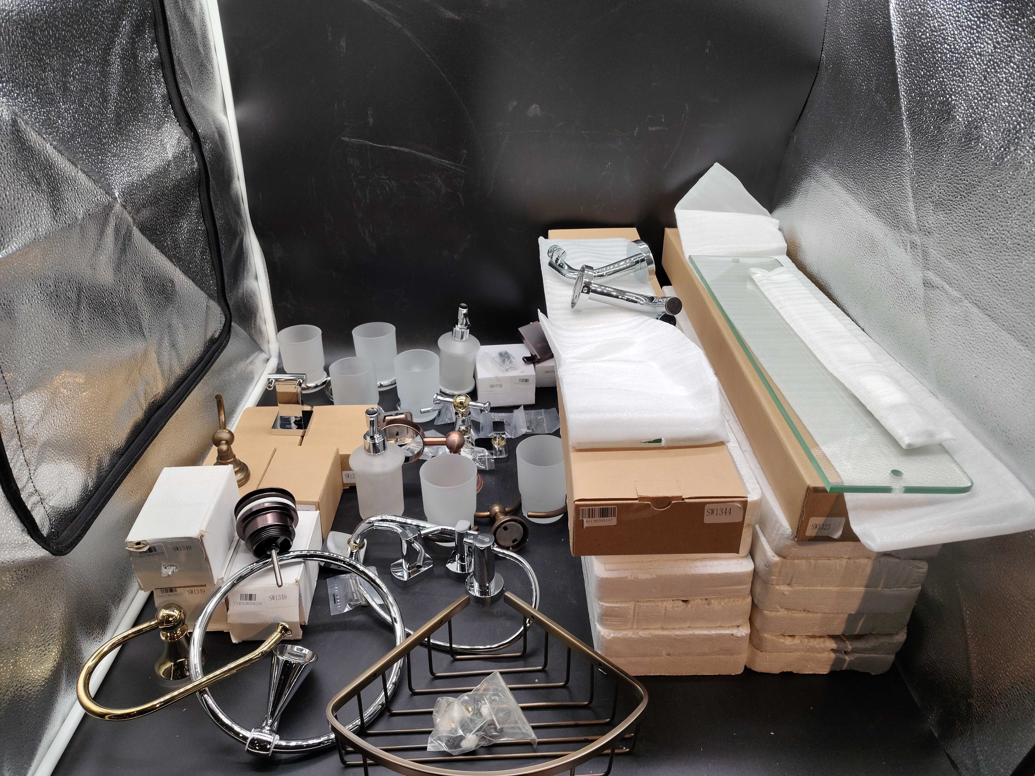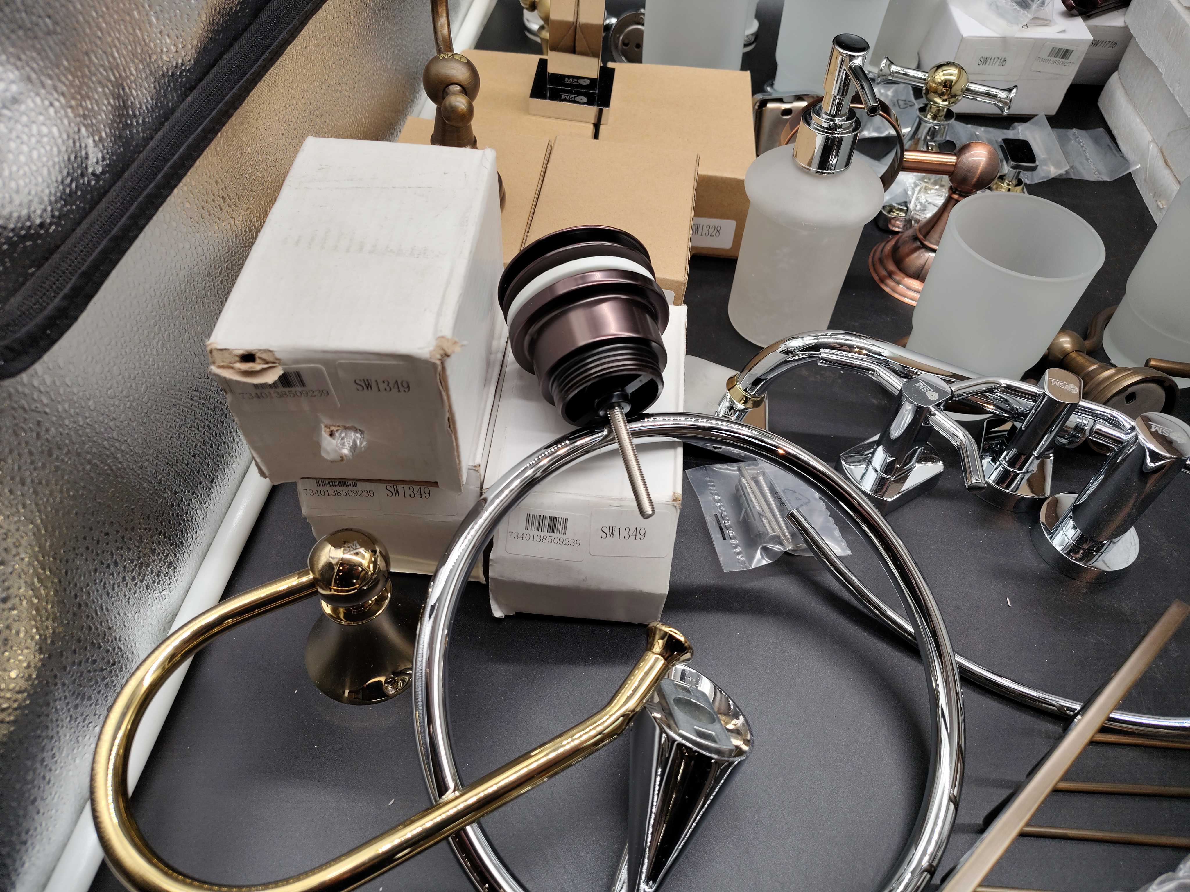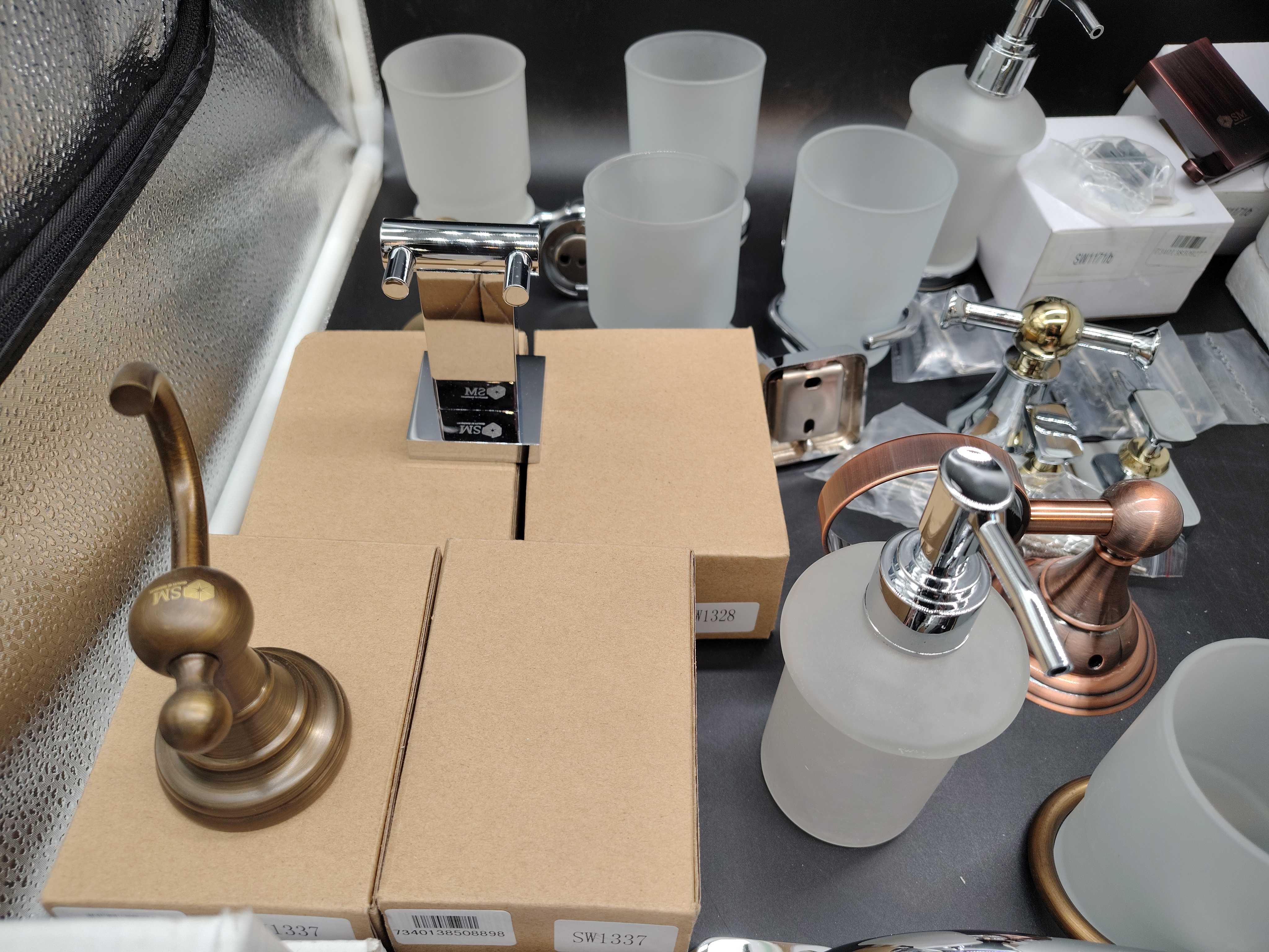 Assorted bathroom accessories with different finishes and models. Includes holders, soap dispensers, glasses, shelves and spare parts, etc.