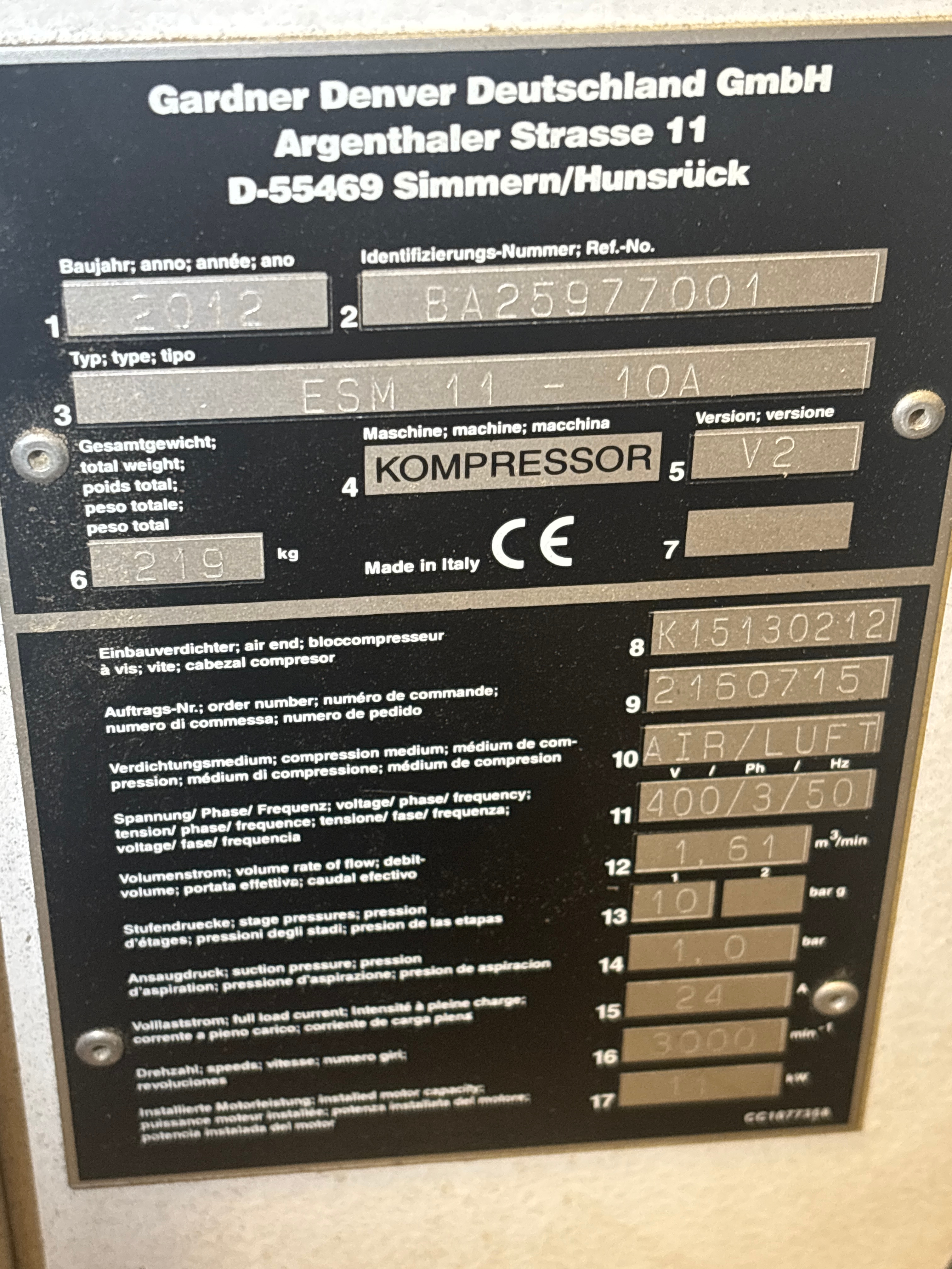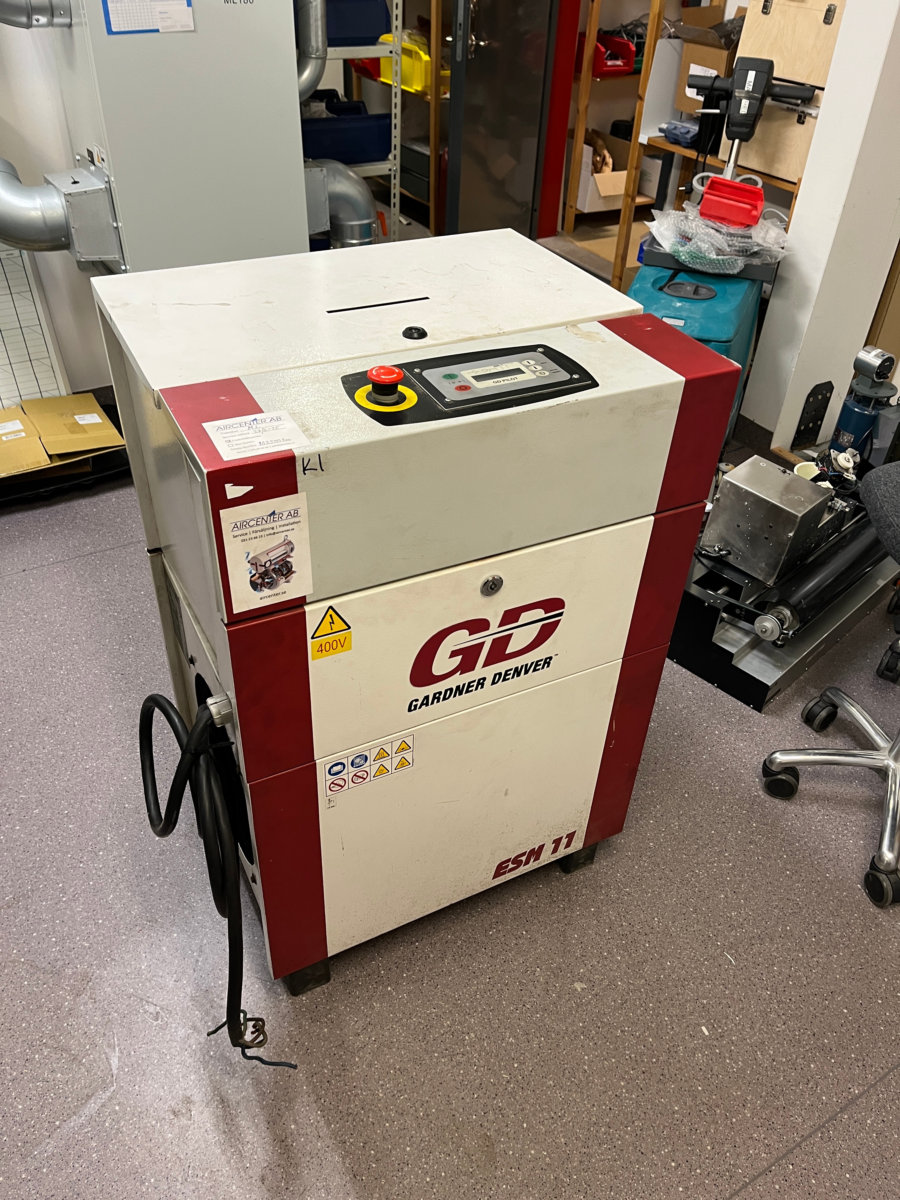 Industrial compressor from Gardner Denver, model ESM 11 , manufactured in 2012. The compressor has run just over 100,000 hours but has been serviced regularly every three months . The compressor reportedly worked flawlessly when dismantled .