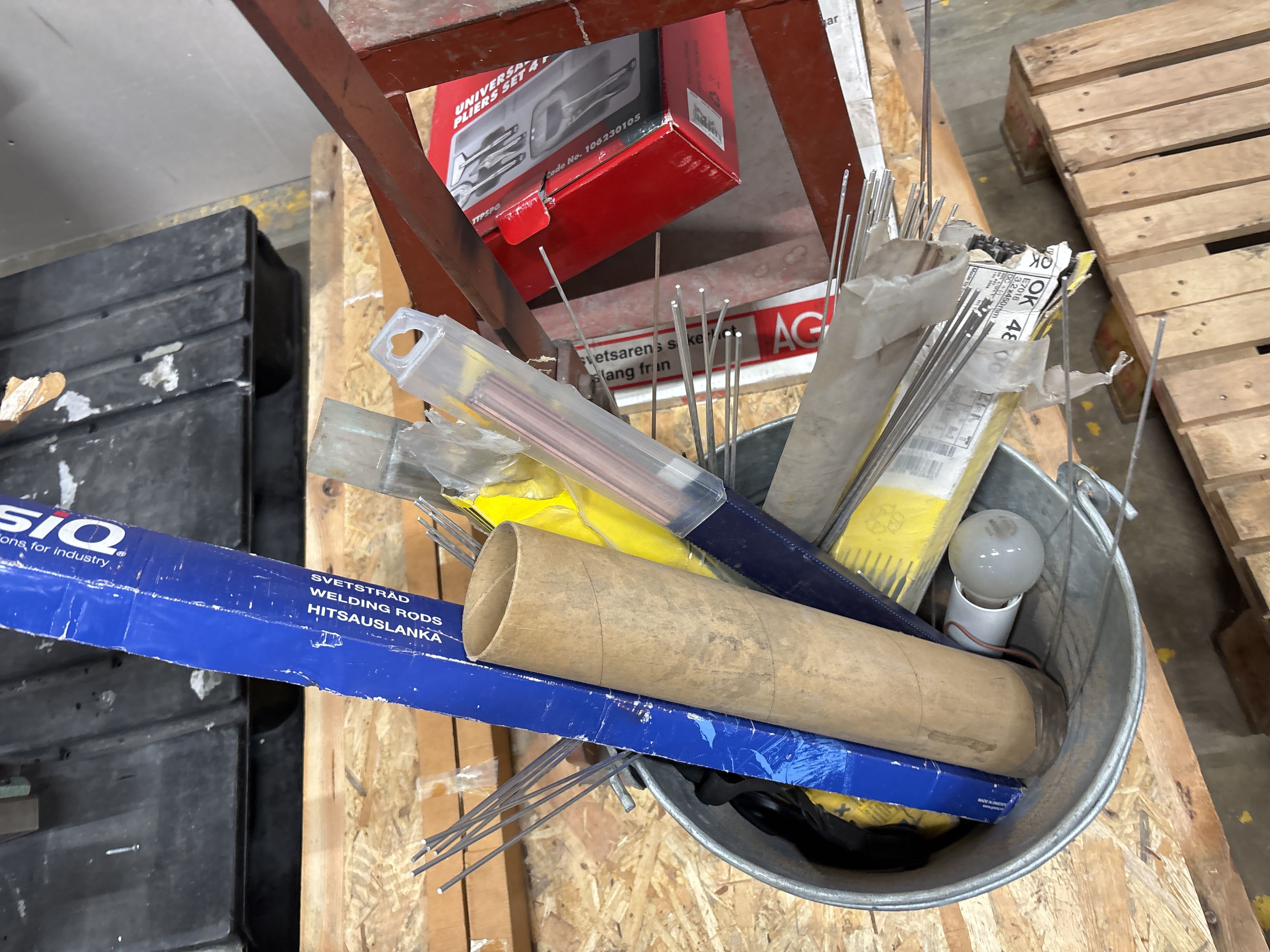 Lever shears with stand and bucket with welding electrodes