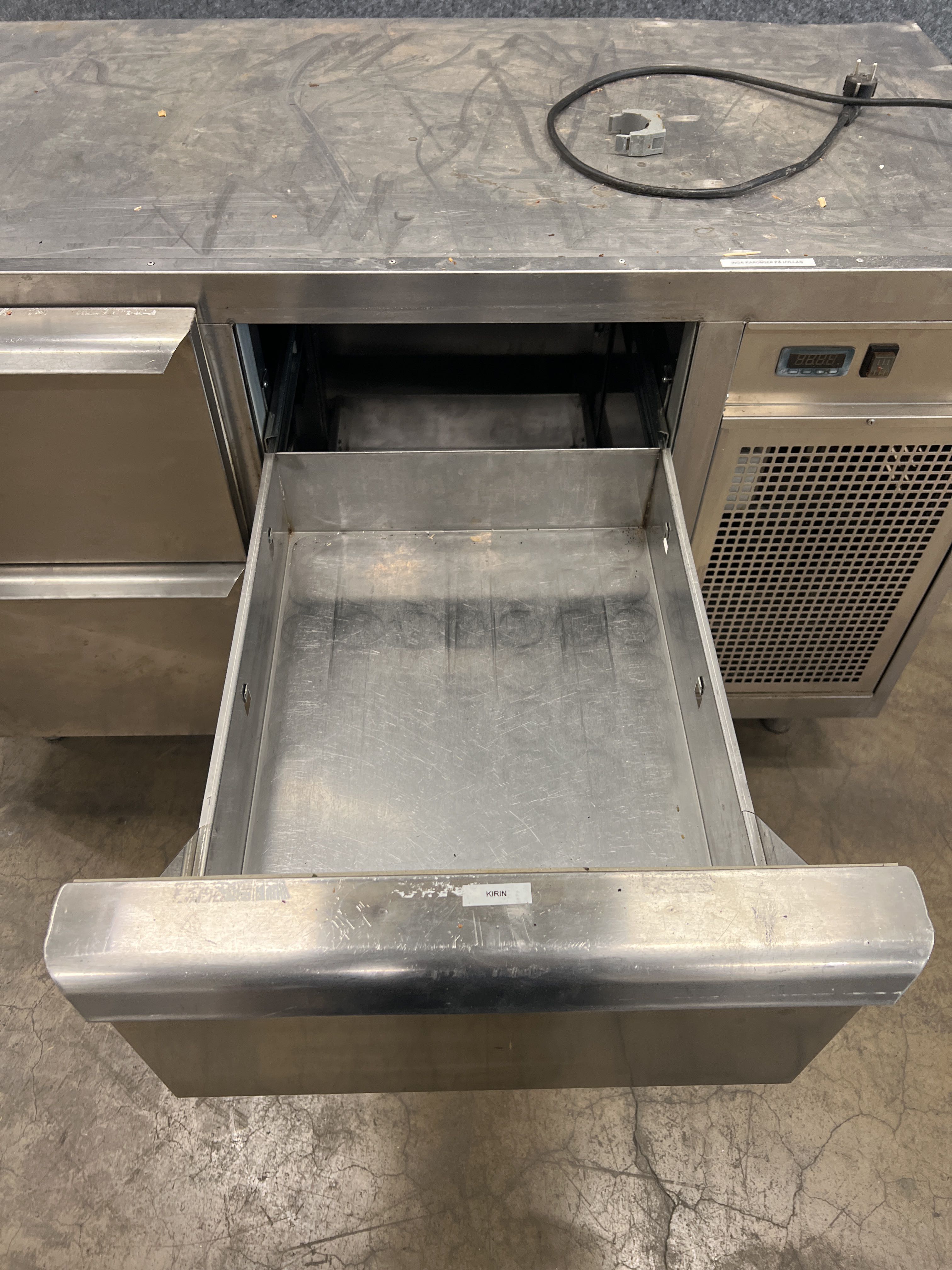 Stainless steel bar counter with four drawers.