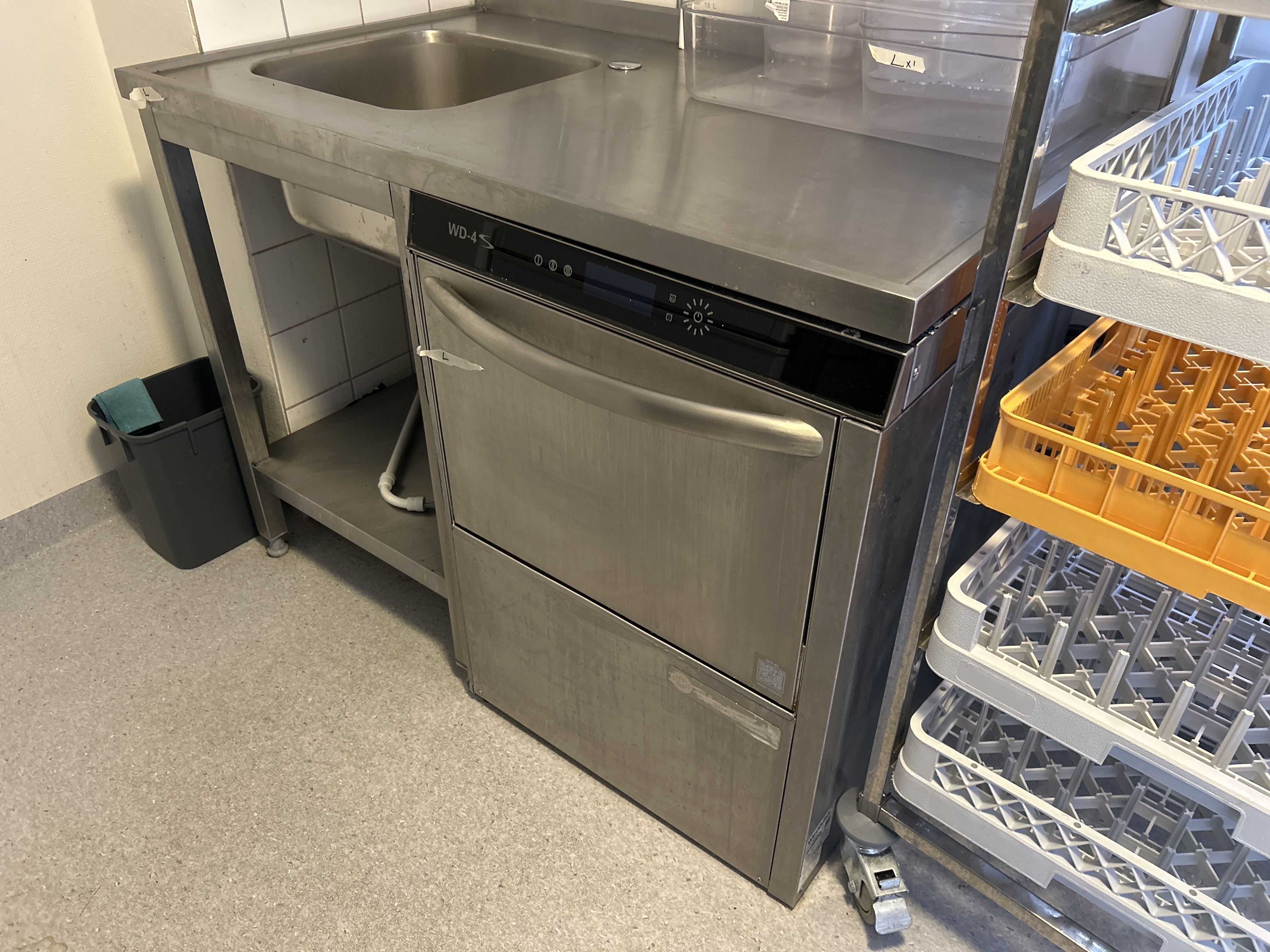 • Dishwashing line consisting of a dishwasher with associated sink, separate stainless steel worktop and dishwashing trolley with dishwashing baskets.