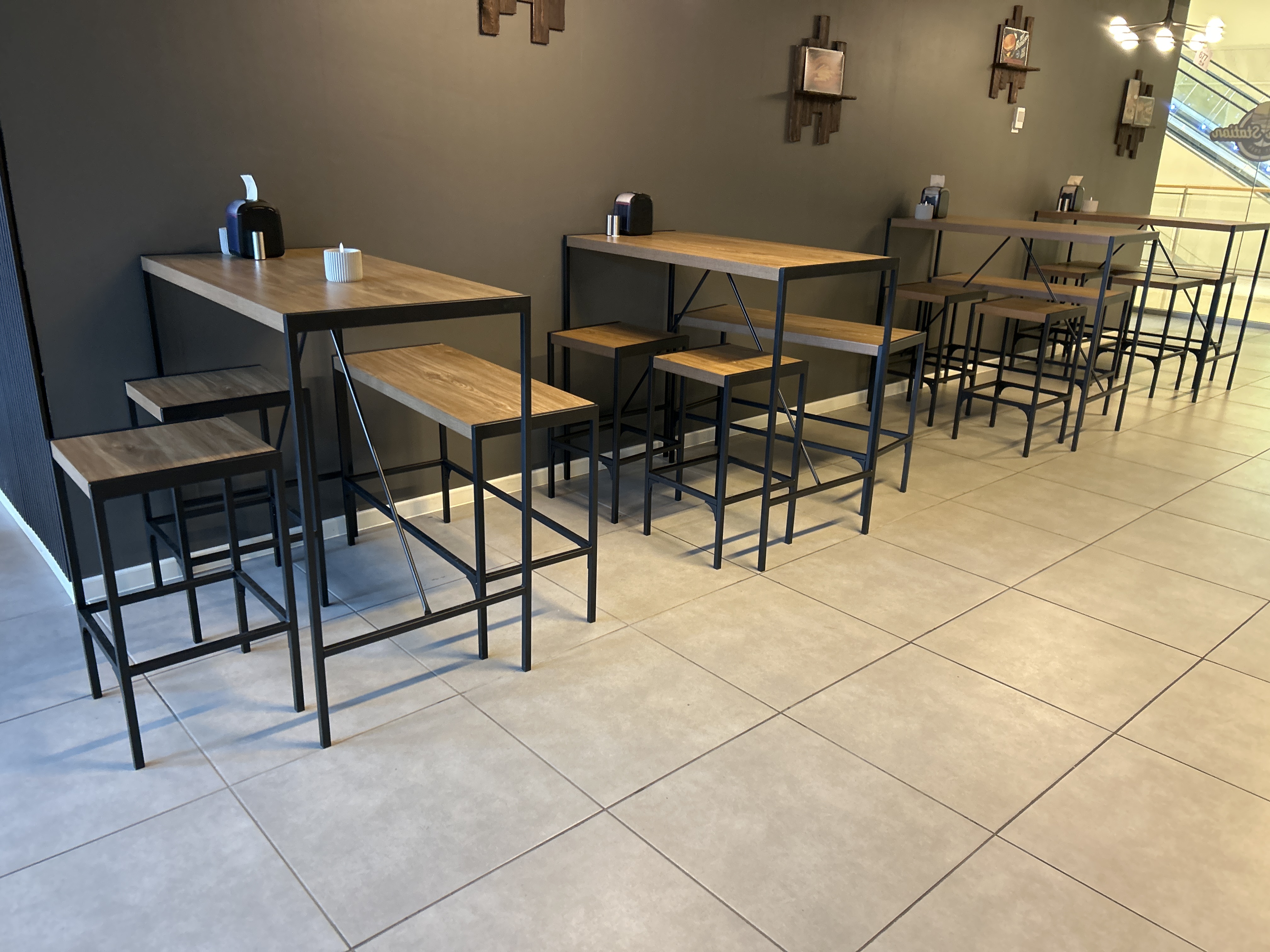 Café/restaurant furniture - 4 tables, 4 benches, 8 stools and 4 wall decorations