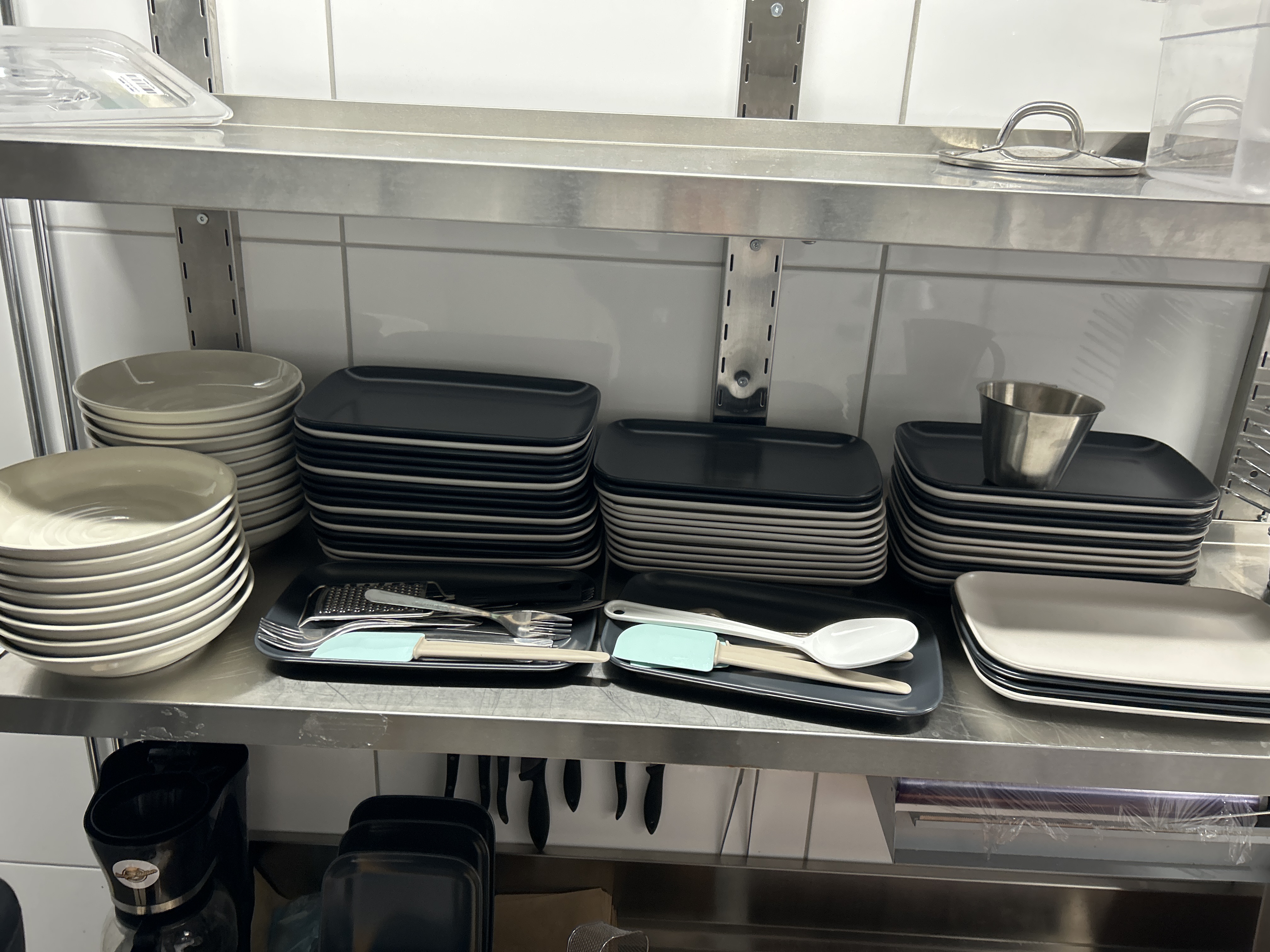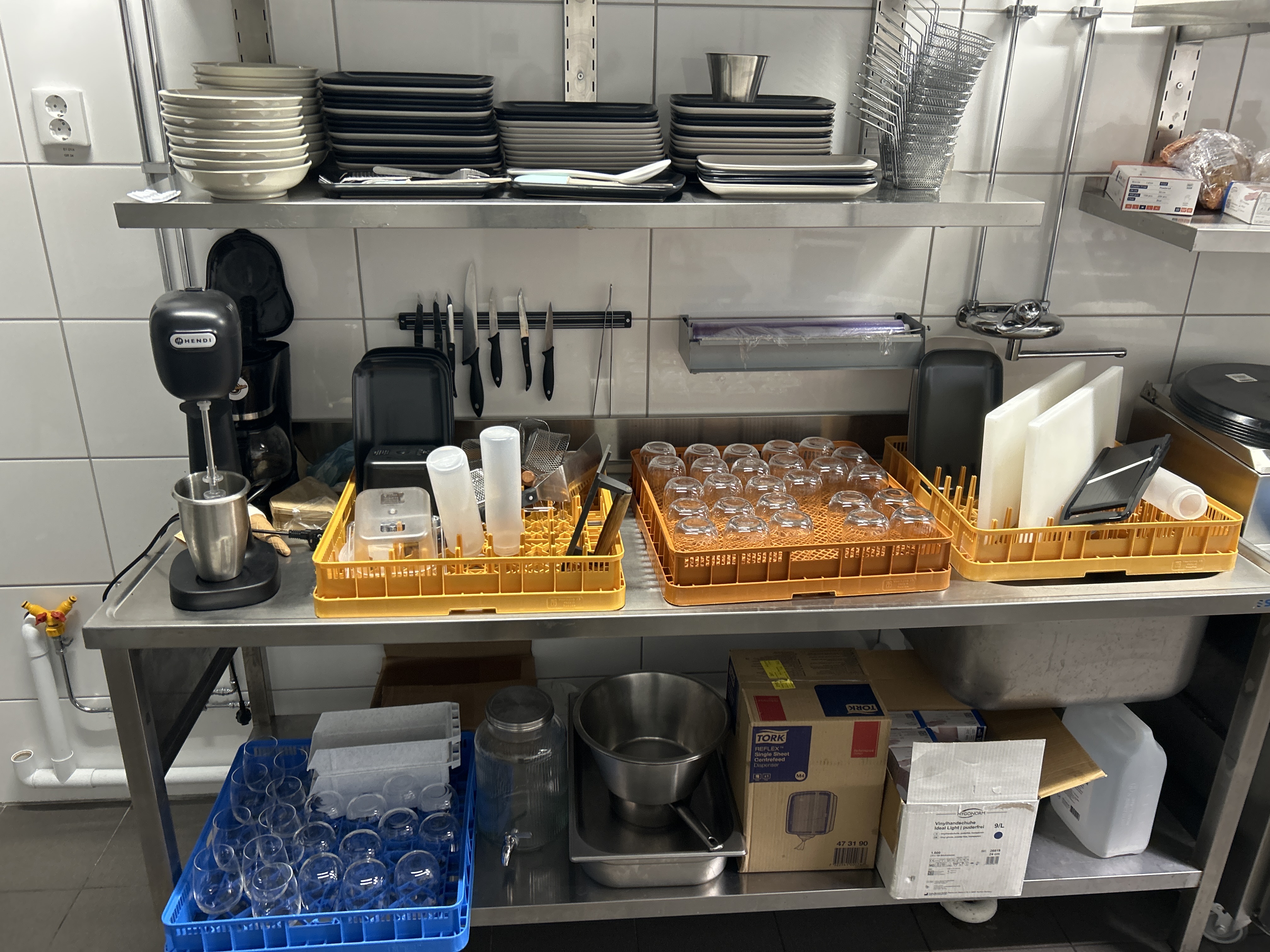 Collection of kitchen equipment - Milkshake machine, glasses, plates, cutlery, etc.
