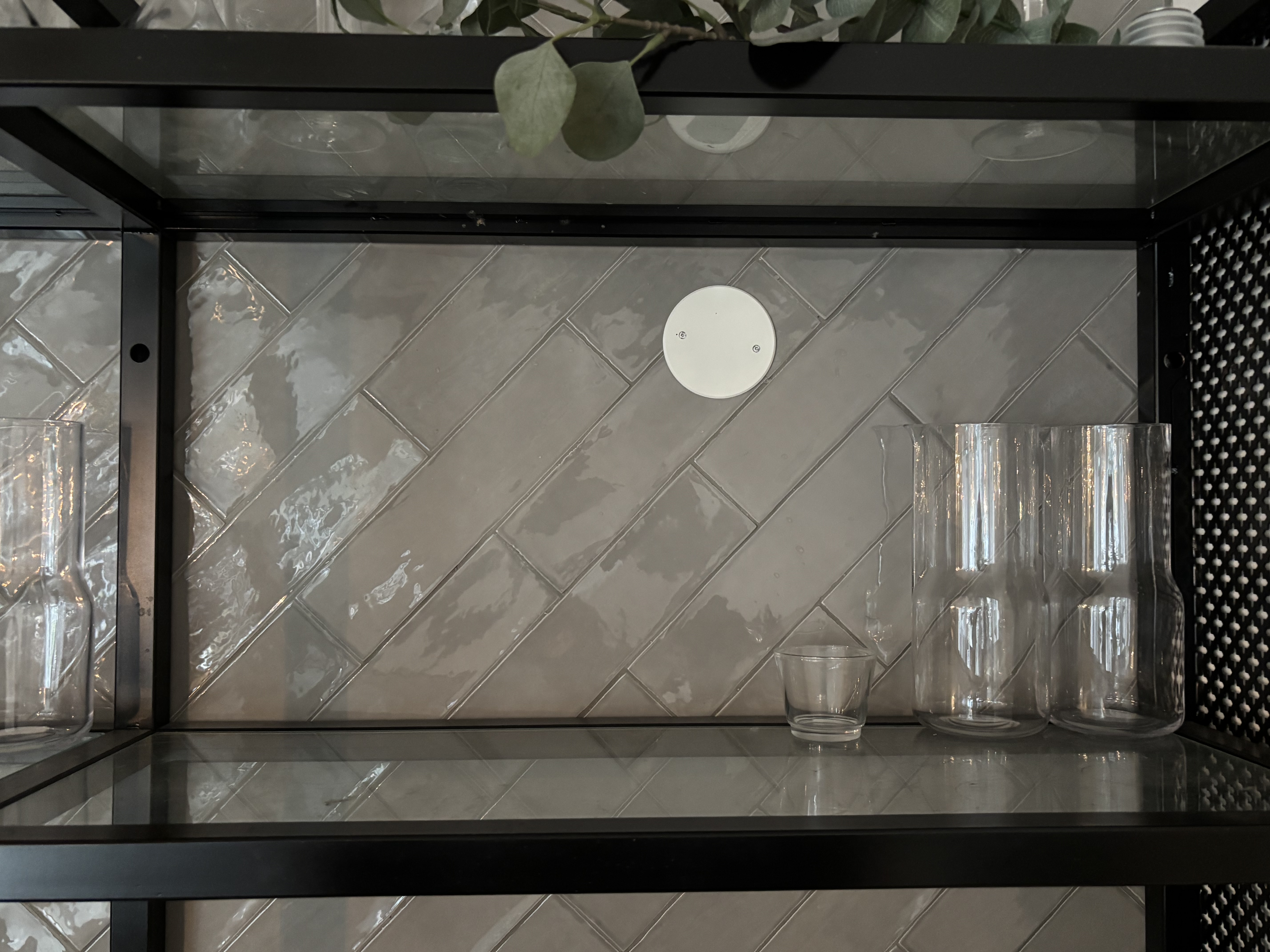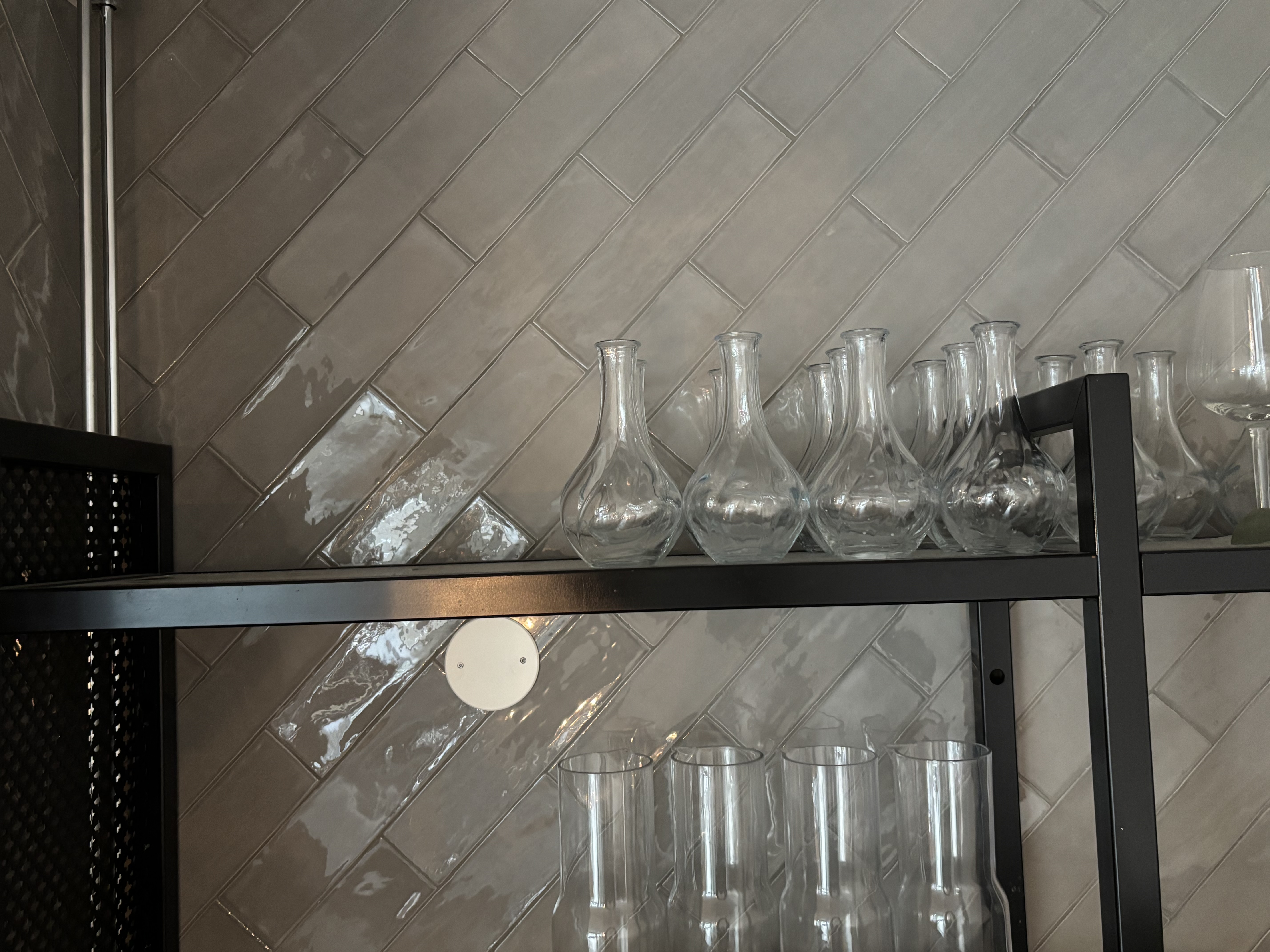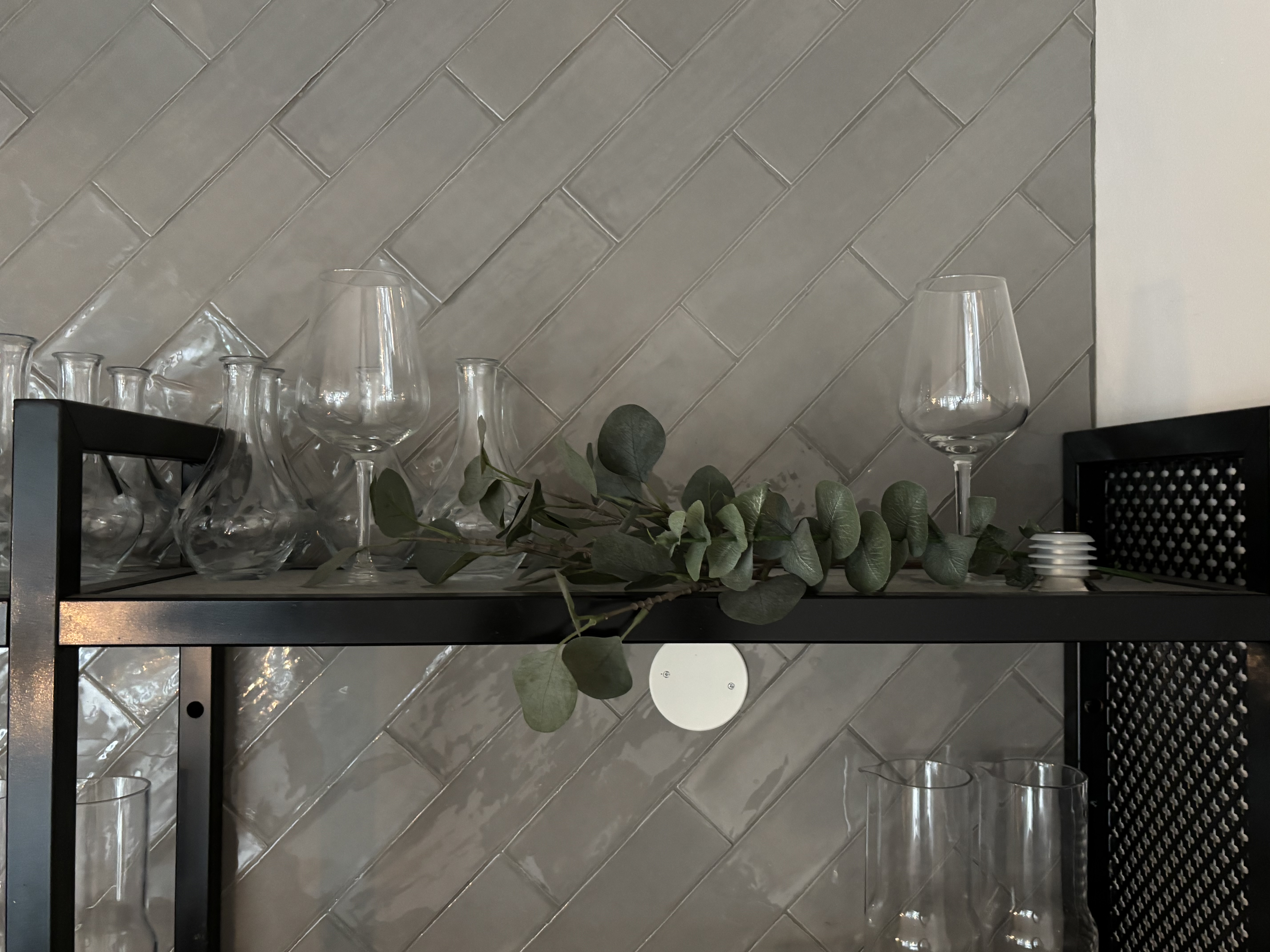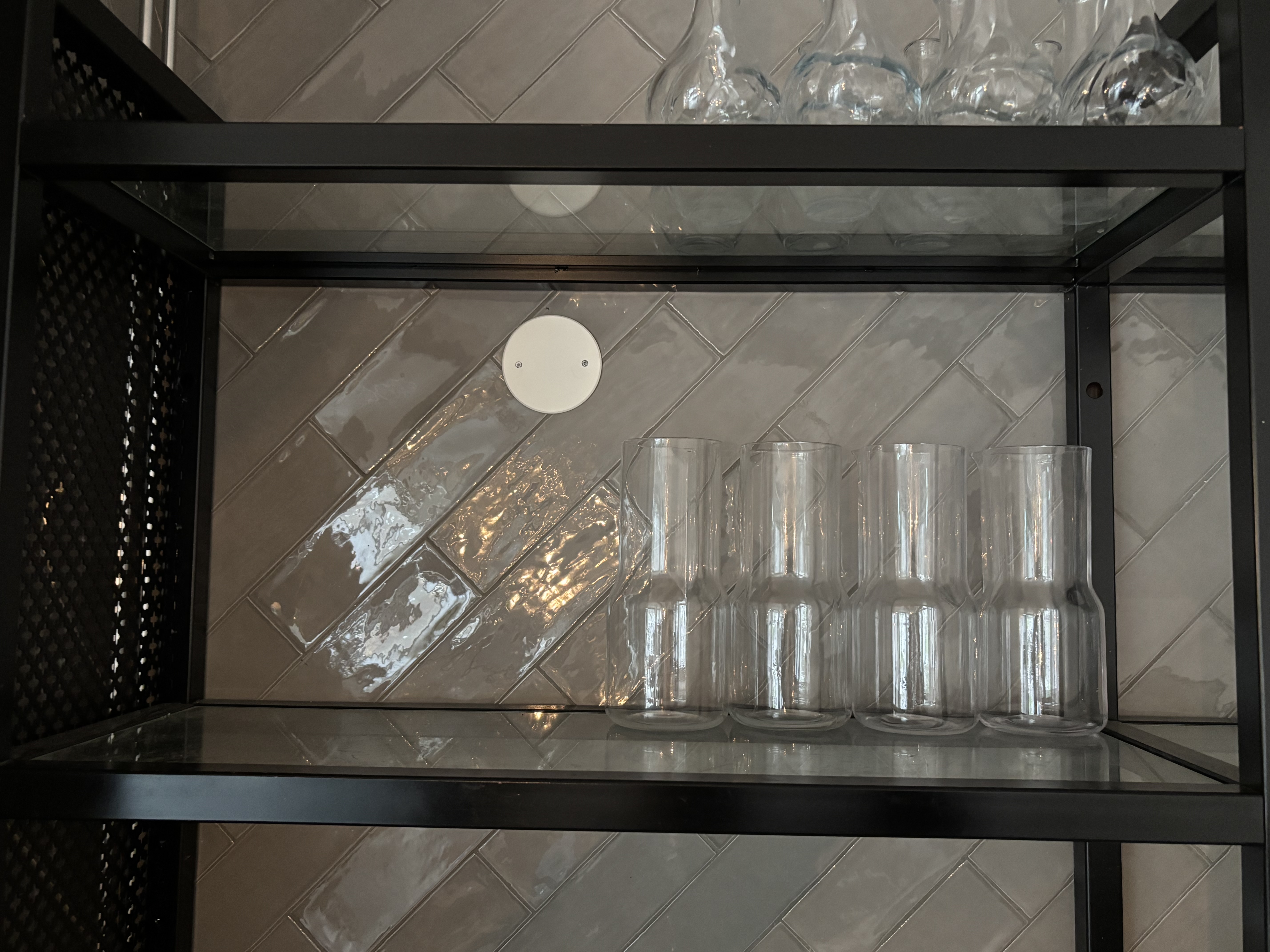 Wall-mounted glass shelf with carafes, glasses and cups