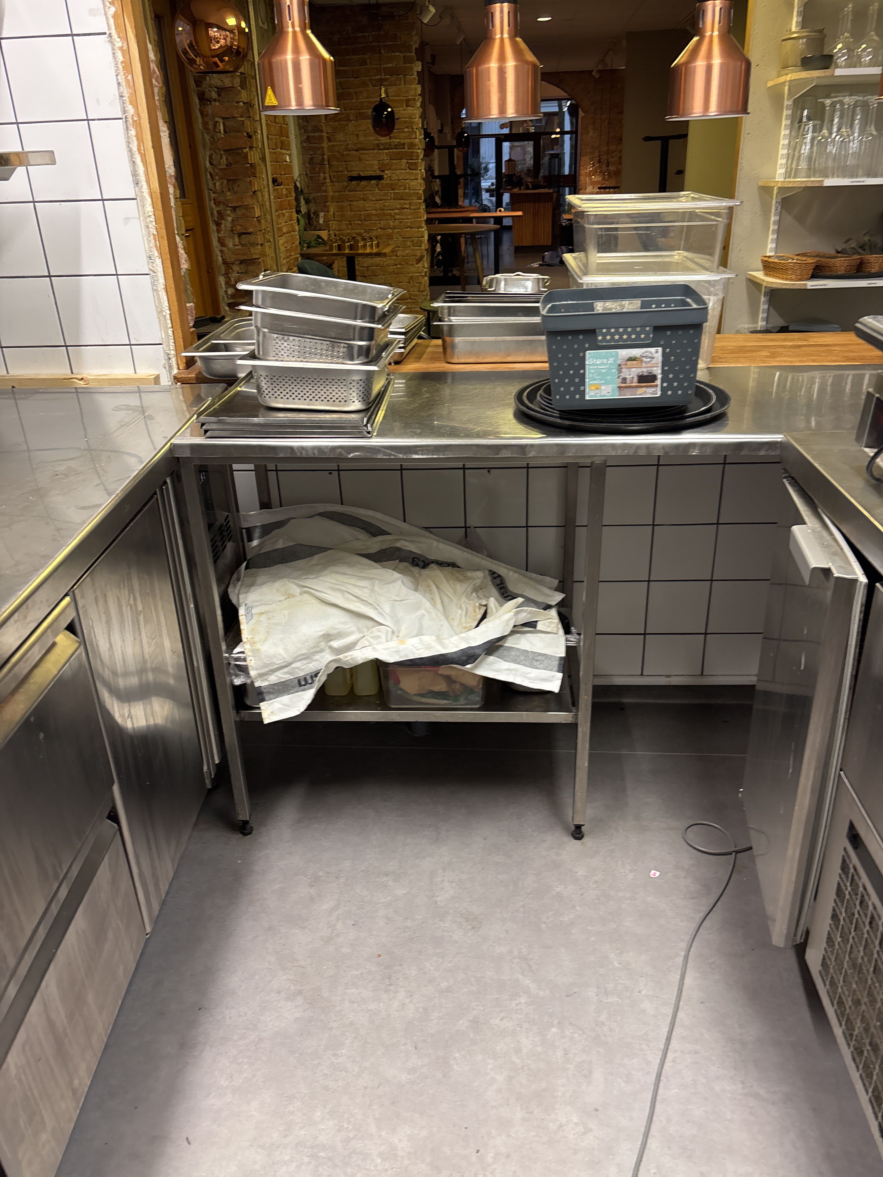 Restaurant counter and workstation in stainless steel, Coreco refrigerated counter and shelving system