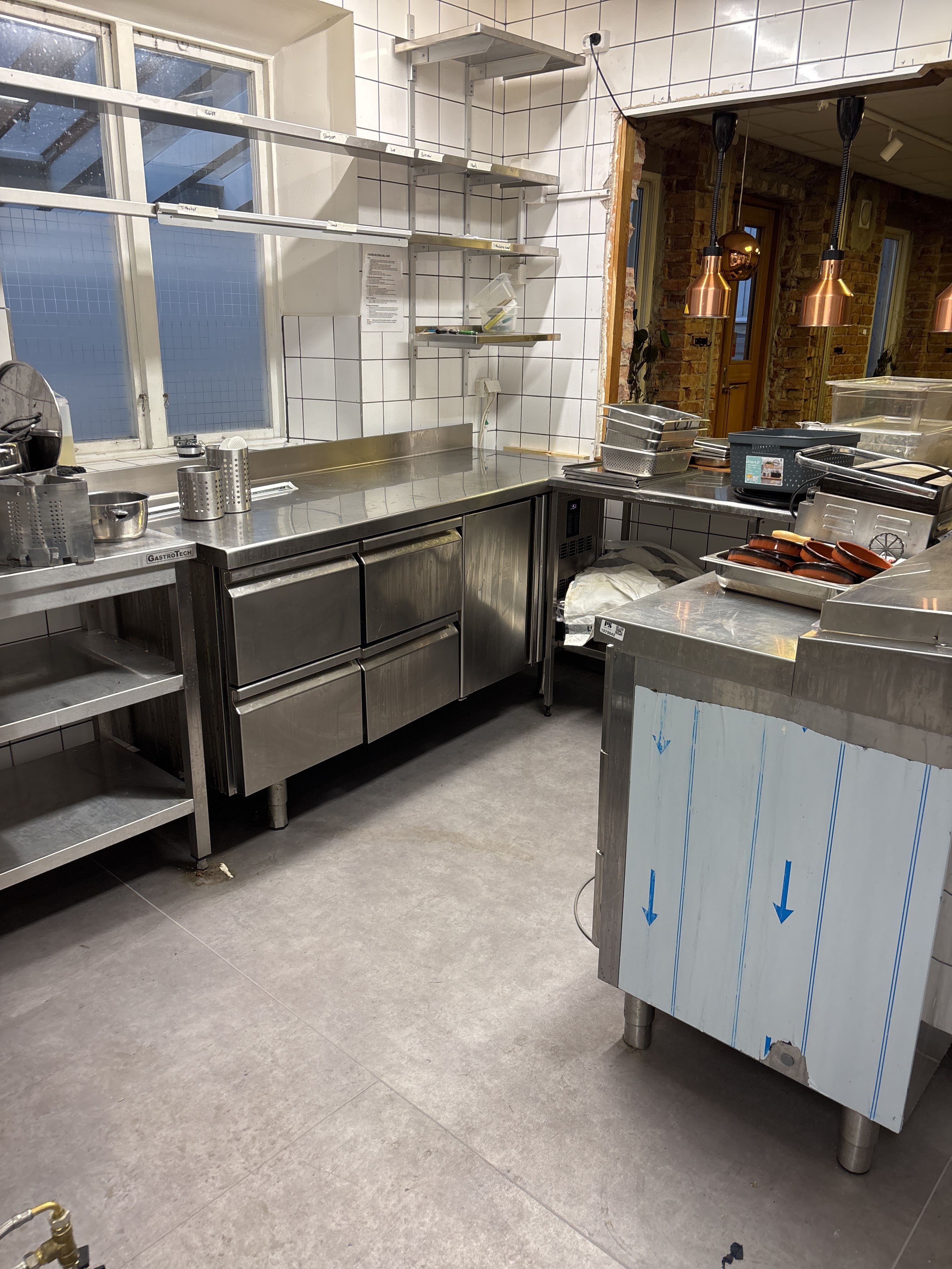 Complete set of stainless steel worktops and base cabinets from a restaurant kitchen. The package includes a refrigerated counter from Coreco, stainless steel shelves, open benches, and storage modules. Perfect for a restaurant, café or catering business.