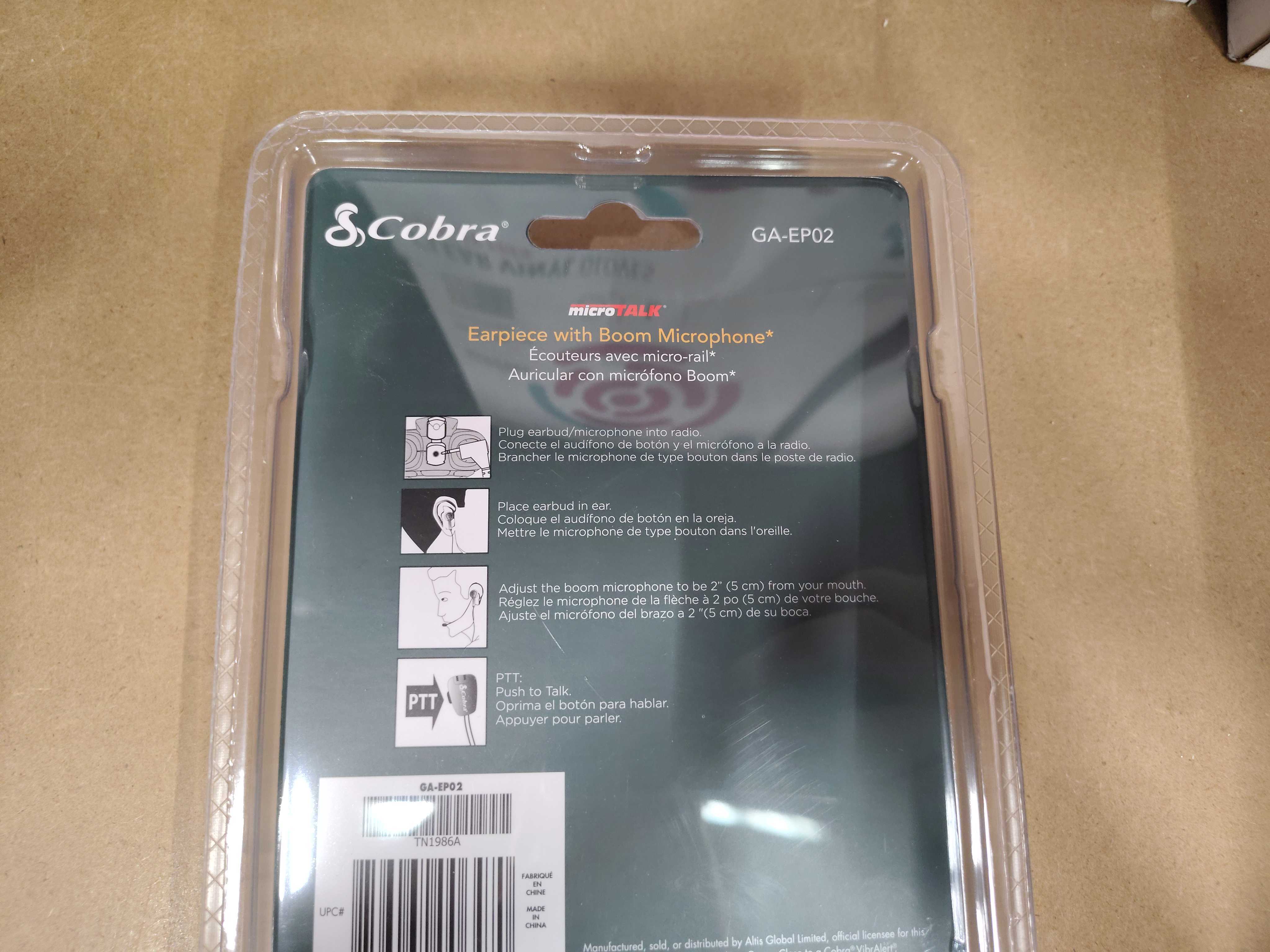Ear-mounted headset from Cobra with flexible microphone boom and PTT (Push-To-Talk) button. Developed for use with Cobra microTALK radio units. The microphone is adjustable for optimal placement close to the mouth. Comfortable ear hook and spiral cable for increased mobility.